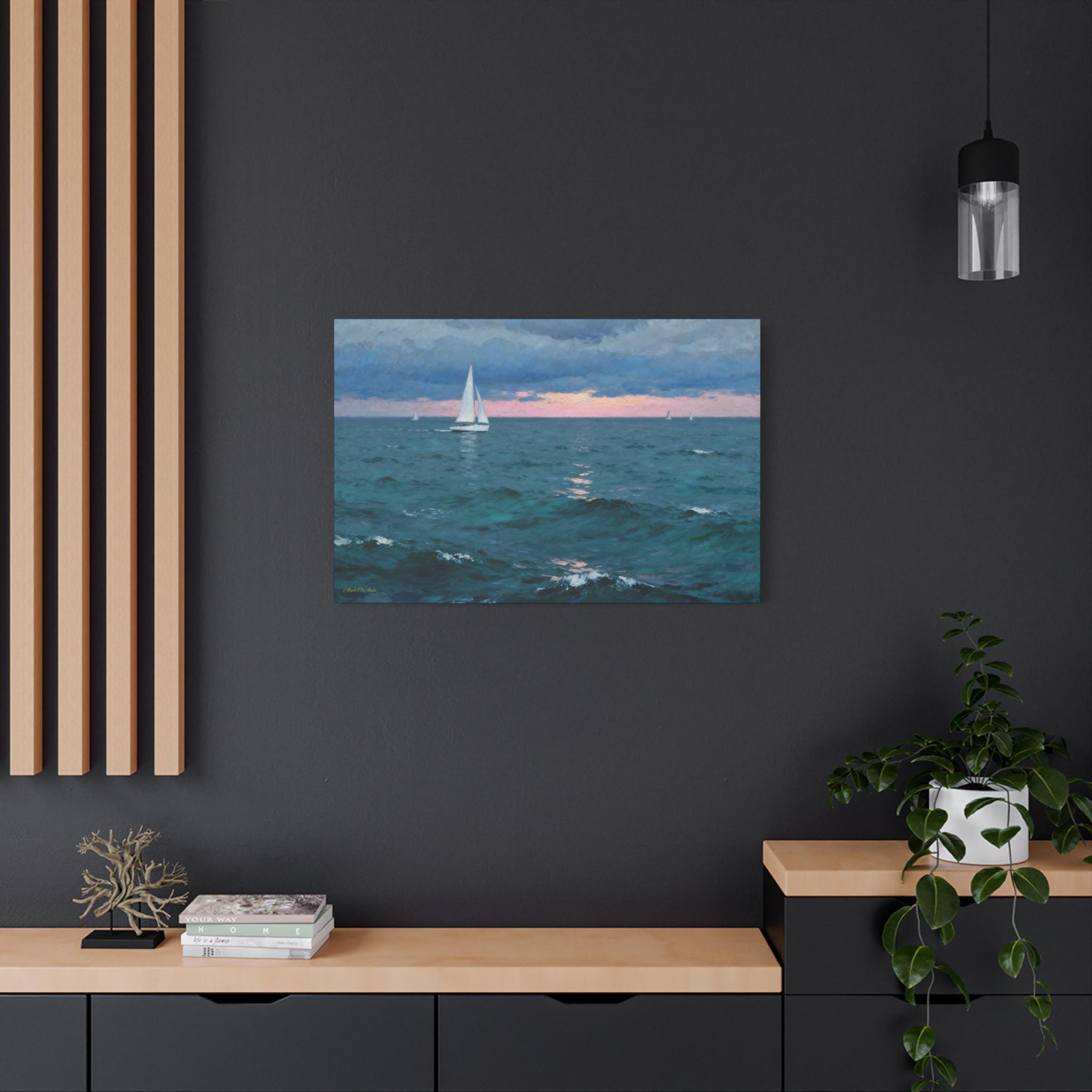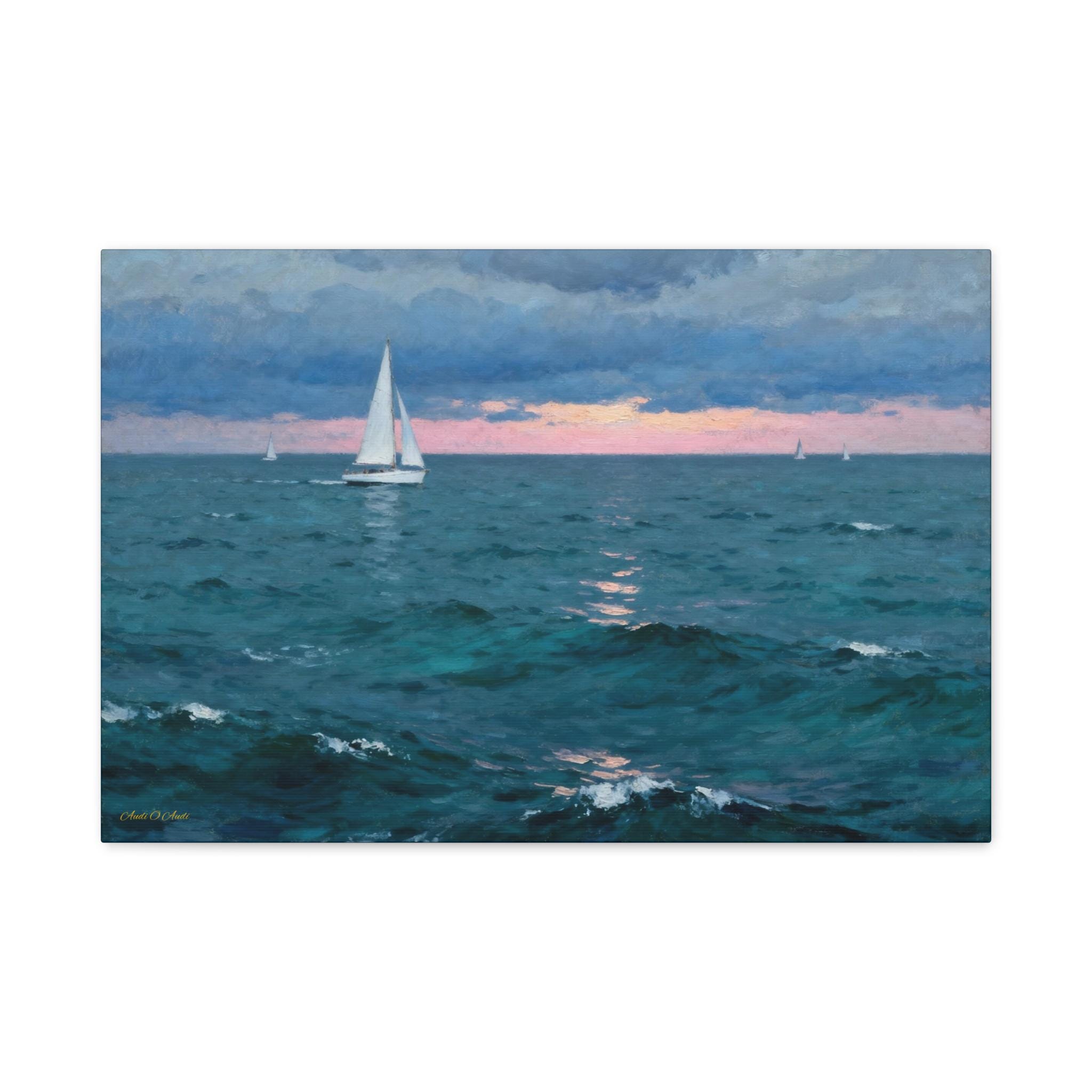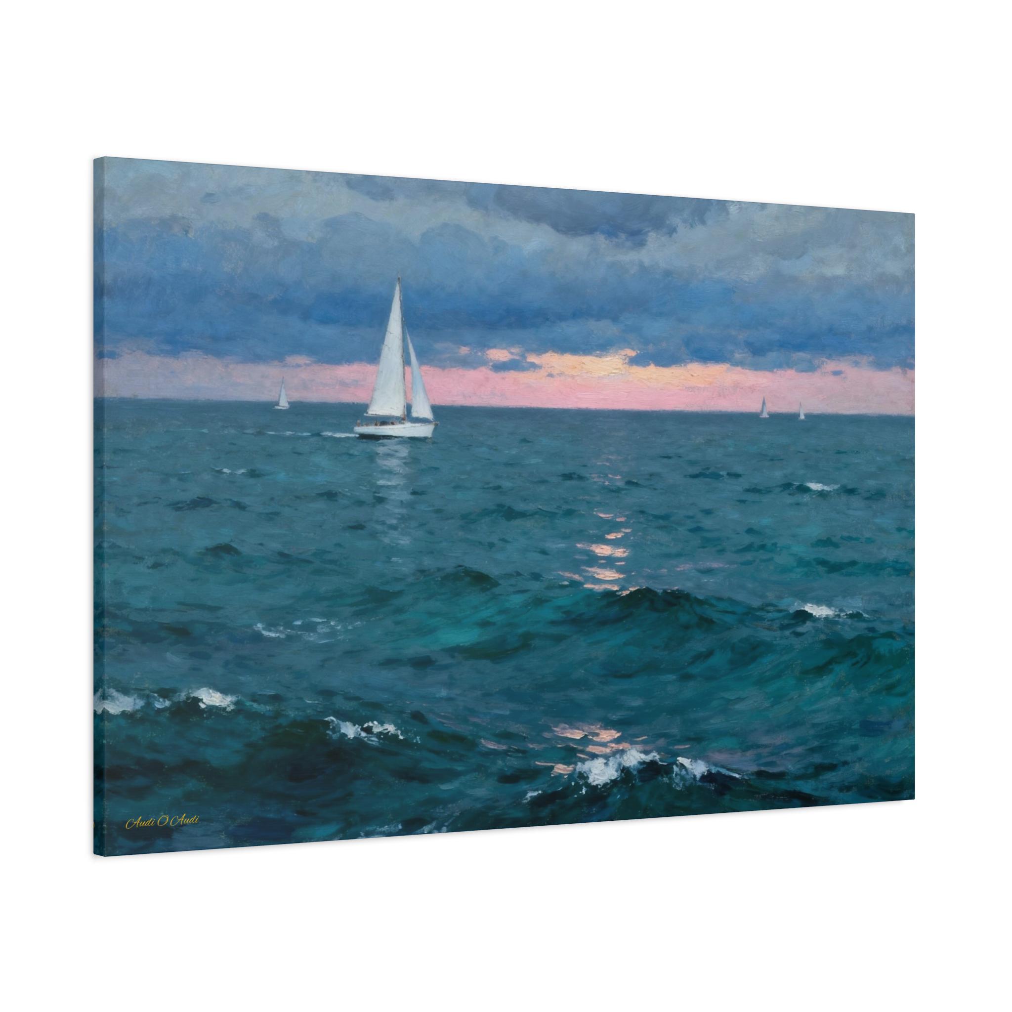 Bring the calming embrace of the open ocean into your home with this atmospheric canvas print of a sailboat at twilight. This serene artwork captures a solitary sailboat navigating deep teal waters under a moody blue sky, just as the sun dips below the horizon, painting a soft strip of pink light across the distance.