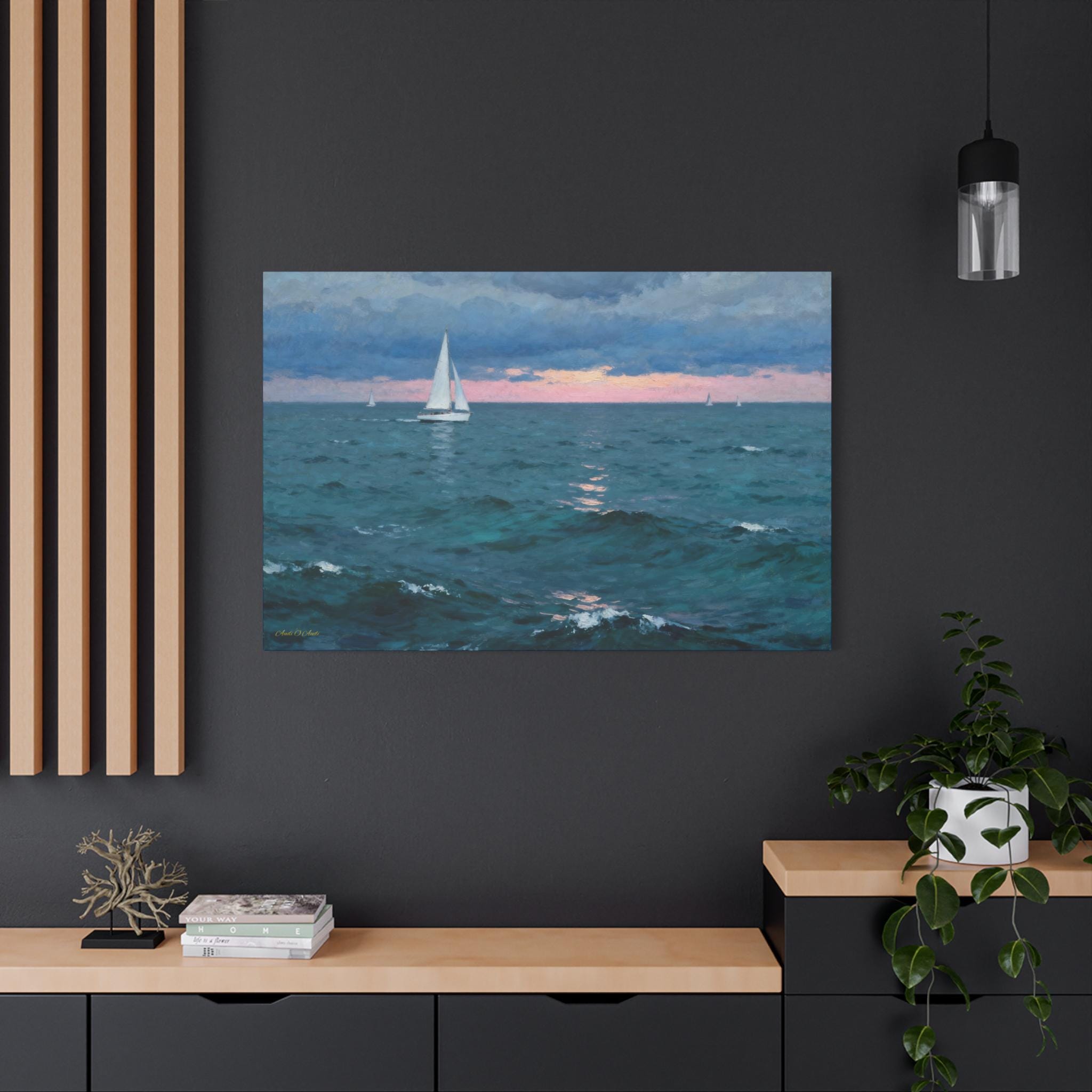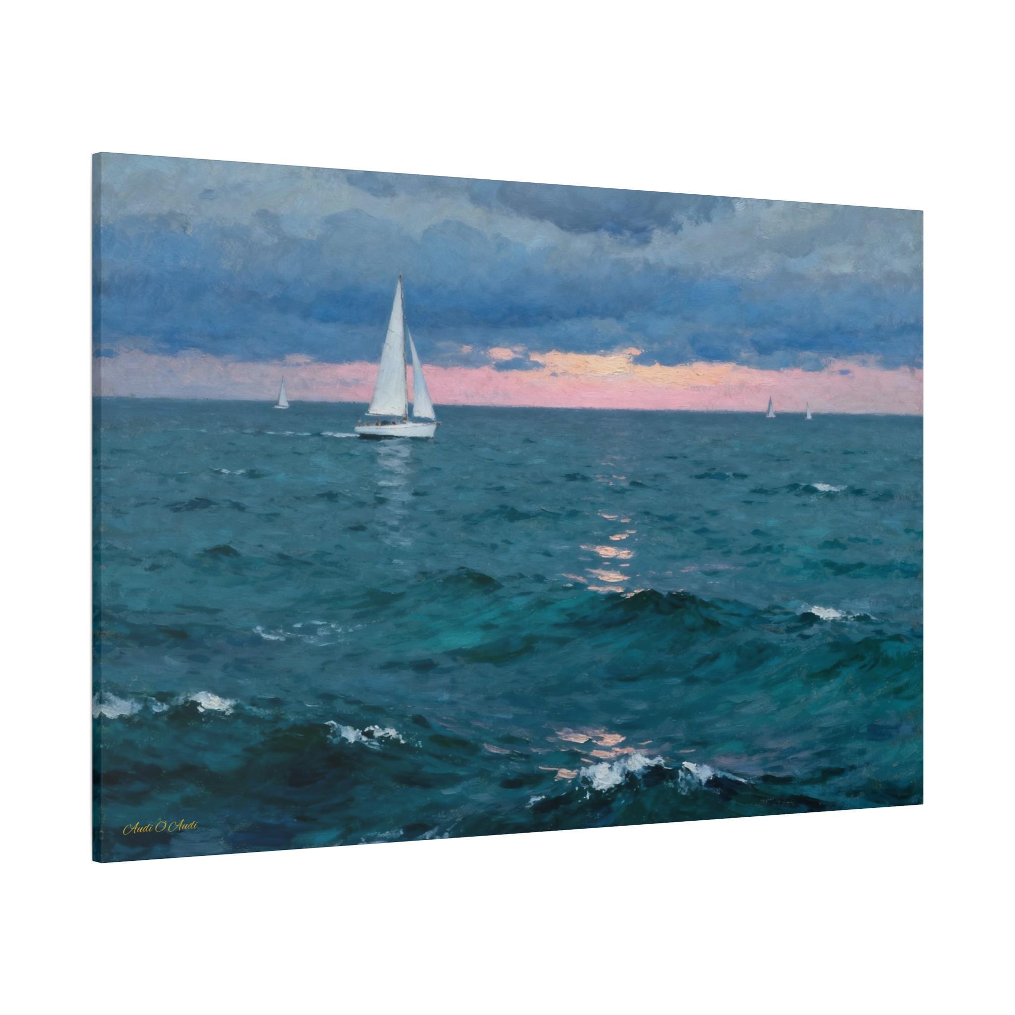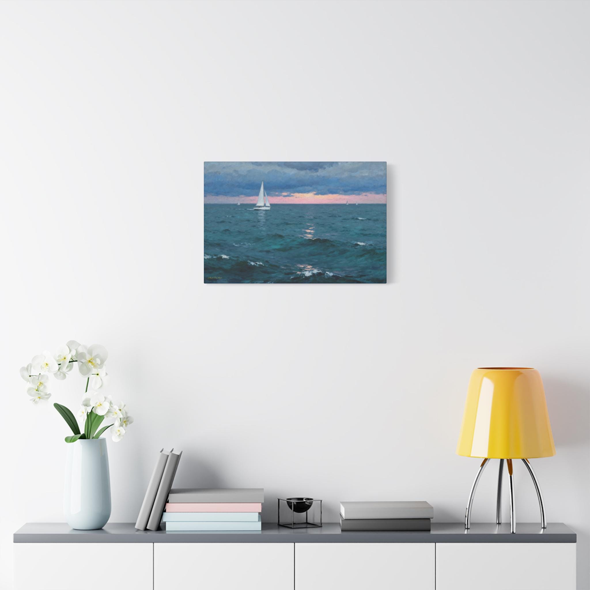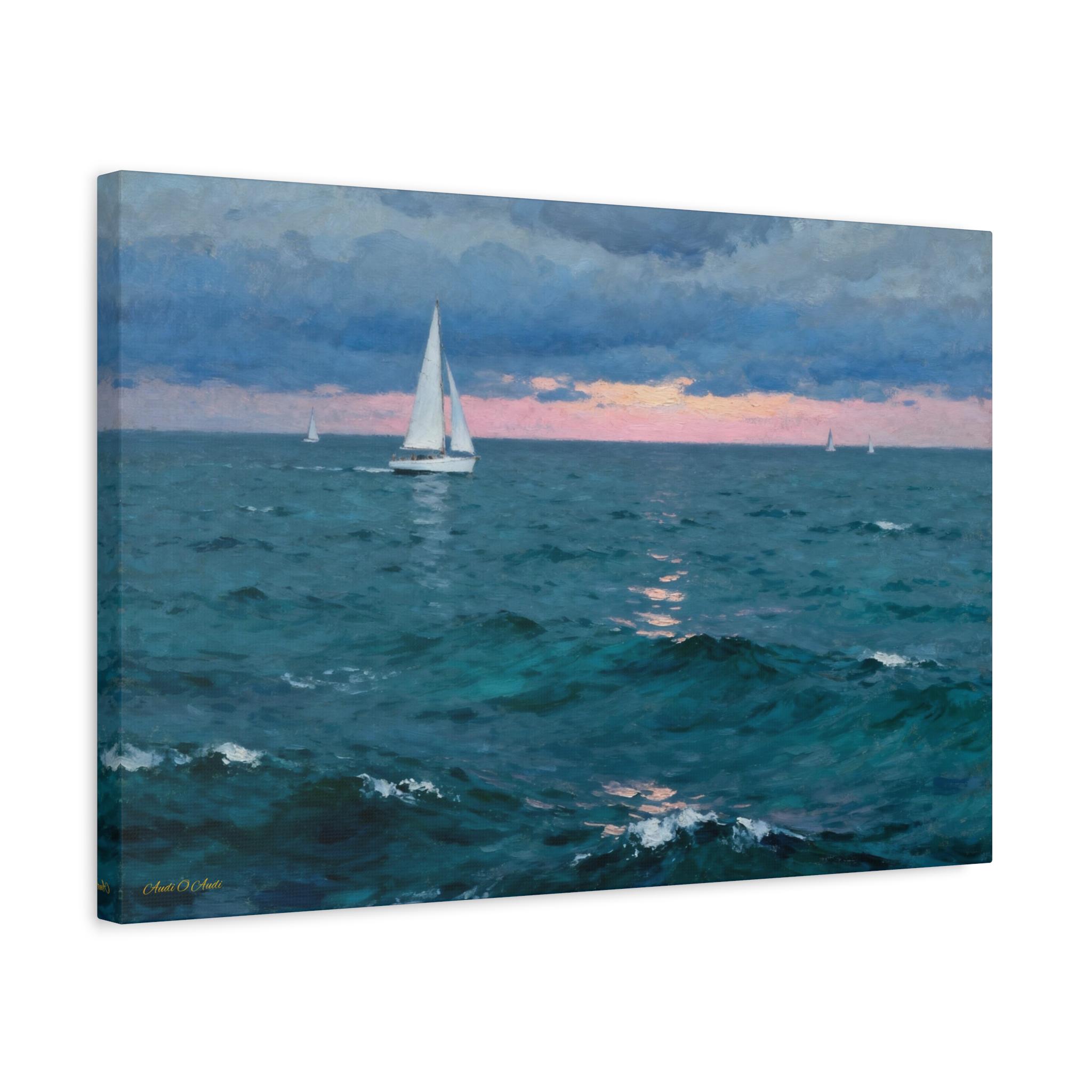 Bring the calming embrace of the open ocean into your home with this atmospheric canvas print of a sailboat at twilight. This serene artwork captures a solitary sailboat navigating deep teal waters under a moody blue sky, just as the sun dips below the horizon, painting a soft strip of pink light across the distance.