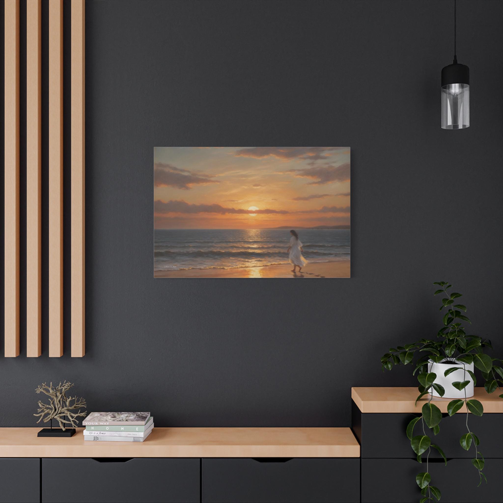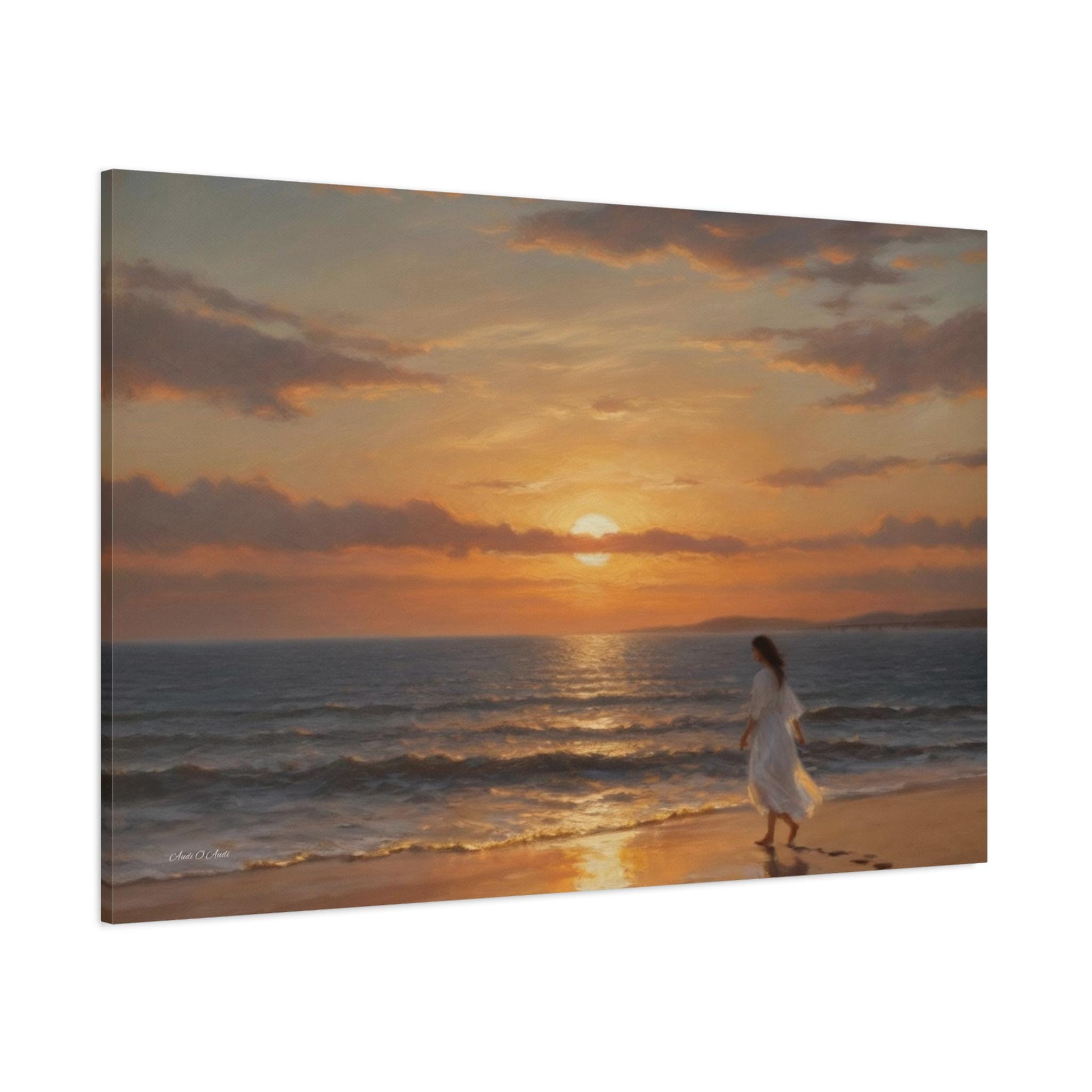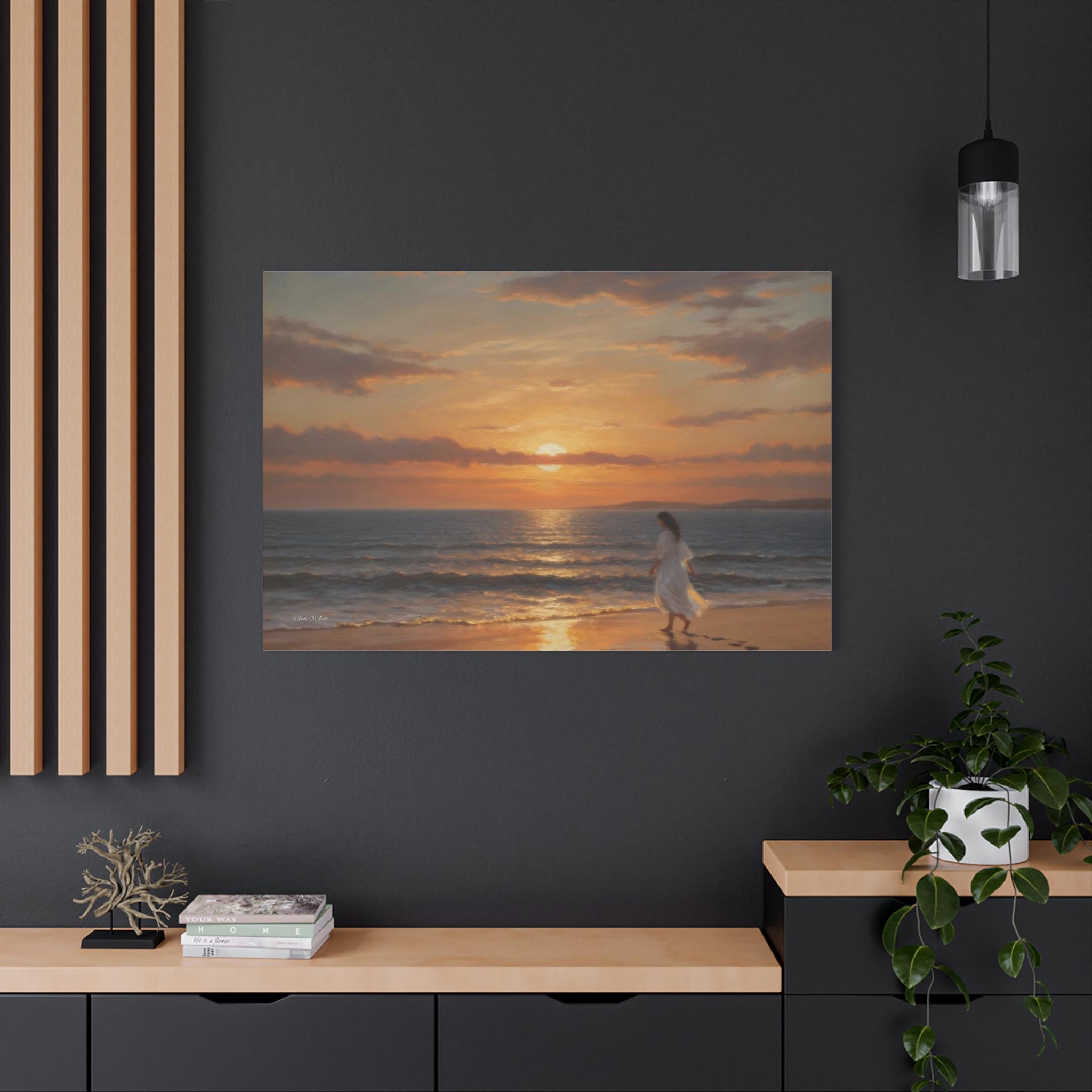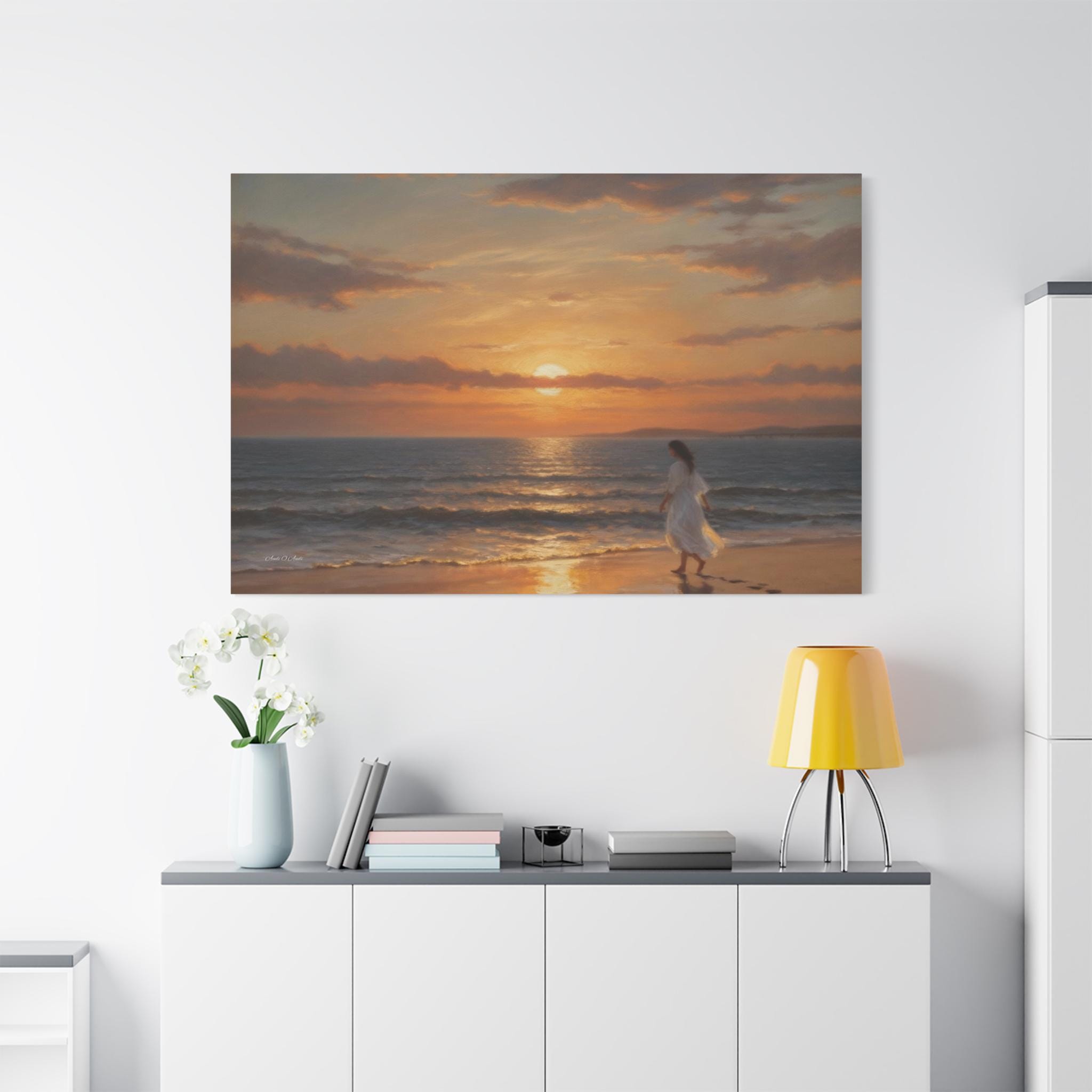 Bring the profound peace and beauty of the shoreline into your home with this serene coastal sunset canvas print. This captivating artwork features a solitary figure in a flowing white dress walking barefoot along the edge of the ocean. The setting sun casts a warm, golden glow across the gentle waves and wet sand, highlighting the quiet trail of footprints left behind.
