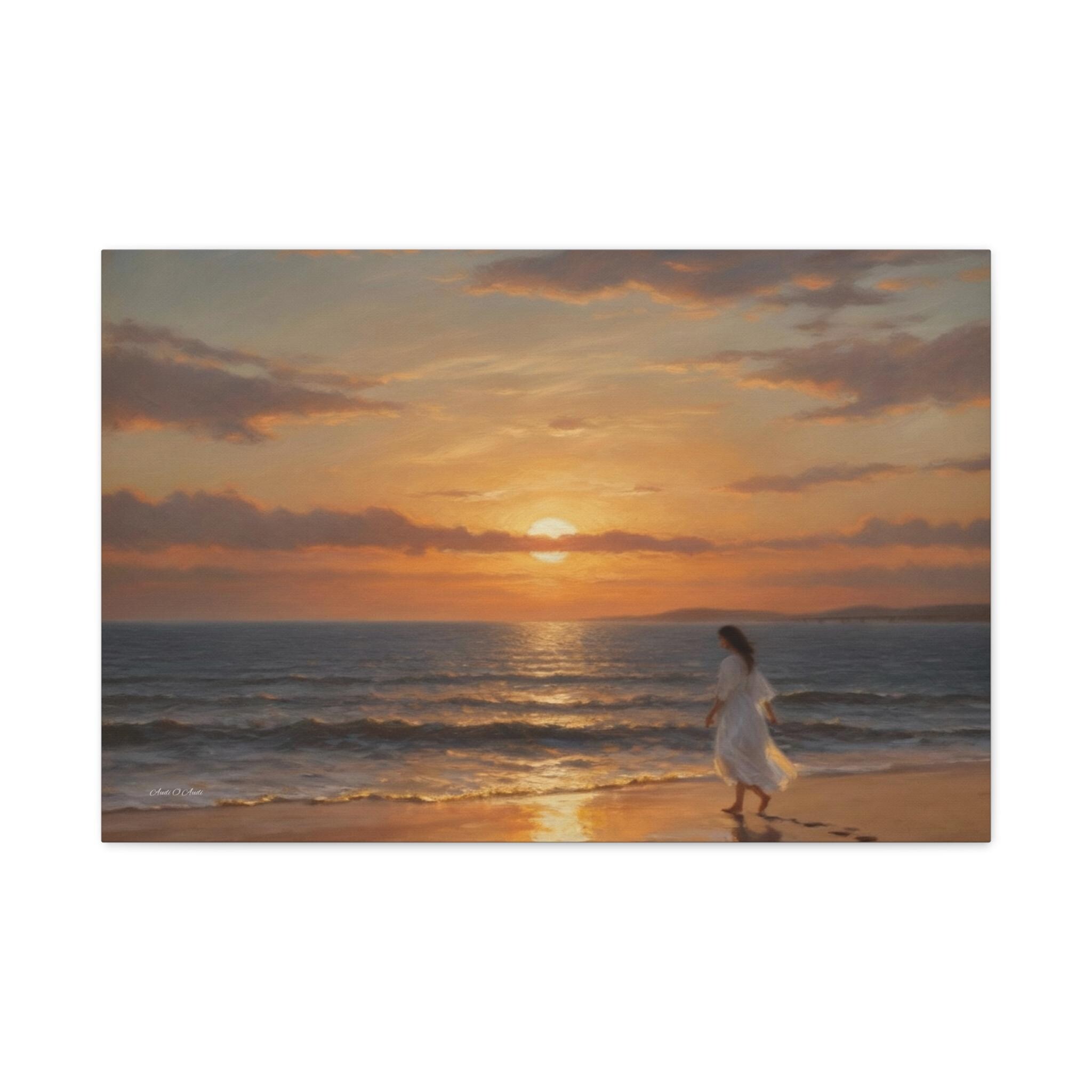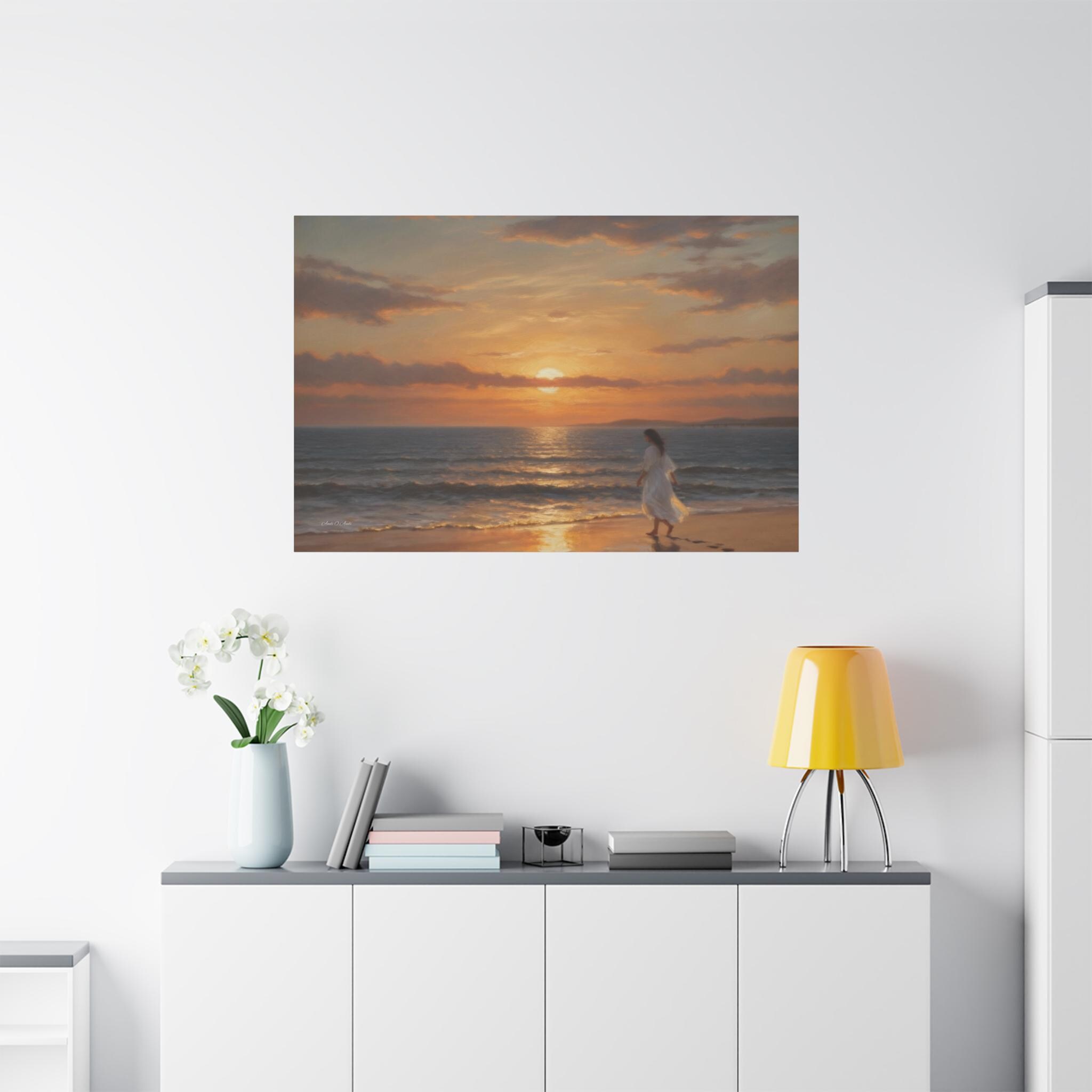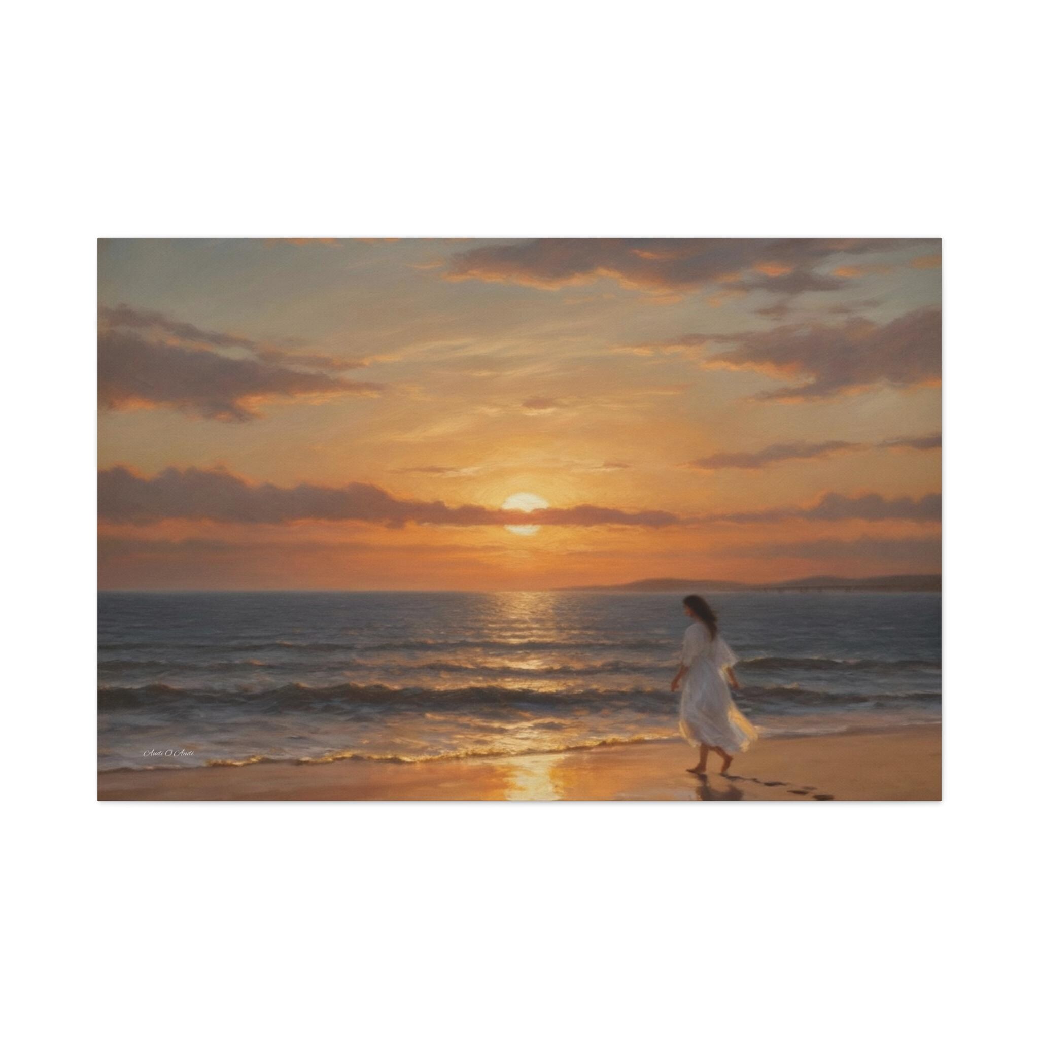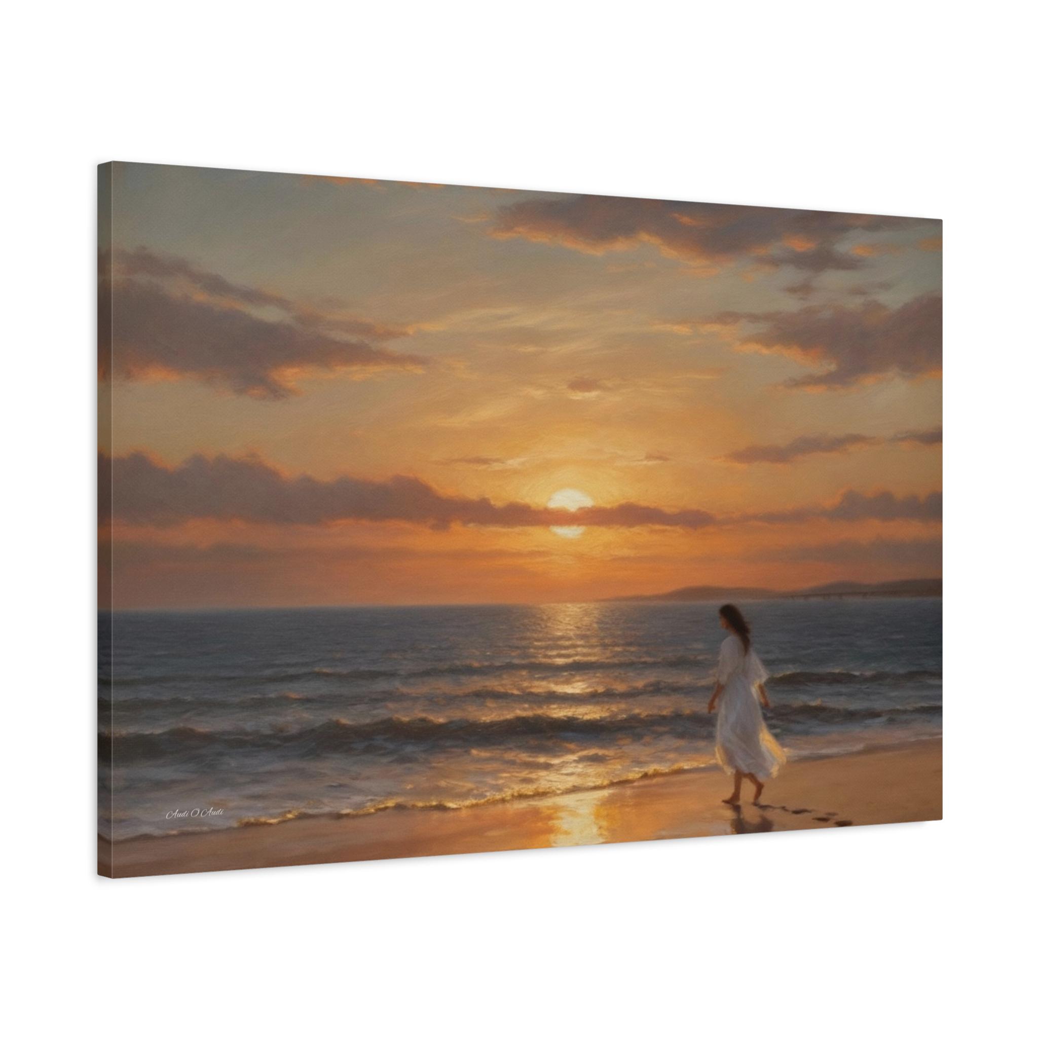 Bring the profound peace and beauty of the shoreline into your home with this serene coastal sunset canvas print. This captivating artwork features a solitary figure in a flowing white dress walking barefoot along the edge of the ocean. The setting sun casts a warm, golden glow across the gentle waves and wet sand, highlighting the quiet trail of footprints left behind.