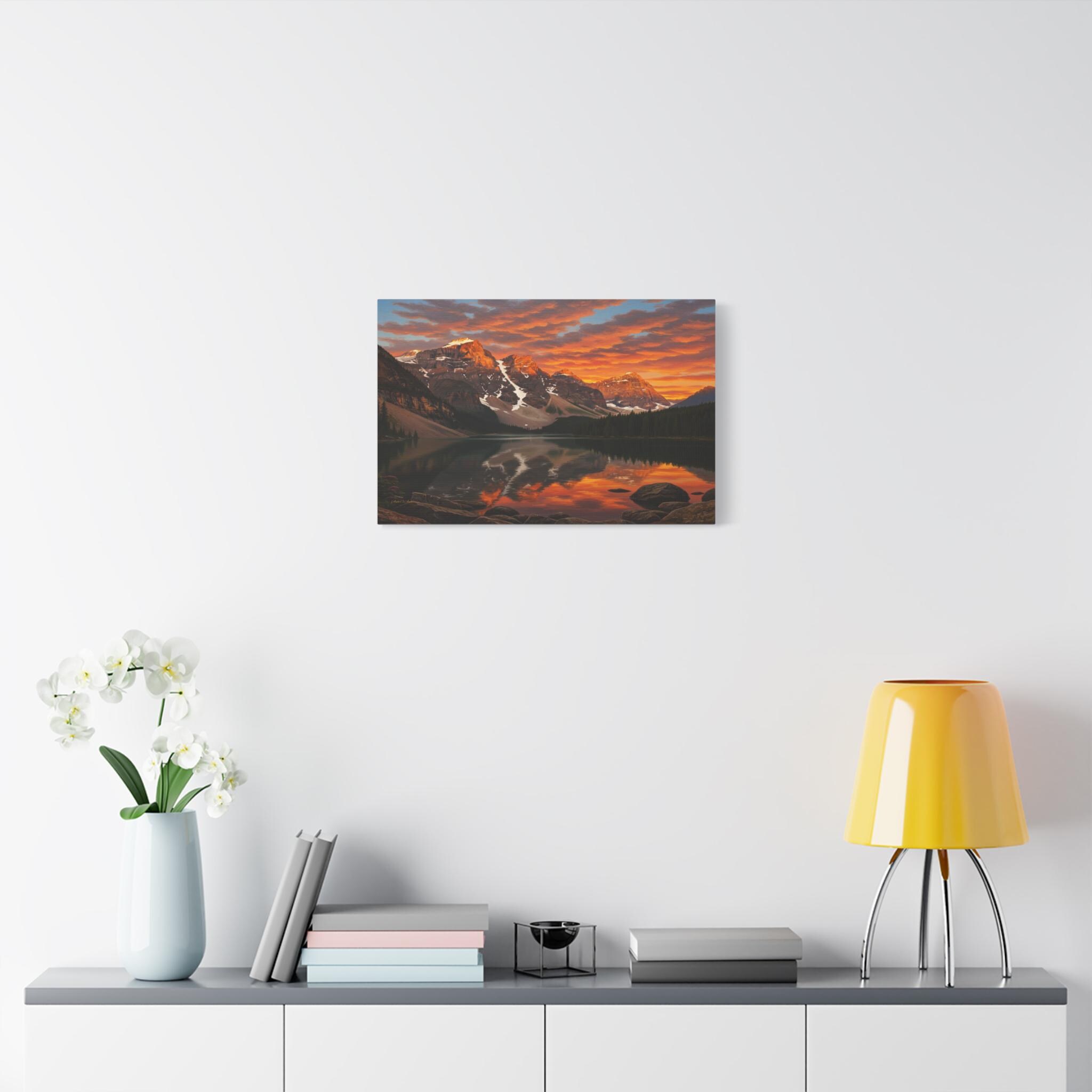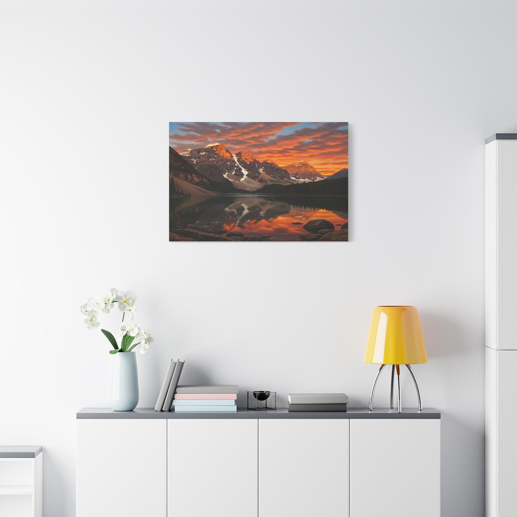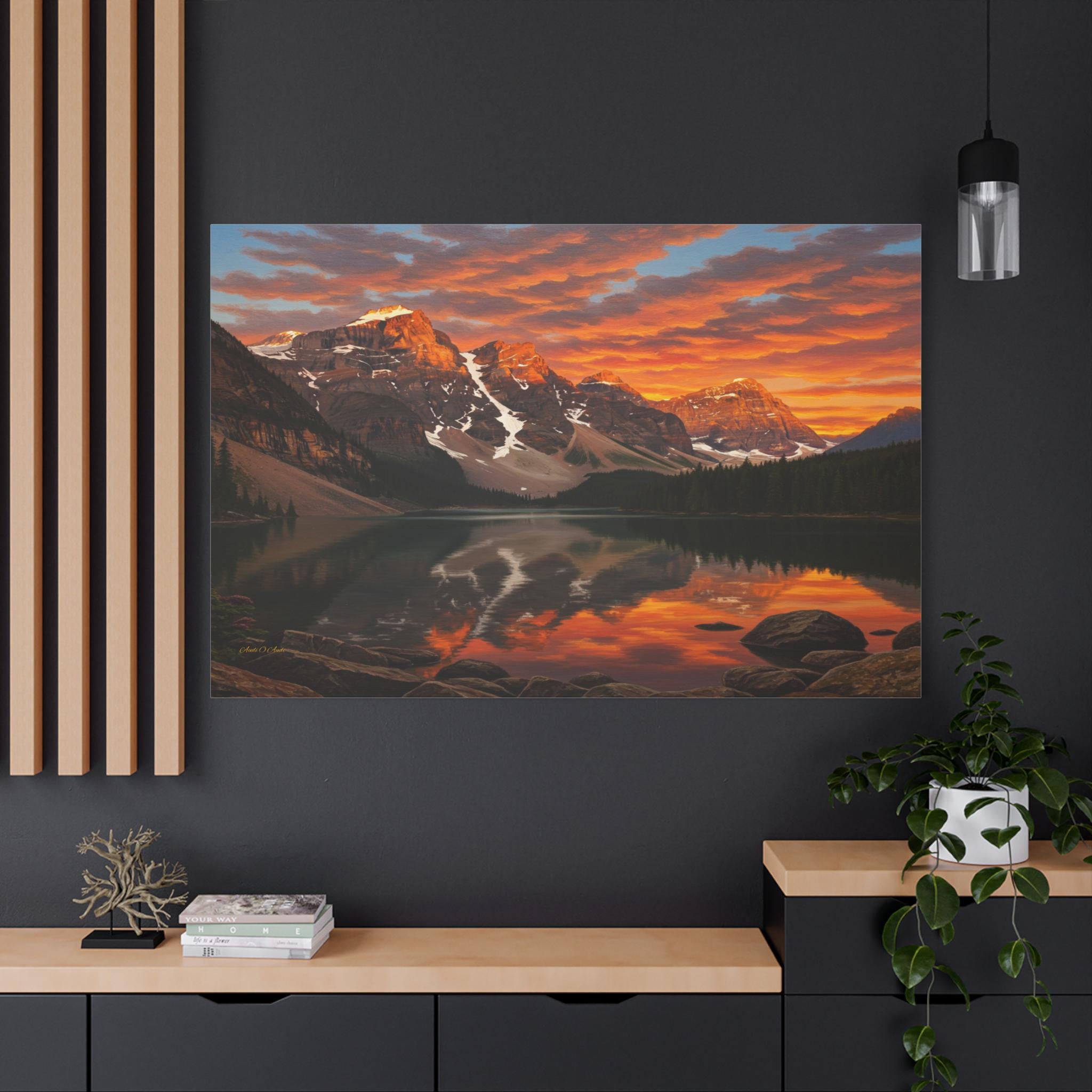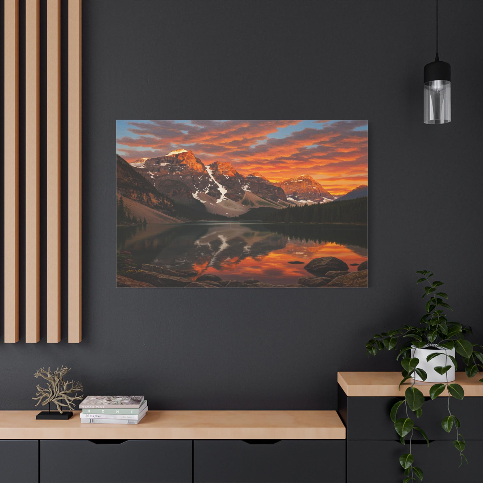Bring the breathtaking majesty of the great outdoors into your home with this stunning mountain lake canvas print. This captivating artwork features a pristine alpine lake perfectly reflecting a rugged, snow-capped mountain range. Above the peaks, the sunset sky erupts in a fiery display of vivid oranges, glowing yellows, and deep reds, contrasting beautifully with the serene, dark pine forest along the shoreline.