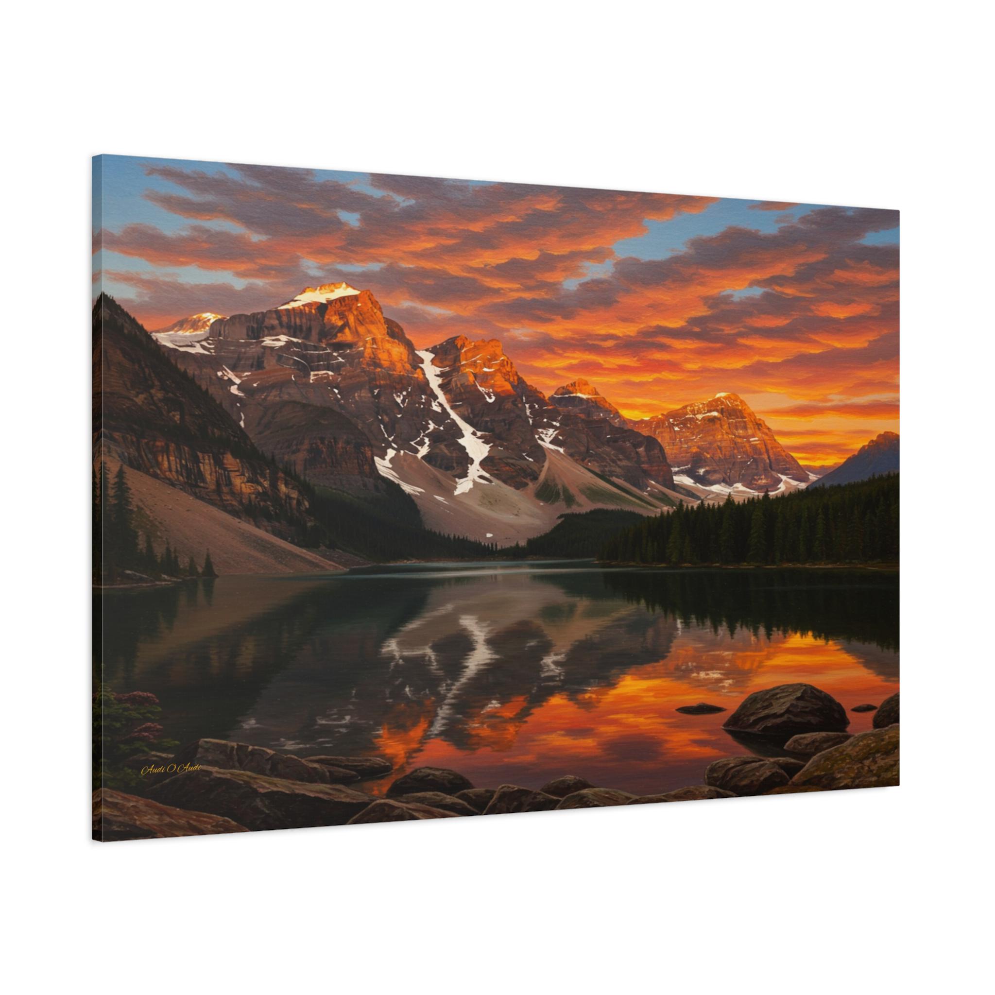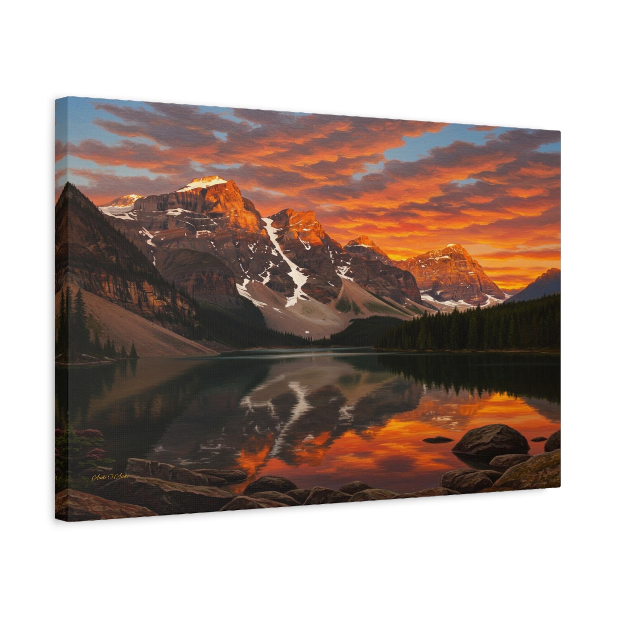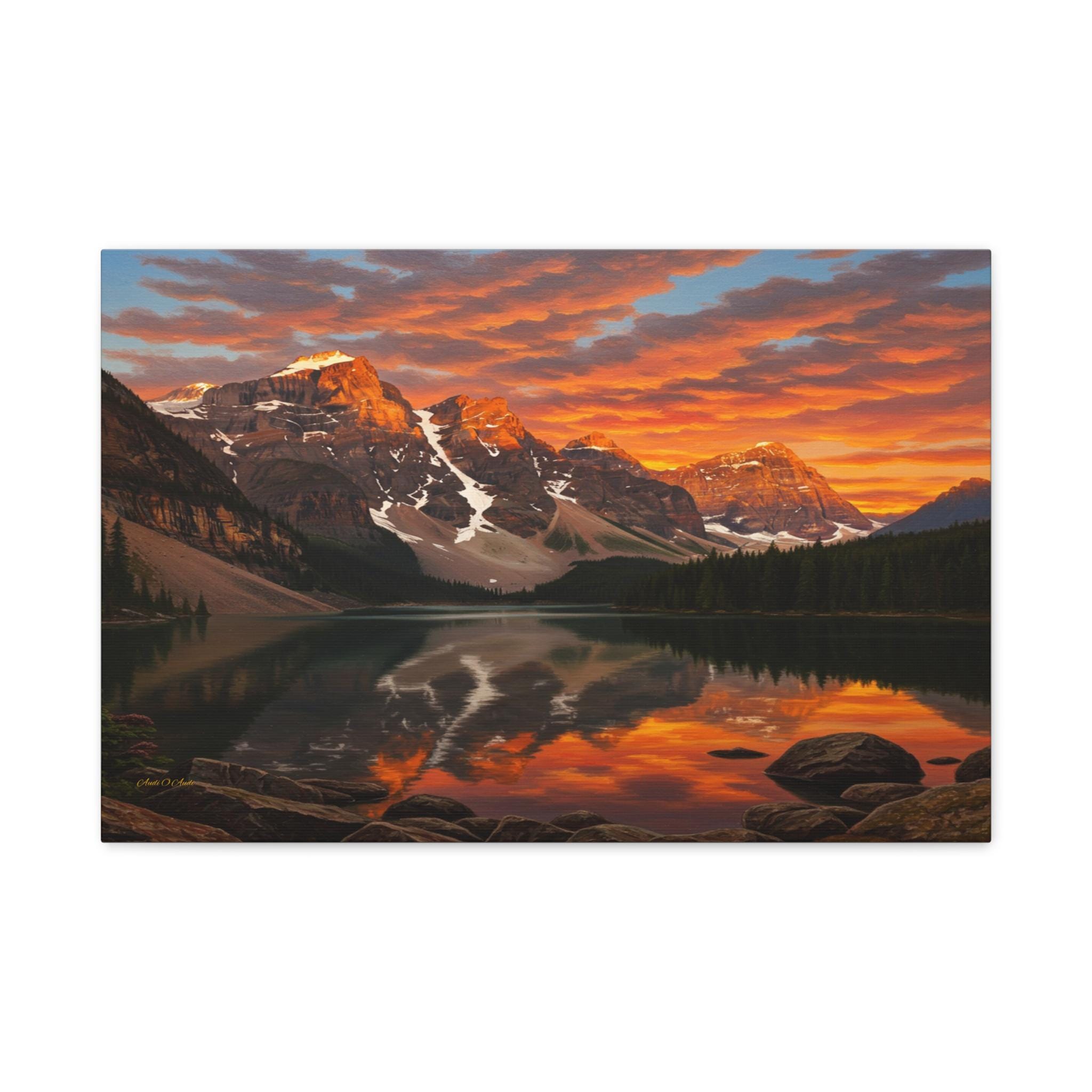 Bring the breathtaking majesty of the great outdoors into your home with this stunning mountain lake canvas print. This captivating artwork features a pristine alpine lake perfectly reflecting a rugged, snow-capped mountain range. Above the peaks, the sunset sky erupts in a fiery display of vivid oranges, glowing yellows, and deep reds, contrasting beautifully with the serene, dark pine forest along the shoreline.