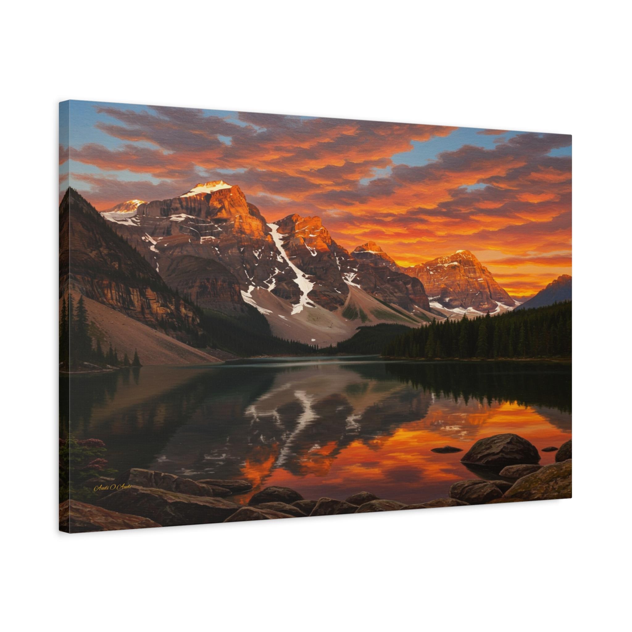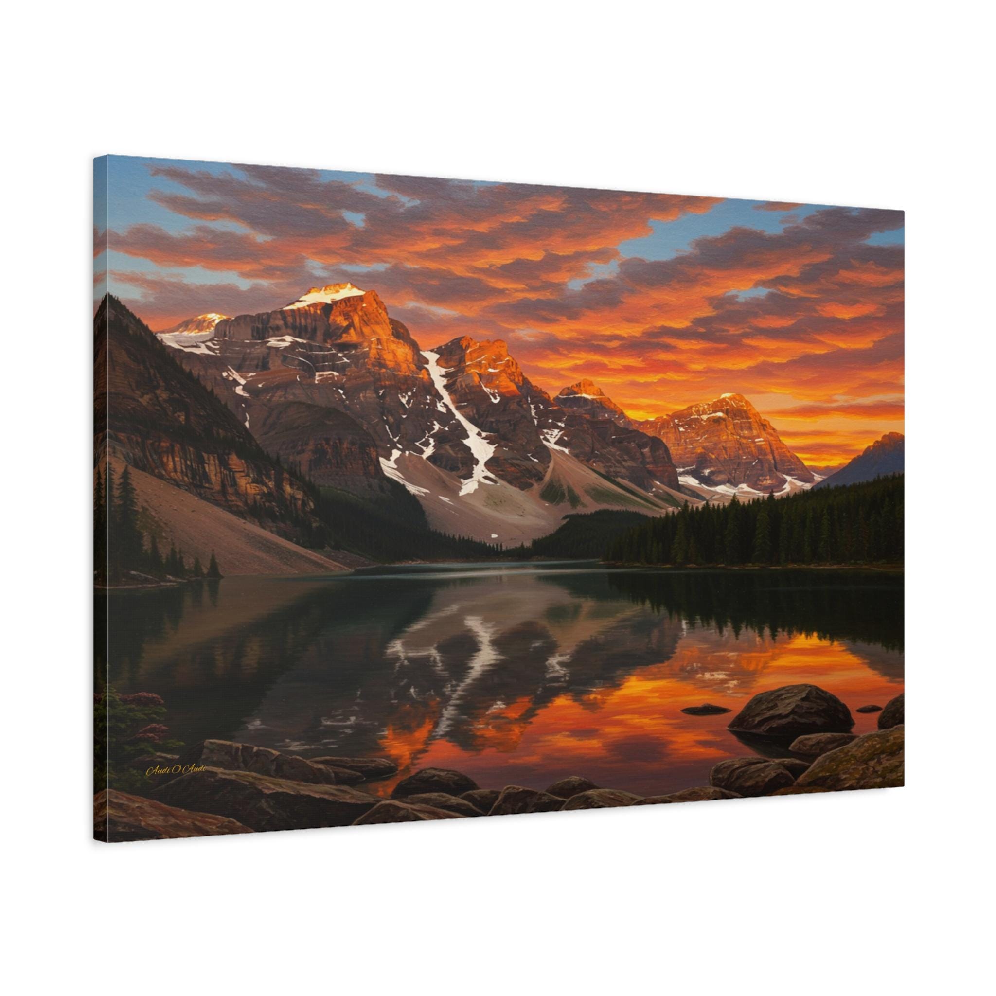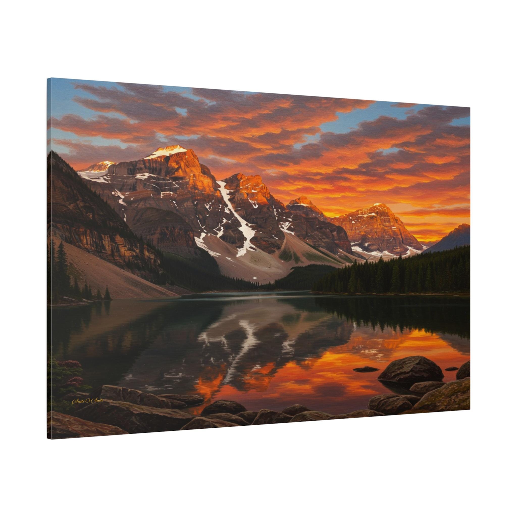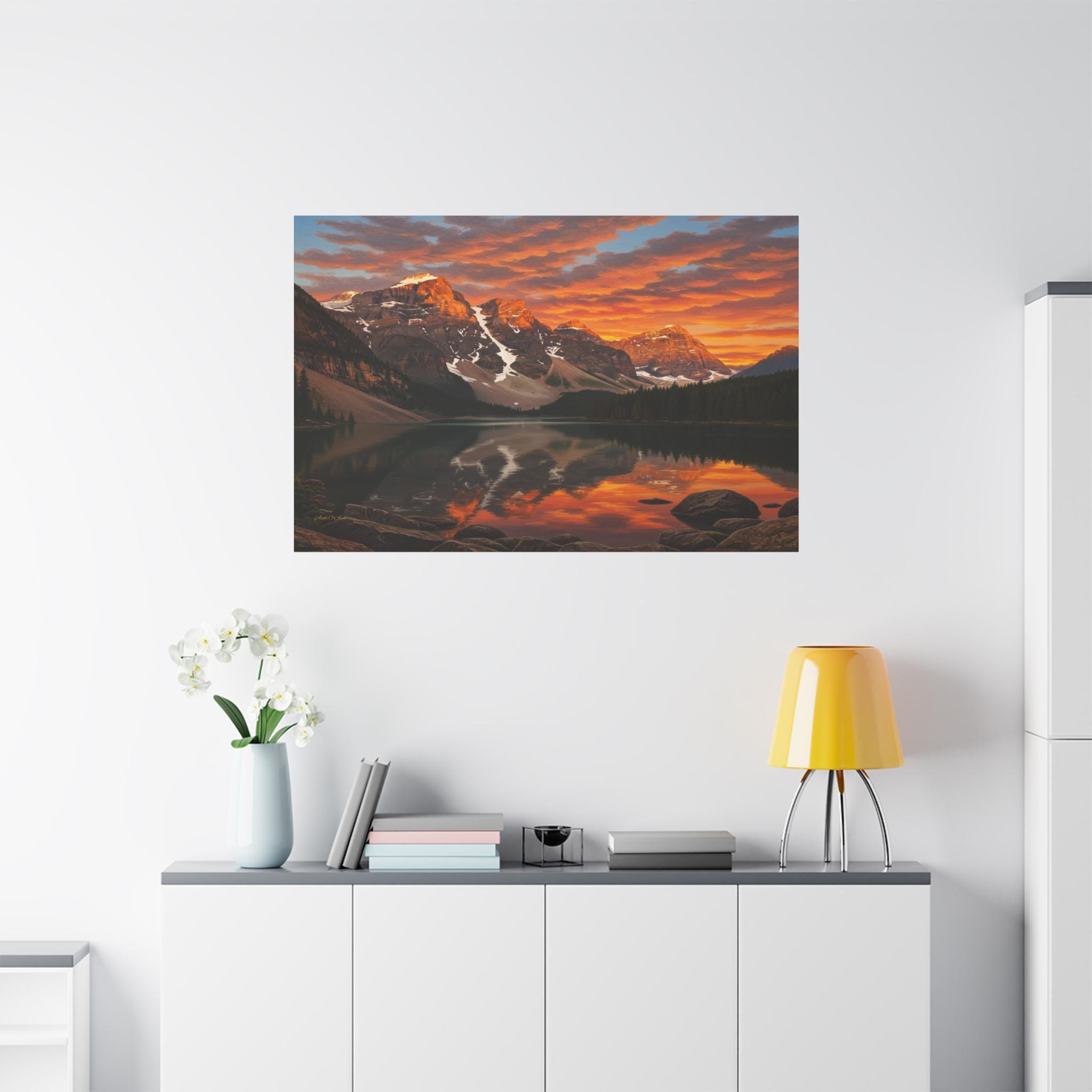 Bring the breathtaking majesty of the great outdoors into your home with this stunning mountain lake canvas print. This captivating artwork features a pristine alpine lake perfectly reflecting a rugged, snow-capped mountain range. Above the peaks, the sunset sky erupts in a fiery display of vivid oranges, glowing yellows, and deep reds, contrasting beautifully with the serene, dark pine forest along the shoreline.