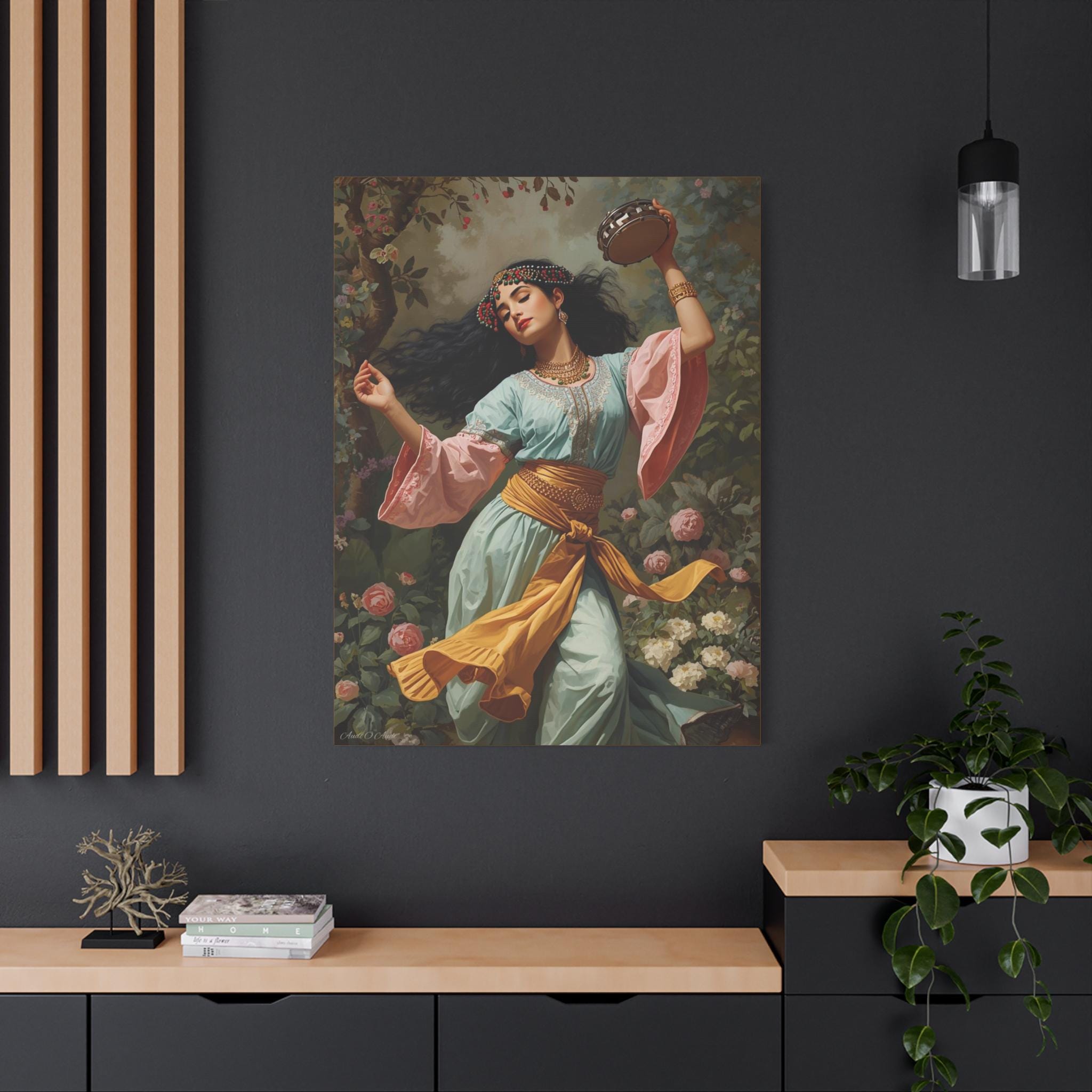This Artistic Canvas Print features a Dance of Blossoms design, perfect for adding a touch of Bohemian Decor and Vintage Style to any space. It makes for a great cultural gift and enhances the overall home aesthetic. Ideal for art enthusiasts, nature lovers, and those seeking unique wall art. Perfect for occasions such as birthdays, housewarmings, and holidays.