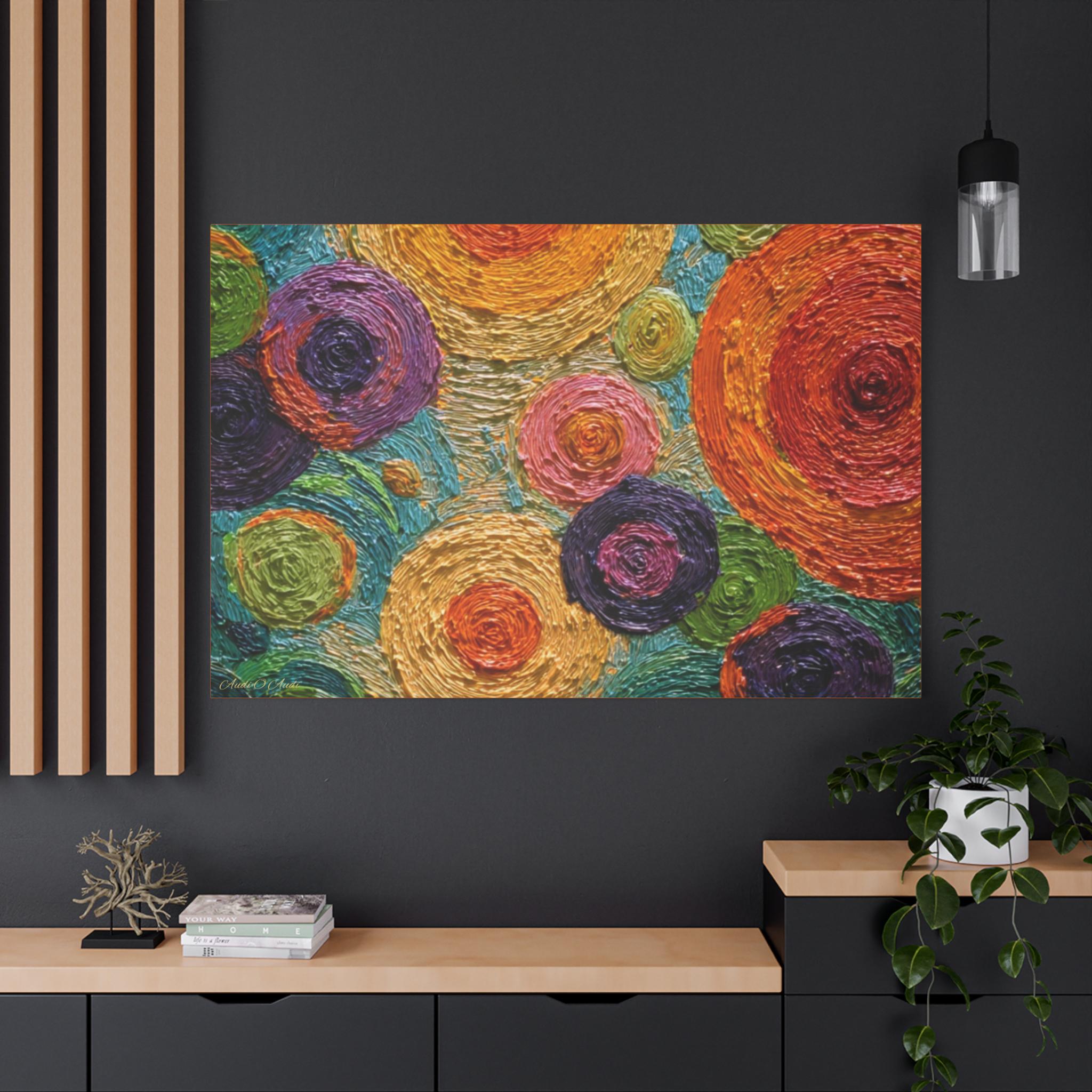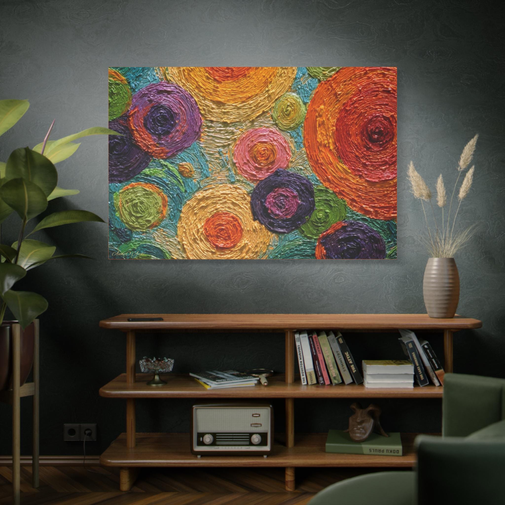 Transform your space with this stunning stretched canvas artwork that radiates vibrancy and creativity. The colorful design brings a cheerful atmosphere, perfect for brightening up your living room, office, or art studio. This canvas is ideal for art lovers seeking to add a splash of color to their environment. It's a wonderful gift for housewarmings, birthdays, or any celebration where you want to spread joy and inspiration. Suitable for all ages, this piece strikes the perfect balance between modern art and joyful expression, making it a versatile addition to any home decor. Perfect for seasonal decorating, especially during Spring and Summer, when the vibrant colors truly shine.