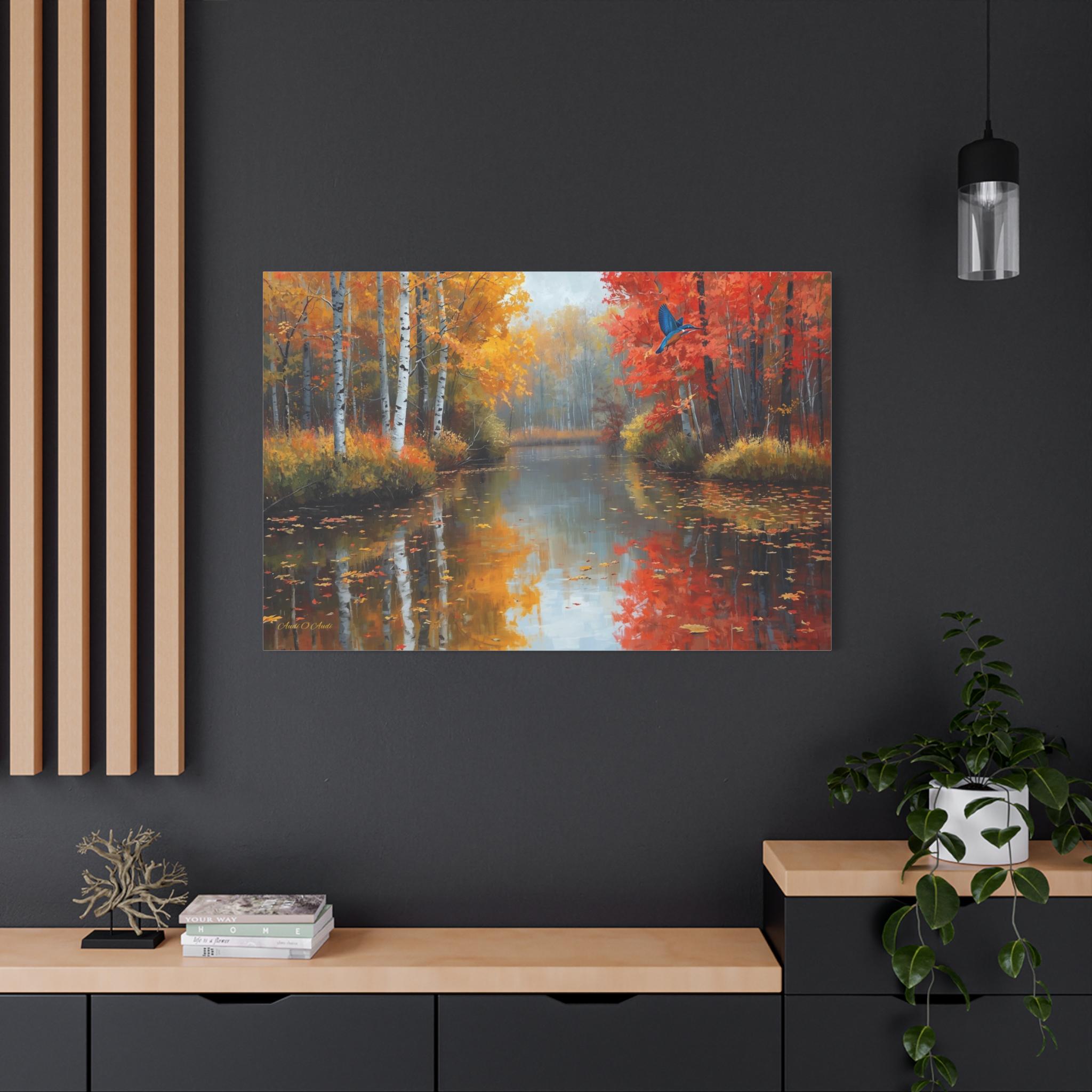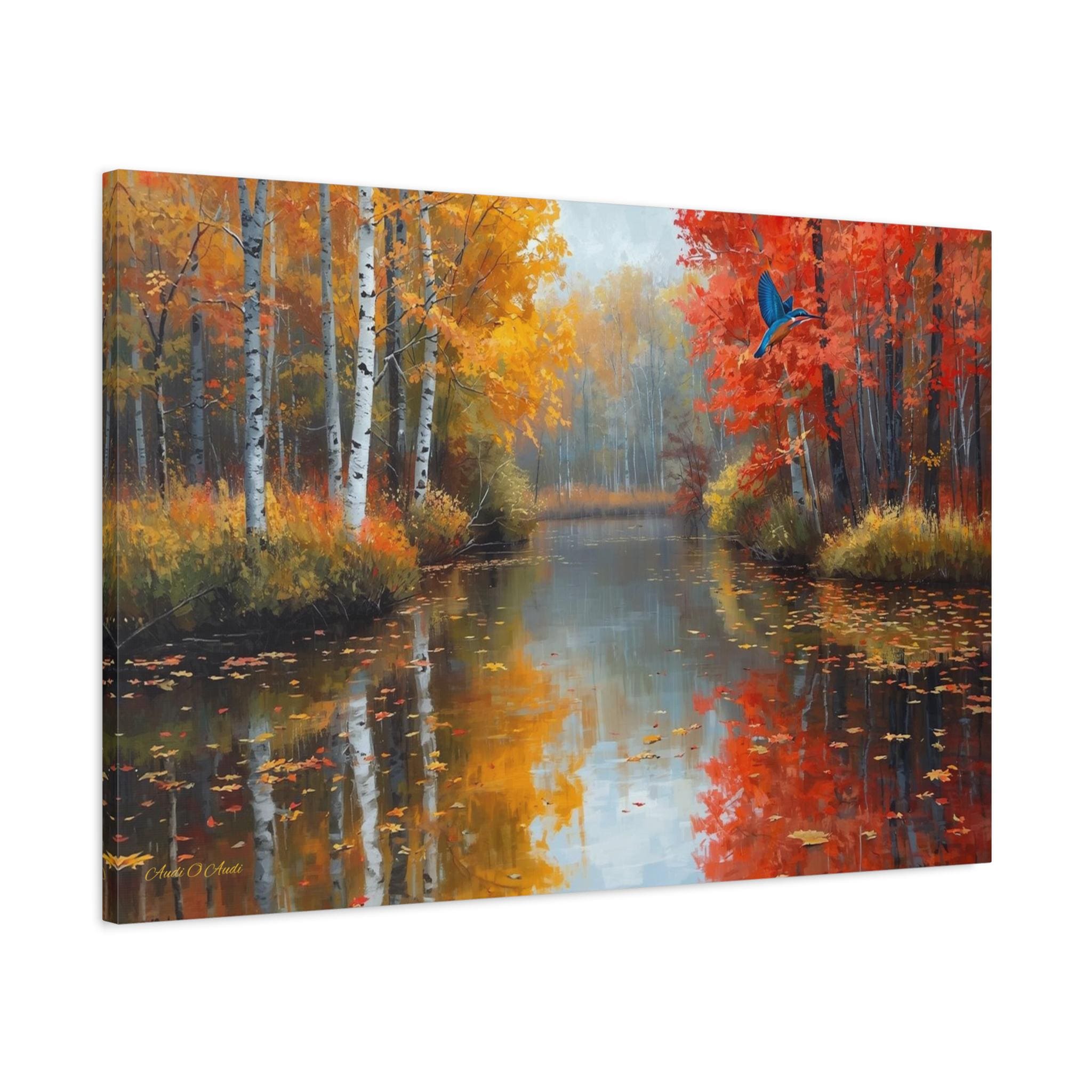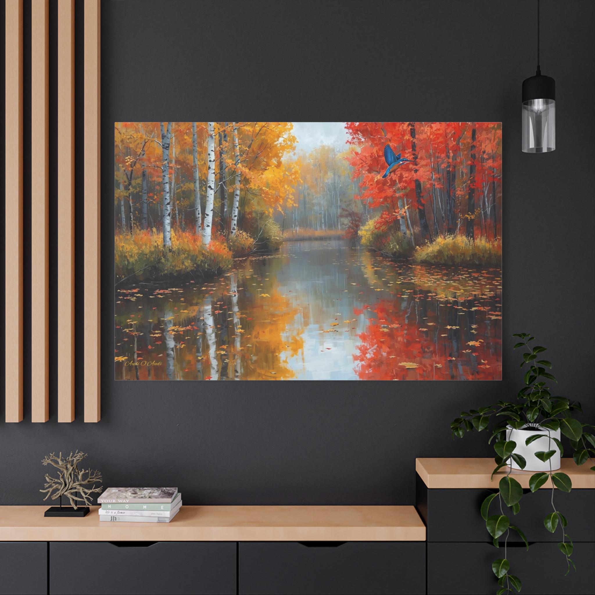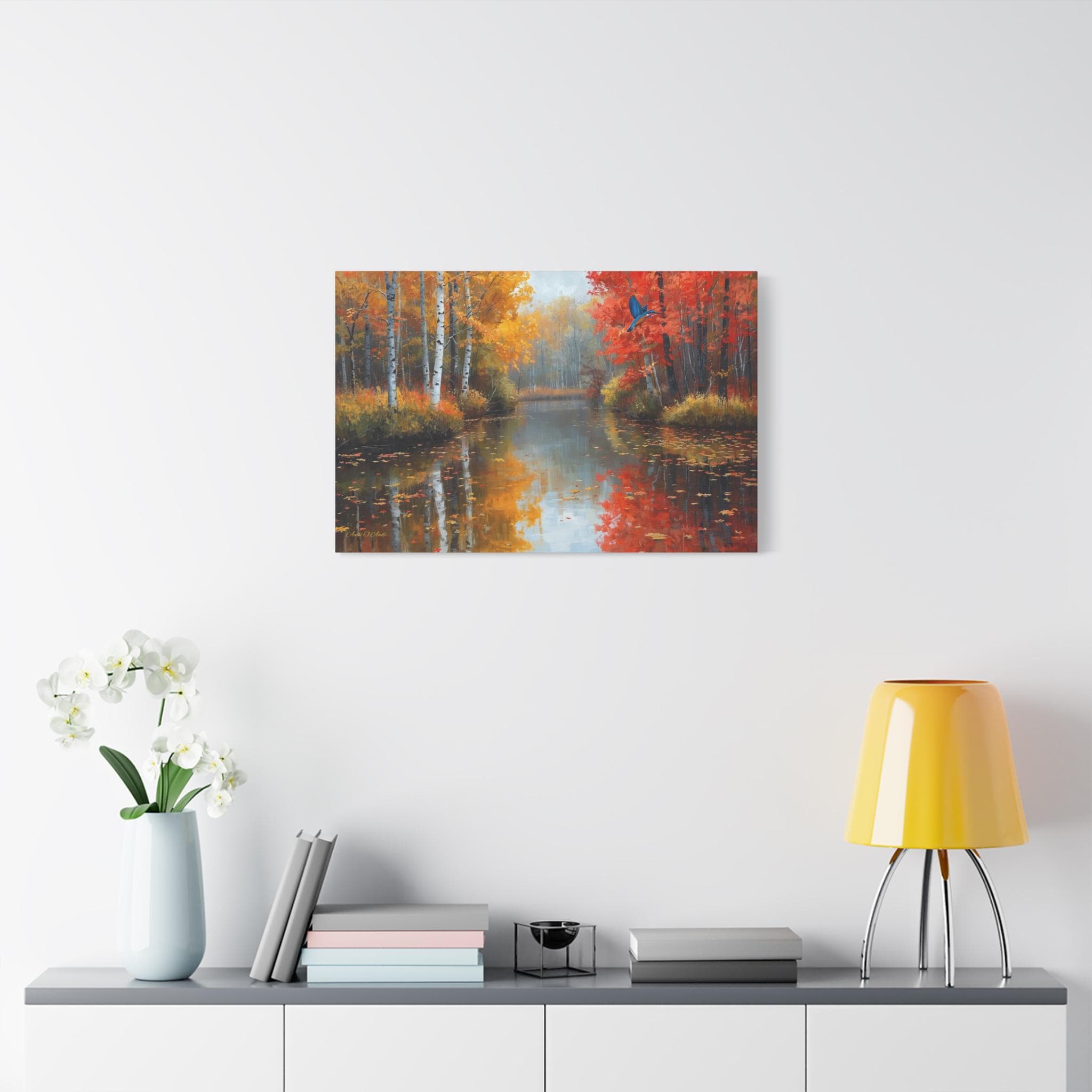 Bring the breathtaking, crisp beauty of the fall season and its vibrant wildlife into your home with this stunning autumn river canvas print. This captivating artwork features a serene, glass-like river reflecting a magnificent forest at the peak of autumn color. Golden birch trees and fiery red maples line the banks, while a brilliant blue kingfisher bird darts gracefully across the scene.