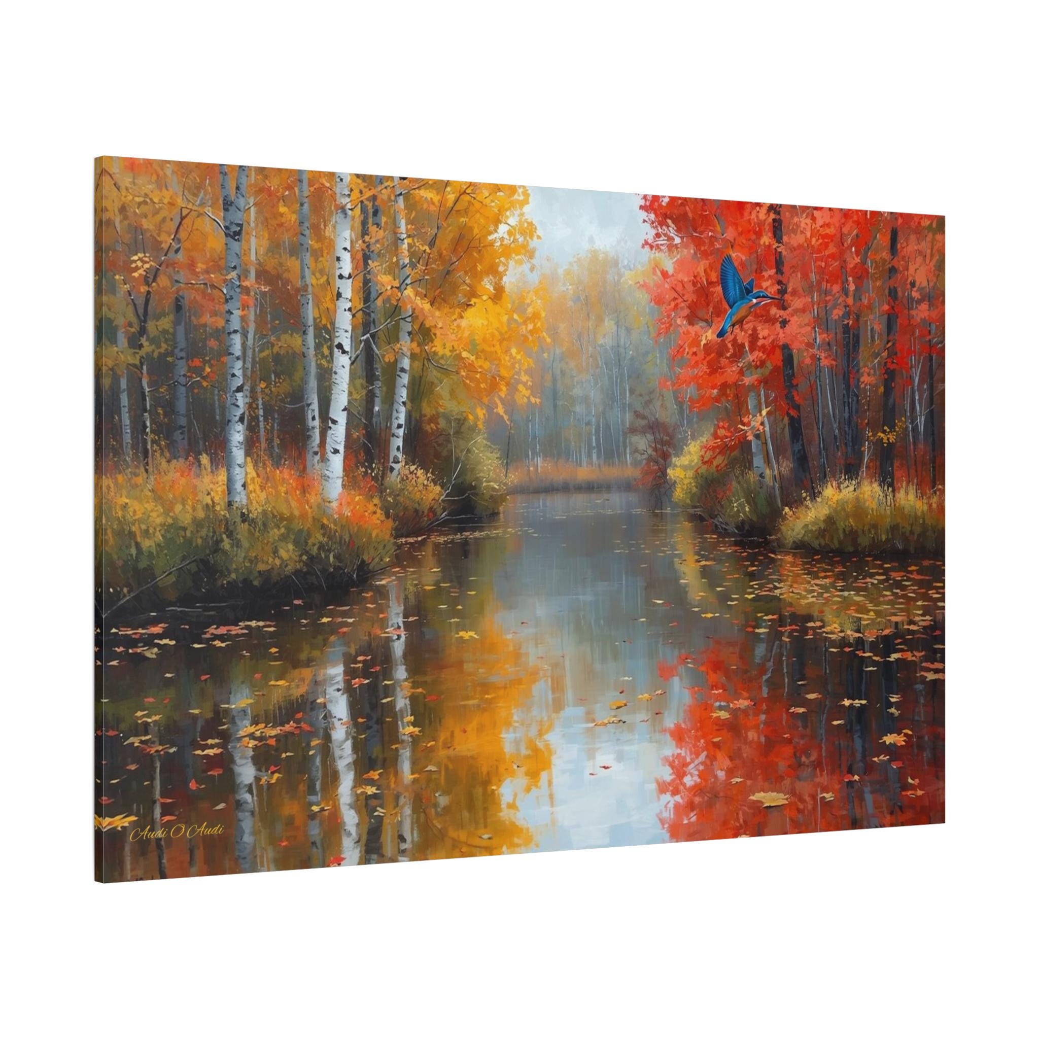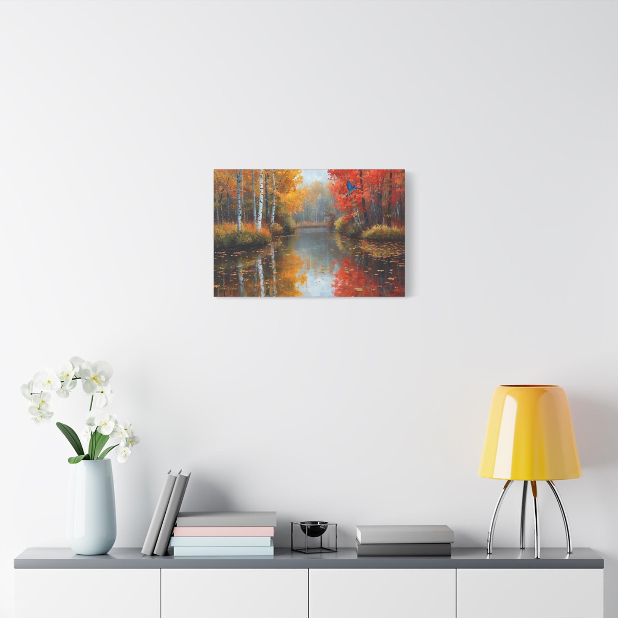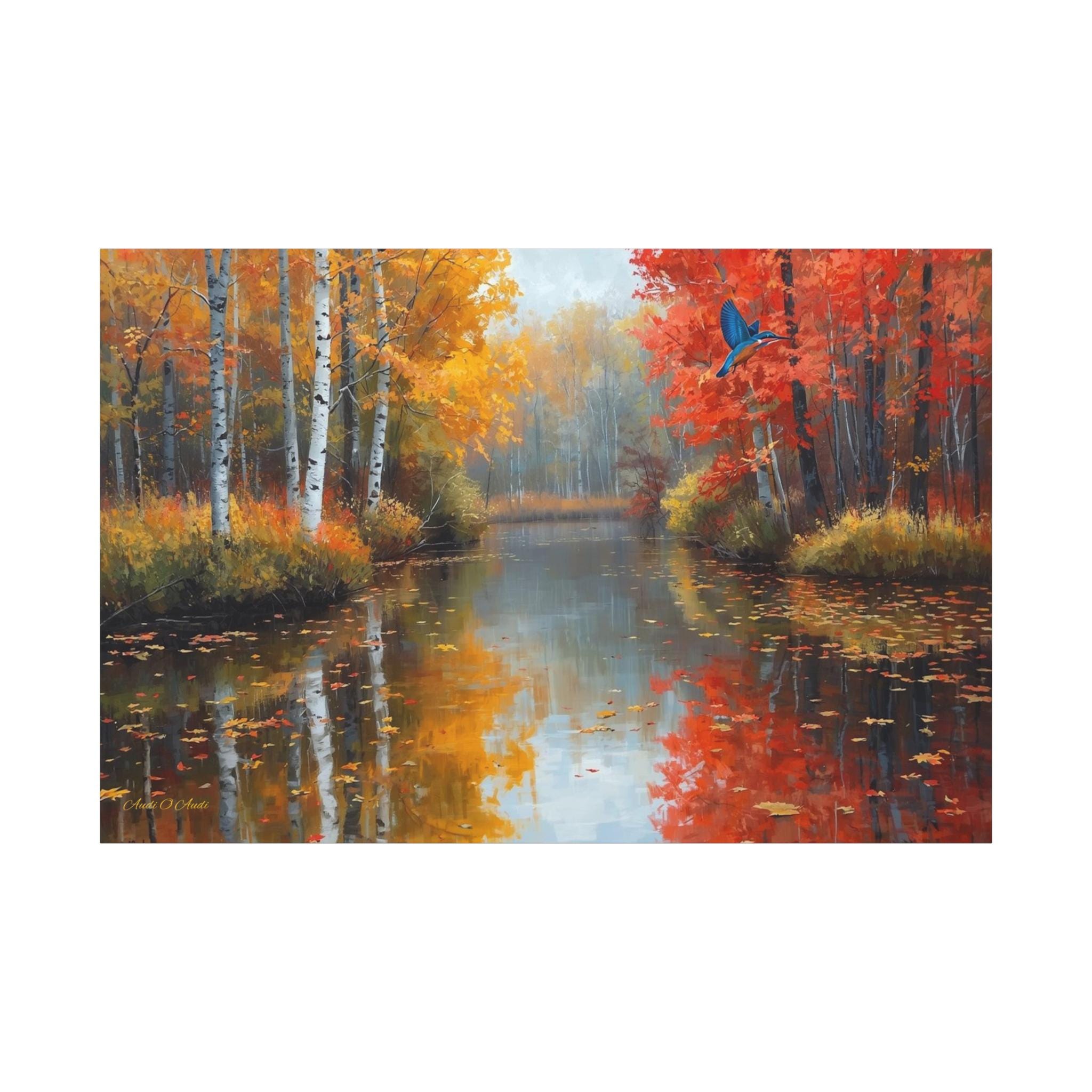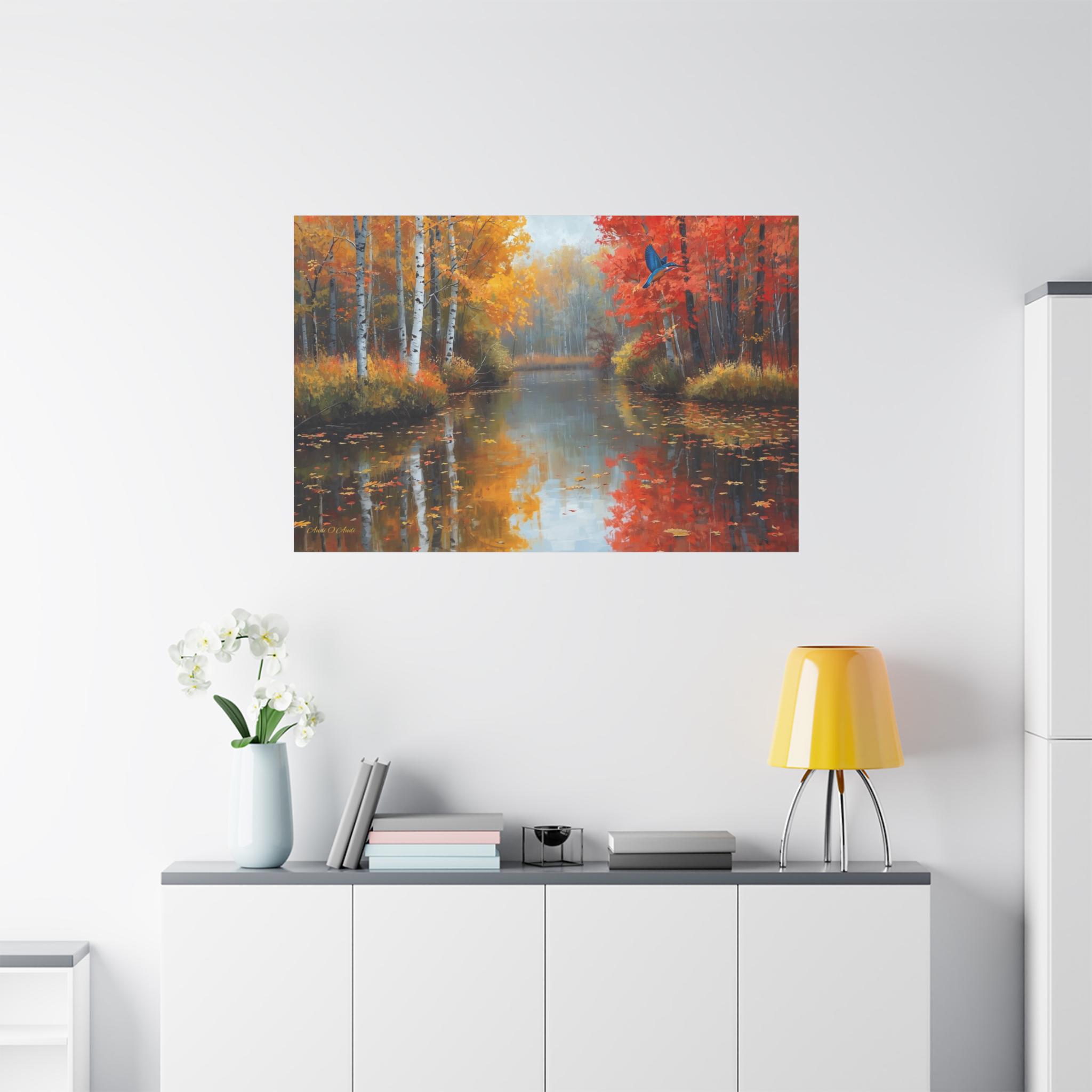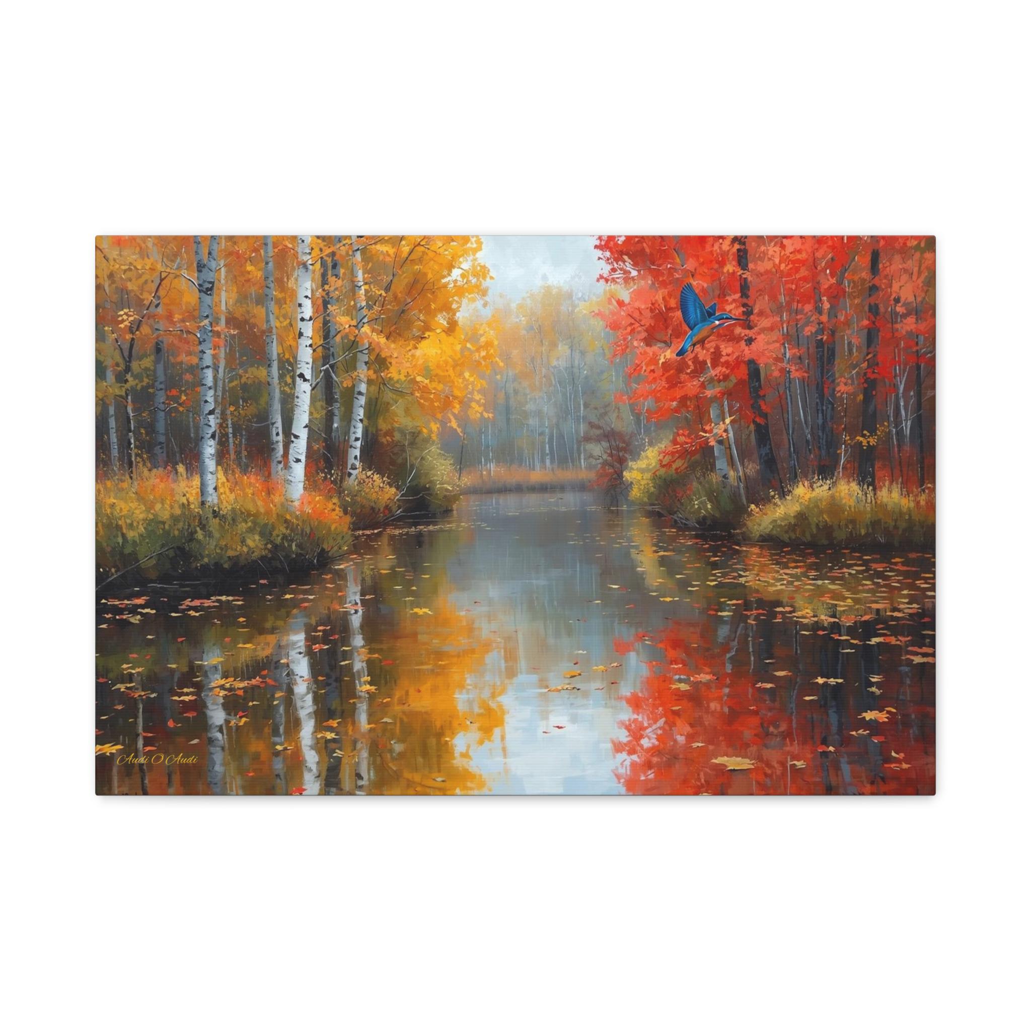 Bring the breathtaking, crisp beauty of the fall season and its vibrant wildlife into your home with this stunning autumn river canvas print. This captivating artwork features a serene, glass-like river reflecting a magnificent forest at the peak of autumn color. Golden birch trees and fiery red maples line the banks, while a brilliant blue kingfisher bird darts gracefully across the scene.