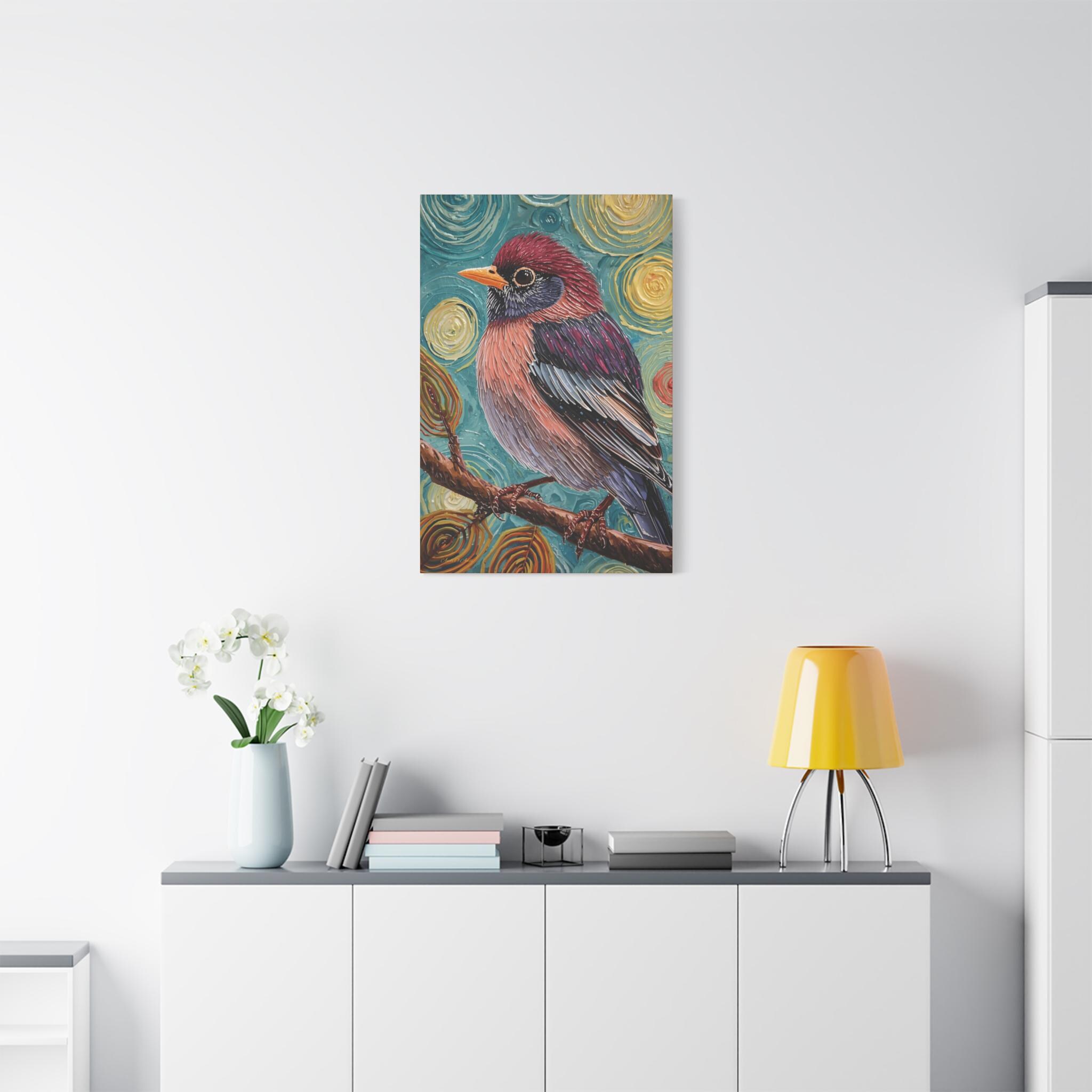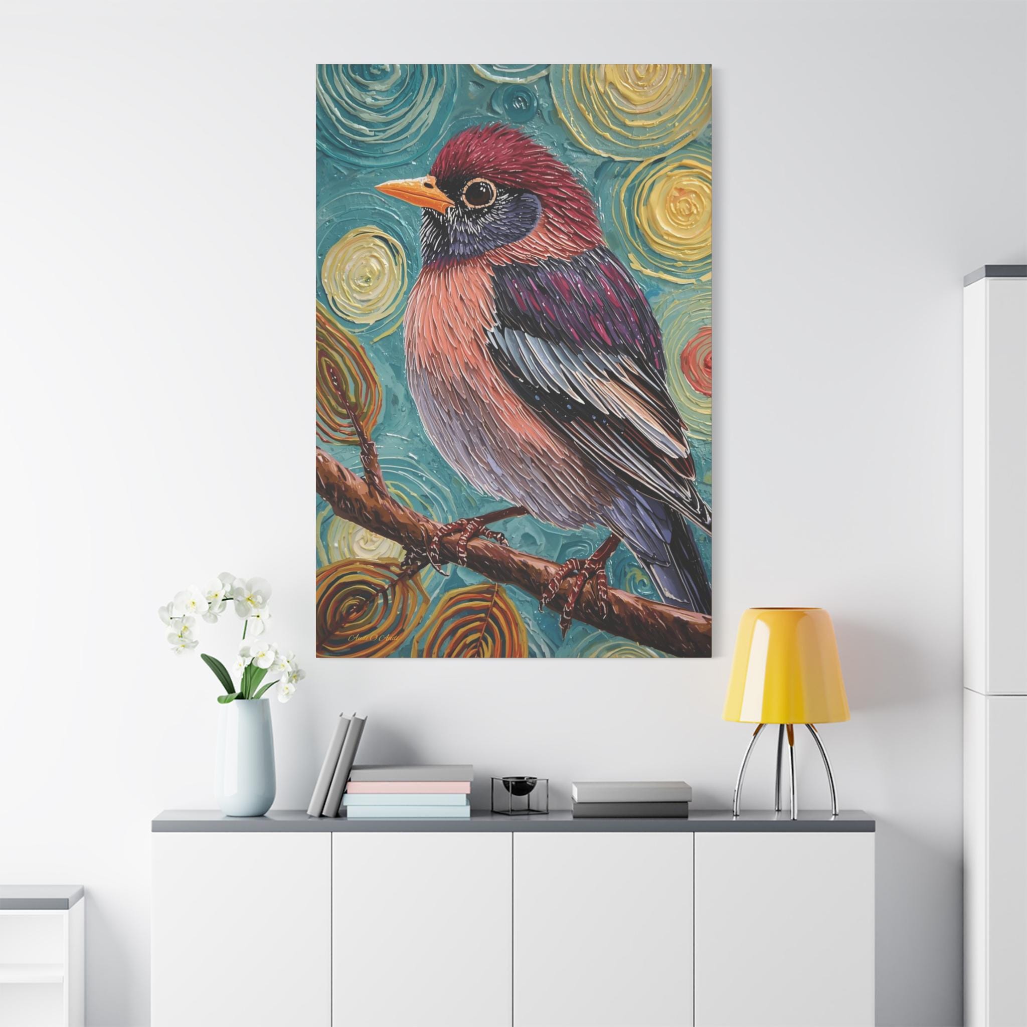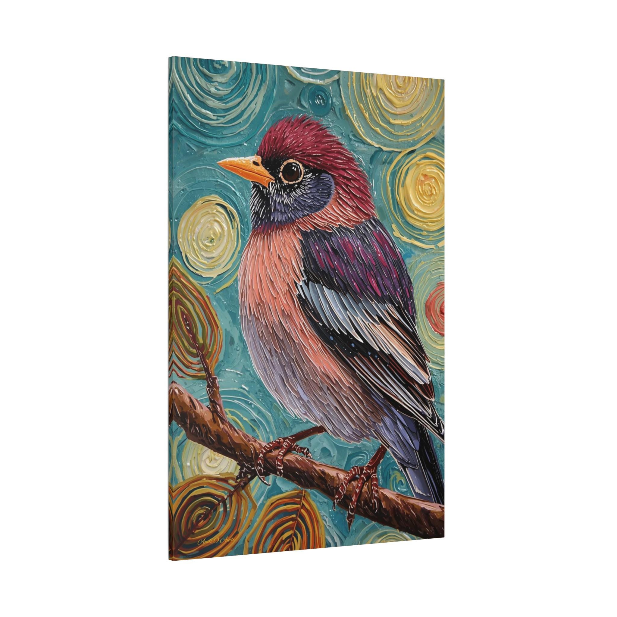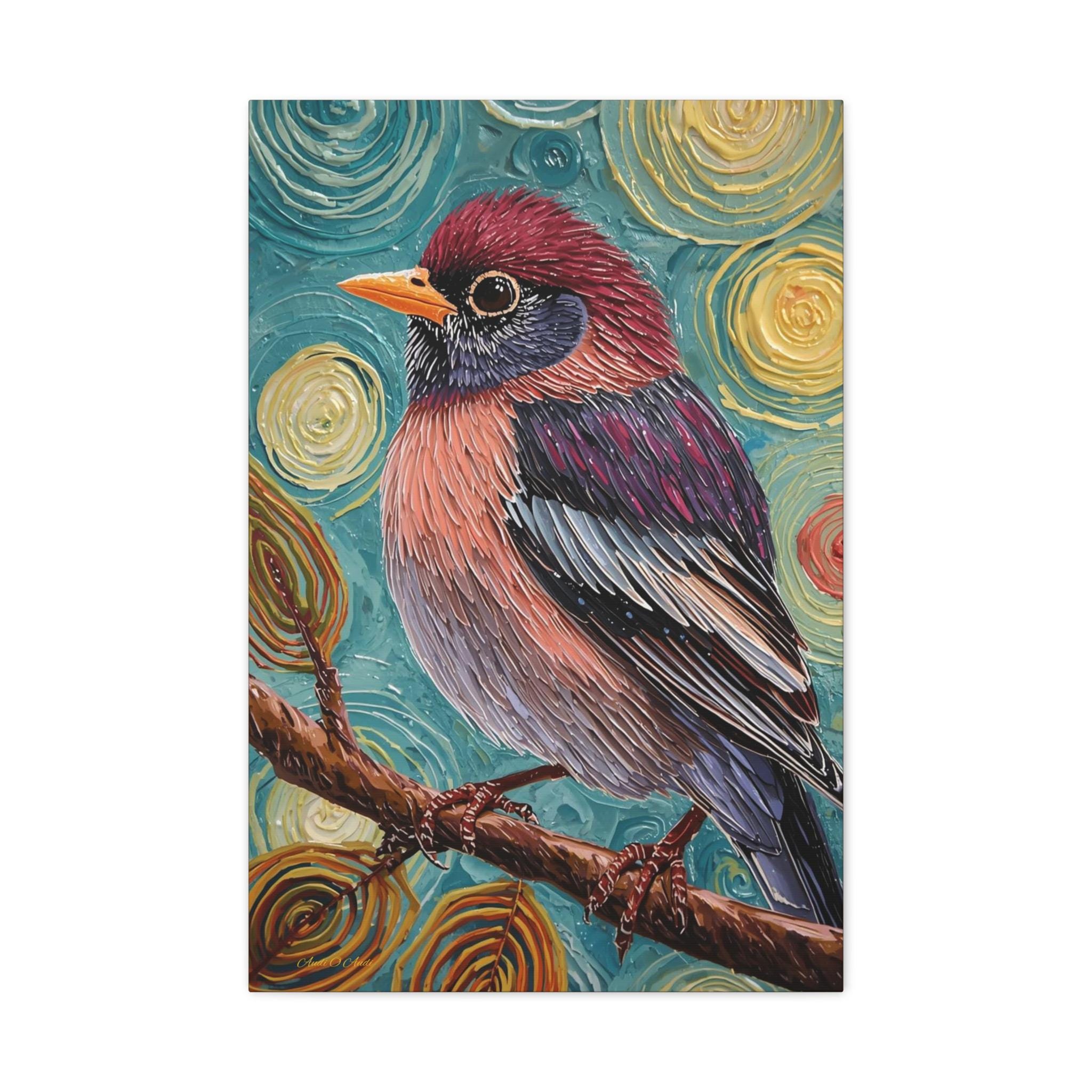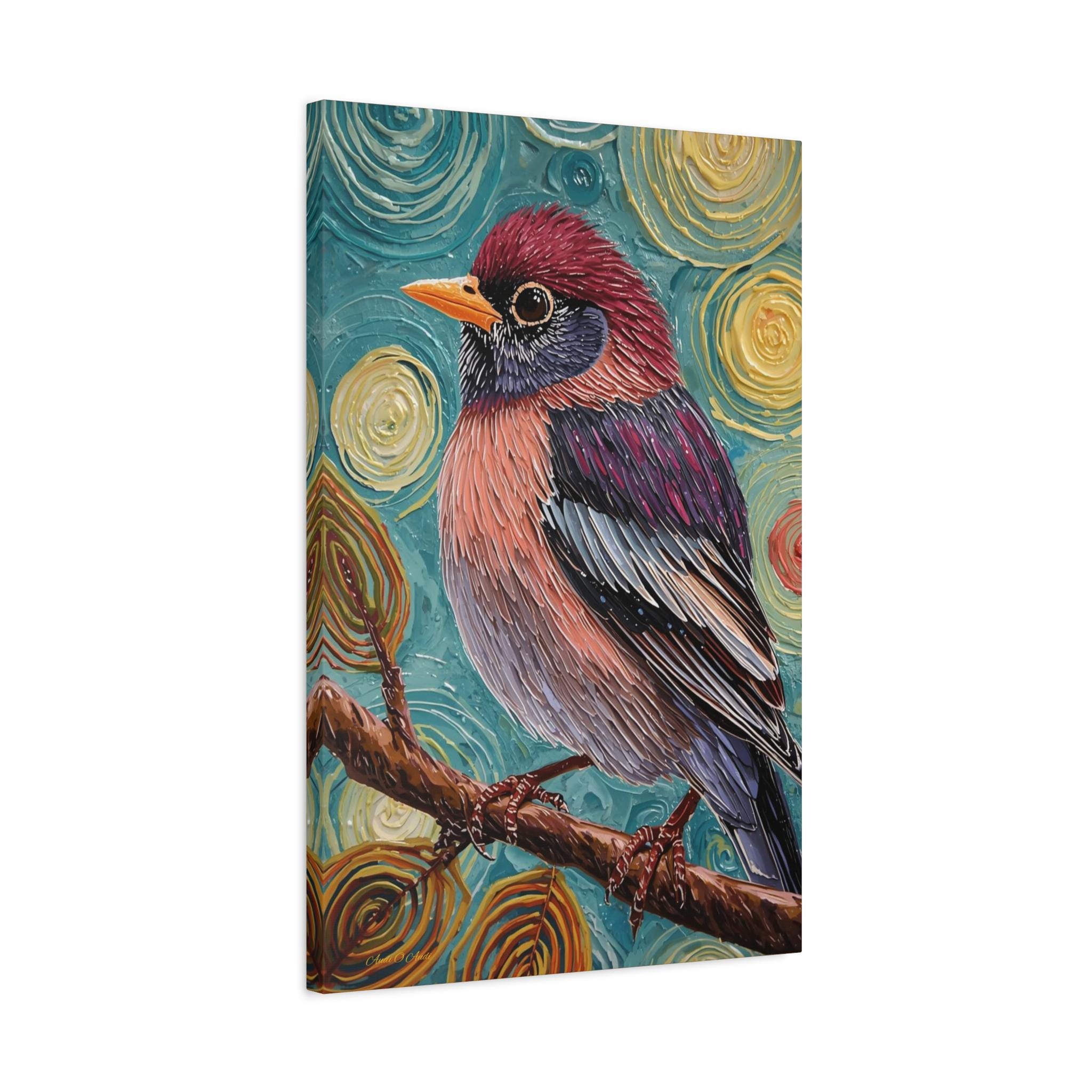 The composition is a close-up, vertical portrait of a brightly colored songbird perched on a brown branch. The bird is the undisputed focal point, rendered with detailed feather patterns contrasting with the abstract background. The background is a highly stylized field of concentric, swirling circles in shades of turquoise, yellow, and brown, creating a hypnotic and cosmic feel around the subject. The vertical format emphasizes the bird's profile and the height of the pattern.