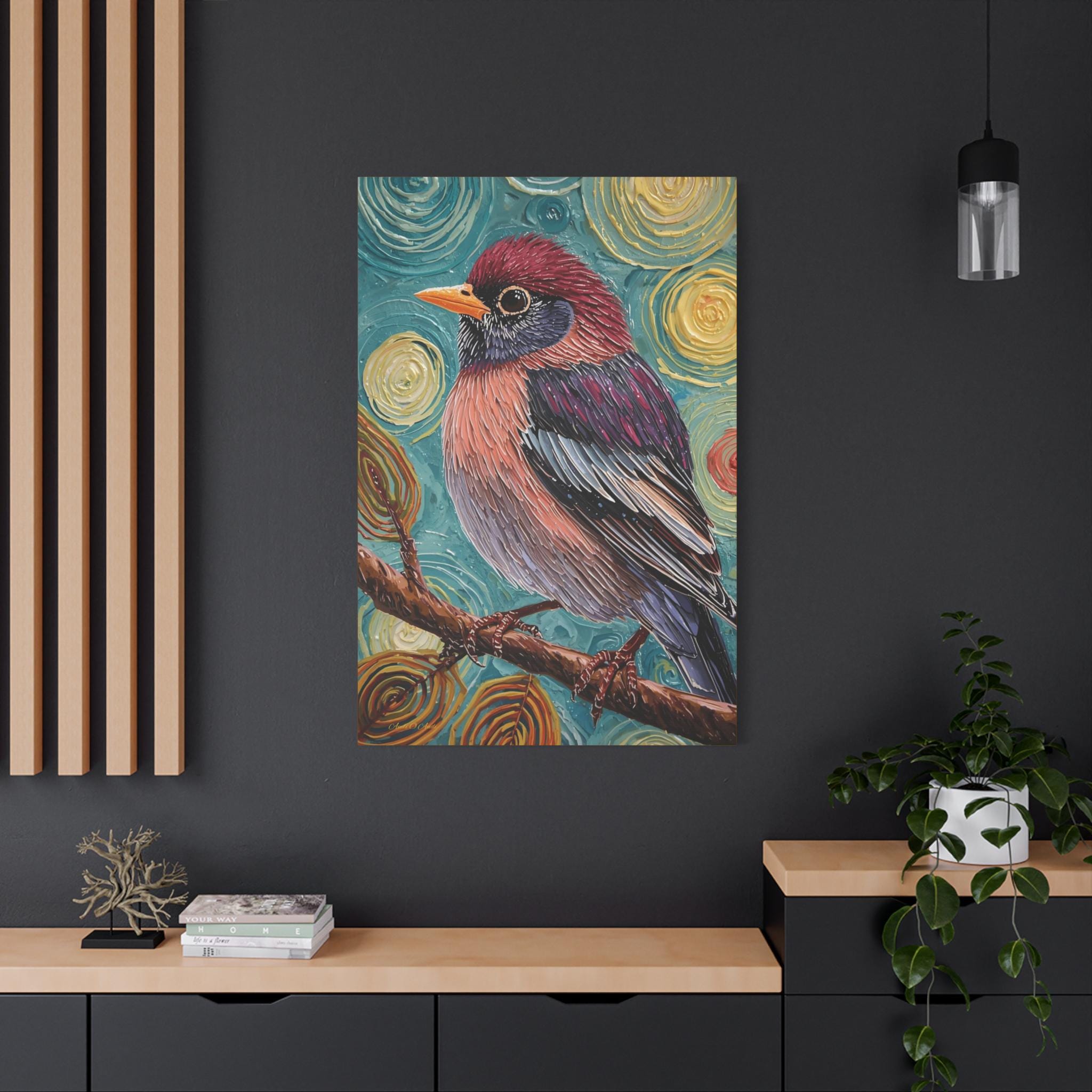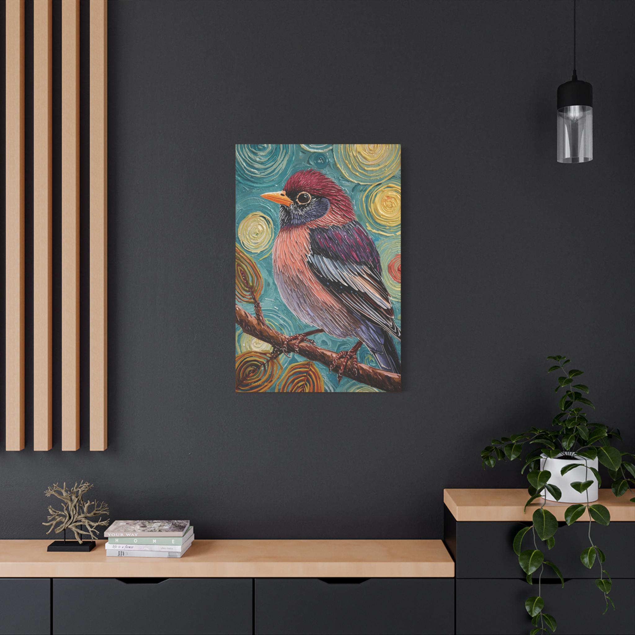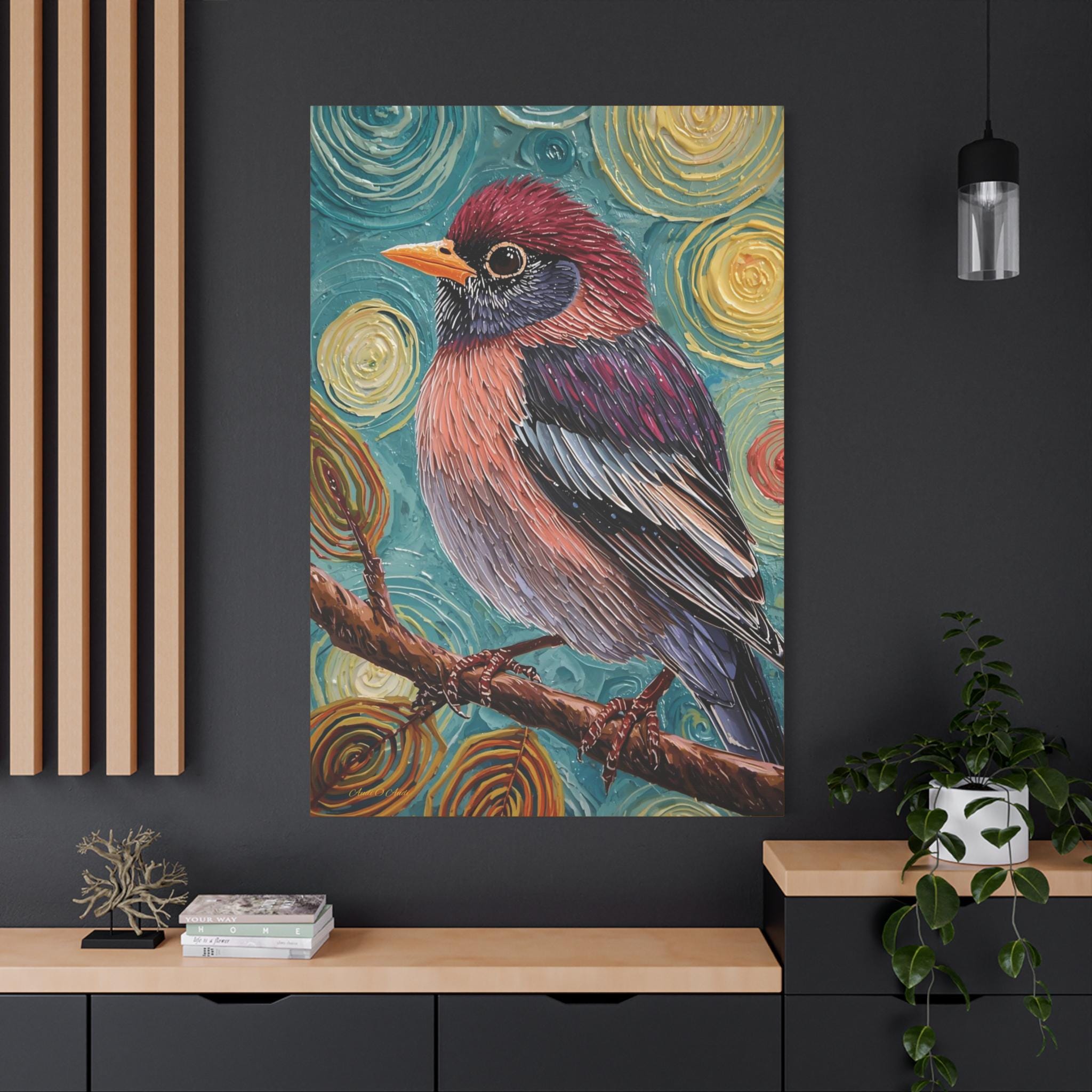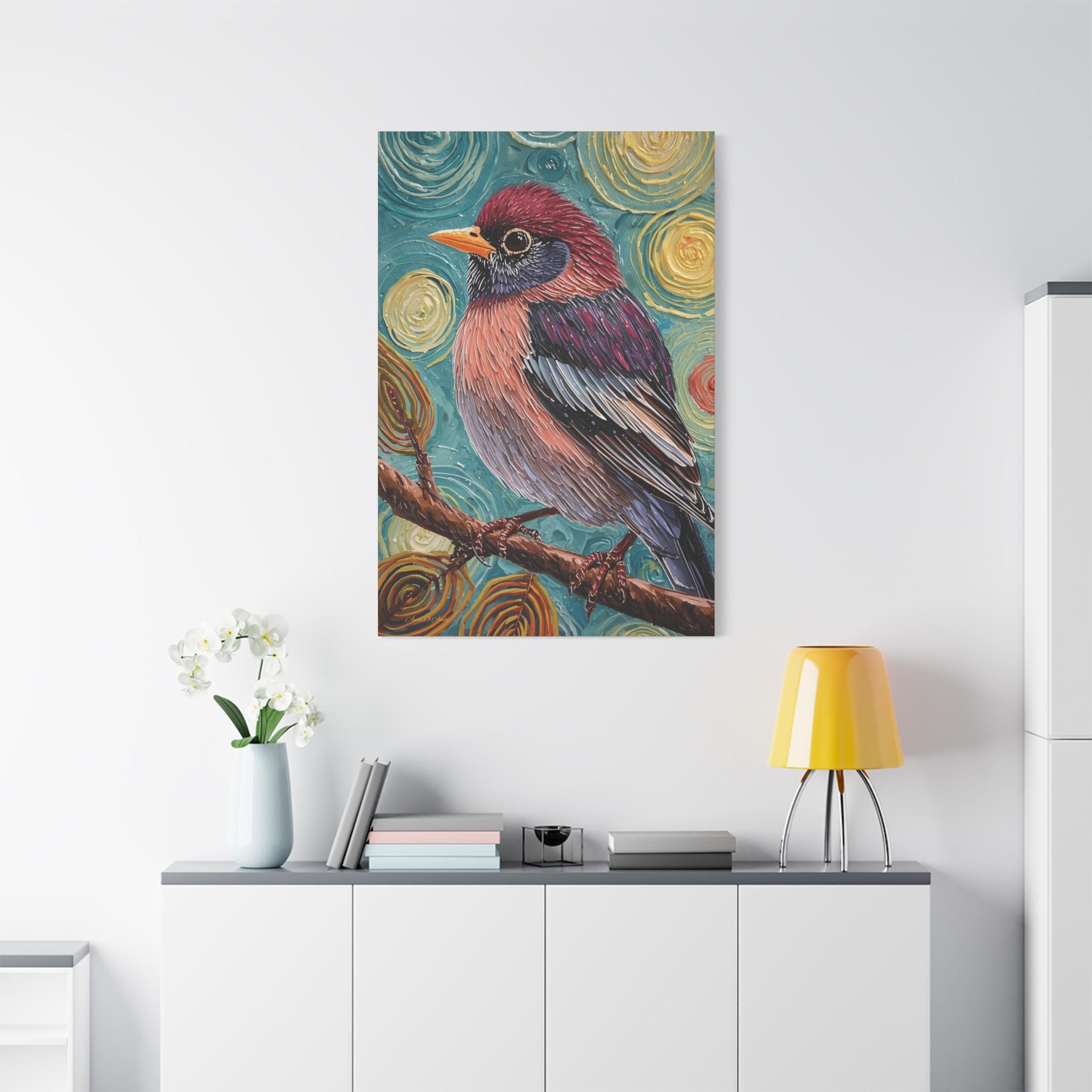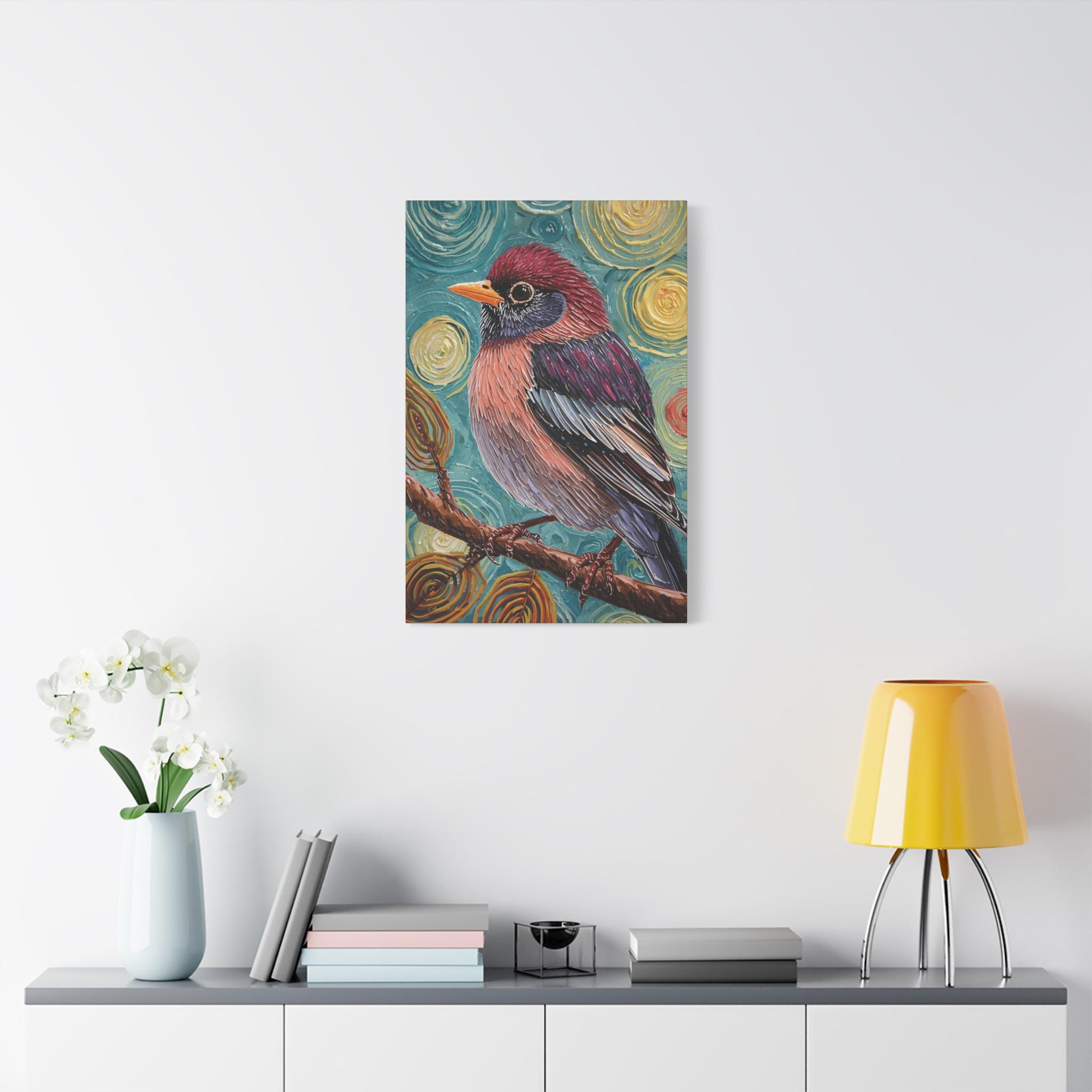 The composition is a close-up, vertical portrait of a brightly colored songbird perched on a brown branch. The bird is the undisputed focal point, rendered with detailed feather patterns contrasting with the abstract background. The background is a highly stylized field of concentric, swirling circles in shades of turquoise, yellow, and brown, creating a hypnotic and cosmic feel around the subject. The vertical format emphasizes the bird's profile and the height of the pattern.