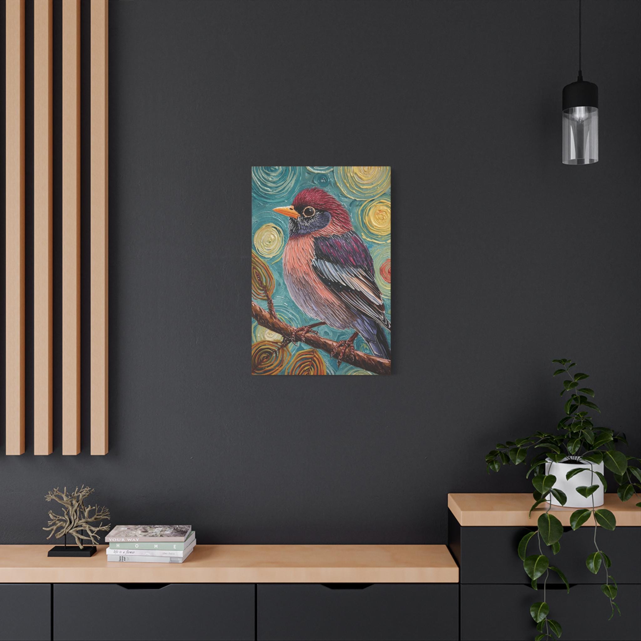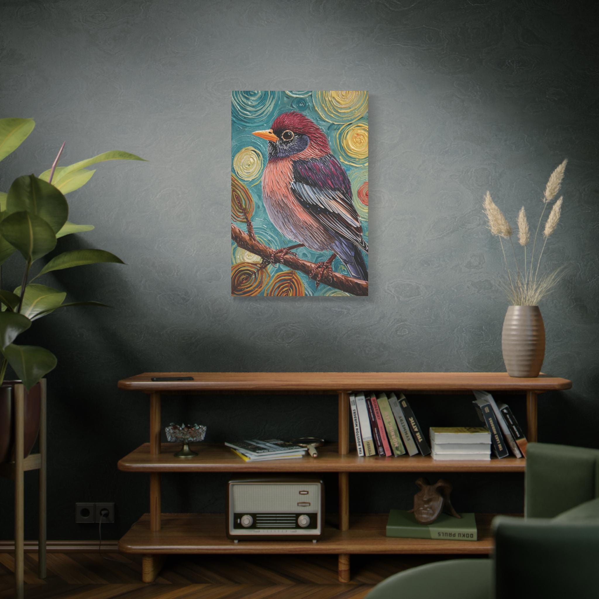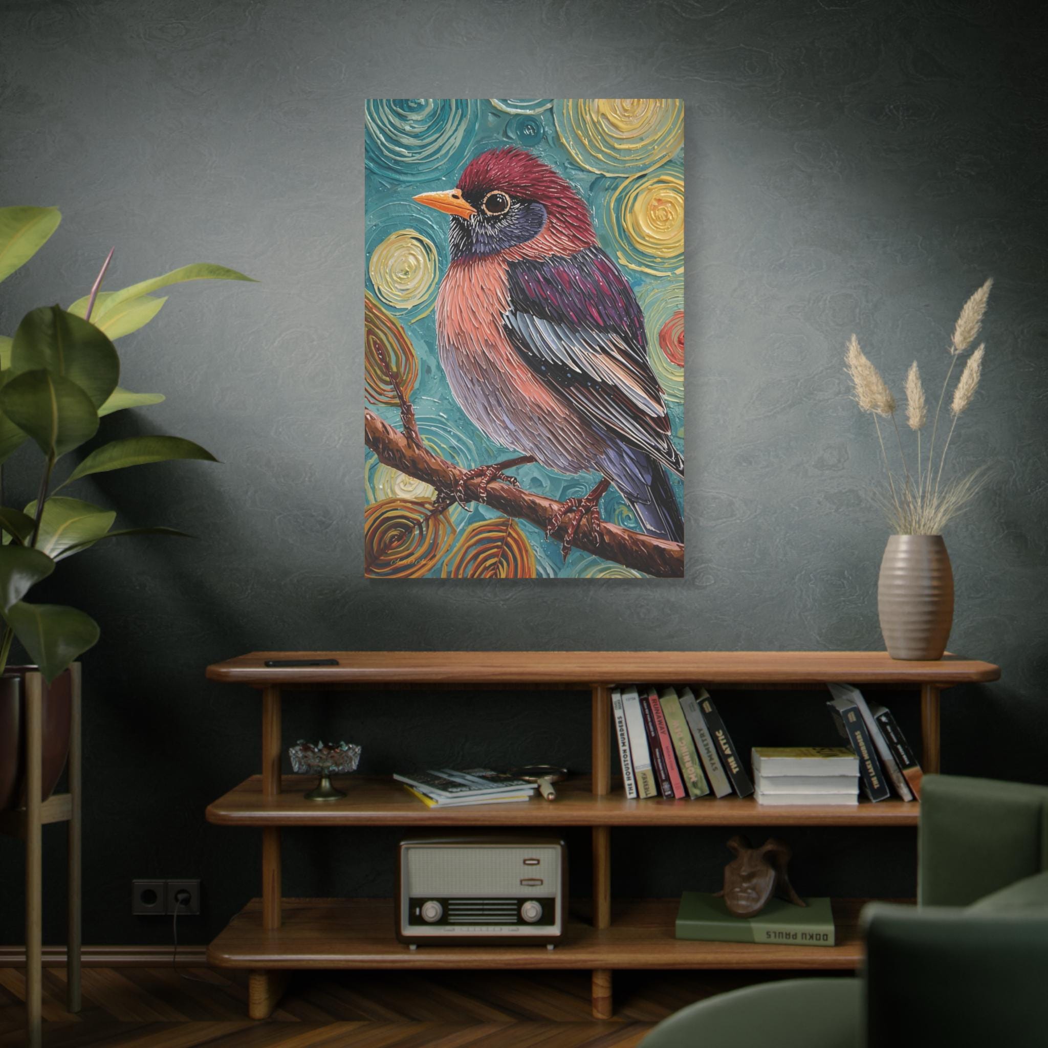 The artwork transforms a simple natural subject into a compelling, energized, and slightly mysterious presence. It is a bold, modern, and highly decorative piece, perfect for adding saturated color and unique texture to a contemporary interior..