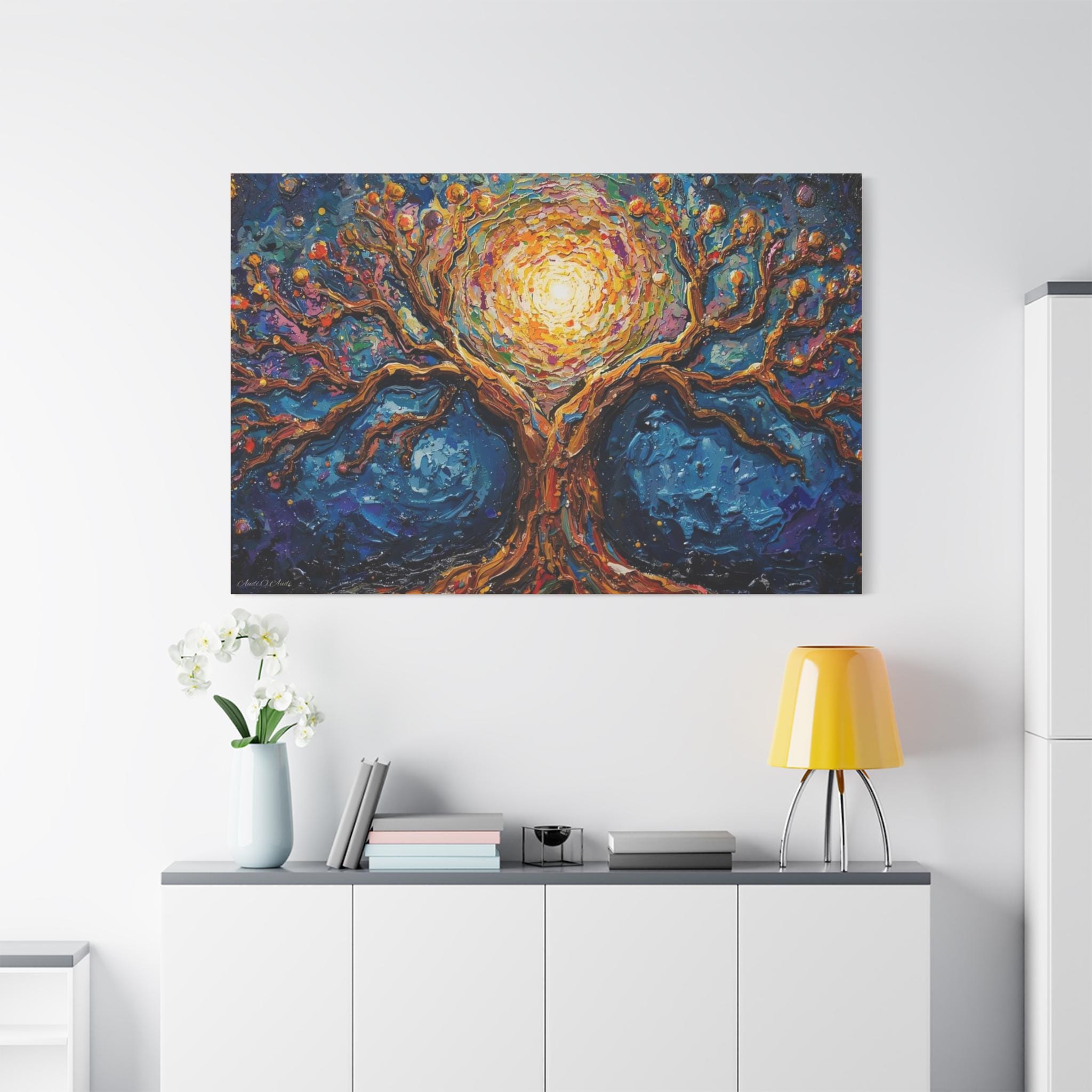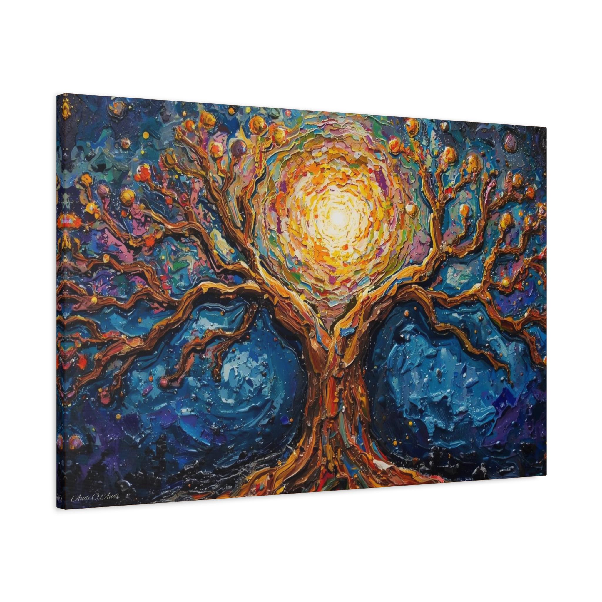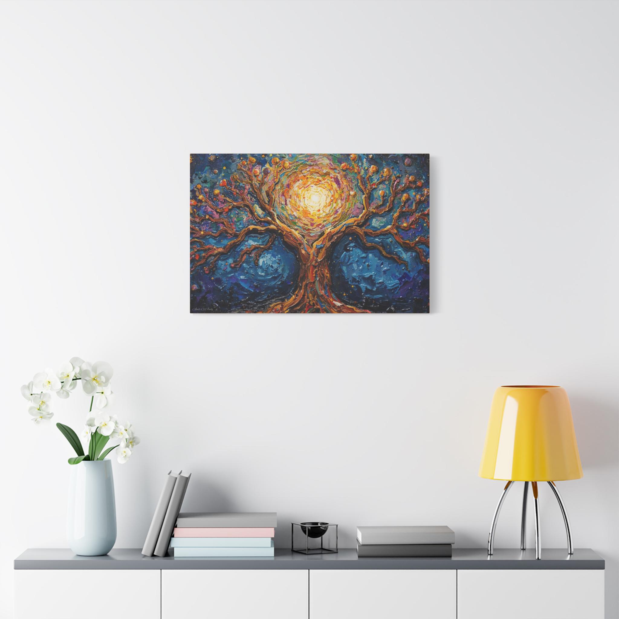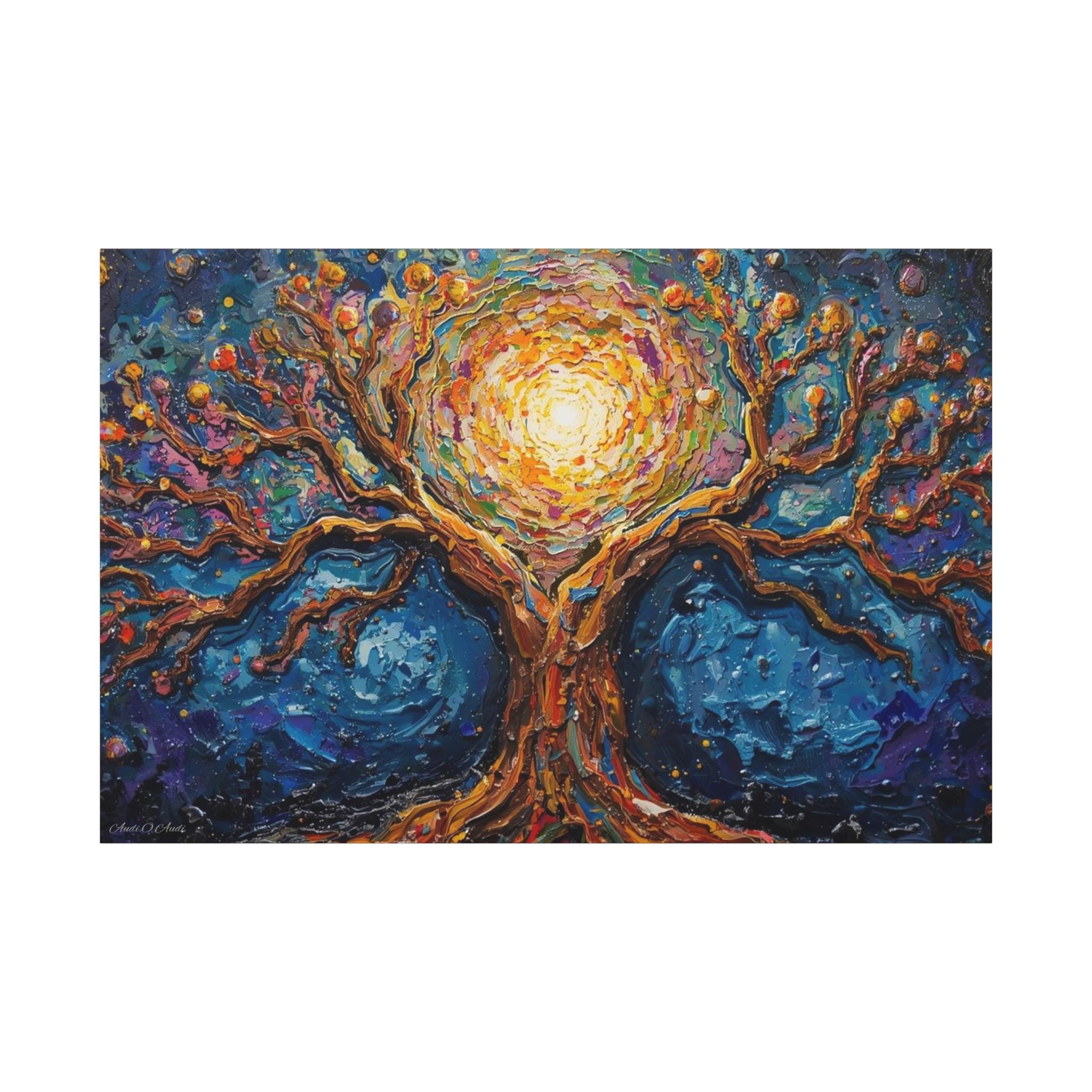 Illuminate your space with the mystical beauty of this Cosmic Tree of Life canvas print. Blending the grounding strength of nature with the ethereal glow of the cosmos, this artwork features a majestic tree whose branches seem to swirl with the energy of a galaxy.