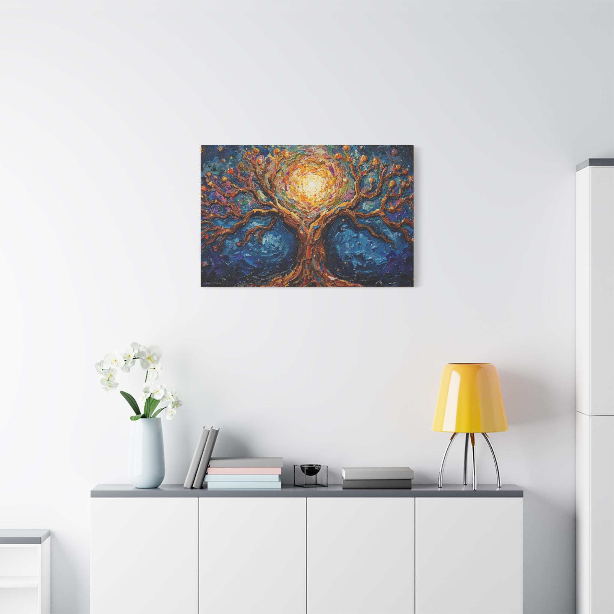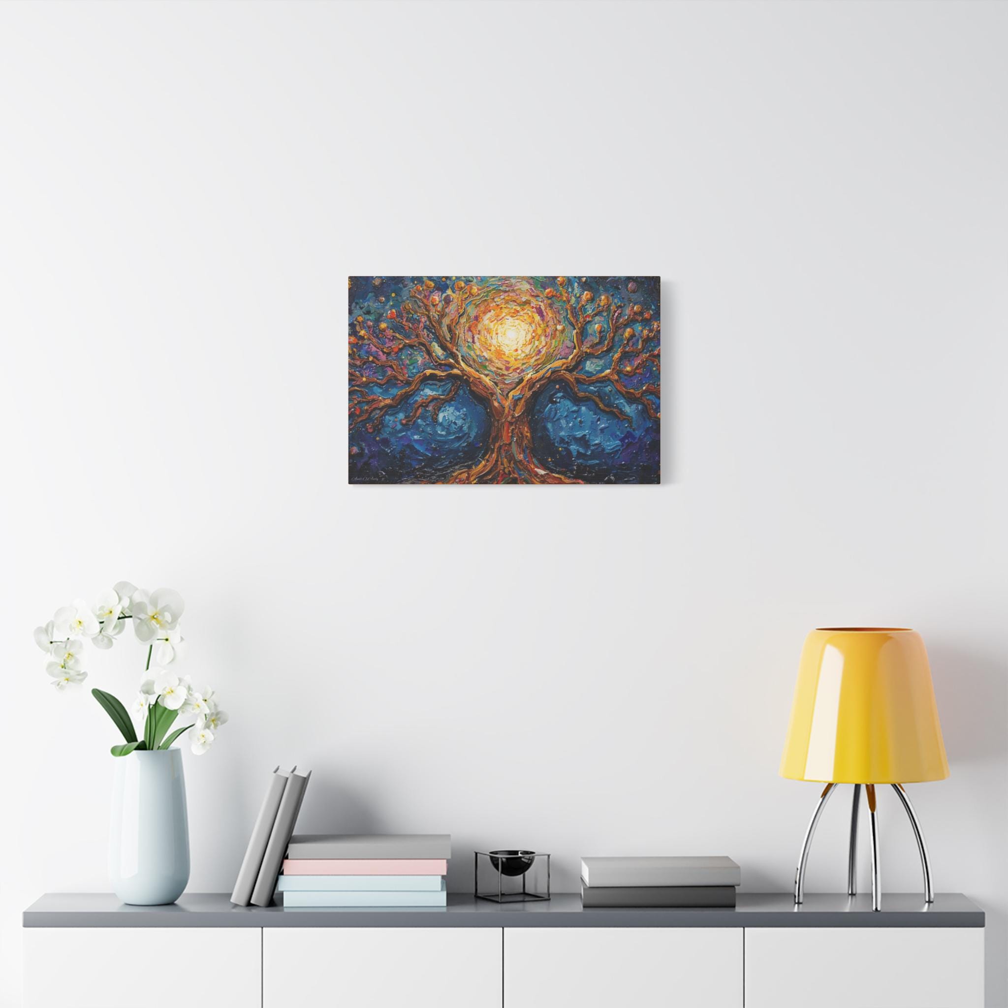 Premium Canvas: Printed on high-grade, archival canvas that captures the intense contrast between the deep blues and the glowing golden center.