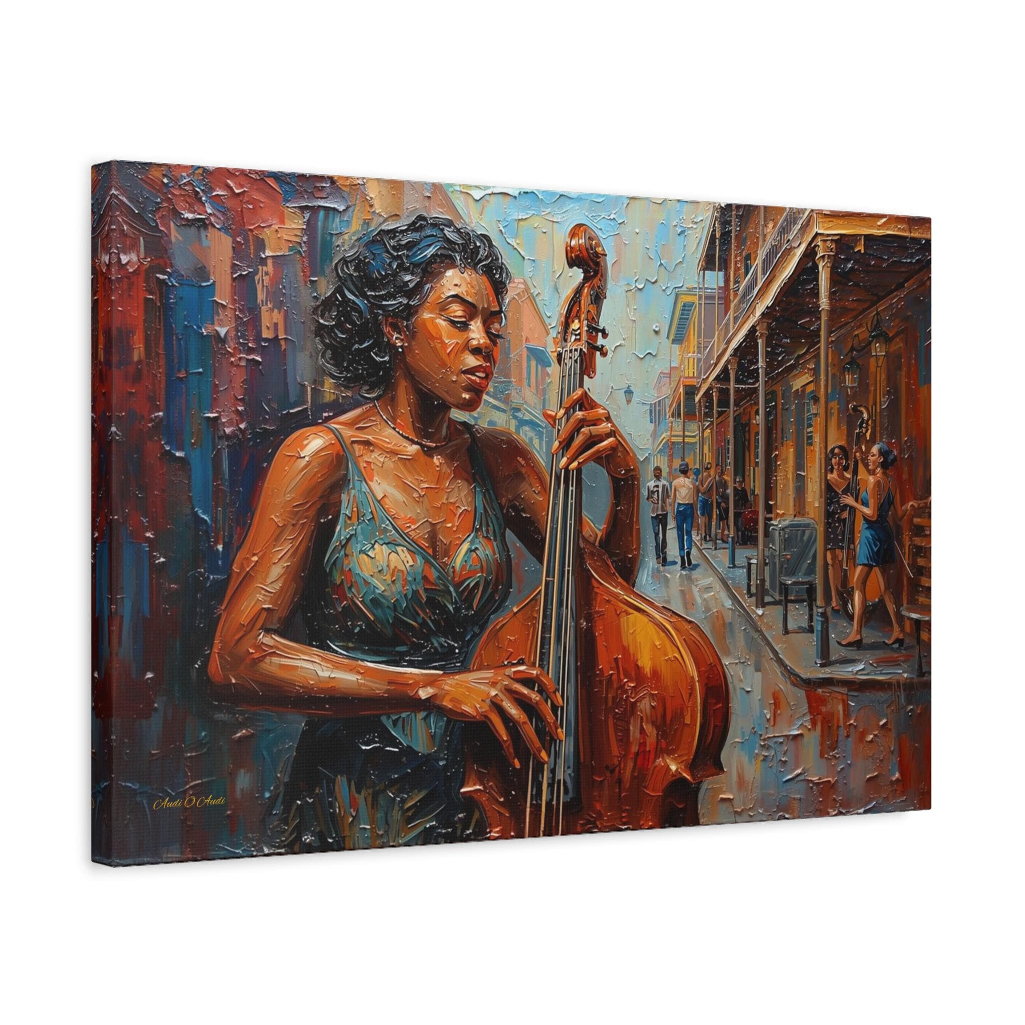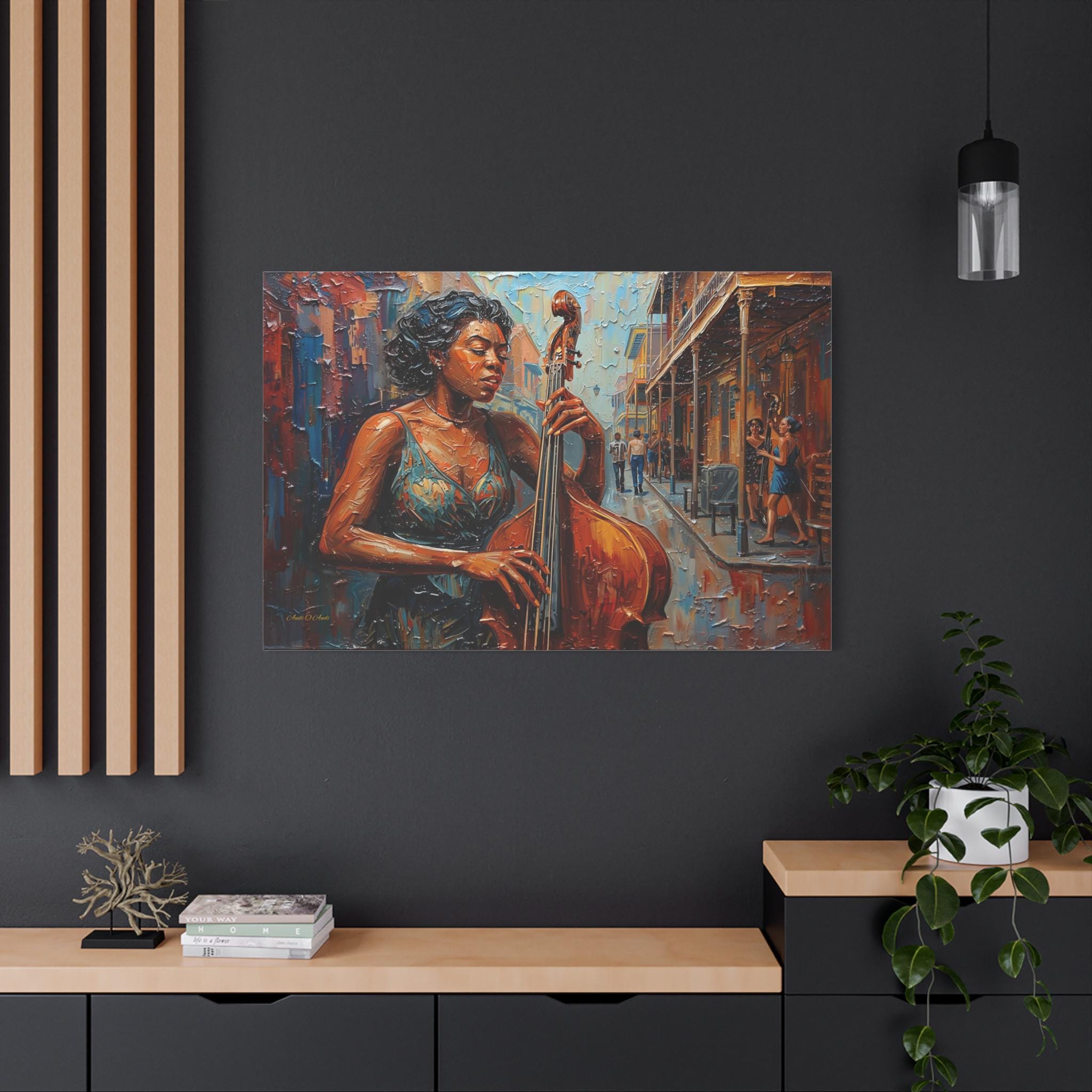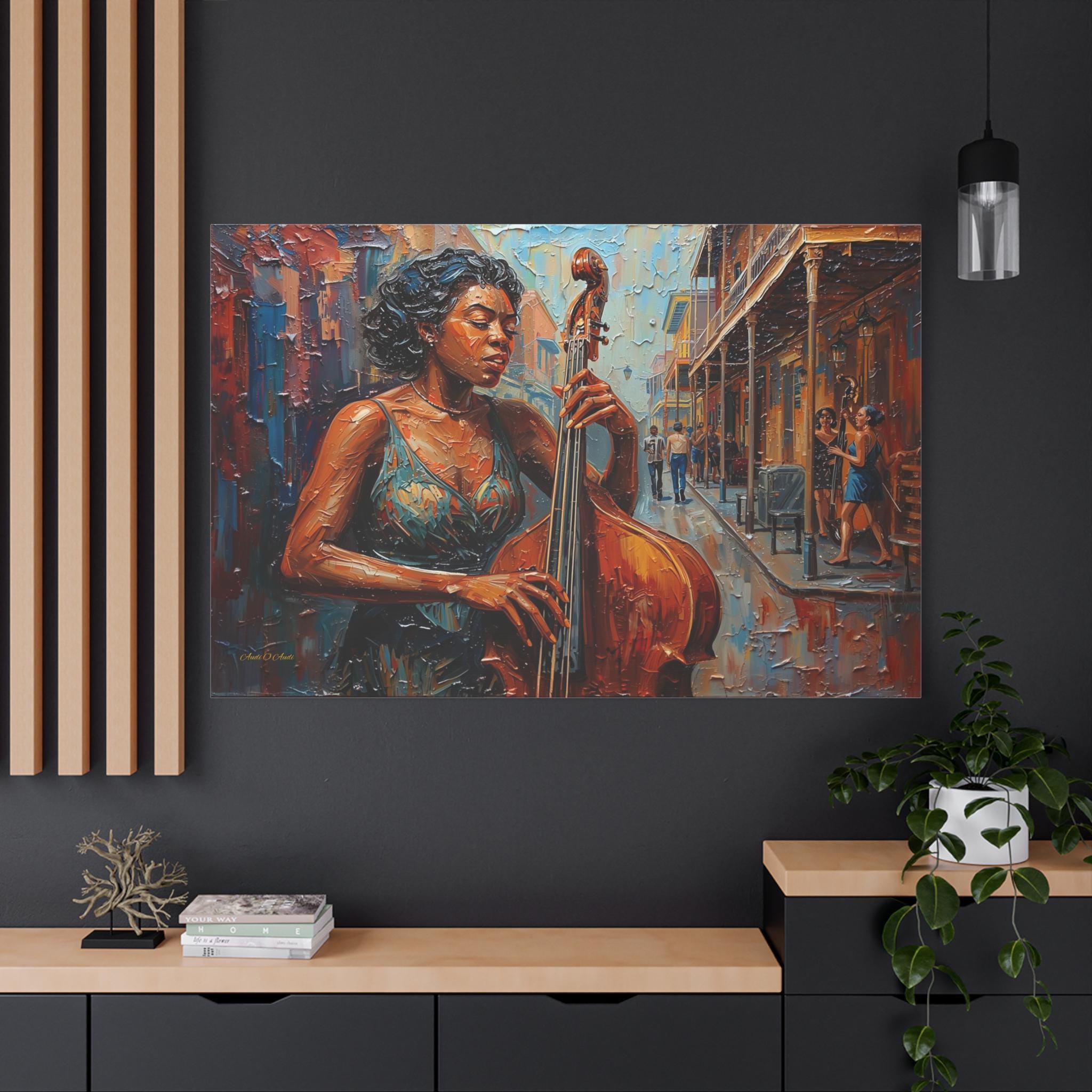 Feel the deep, resonant rhythm of the French Quarter with this elegant canvas print of a female jazz musician. This soulful artwork features a bassist lost in the music, gracefully playing a double bass on a vibrant New Orleans street lined with classic iron balconies.