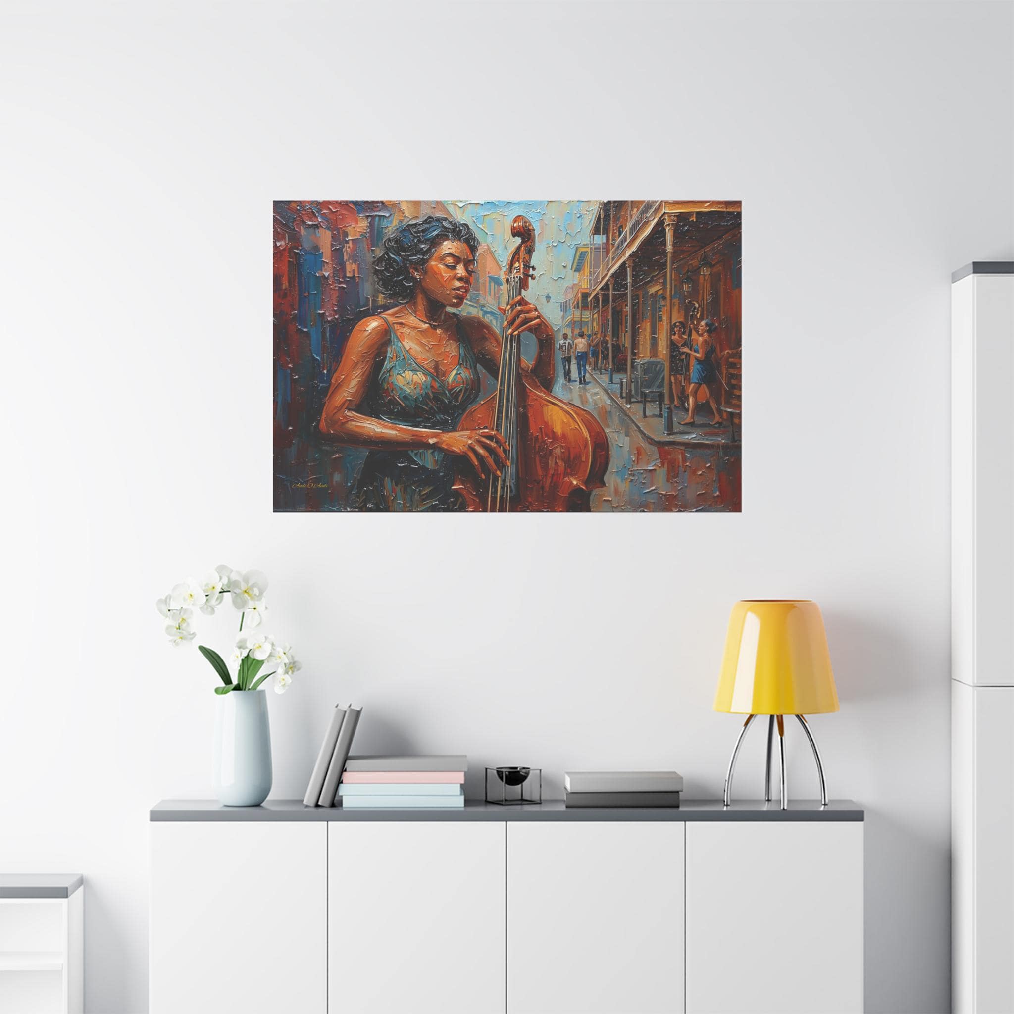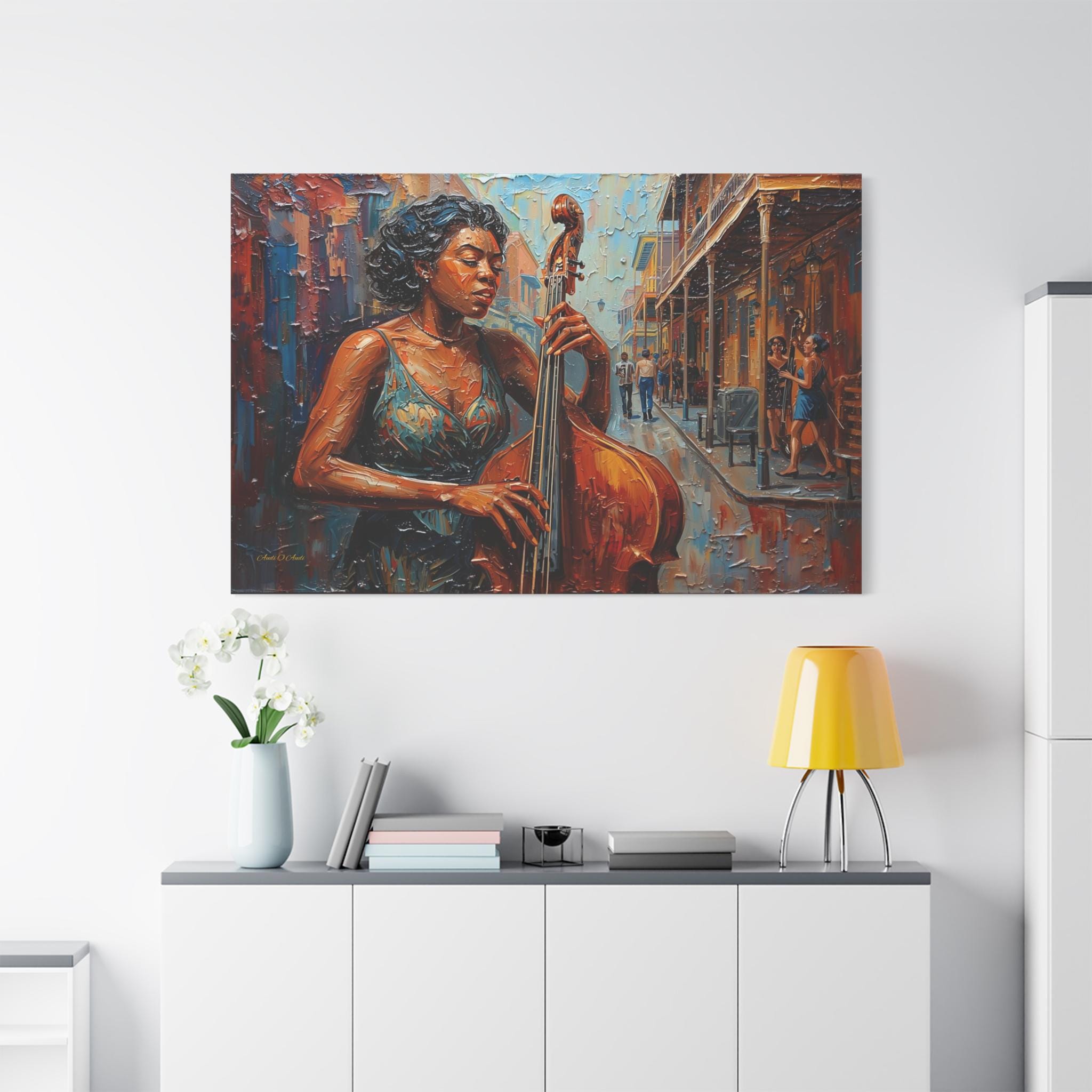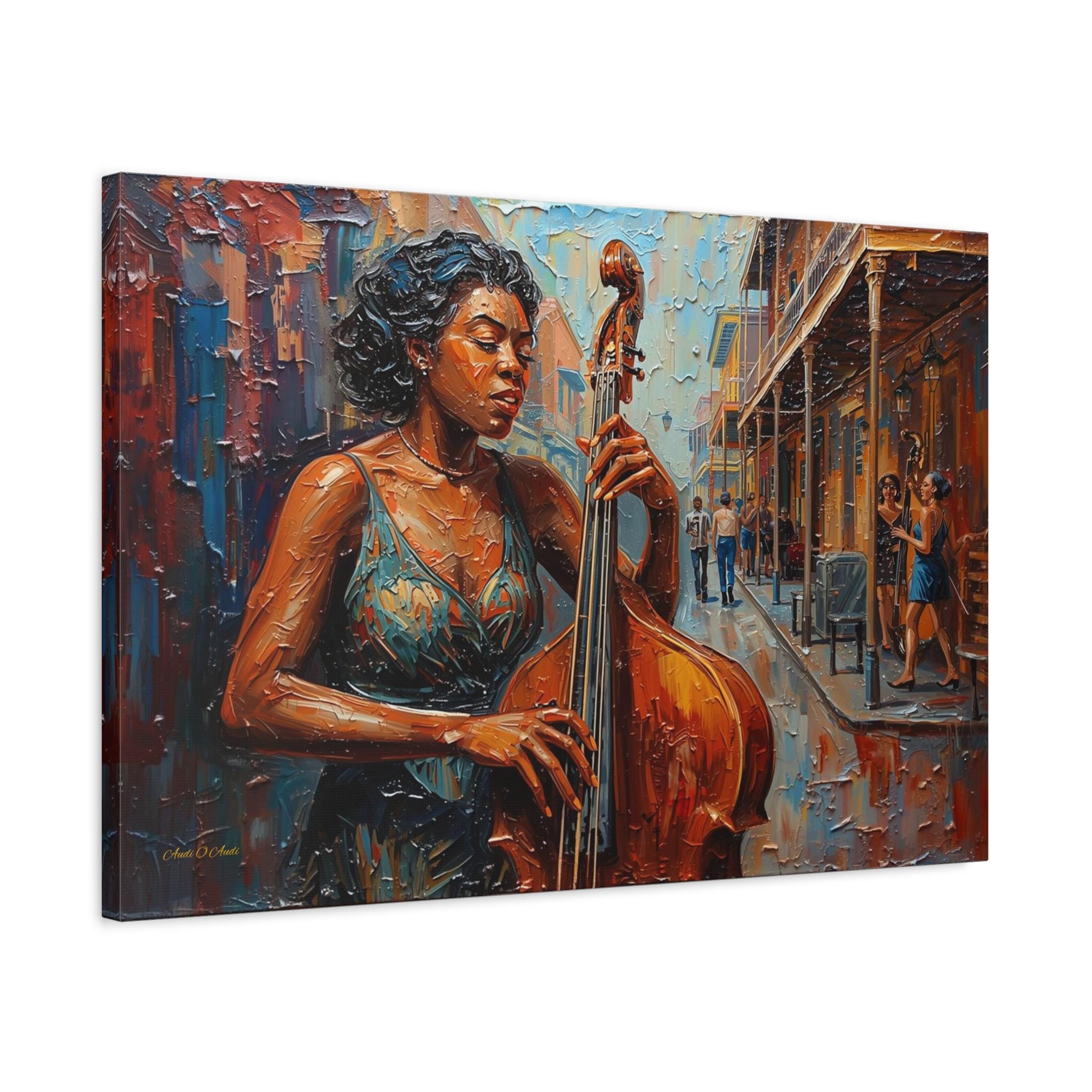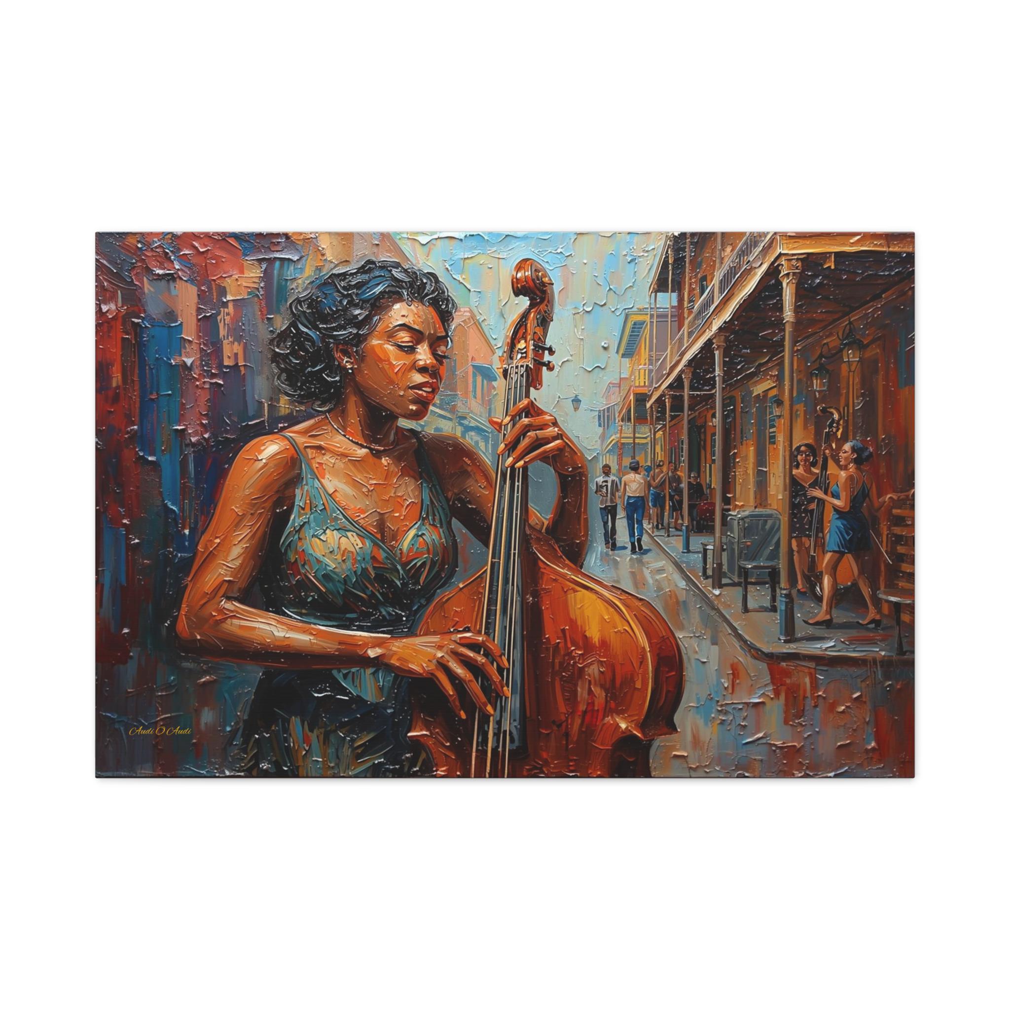 Feel the deep, resonant rhythm of the French Quarter with this elegant canvas print of a female jazz musician. This soulful artwork features a bassist lost in the music, gracefully playing a double bass on a vibrant New Orleans street lined with classic iron balconies.