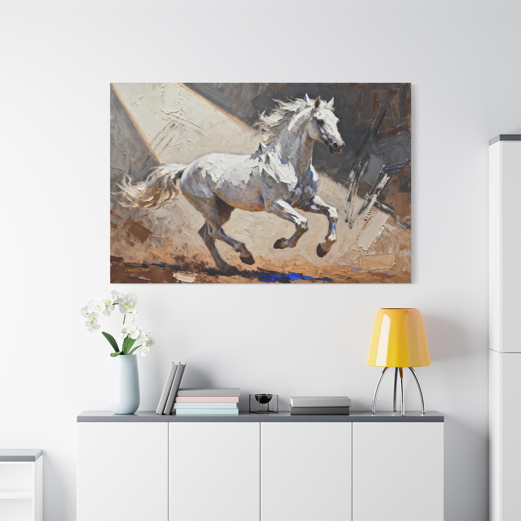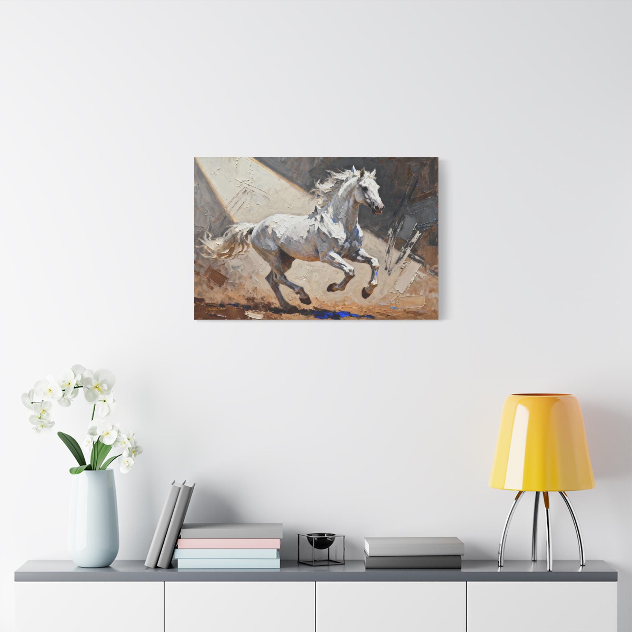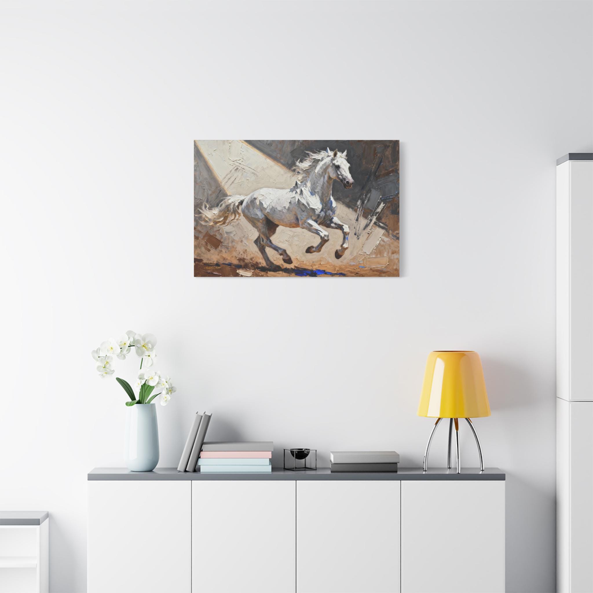 This White Stallion Canvas Print is perfect for horse lovers looking to add a touch of equestrian charm to their home decor. The high-quality image of a white horse on stretched canvas exudes a serene and rustic vibe, making it ideal for animal enthusiasts and nature lovers. This canvas print is a great addition to any living room, bedroom, or office, and is suitable for horse-related holidays like the Kentucky Derby or for anyone looking to bring a bit of the countryside indoors.
