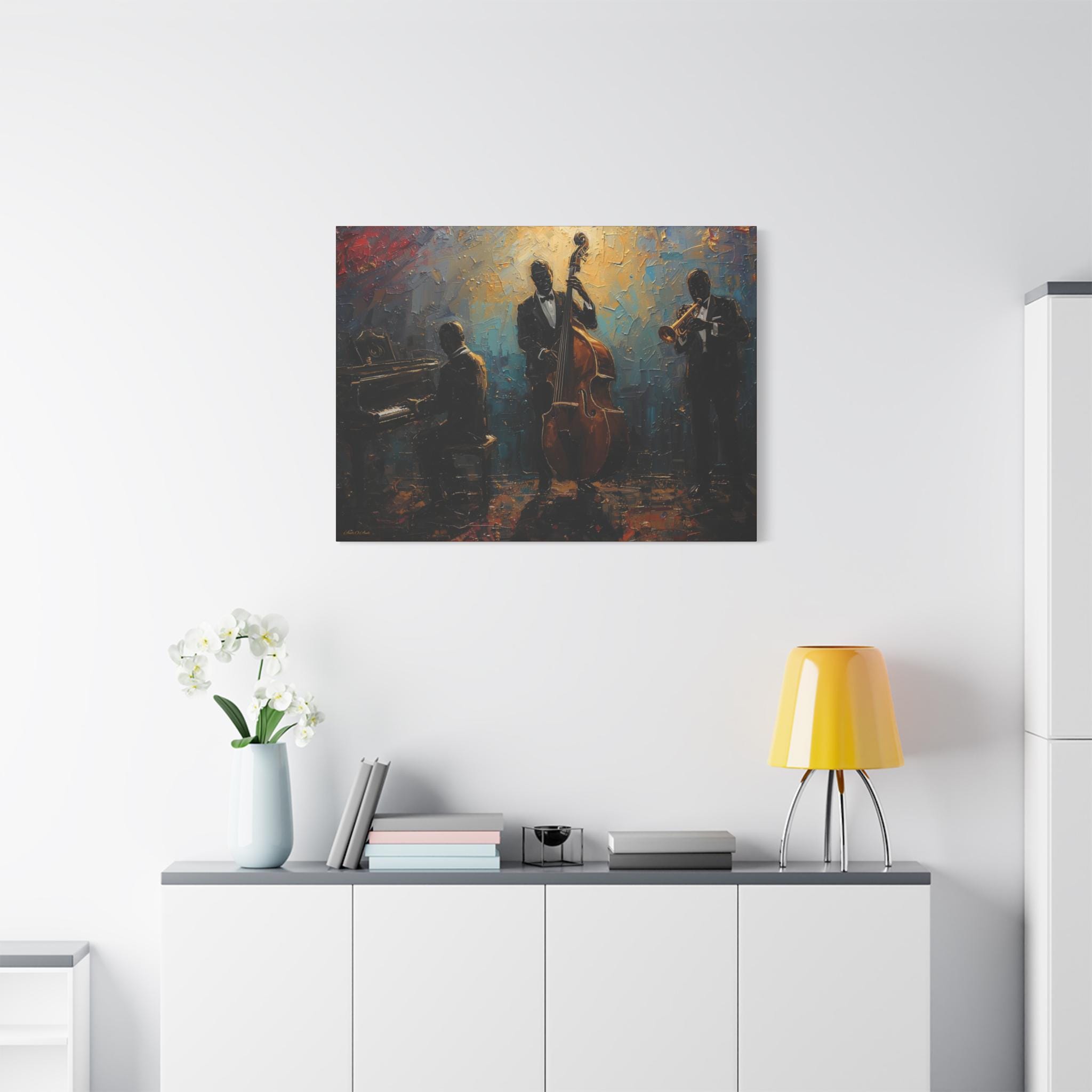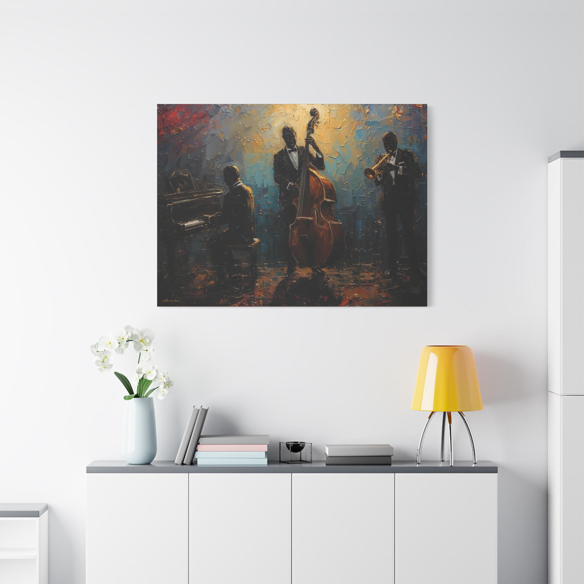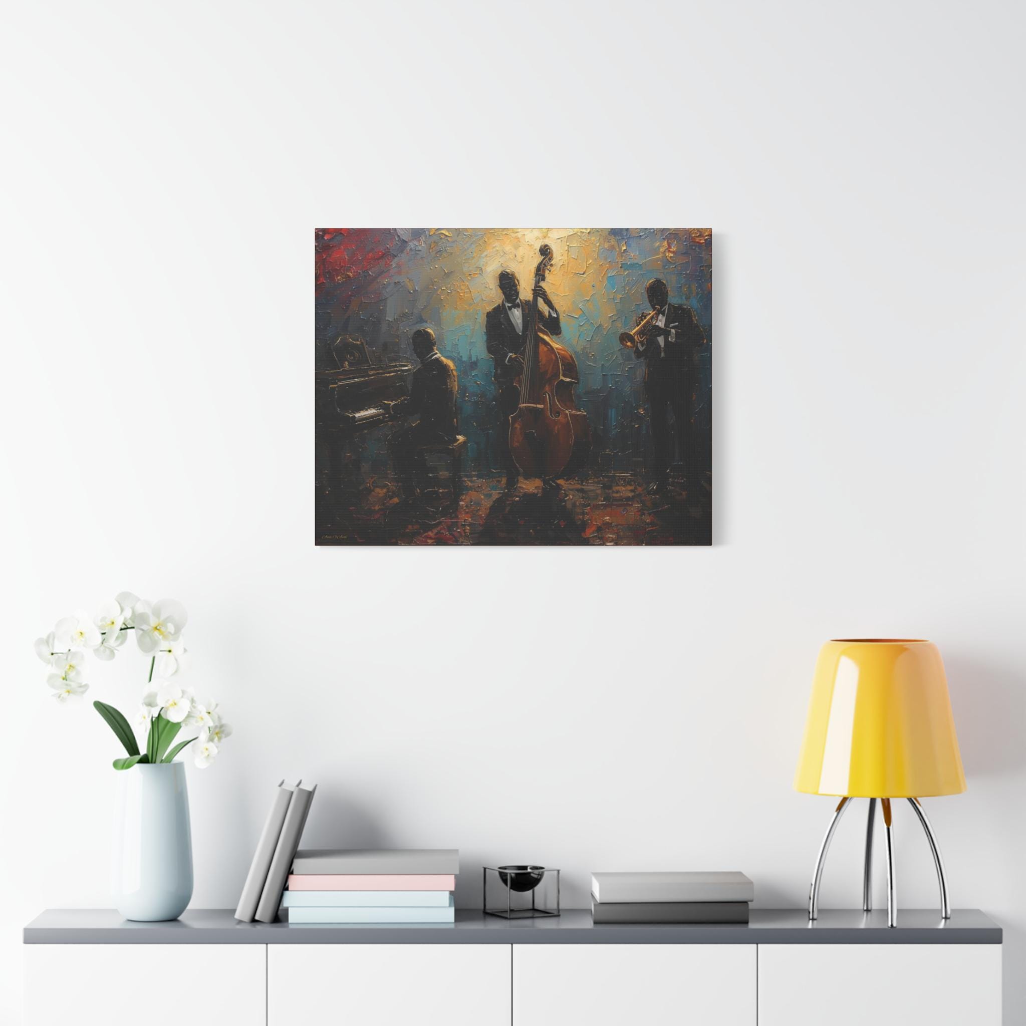Elevate your home decor with this elegant Jazz Trio Canvas Wall Art. Perfect for music lovers, this stretched artwork adds a vintage jazz vibe to any room. Great as a gift or for anyone looking to add a touch of sophistication to their space. Ideal for jazz enthusiasts, music lovers, and home decor enthusiasts. Relevant for music-themed parties, birthdays, housewarmings, and jazz appreciation events.