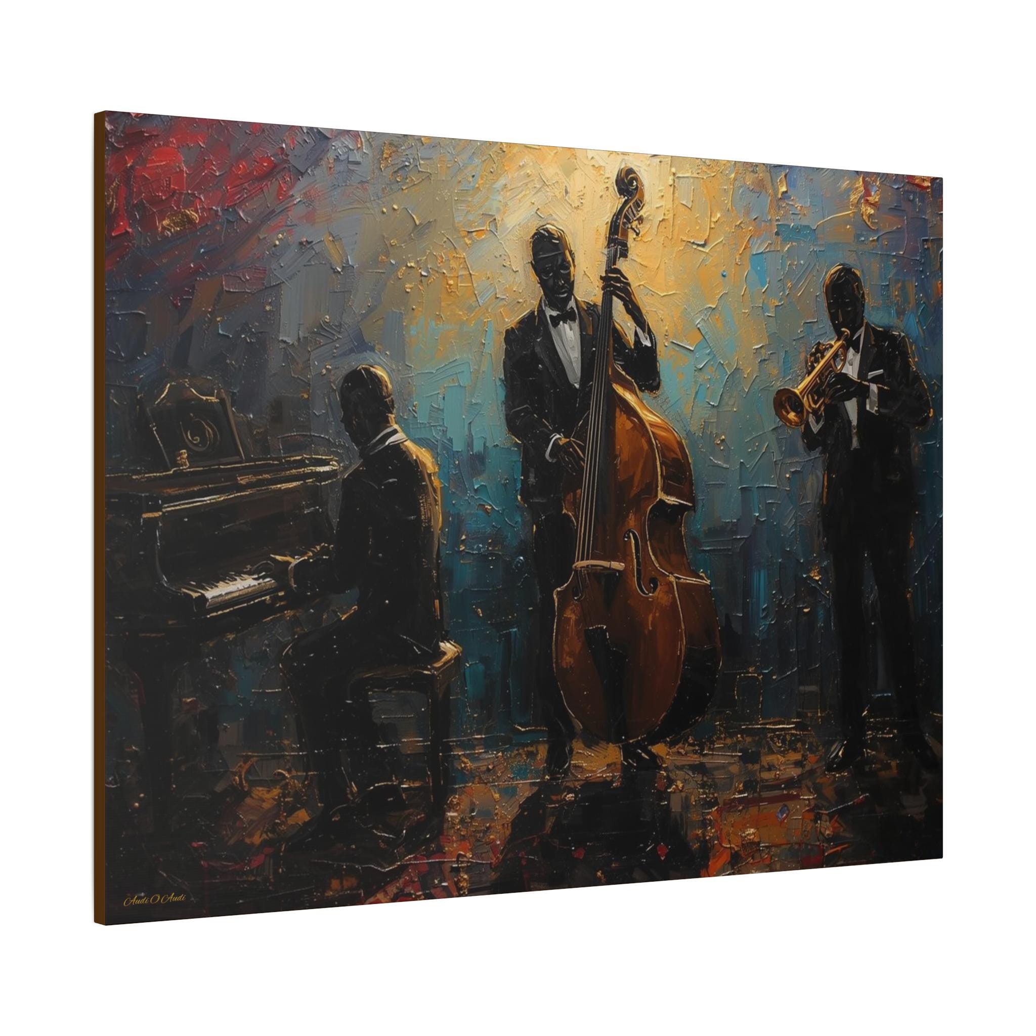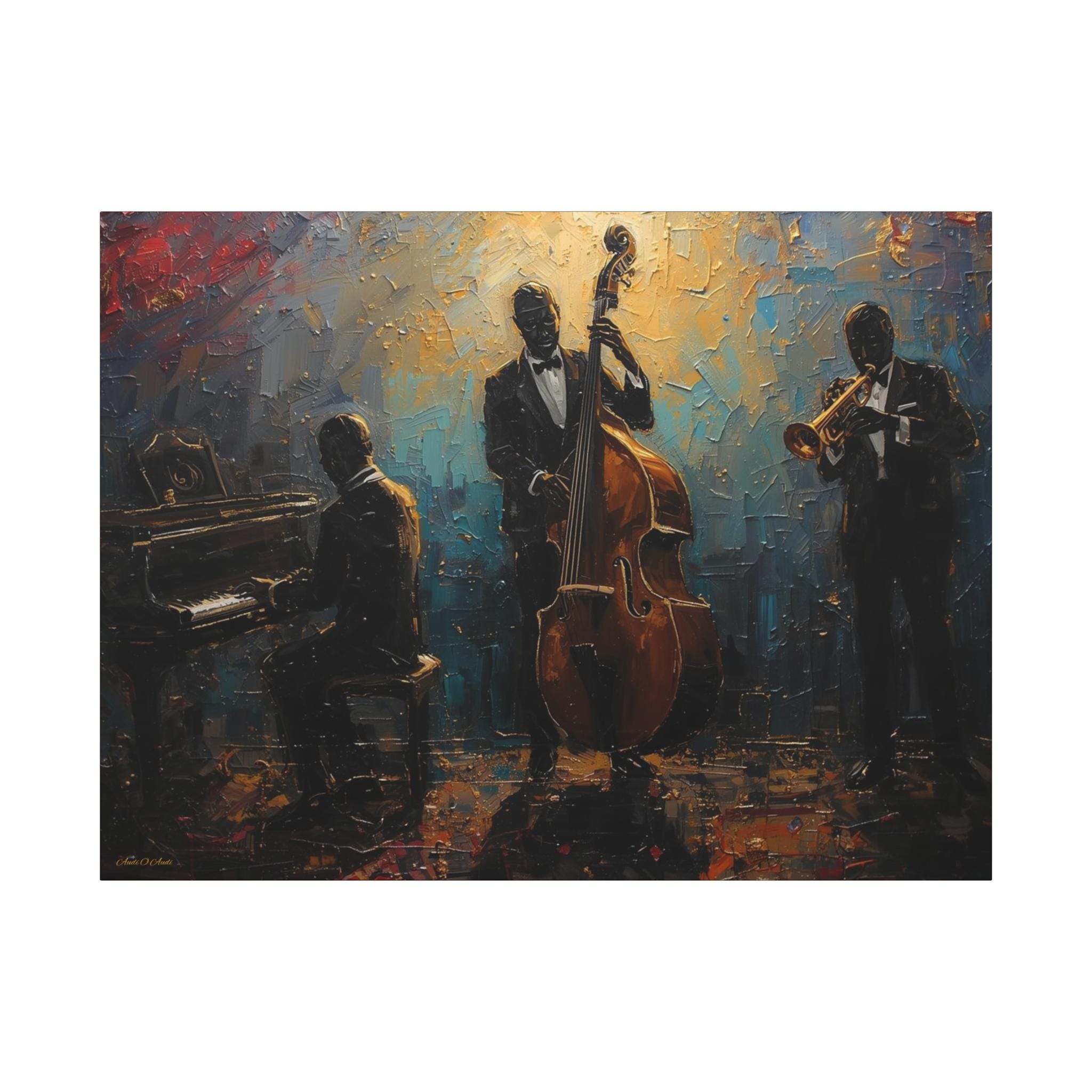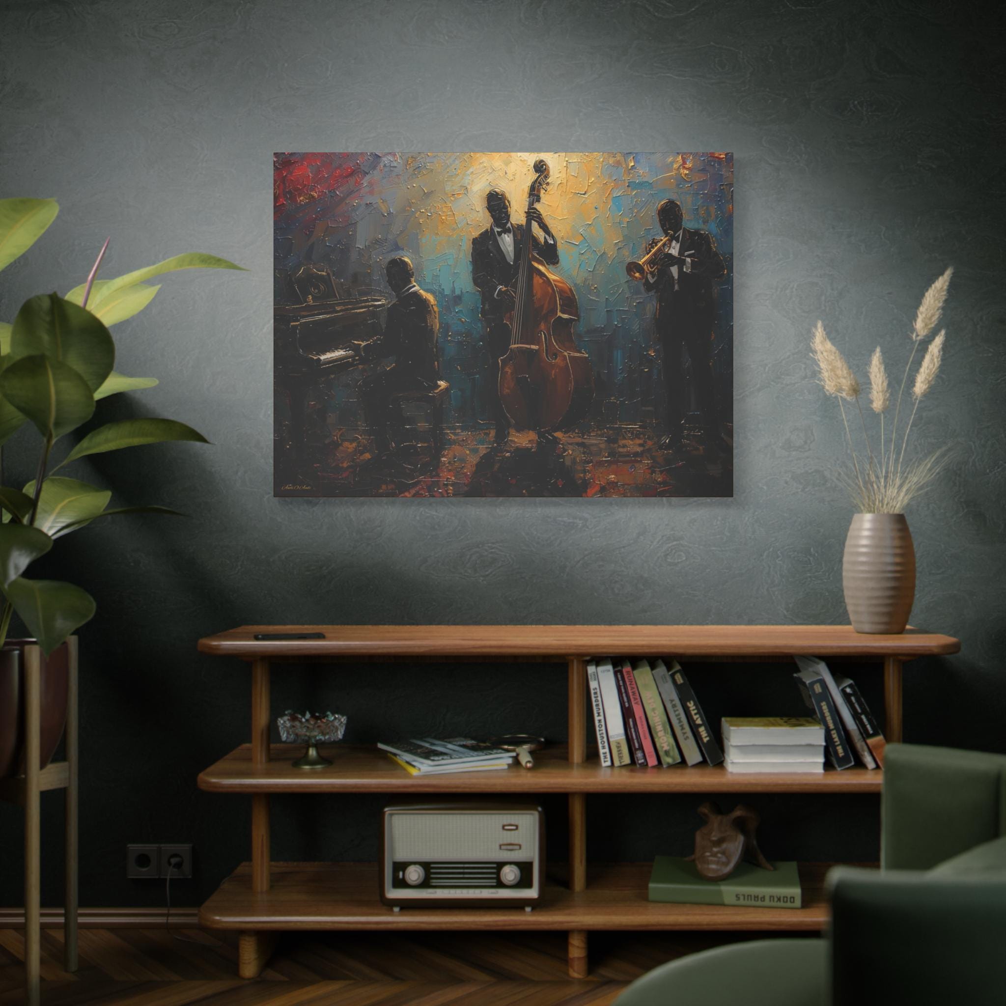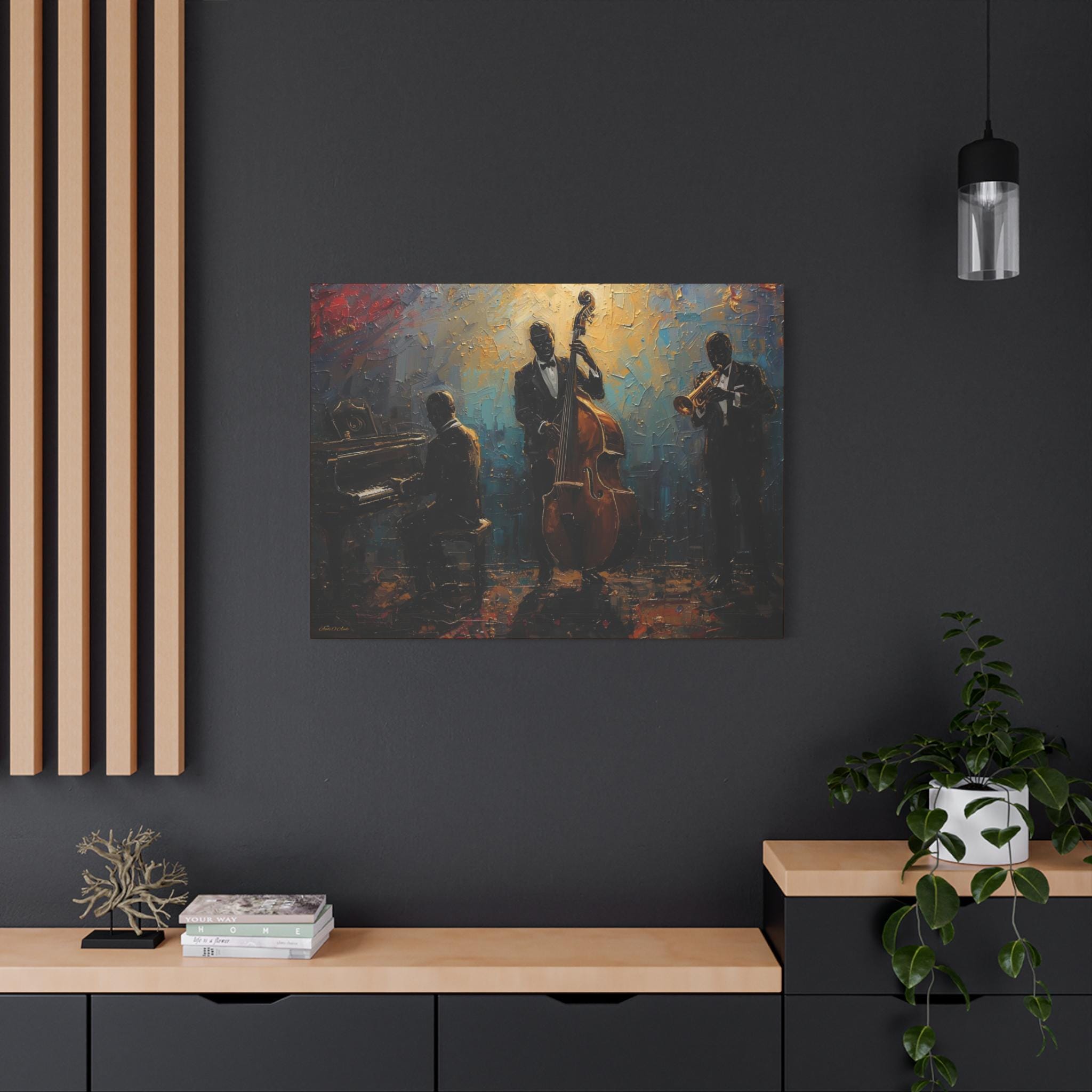 Elevate your home decor with this elegant Jazz Trio Canvas Wall Art. Perfect for music lovers, this stretched artwork adds a vintage jazz vibe to any room. Great as a gift or for anyone looking to add a touch of sophistication to their space. Ideal for jazz enthusiasts, music lovers, and home decor enthusiasts. Relevant for music-themed parties, birthdays, housewarmings, and jazz appreciation events.