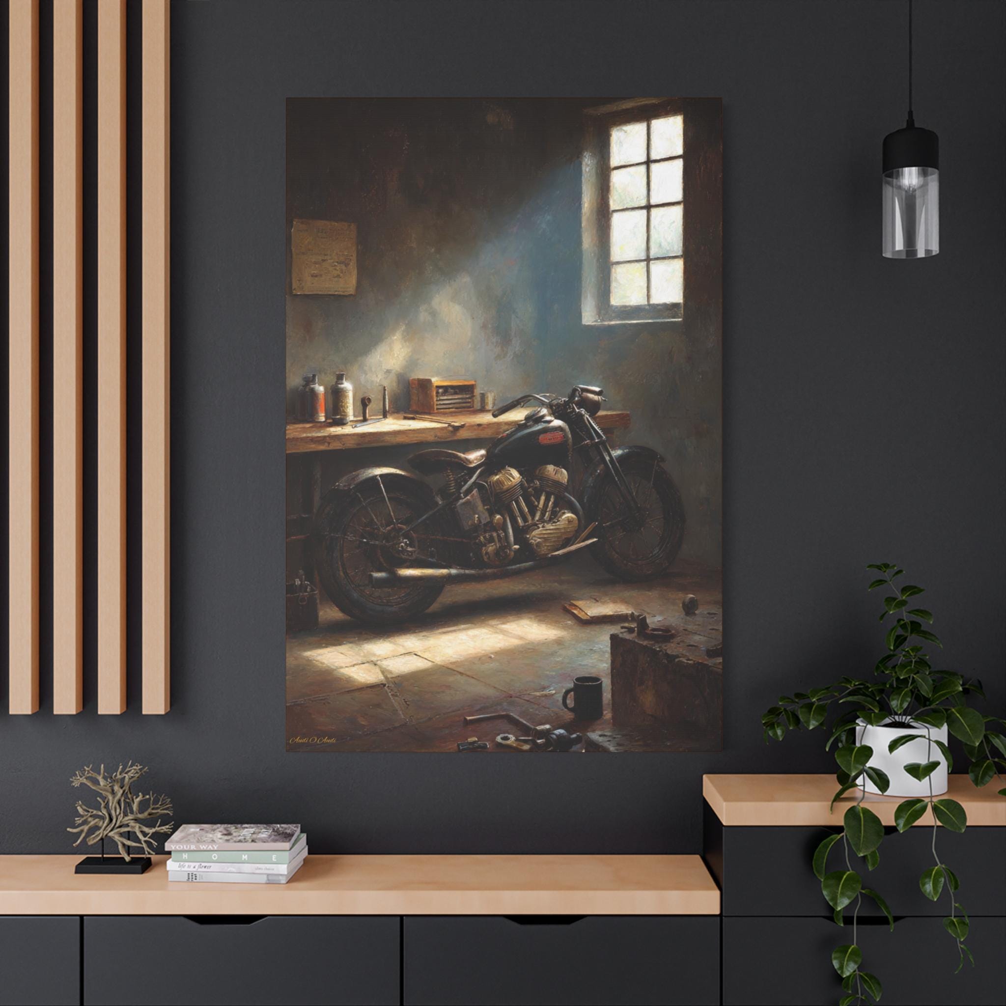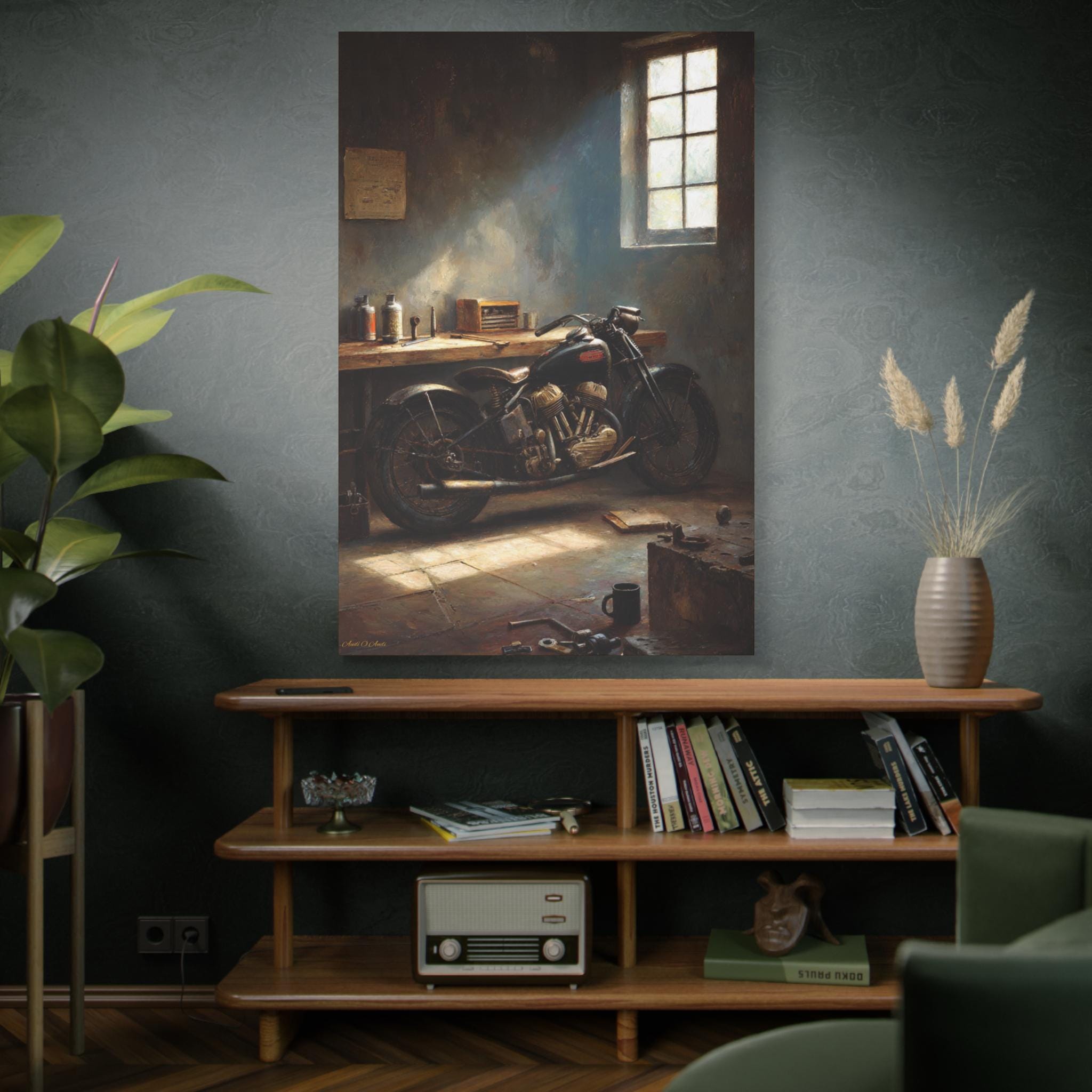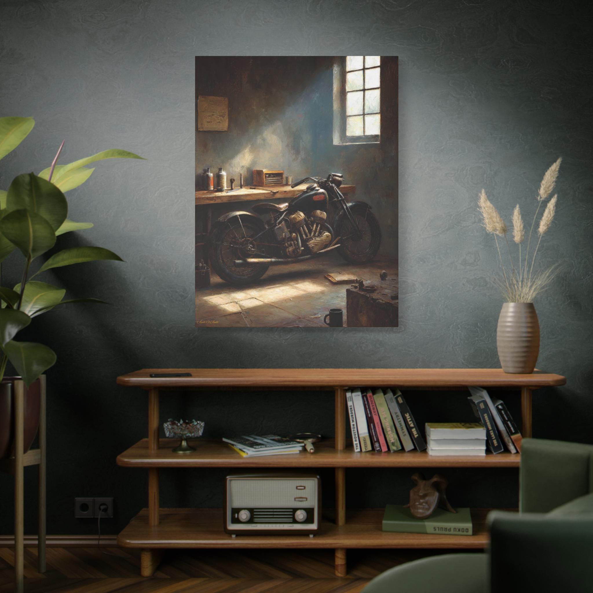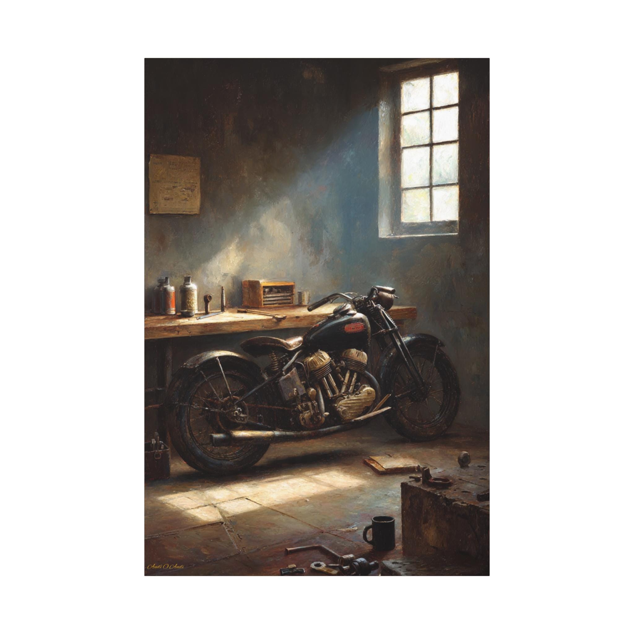 Transform your space with this stunning Stretched Canvas. Featuring a striking motorcycle scene, this artwork captures the essence of nostalgia and craftsmanship. The warm atmosphere evoked by soft lighting creates a cozy vibe perfect for any room. Ideal for motorcycle enthusiasts and art lovers alike, it fits seamlessly into your home, office, or studio. This piece makes a fantastic gift for birthdays, holidays like Christmas and Father's Day, or simply as a treat for yourself. Elevate your decor with a unique touch that tells a story and sparks conversation.