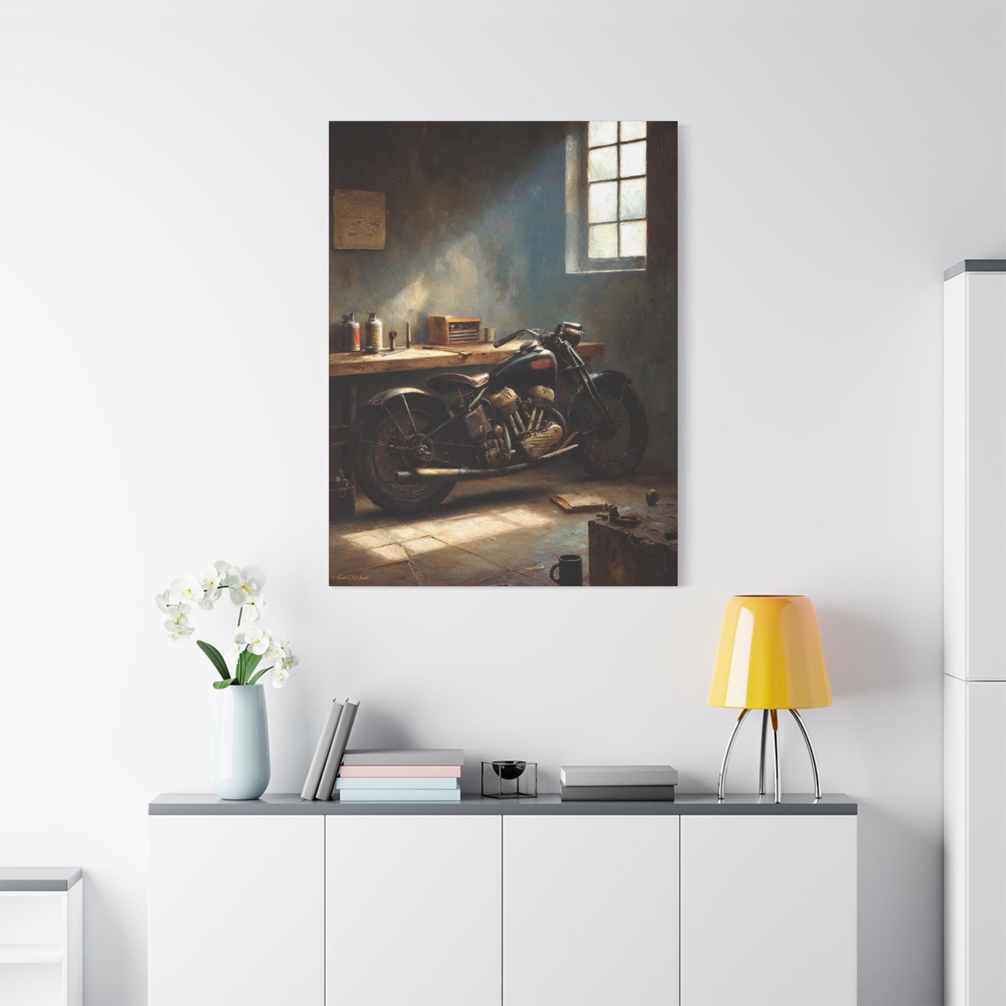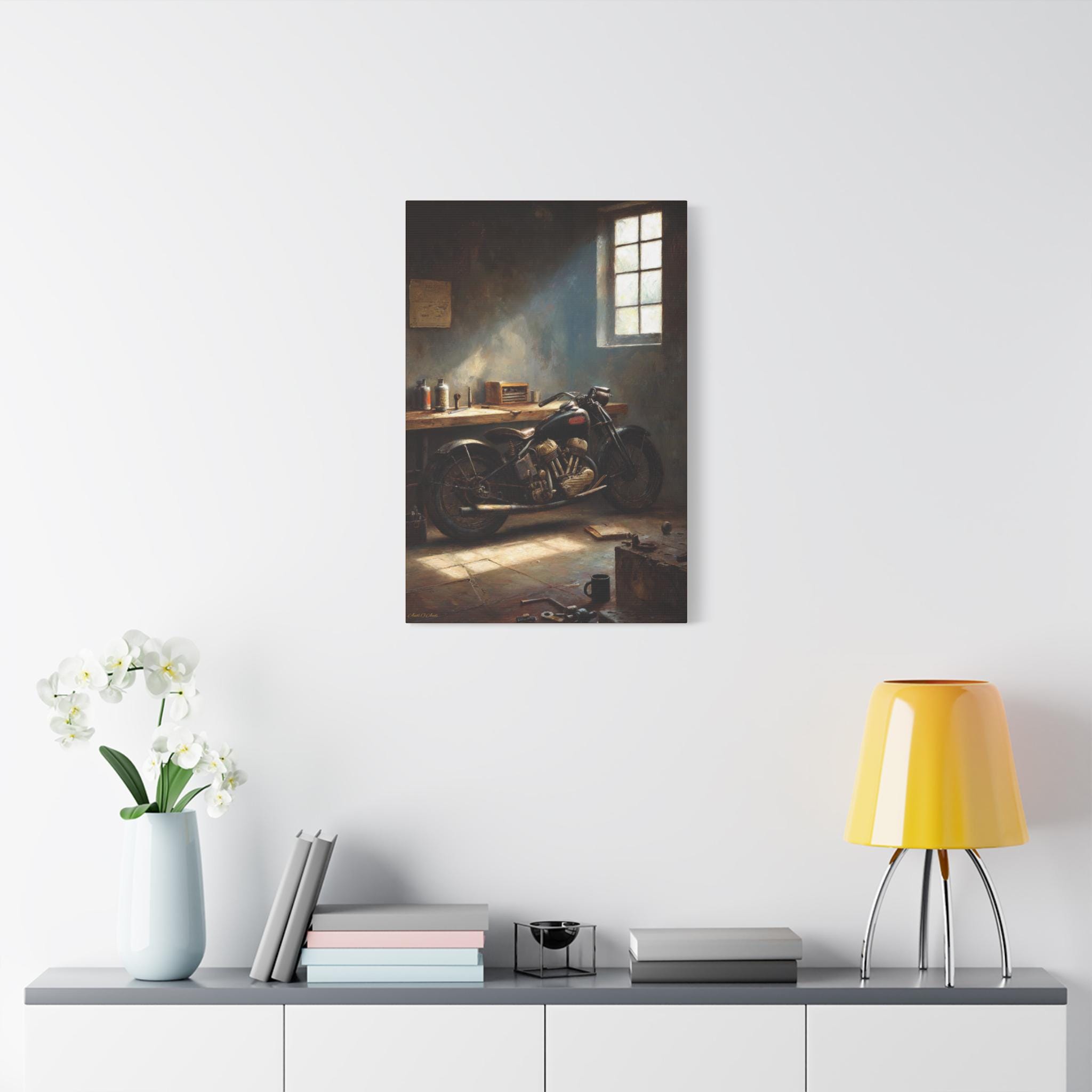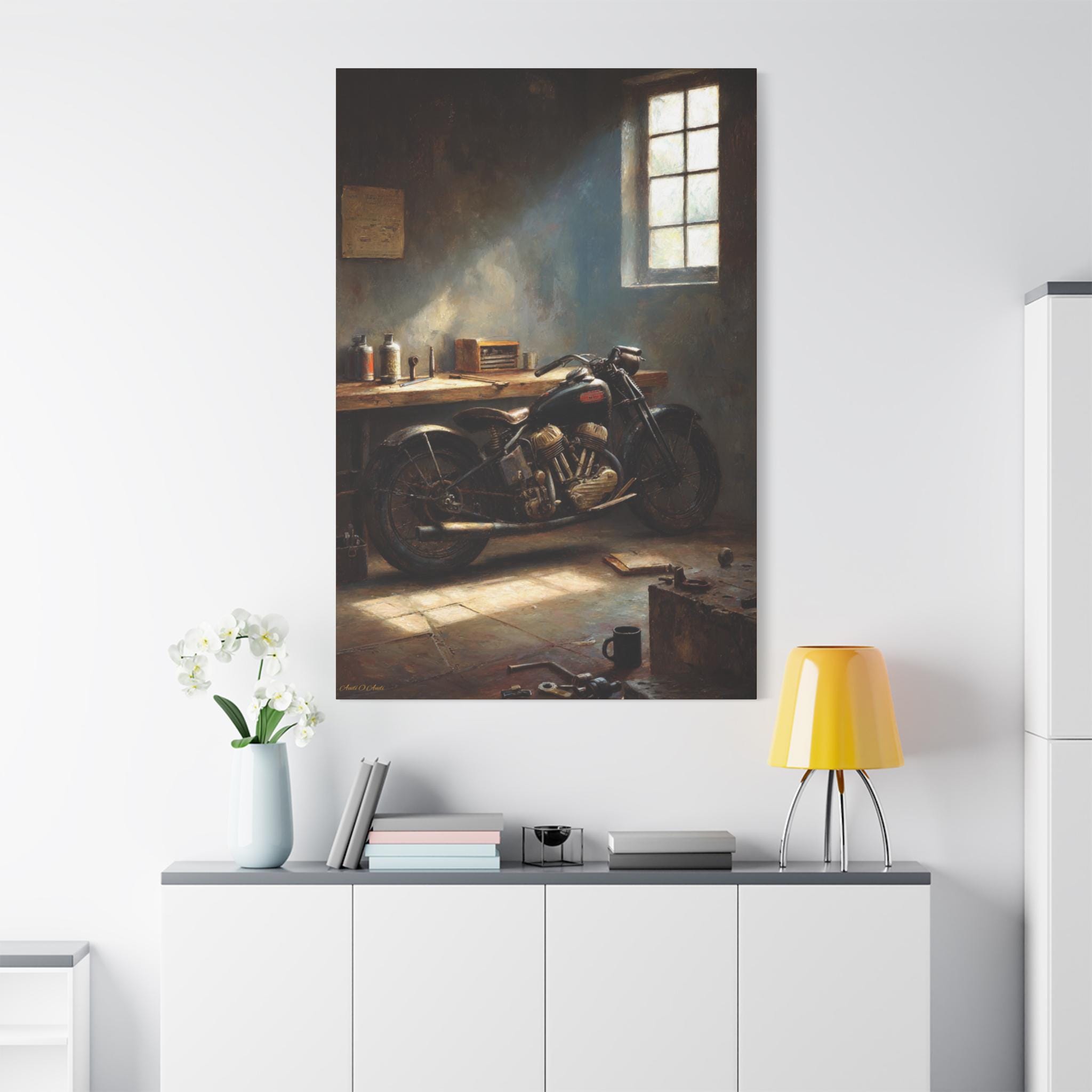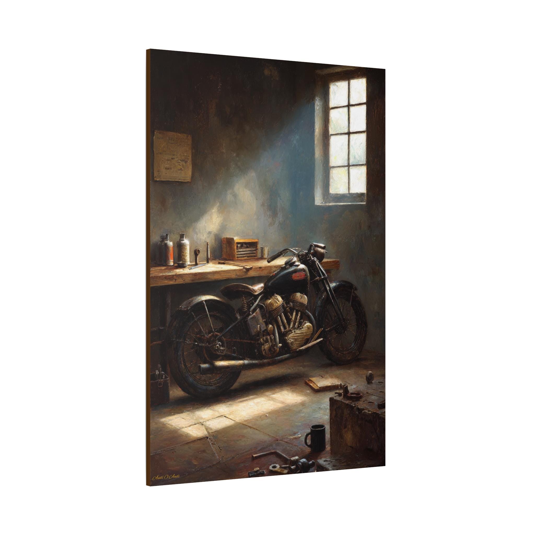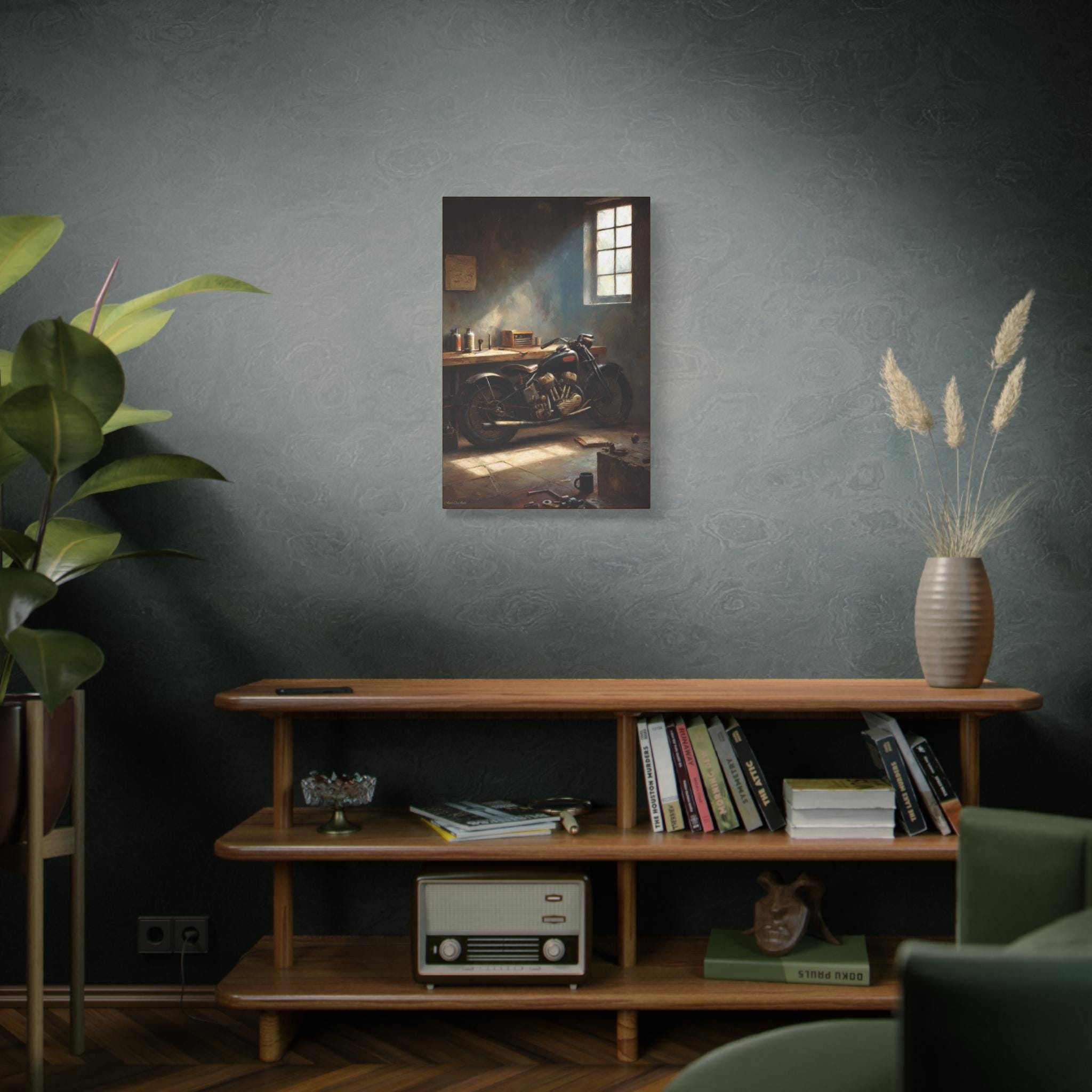 Transform your space with this stunning Stretched Canvas. Featuring a striking motorcycle scene, this artwork captures the essence of nostalgia and craftsmanship. The warm atmosphere evoked by soft lighting creates a cozy vibe perfect for any room. Ideal for motorcycle enthusiasts and art lovers alike, it fits seamlessly into your home, office, or studio. This piece makes a fantastic gift for birthdays, holidays like Christmas and Father's Day, or simply as a treat for yourself. Elevate your decor with a unique touch that tells a story and sparks conversation.