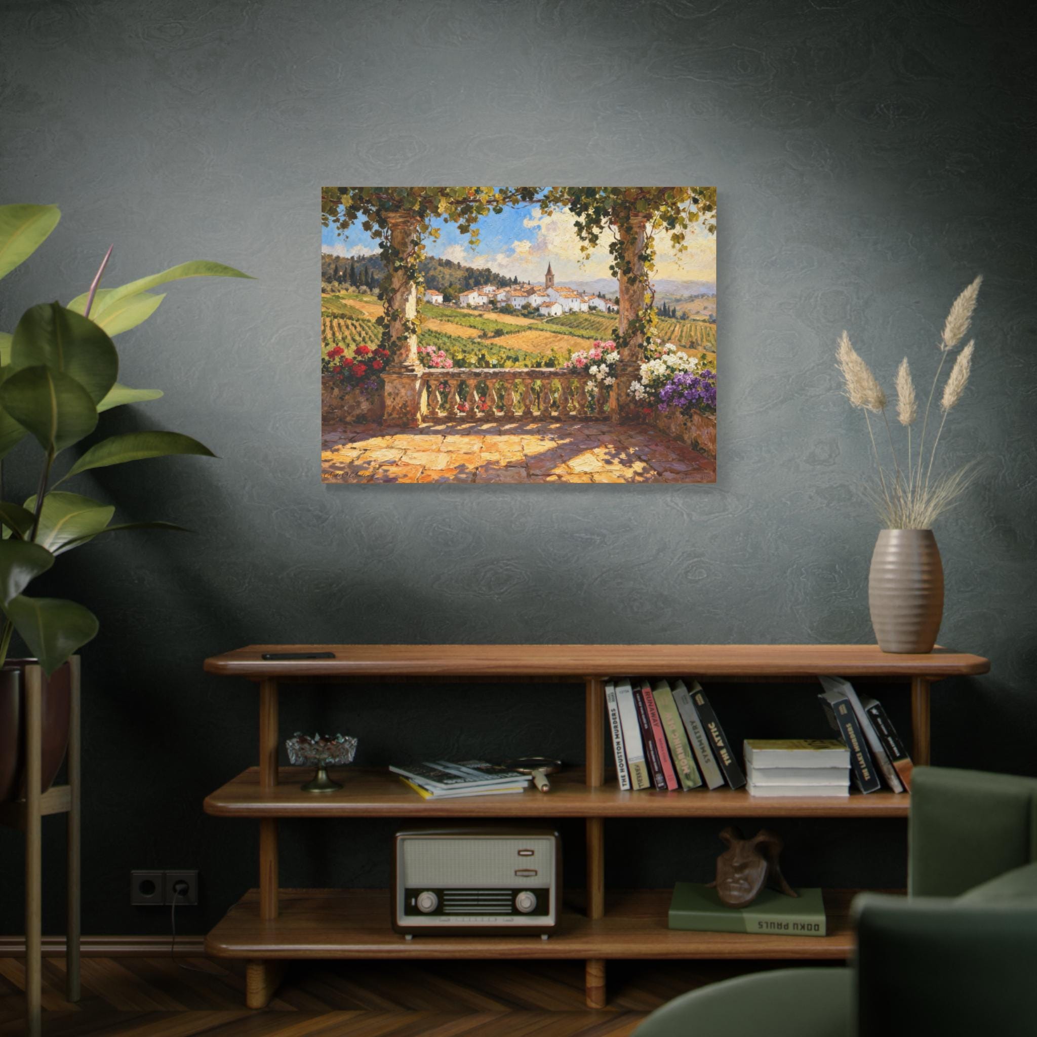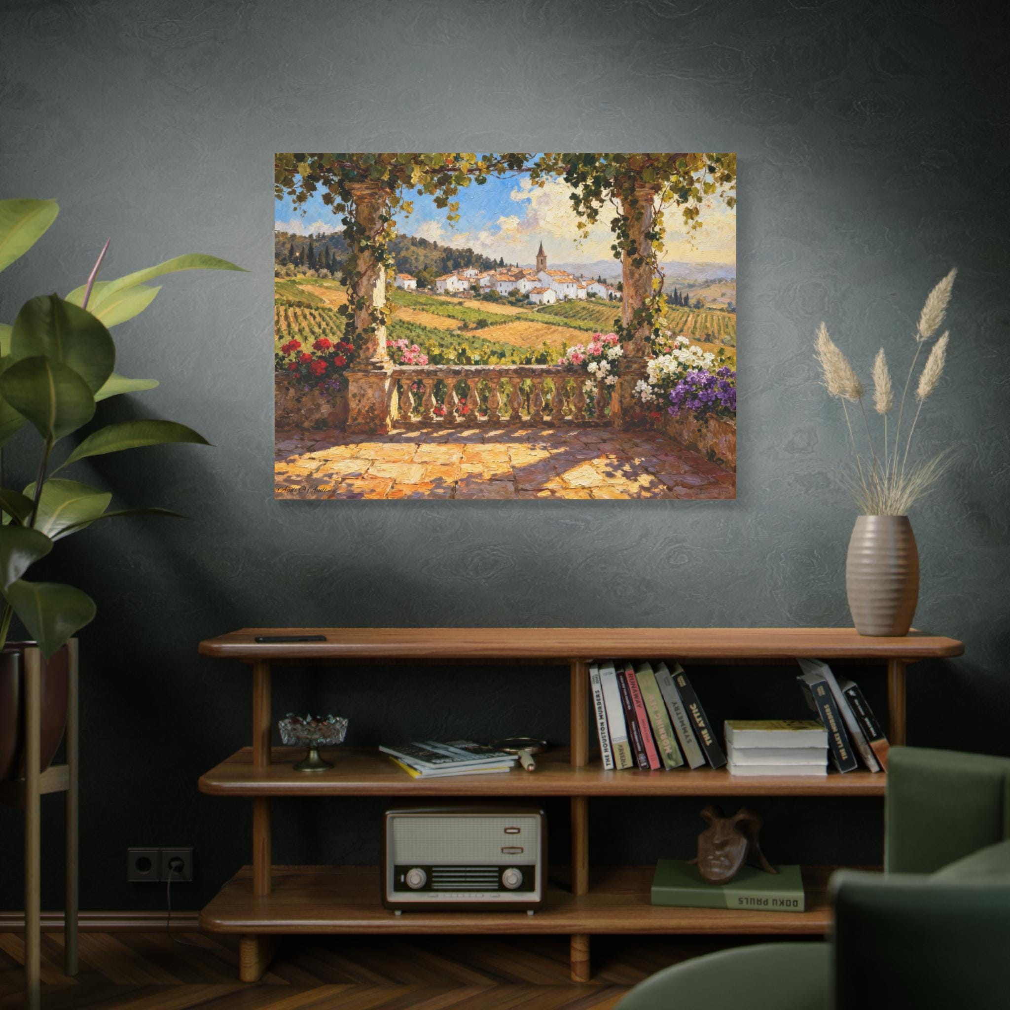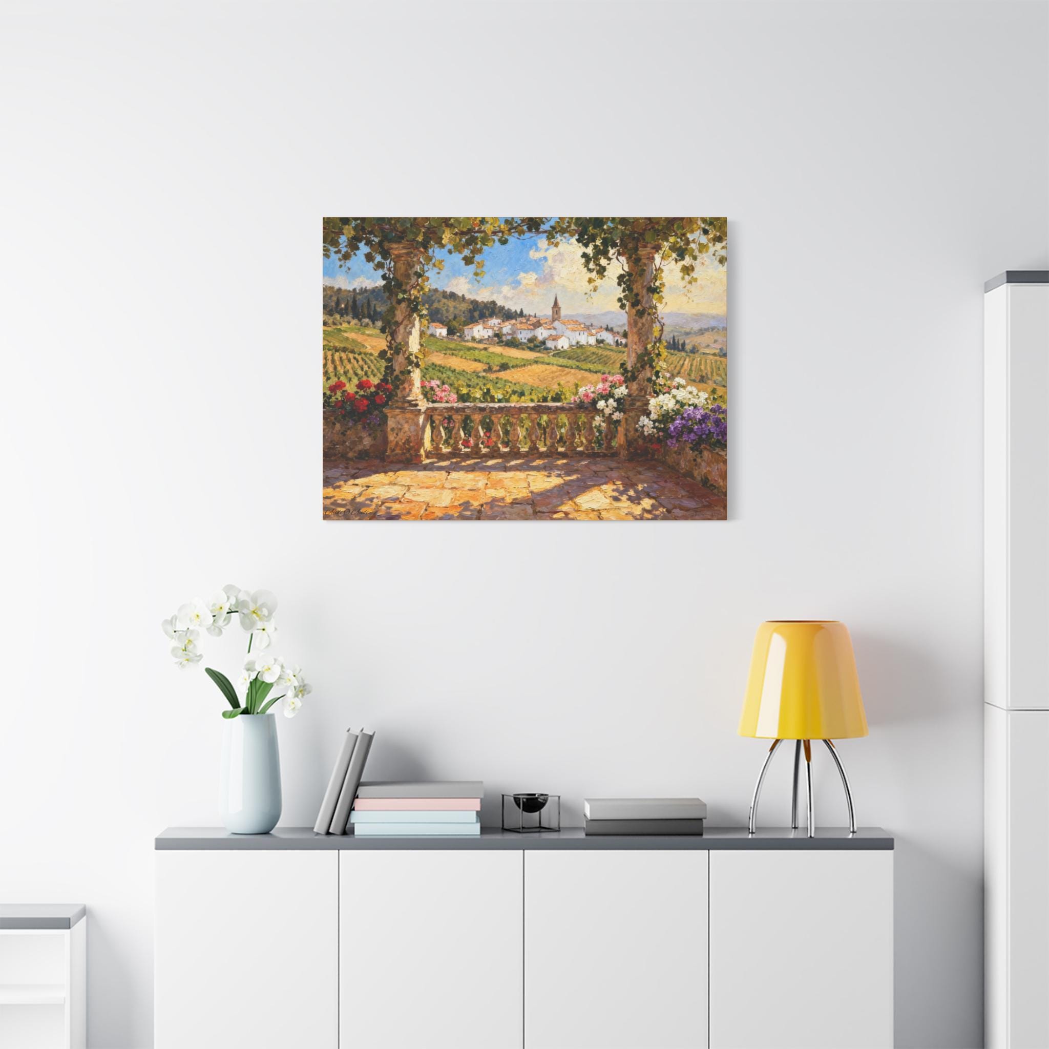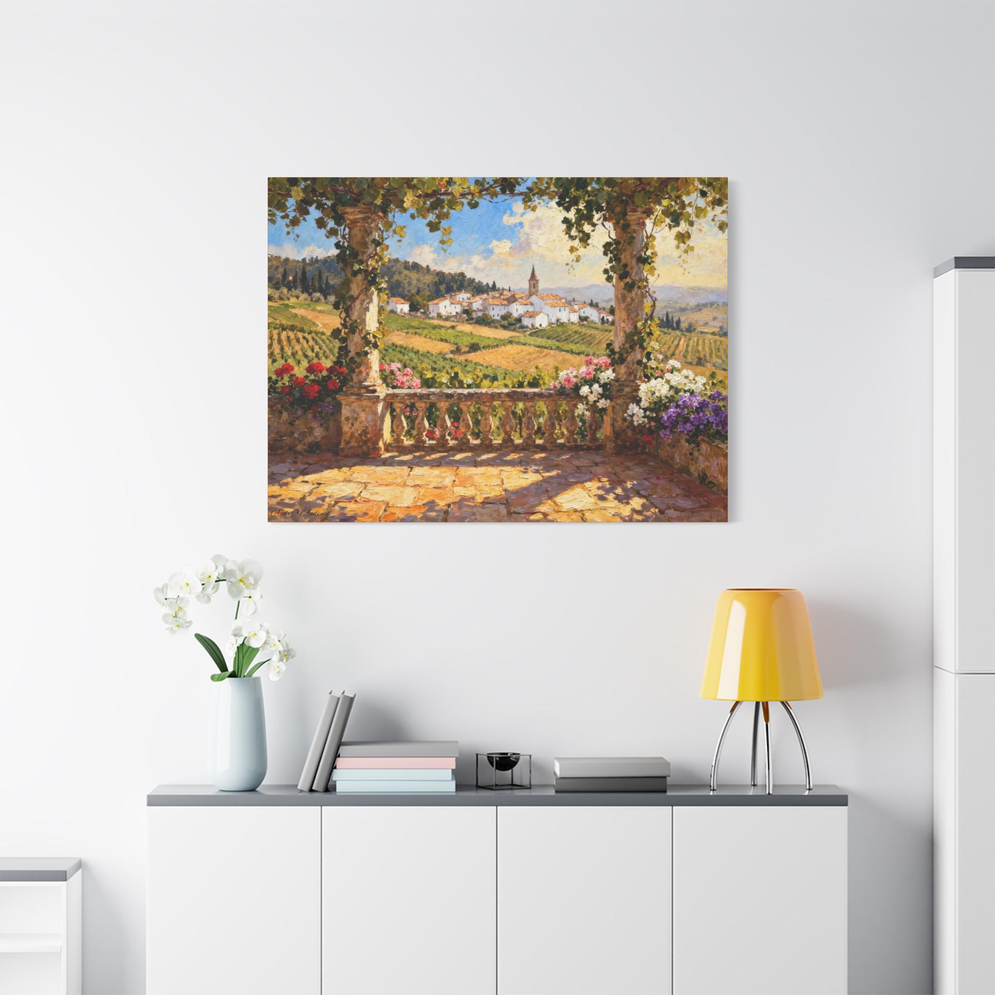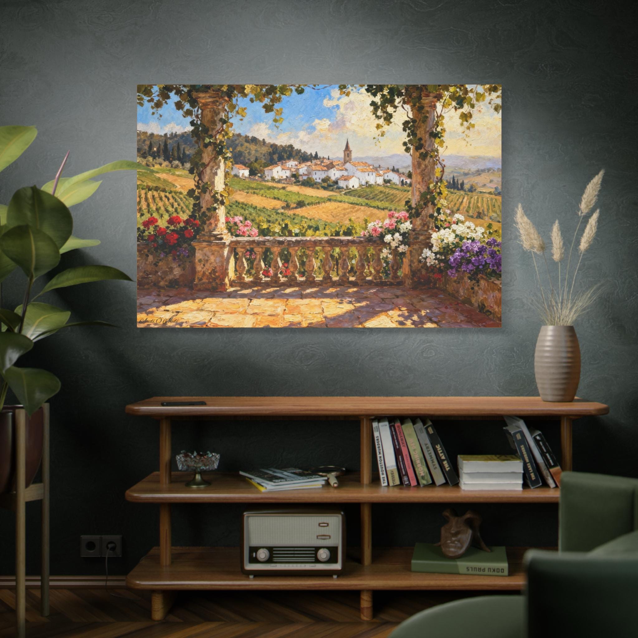 Transform your living space with this beautifully crafted matte canvas. Showcasing a picturesque view of rolling vineyards and charming architecture, it evokes a sense of serenity and connection to nature. Perfect for enhancing cozy nooks, brightening living rooms, or adding sophistication to workspaces, this canvas creates a welcoming atmosphere in any room.