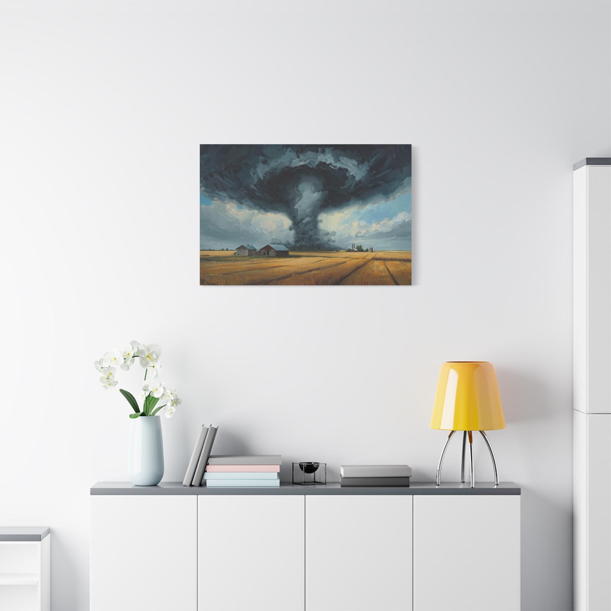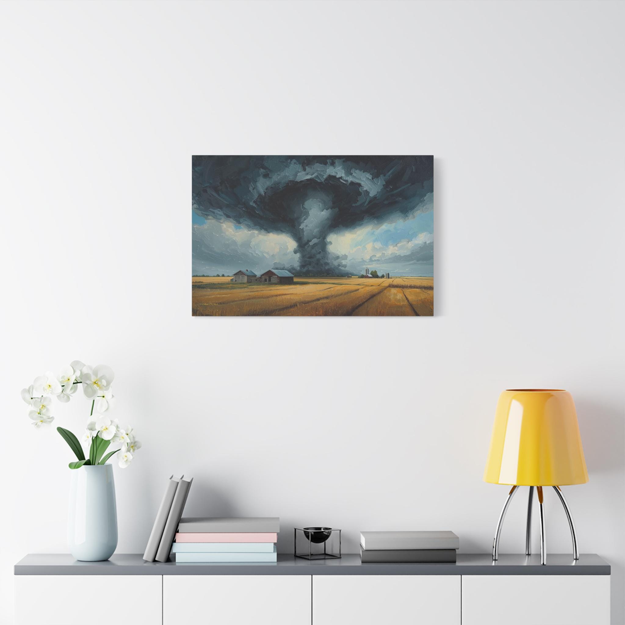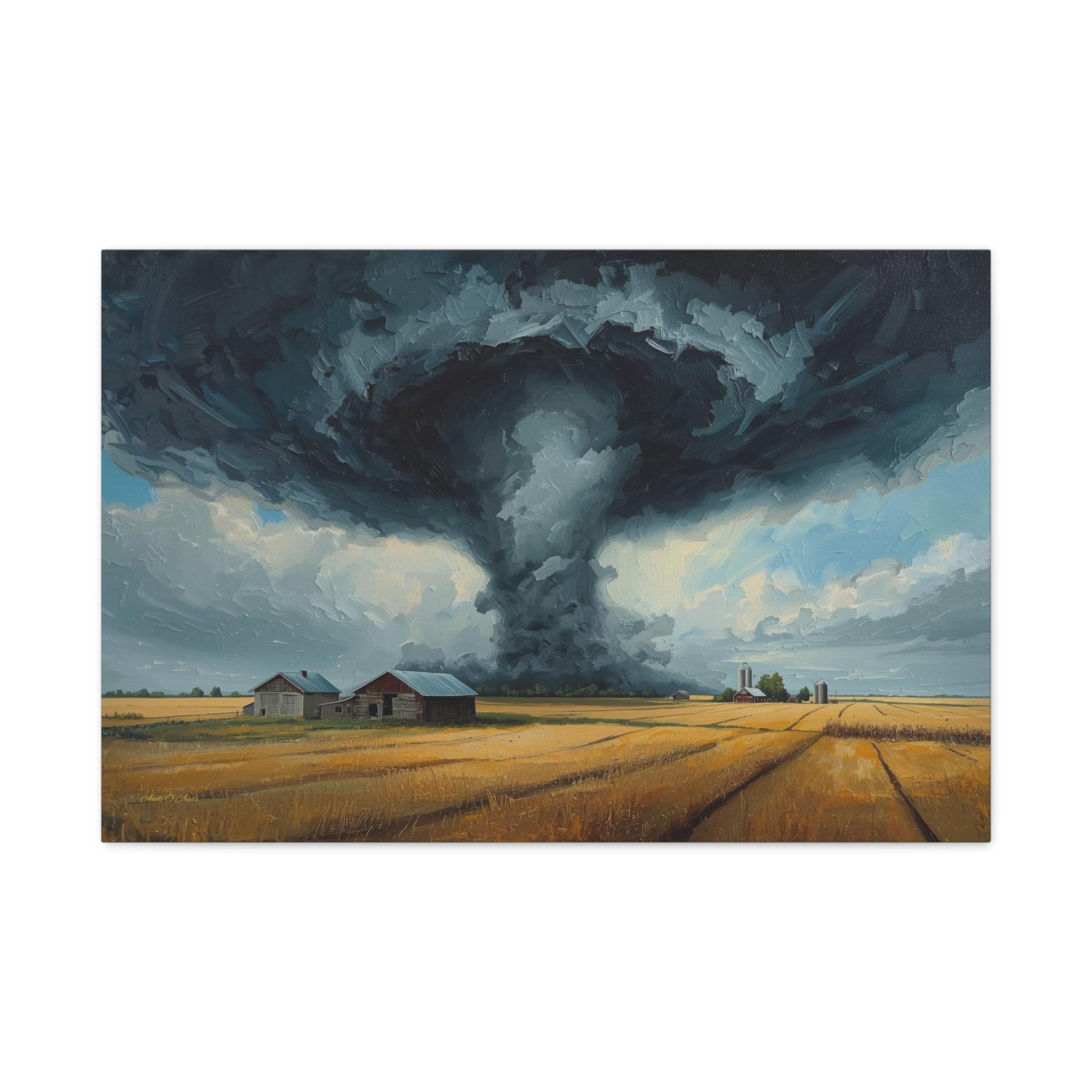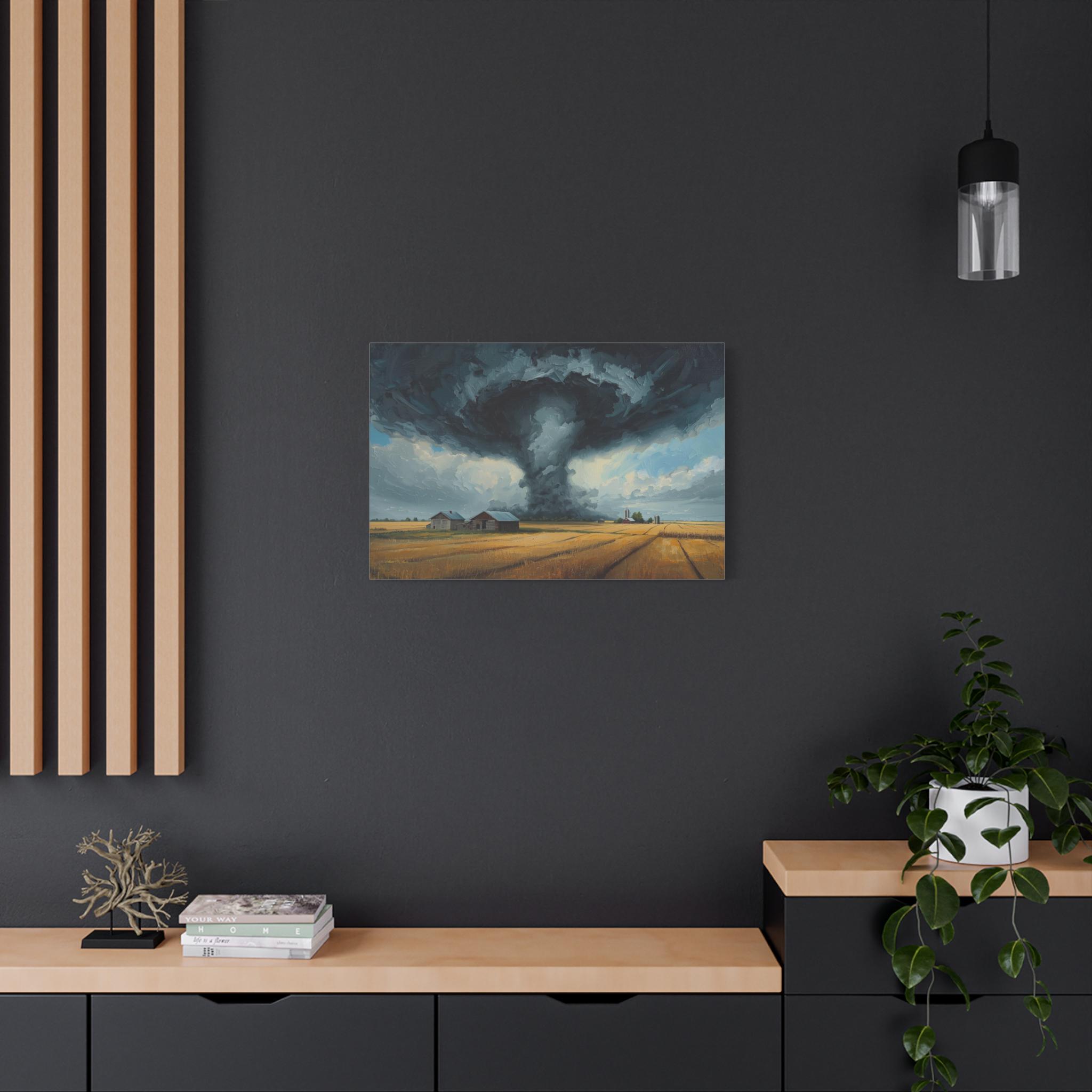 Witness the awe-inspiring power of nature with this epic canvas print of a massive tornado touching down. This dramatic artwork captures a supercell storm swirling over a golden Midwestern farm, contrasting the terrifying dark funnel cloud with the peaceful, harvest-ready wheat fields below.