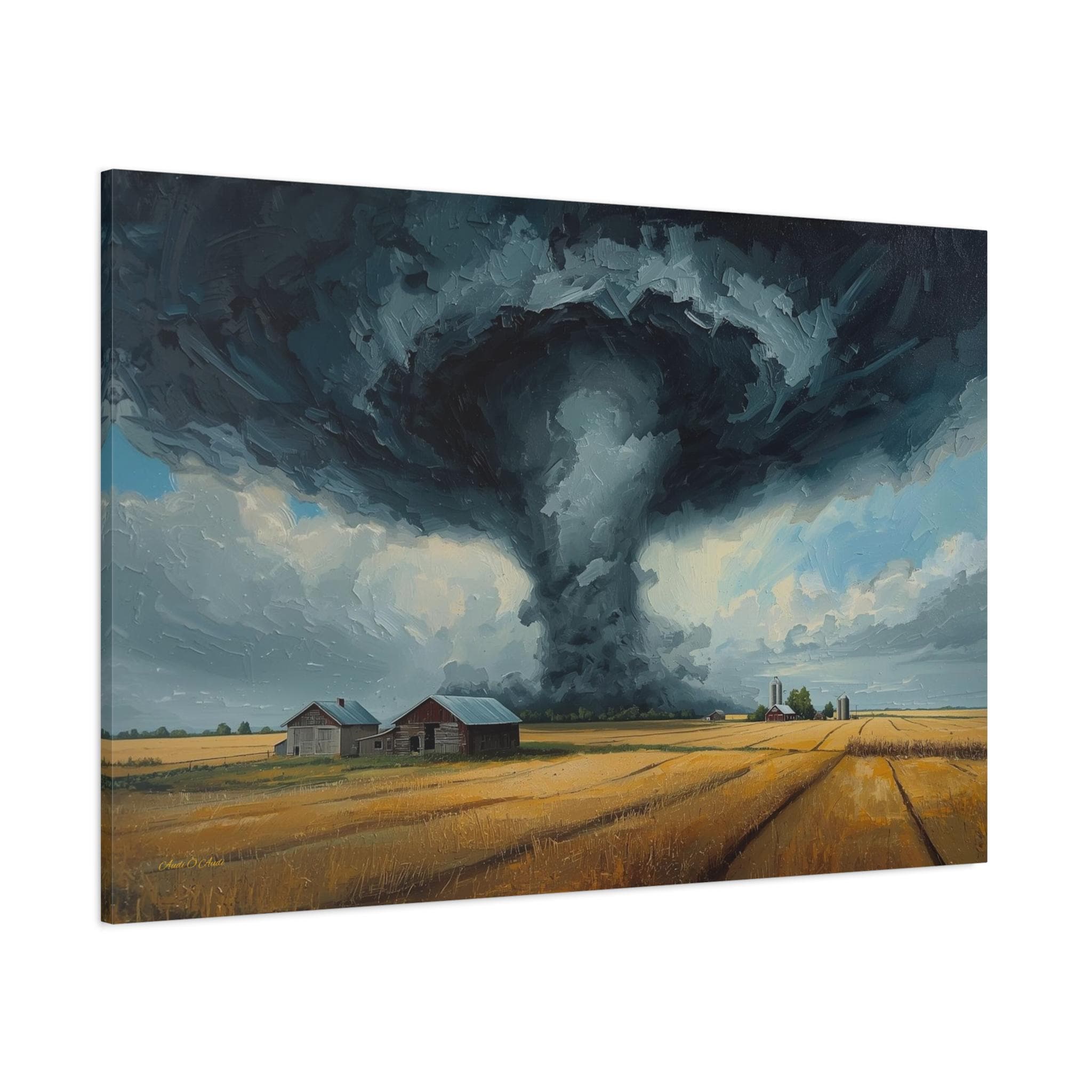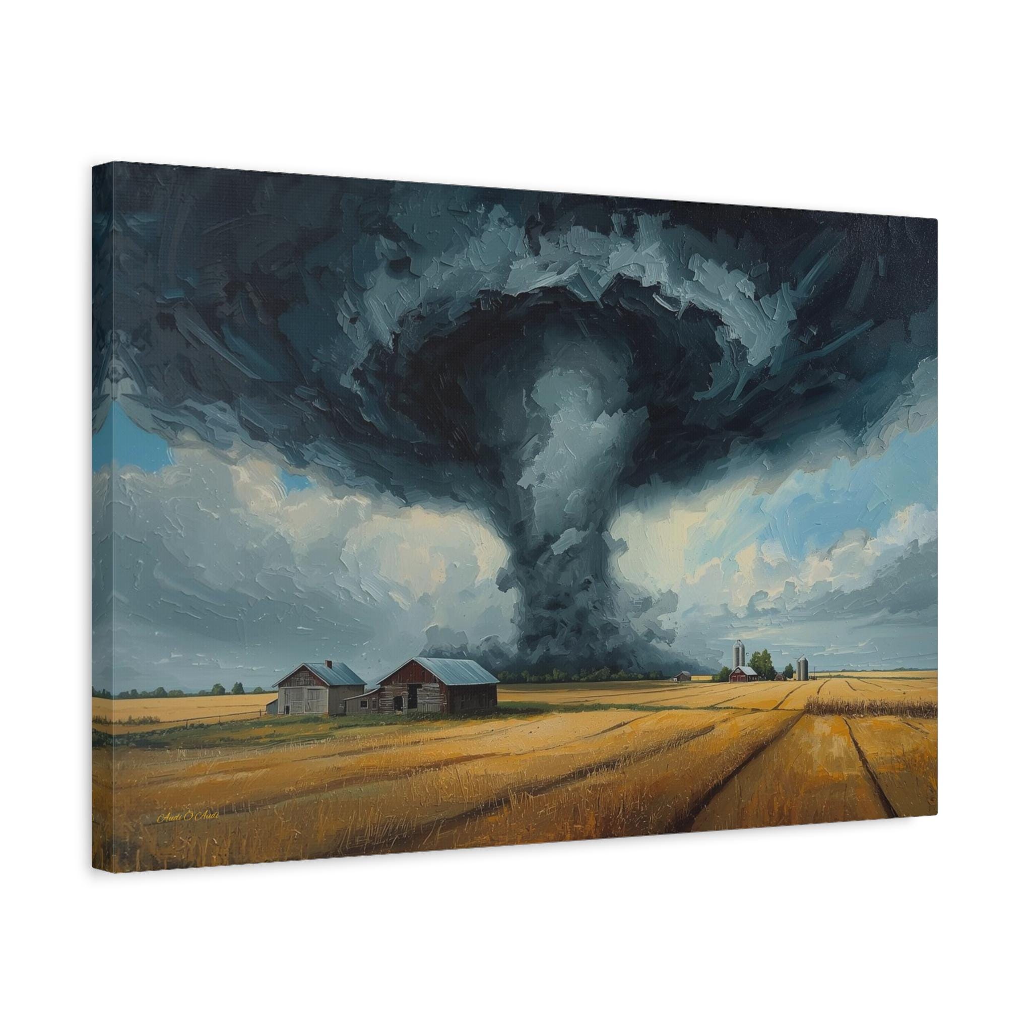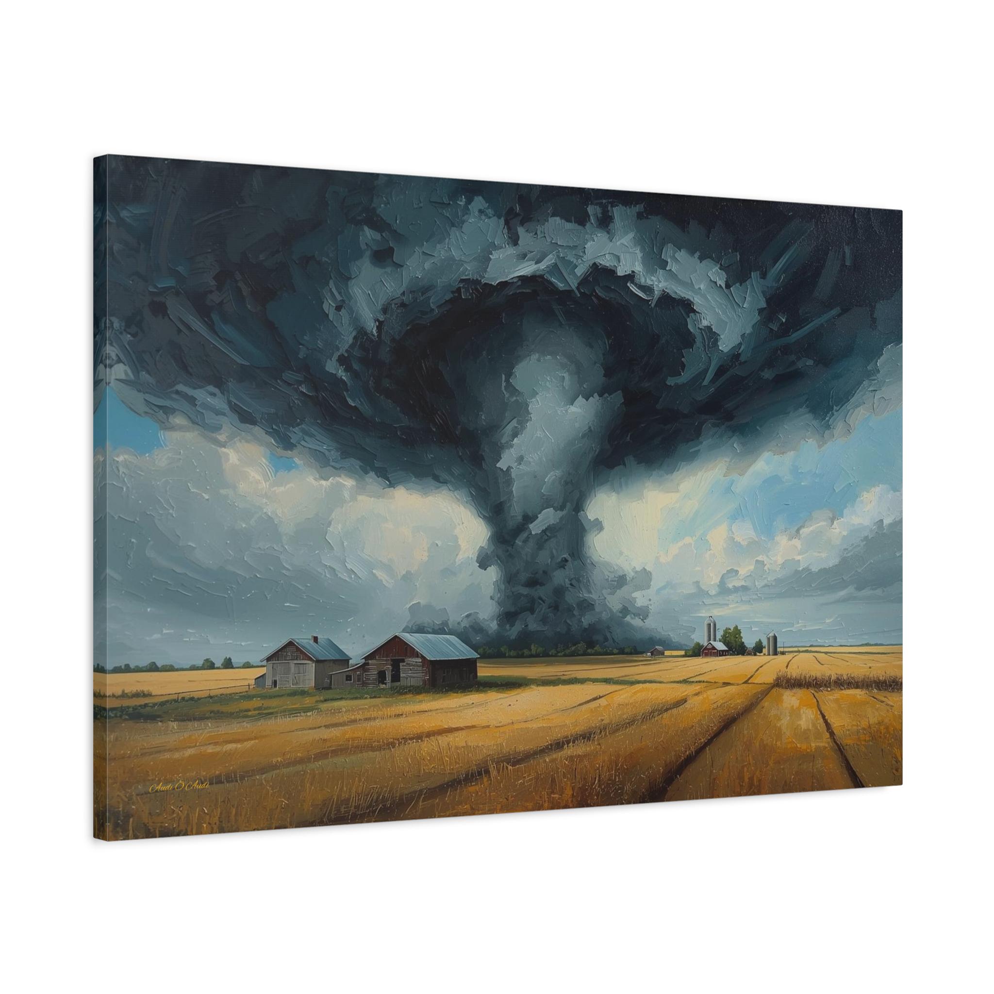 Witness the awe-inspiring power of nature with this epic canvas print of a massive tornado touching down. This dramatic artwork captures a supercell storm swirling over a golden Midwestern farm, contrasting the terrifying dark funnel cloud with the peaceful, harvest-ready wheat fields below.