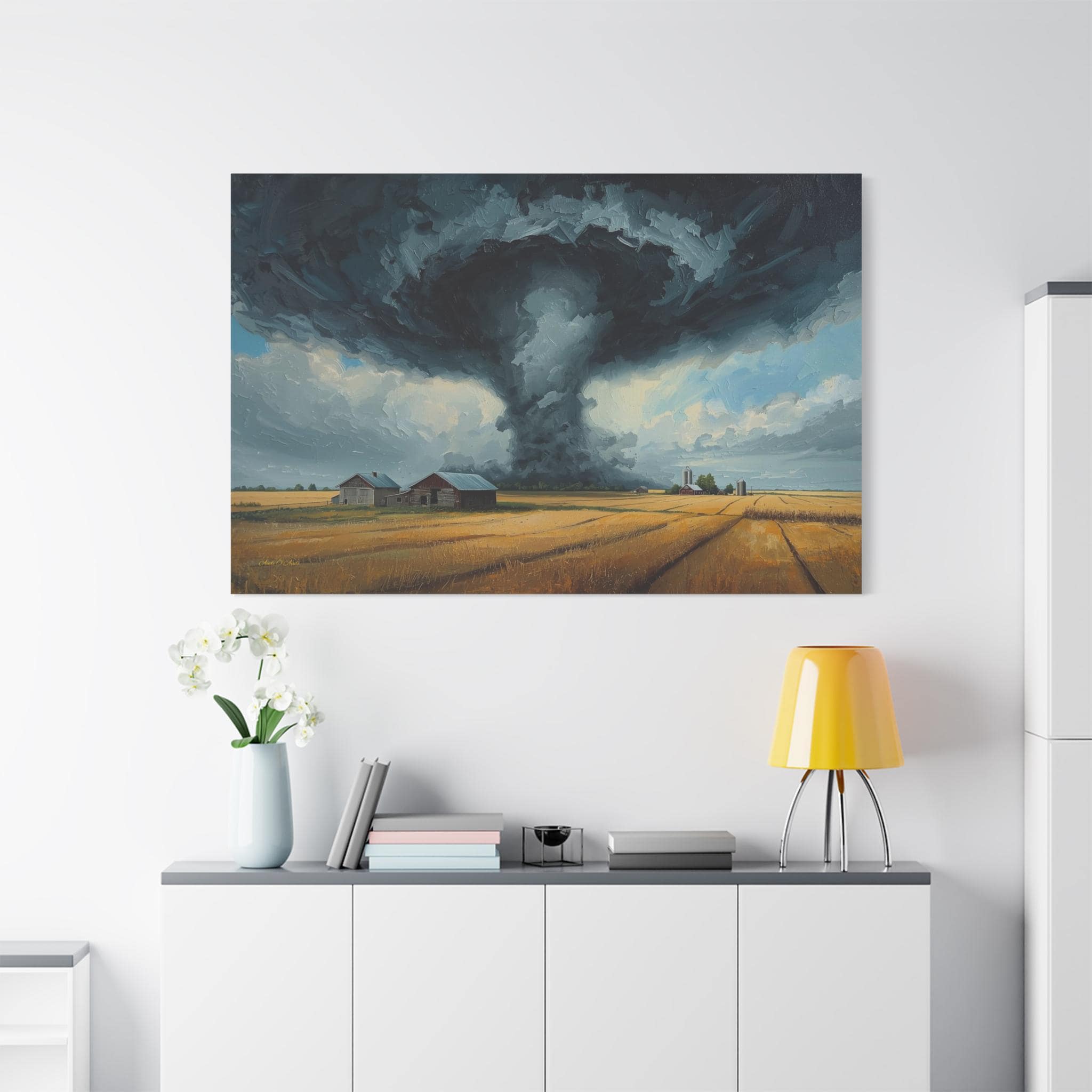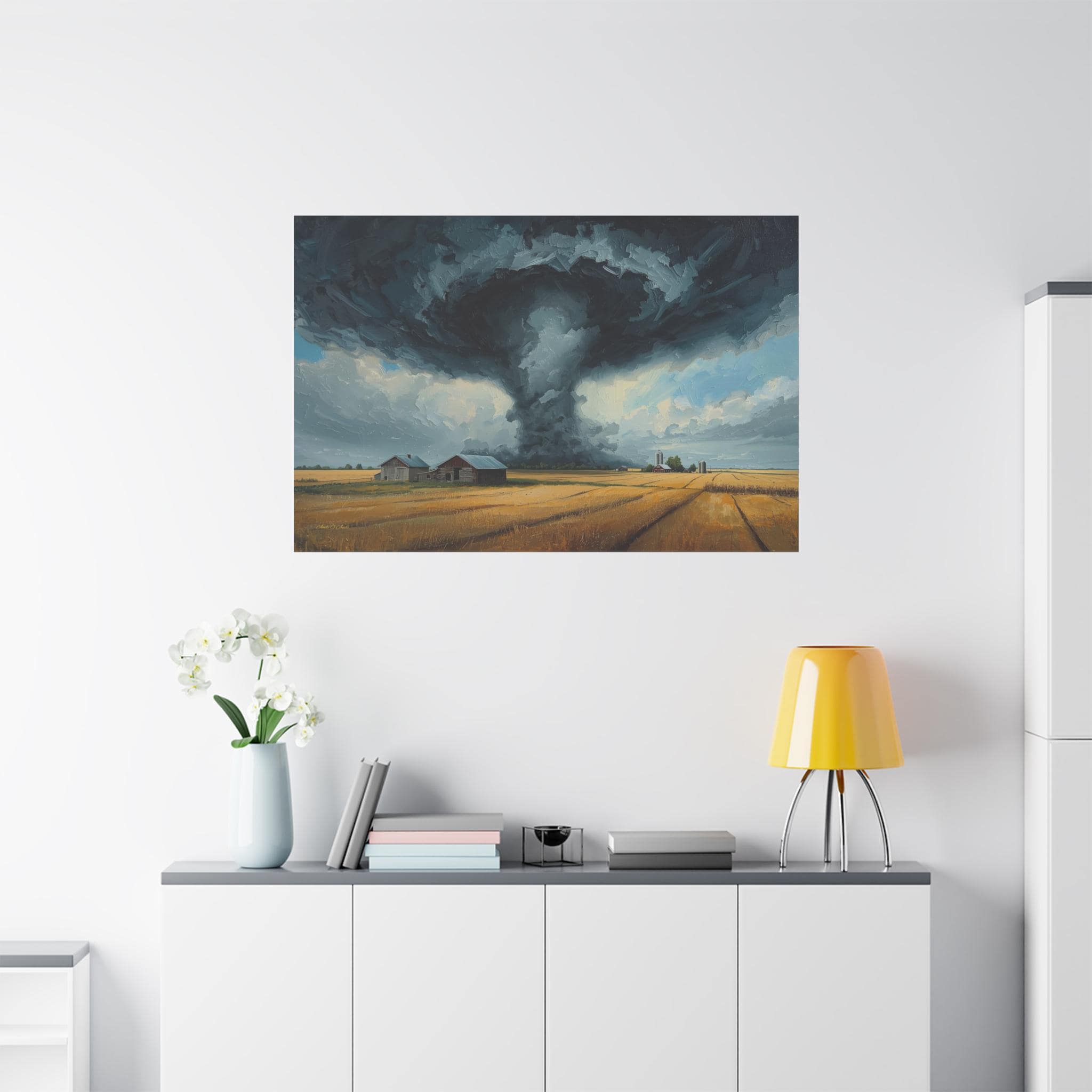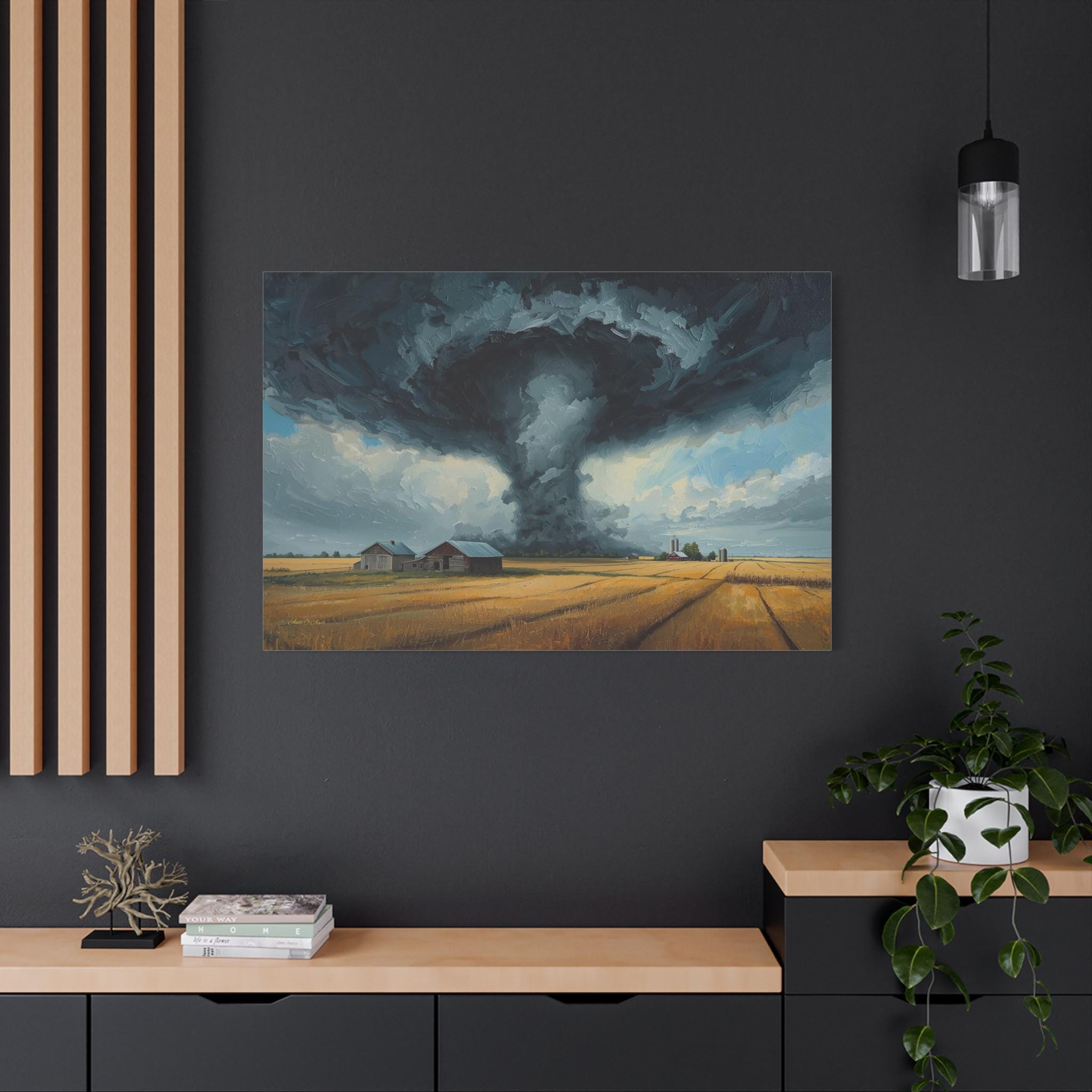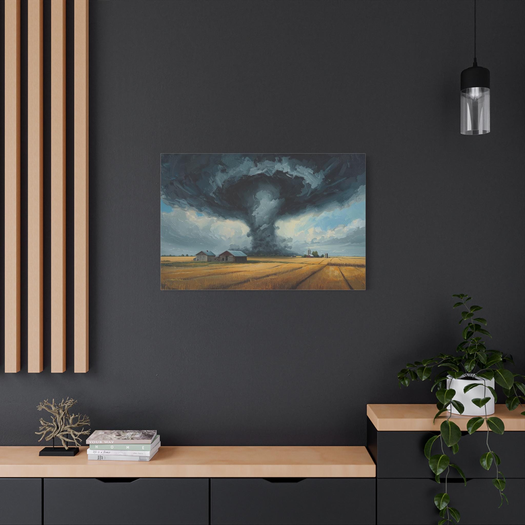 Witness the awe-inspiring power of nature with this epic canvas print of a massive tornado touching down. This dramatic artwork captures a supercell storm swirling over a golden Midwestern farm, contrasting the terrifying dark funnel cloud with the peaceful, harvest-ready wheat fields below.