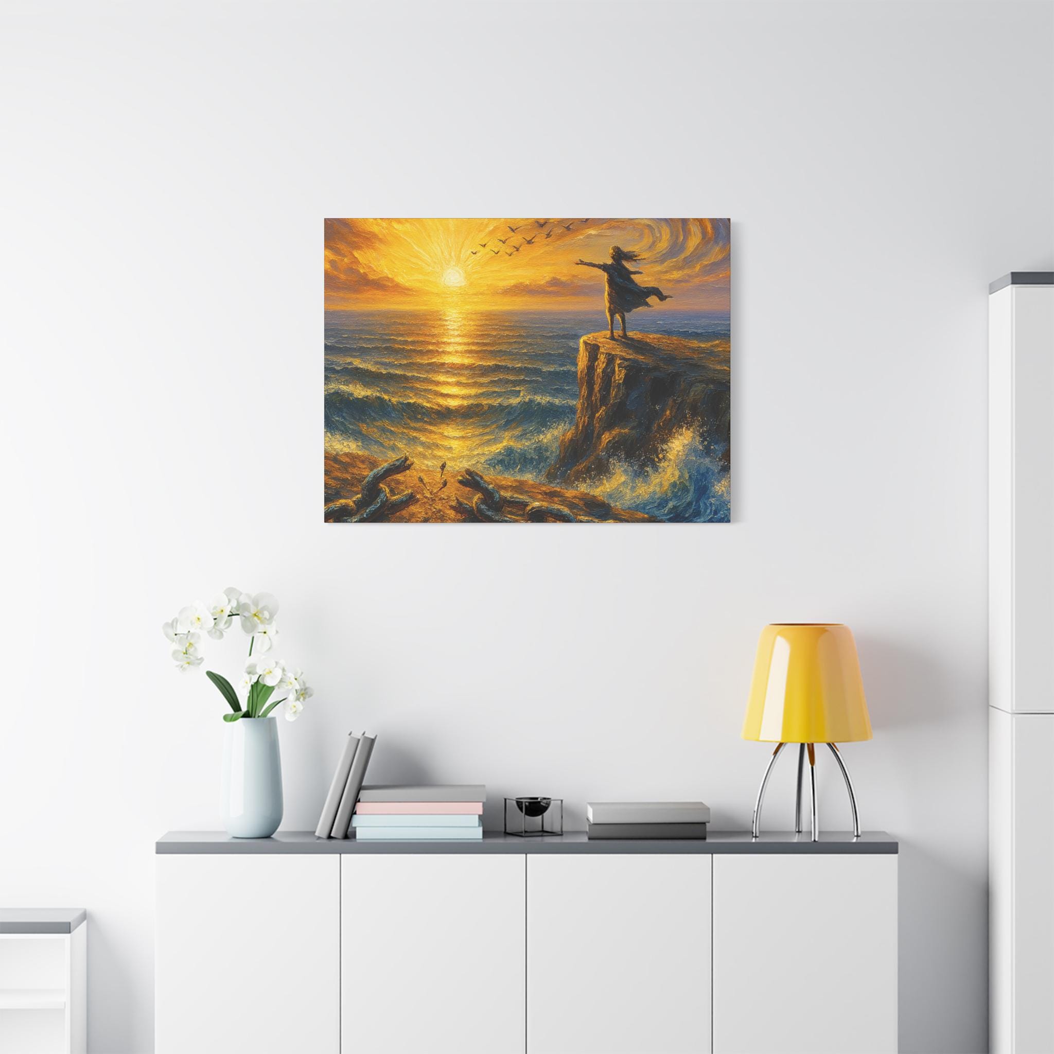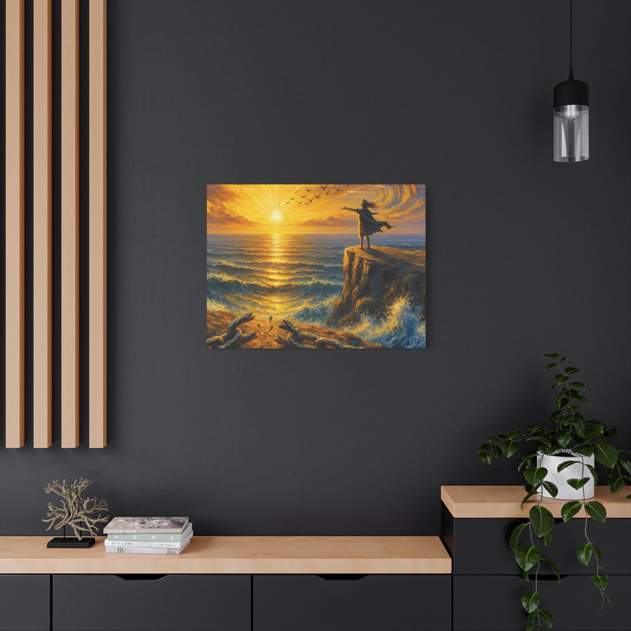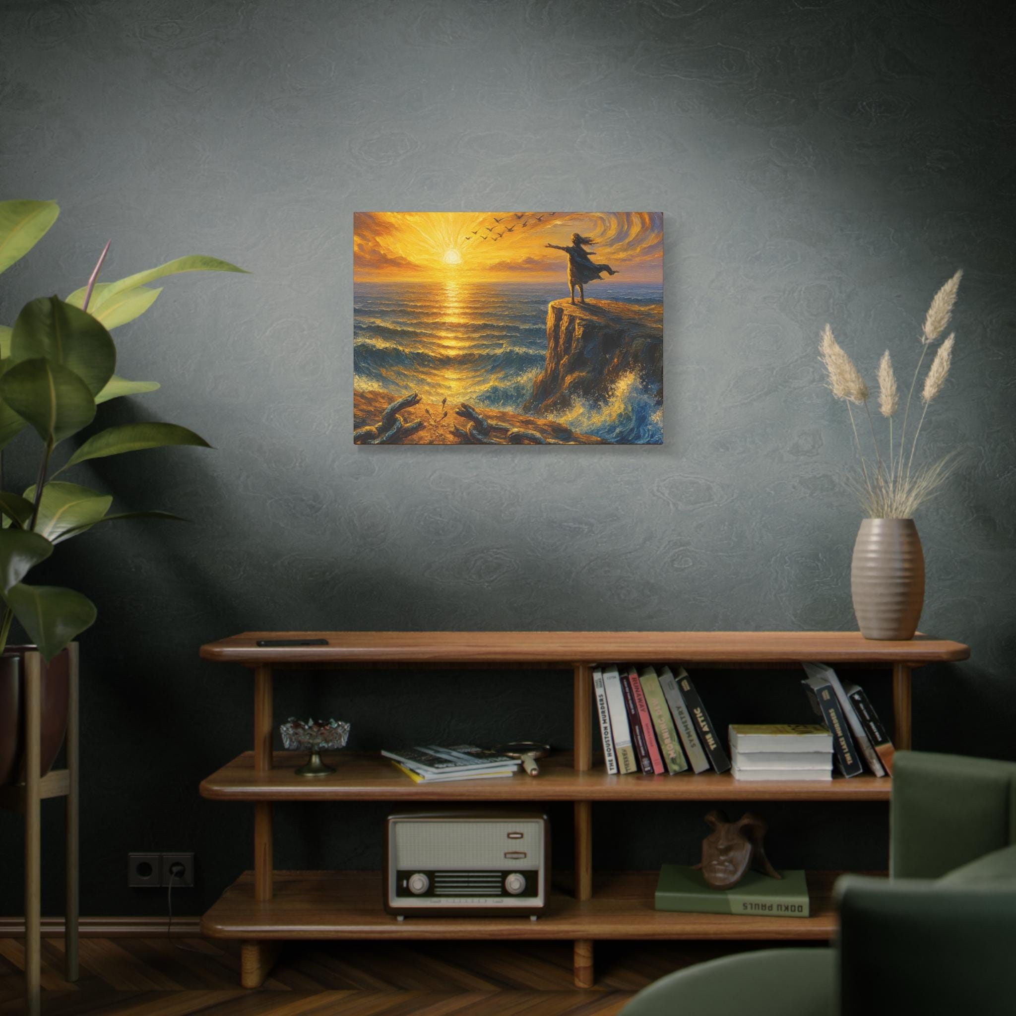 Transform your living space with this stunning Matte Canvas, Stretched, 1.25". Capturing the serene beauty of a sunset over the ocean, this artwork adds a warm and inviting atmosphere to any room. Perfect for creating a peaceful ambiance in your bedroom, living room, or office. This canvas is ideal for art lovers, home decor enthusiasts, or anyone looking to elevate their interior style. Celebrate occasions like housewarmings, weddings, or anniversaries by gifting this beautiful piece, and help your friends and family enhance their home with artistry that inspires tranquility.