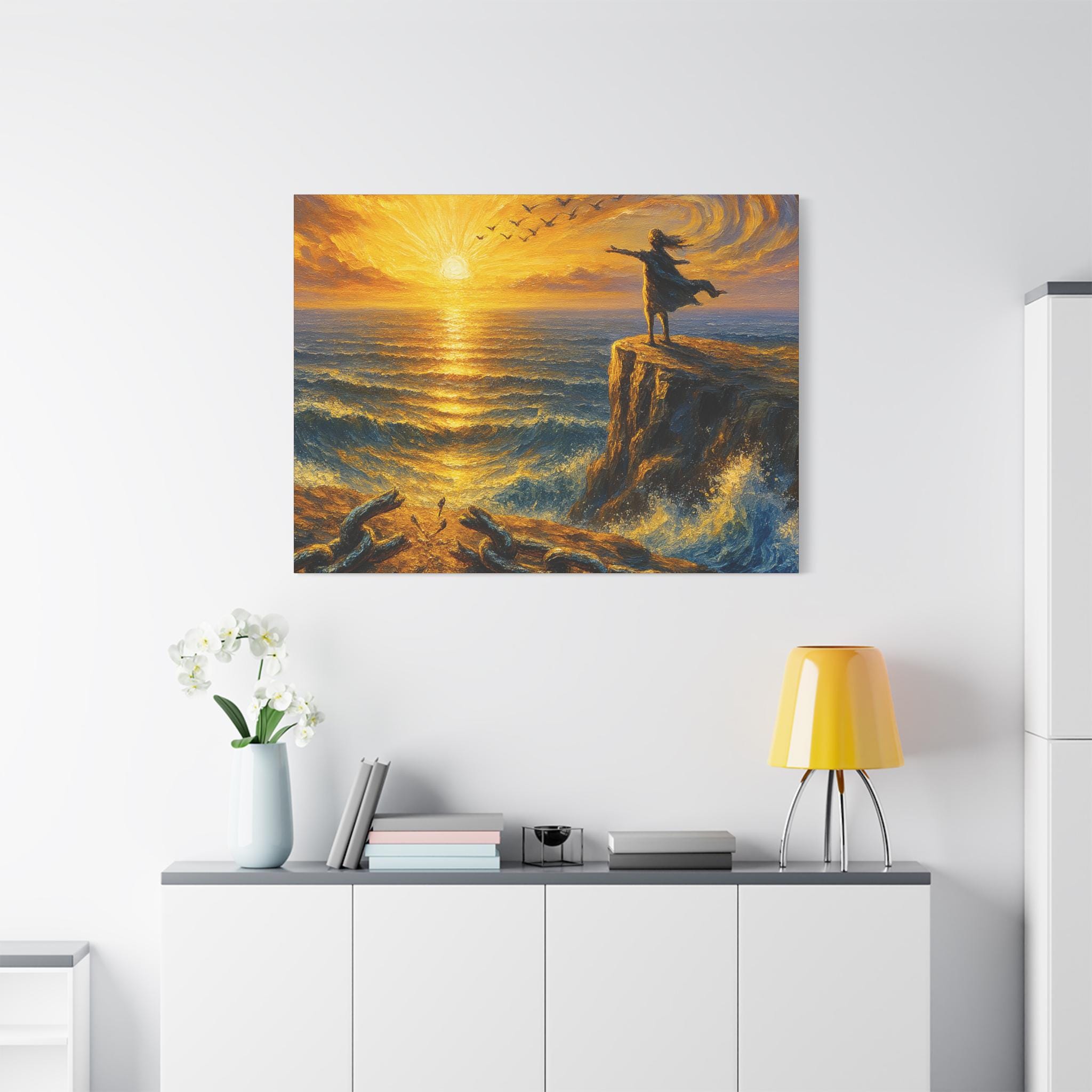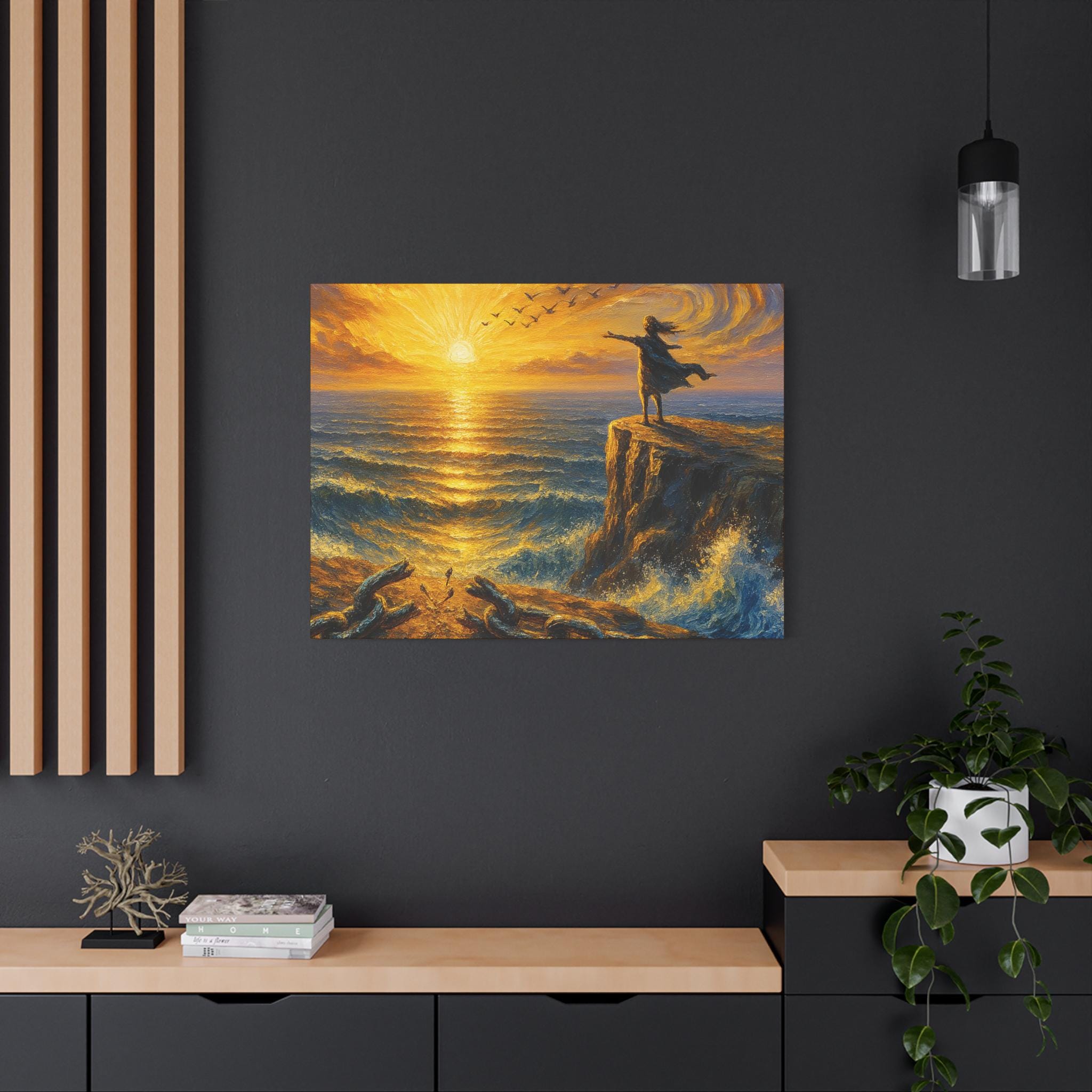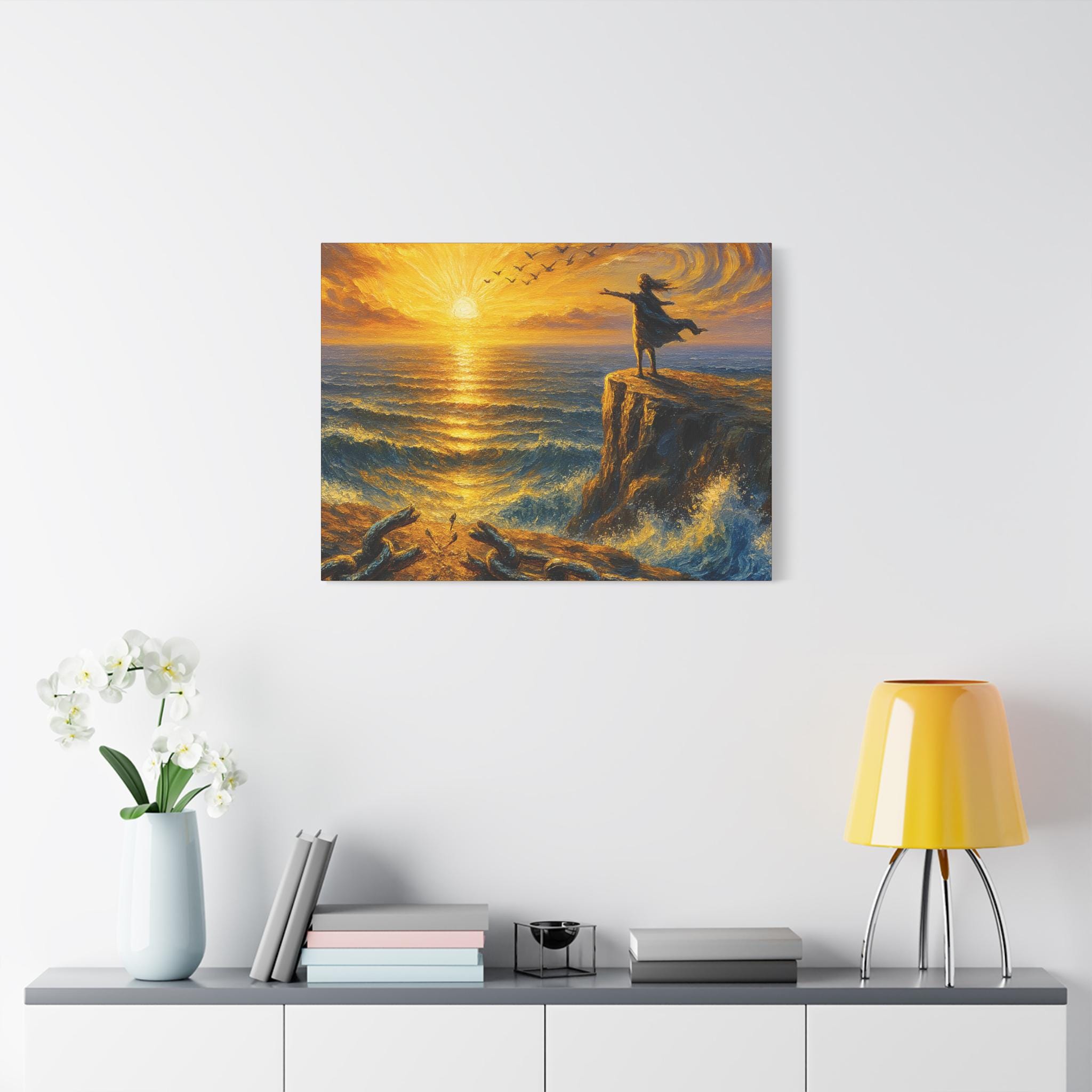 Transform your living space with this stunning Matte Canvas, Stretched, 1.25". Capturing the serene beauty of a sunset over the ocean, this artwork adds a warm and inviting atmosphere to any room. Perfect for creating a peaceful ambiance in your bedroom, living room, or office. This canvas is ideal for art lovers, home decor enthusiasts, or anyone looking to elevate their interior style. Celebrate occasions like housewarmings, weddings, or anniversaries by gifting this beautiful piece, and help your friends and family enhance their home with artistry that inspires tranquility.