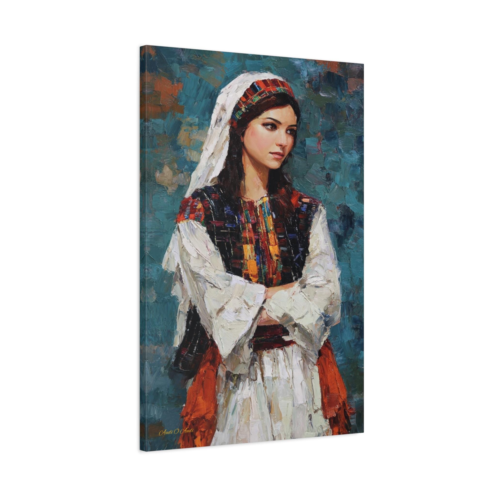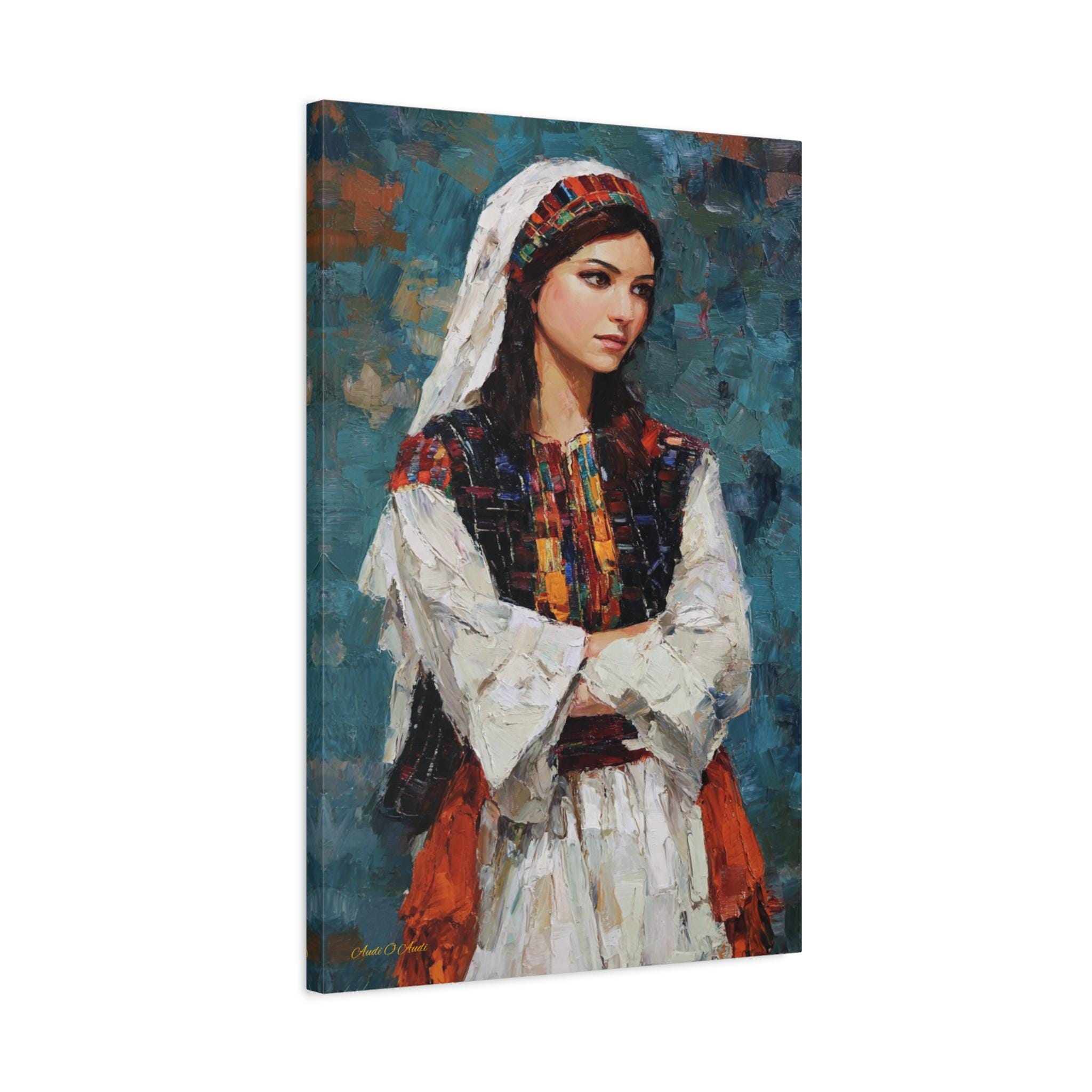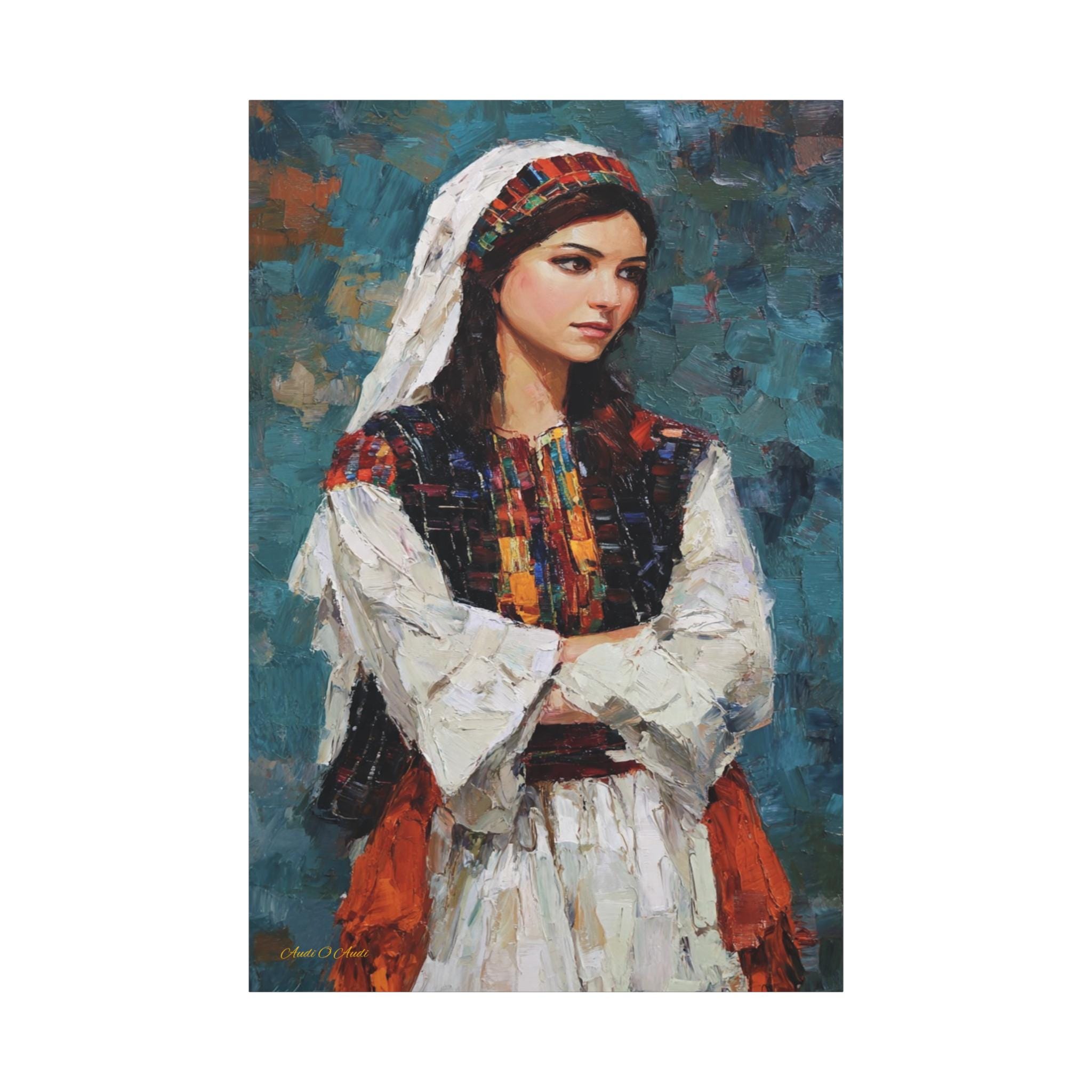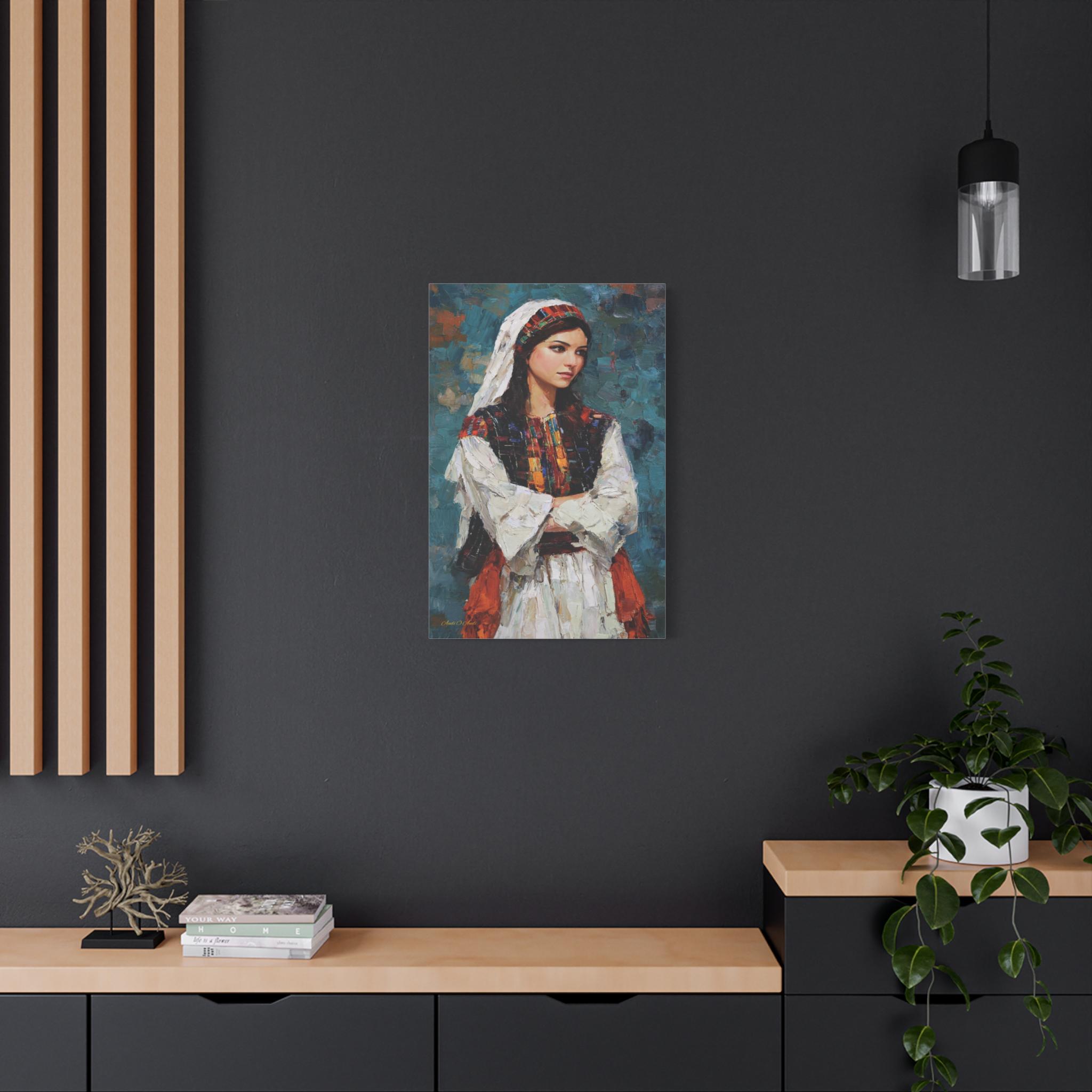 Celebrate beauty, history, and heritage with this stunning cultural portrait canvas print. This captivating artwork features a young woman dressed in traditional attire, showcasing intricate, colorful embroidery reminiscent of classic Tatreez patterns. She stands with quiet pride against a deep, textured teal background that highlights the vibrant reds, oranges, and blacks of her dress.