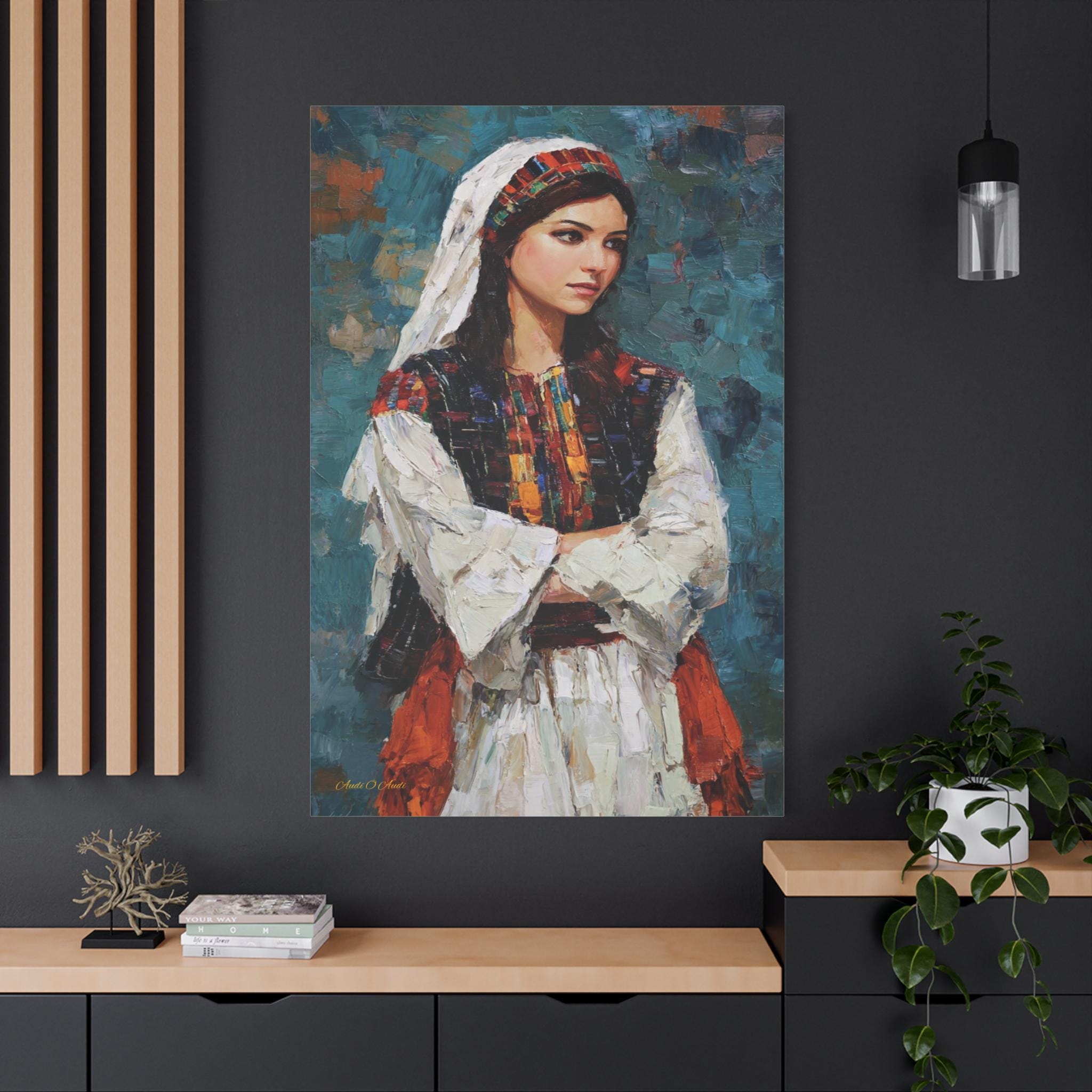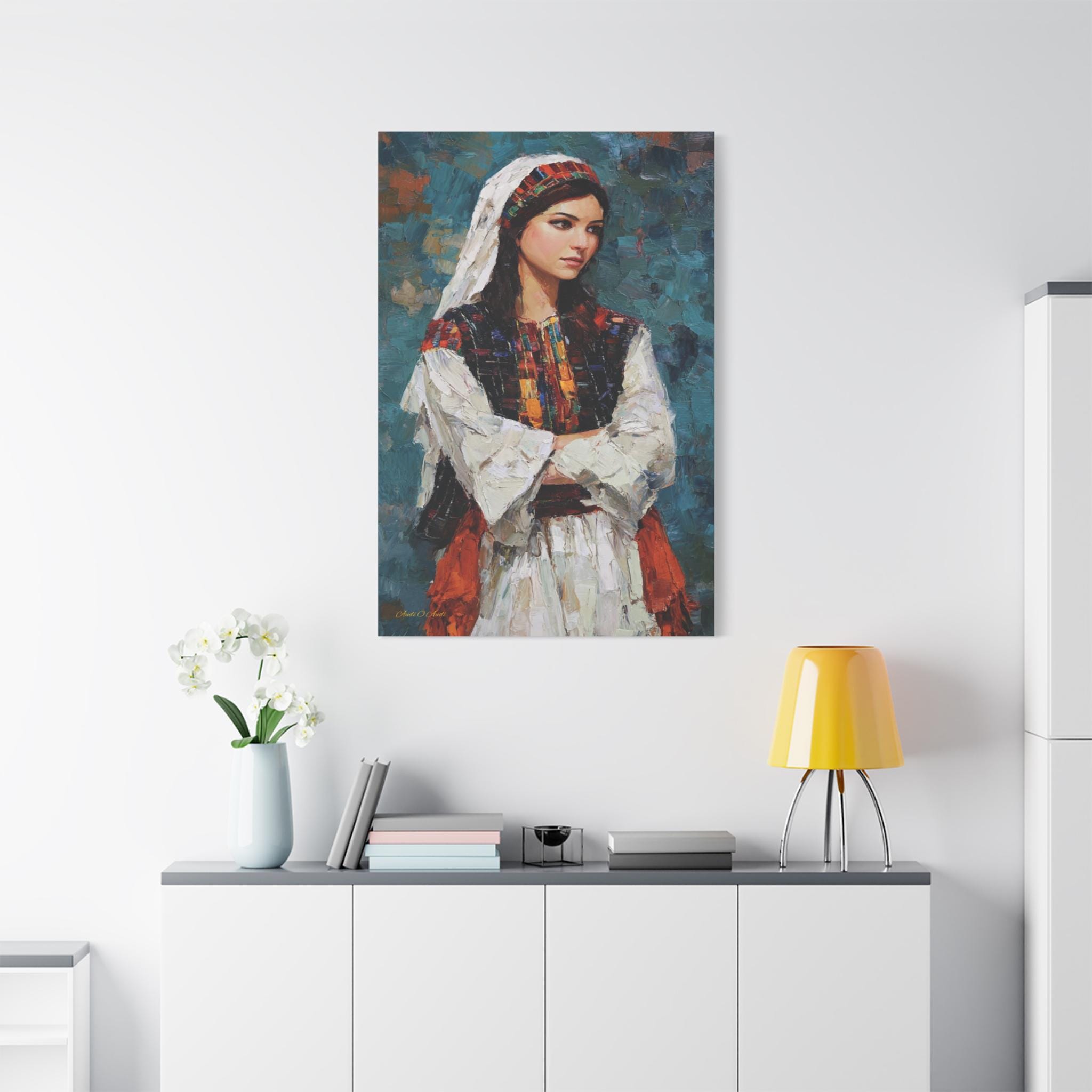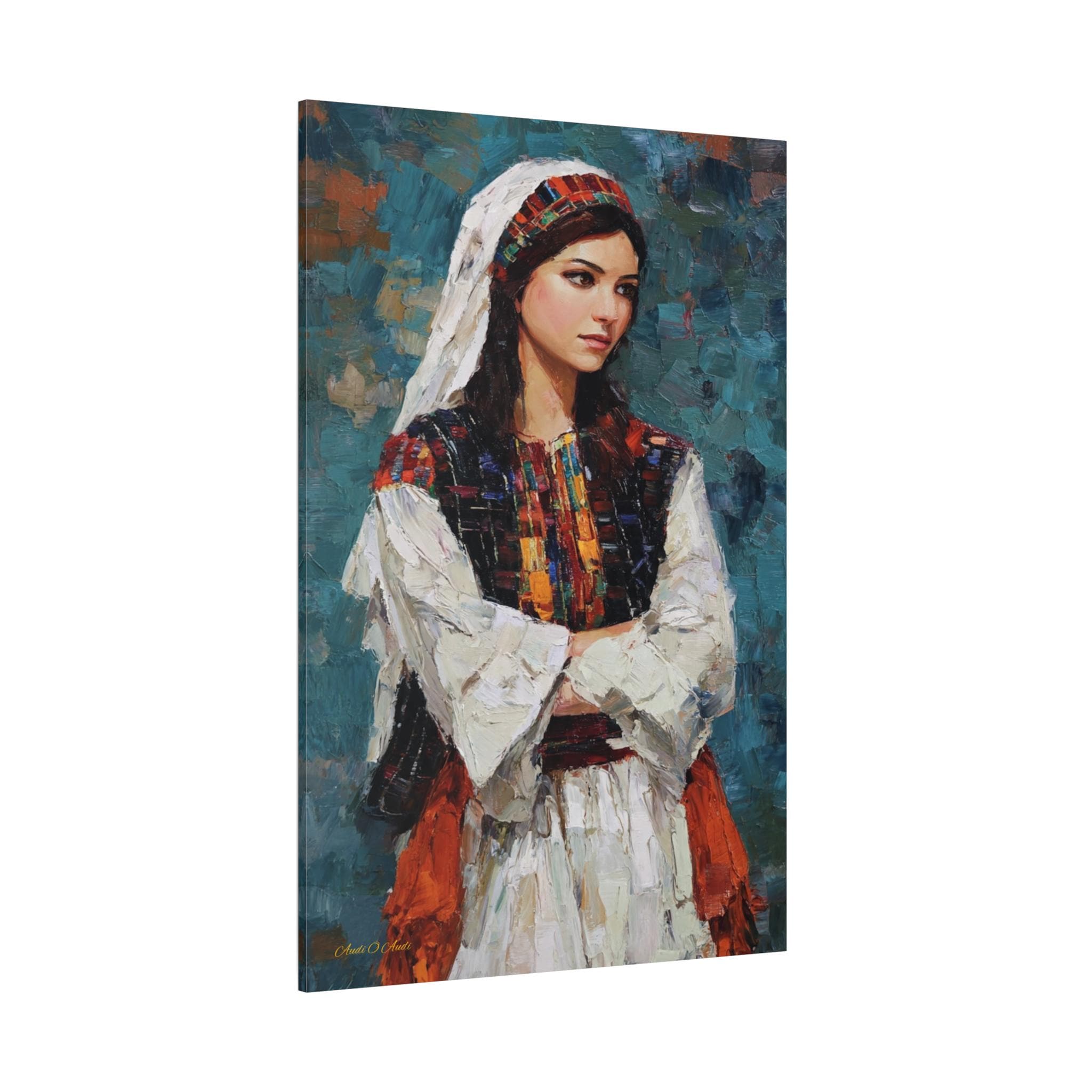 Celebrate beauty, history, and heritage with this stunning cultural portrait canvas print. This captivating artwork features a young woman dressed in traditional attire, showcasing intricate, colorful embroidery reminiscent of classic Tatreez patterns. She stands with quiet pride against a deep, textured teal background that highlights the vibrant reds, oranges, and blacks of her dress.