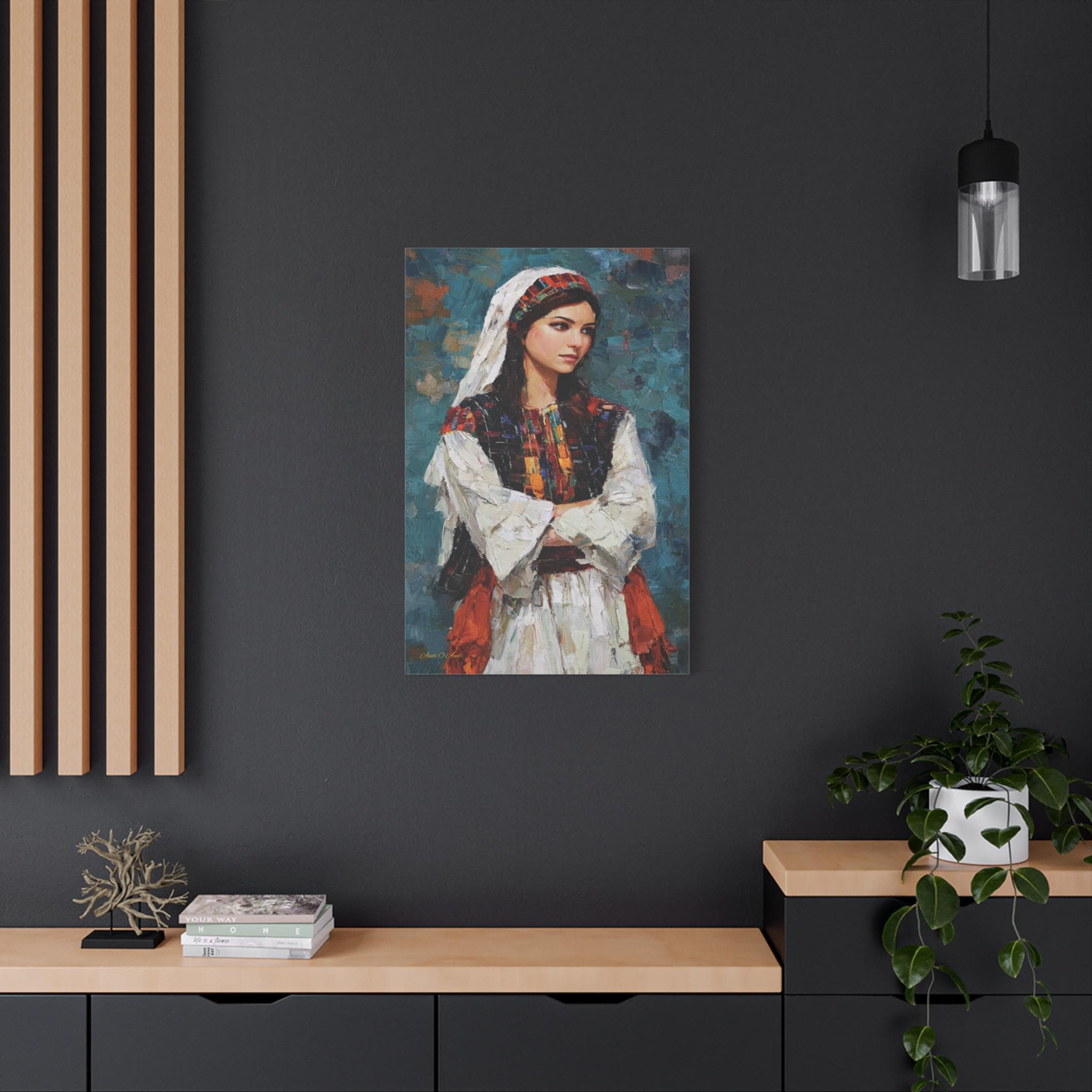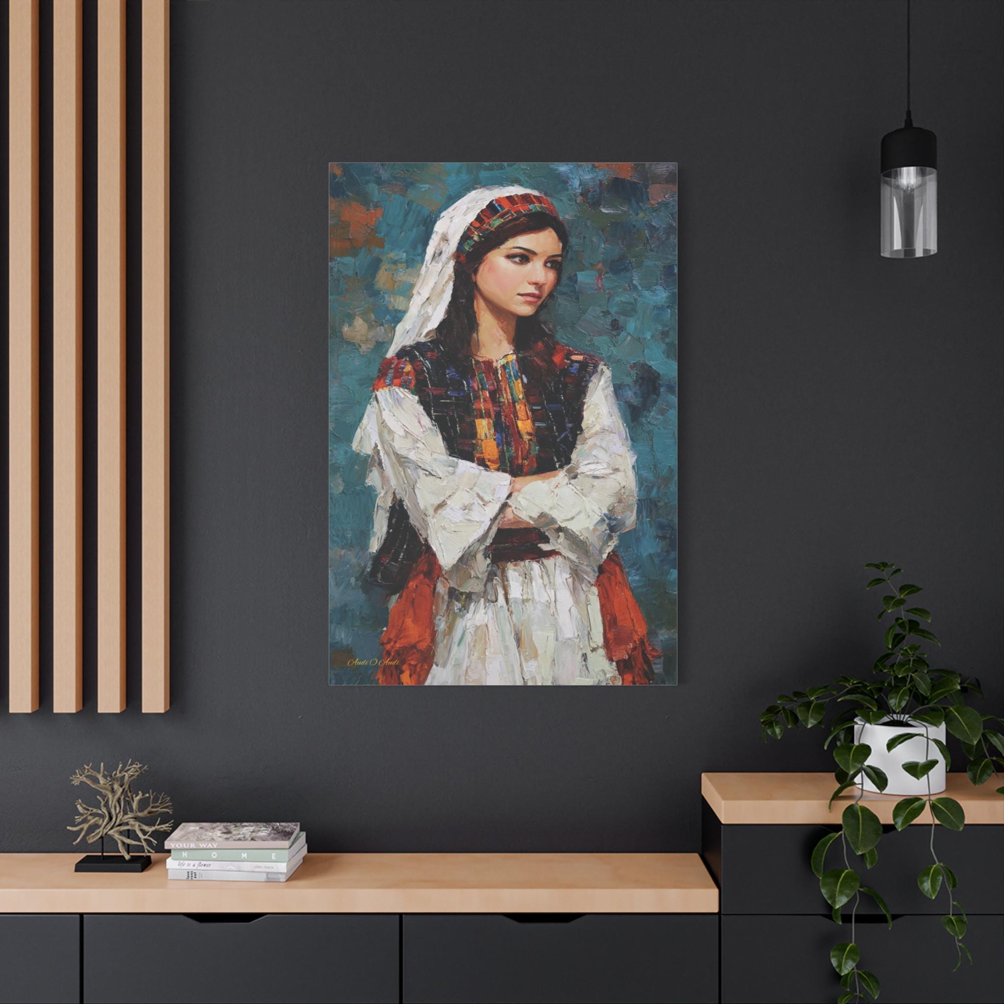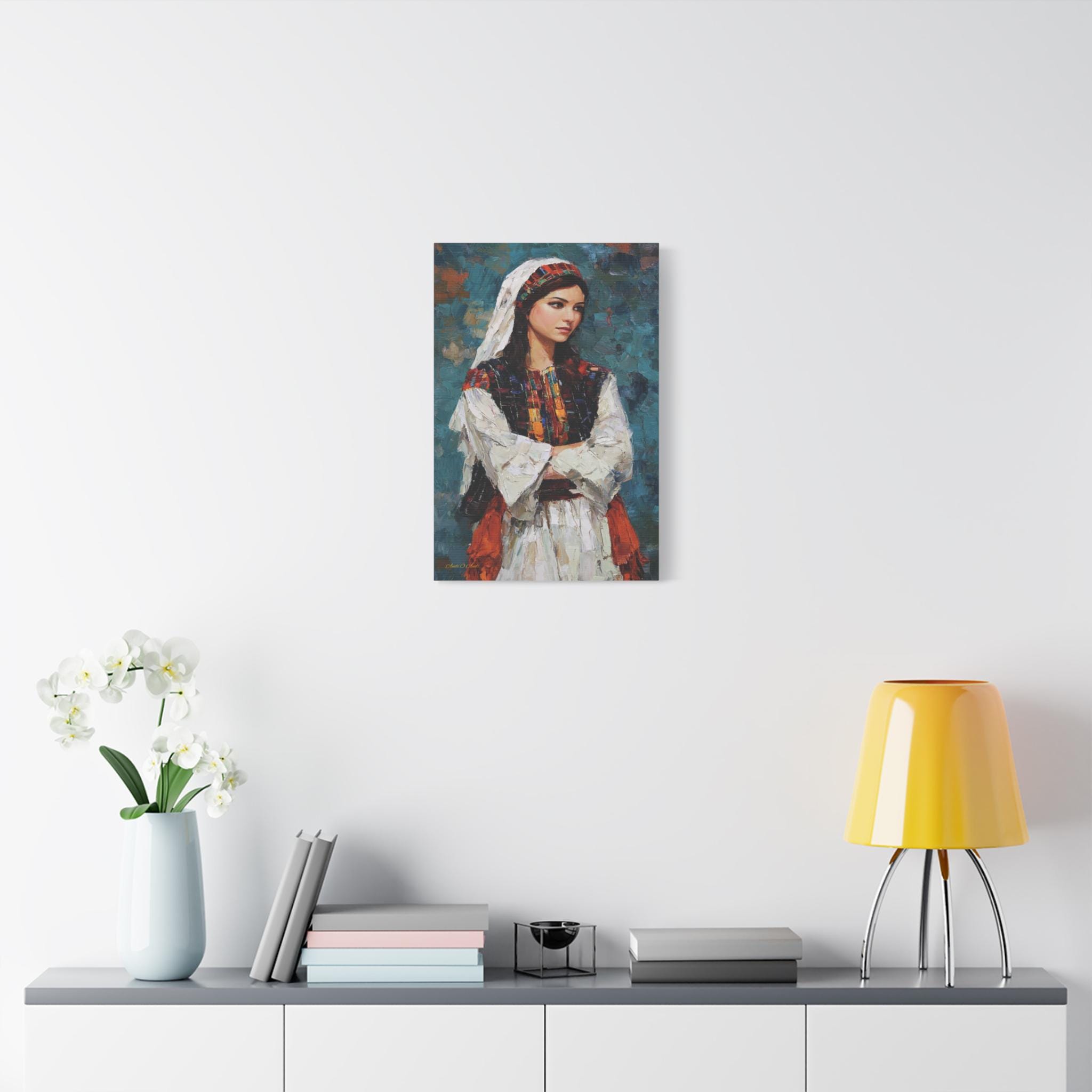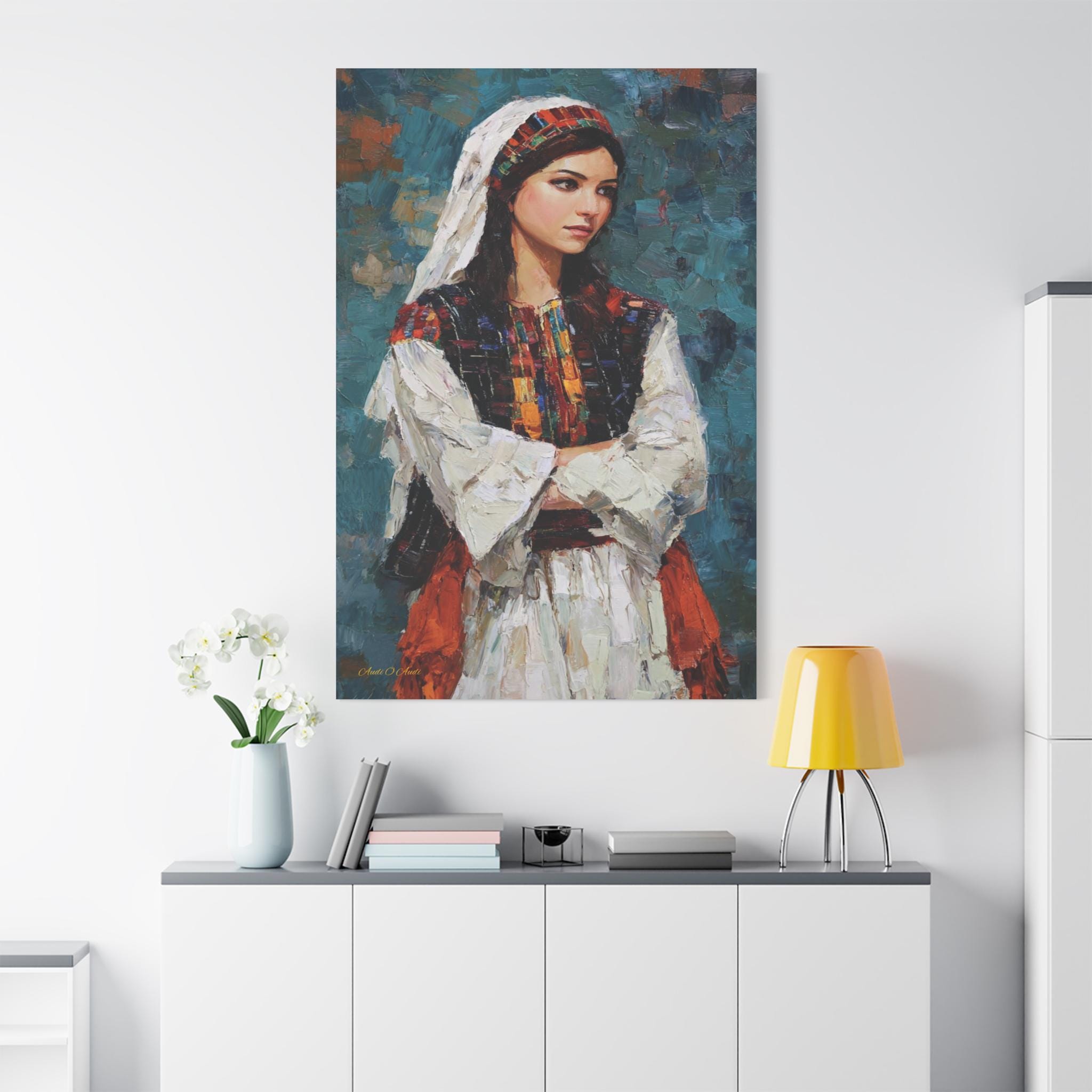 Celebrate beauty, history, and heritage with this stunning cultural portrait canvas print. This captivating artwork features a young woman dressed in traditional attire, showcasing intricate, colorful embroidery reminiscent of classic Tatreez patterns. She stands with quiet pride against a deep, textured teal background that highlights the vibrant reds, oranges, and blacks of her dress.