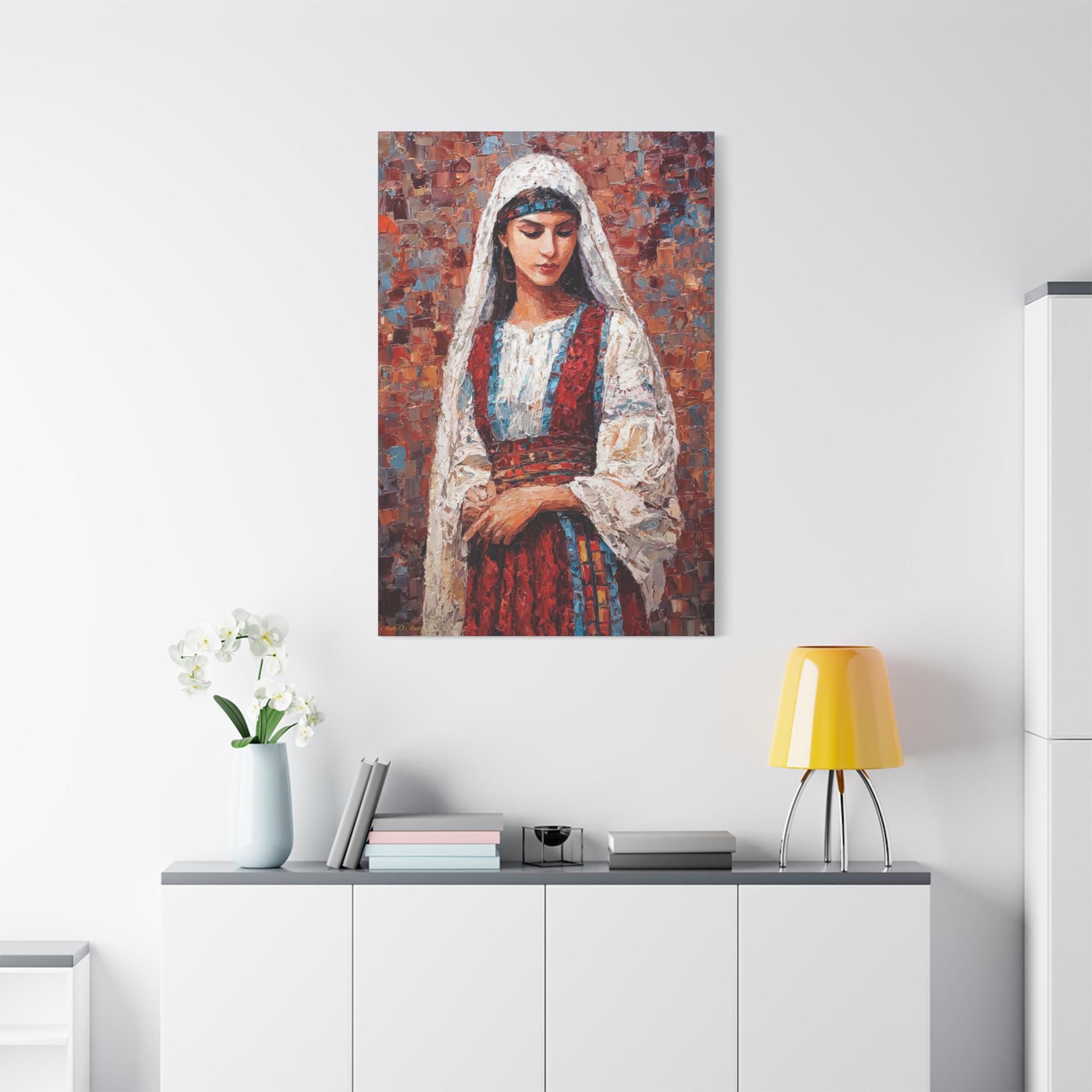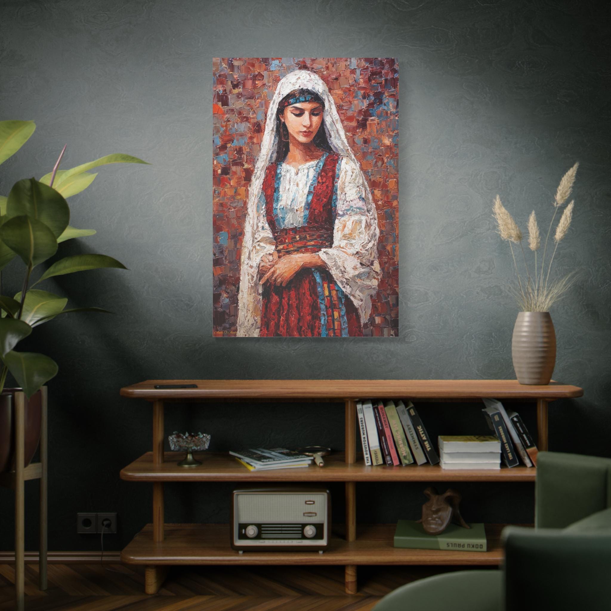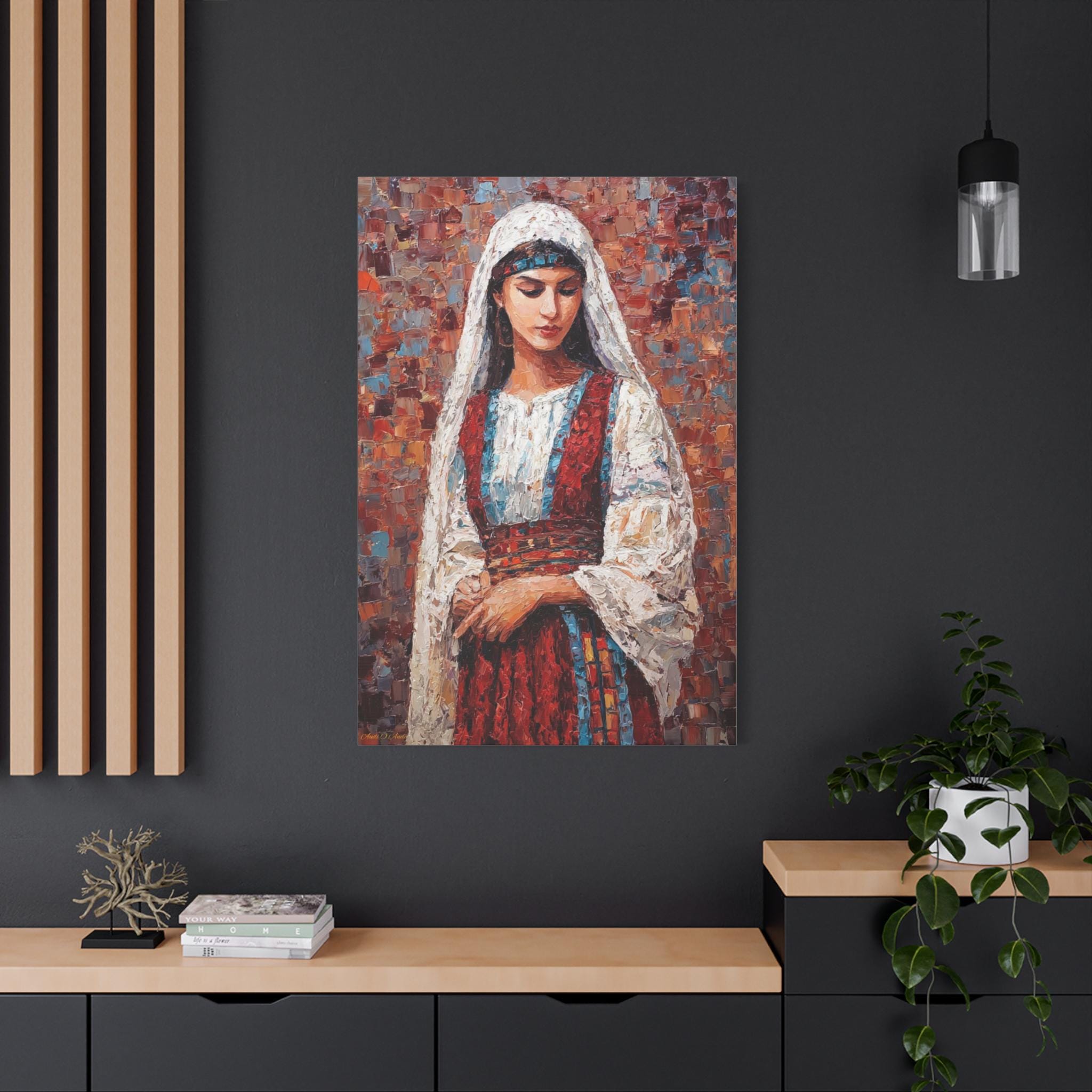 Whisper of Tradition, Artistic Stretched Canvas Wall Art, Cultural Home Decor, Mediterranean Woman Portrait, Unique Gift for Art Lovers.