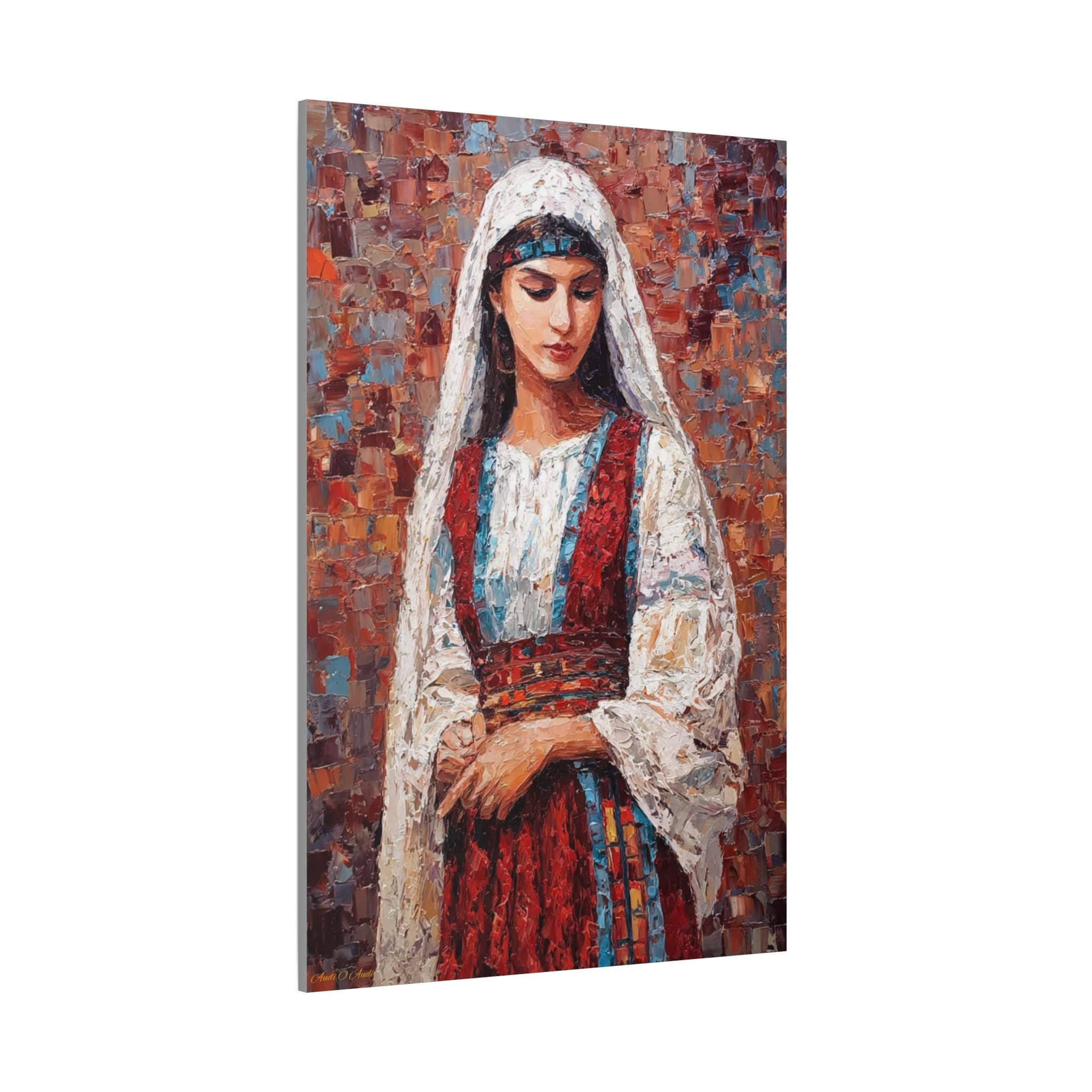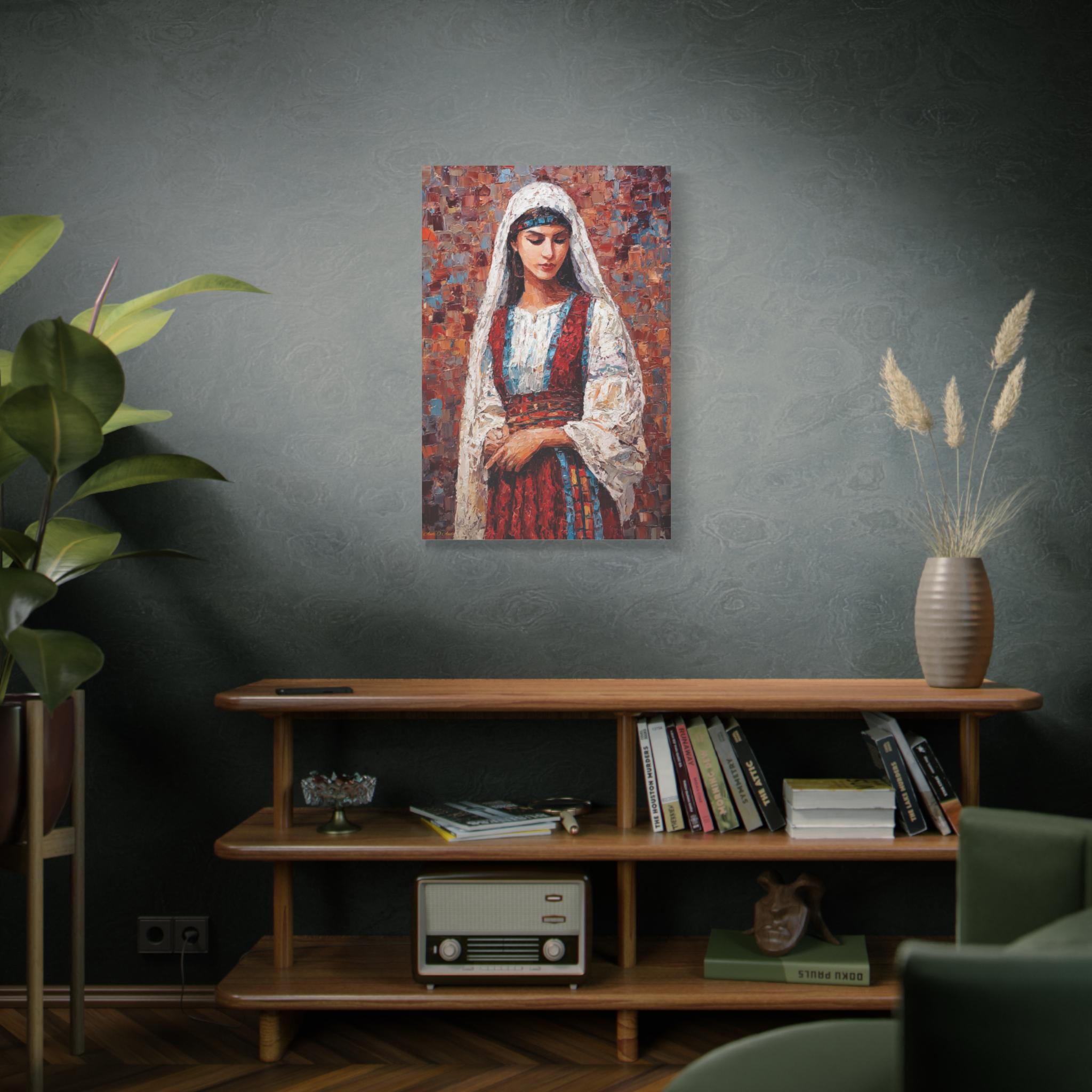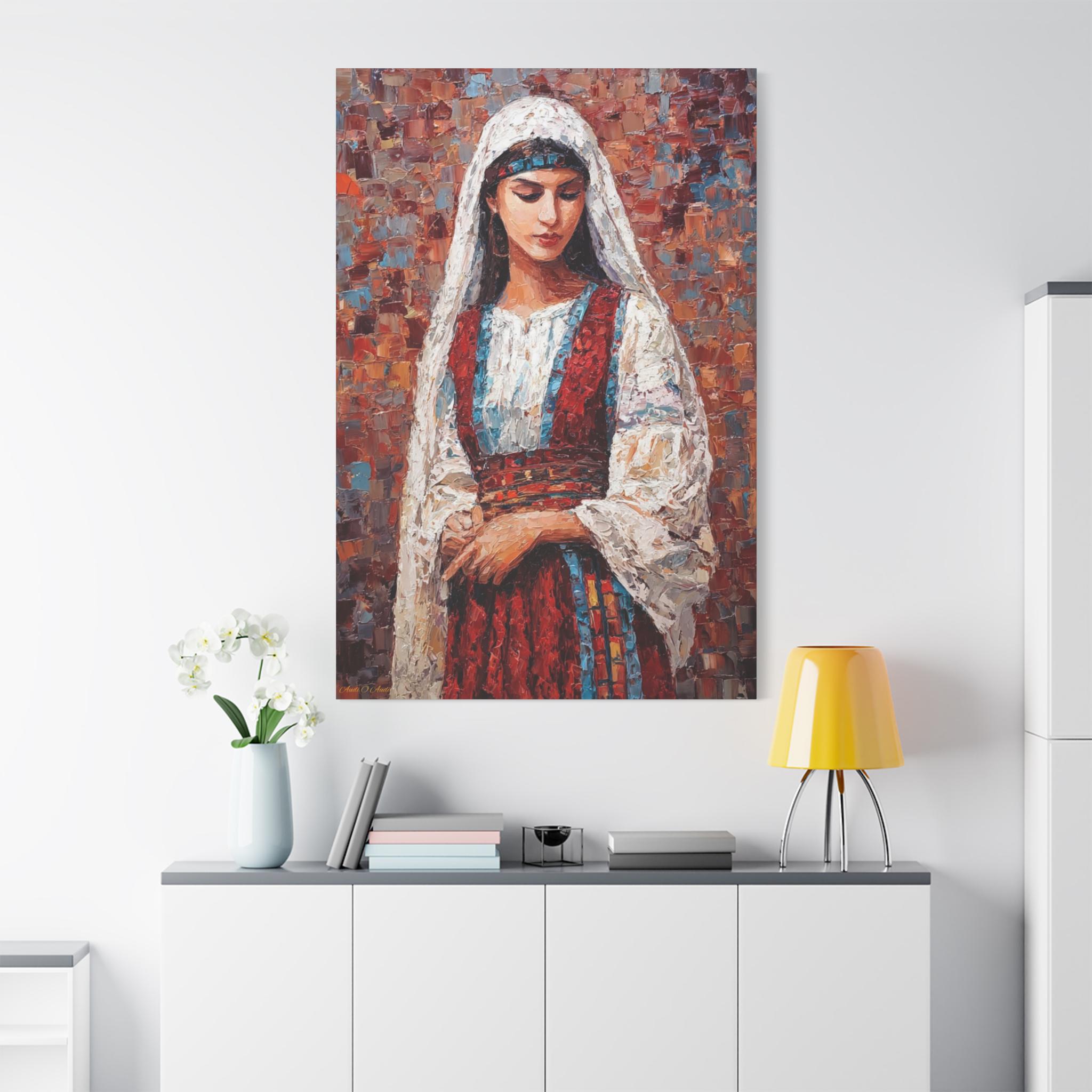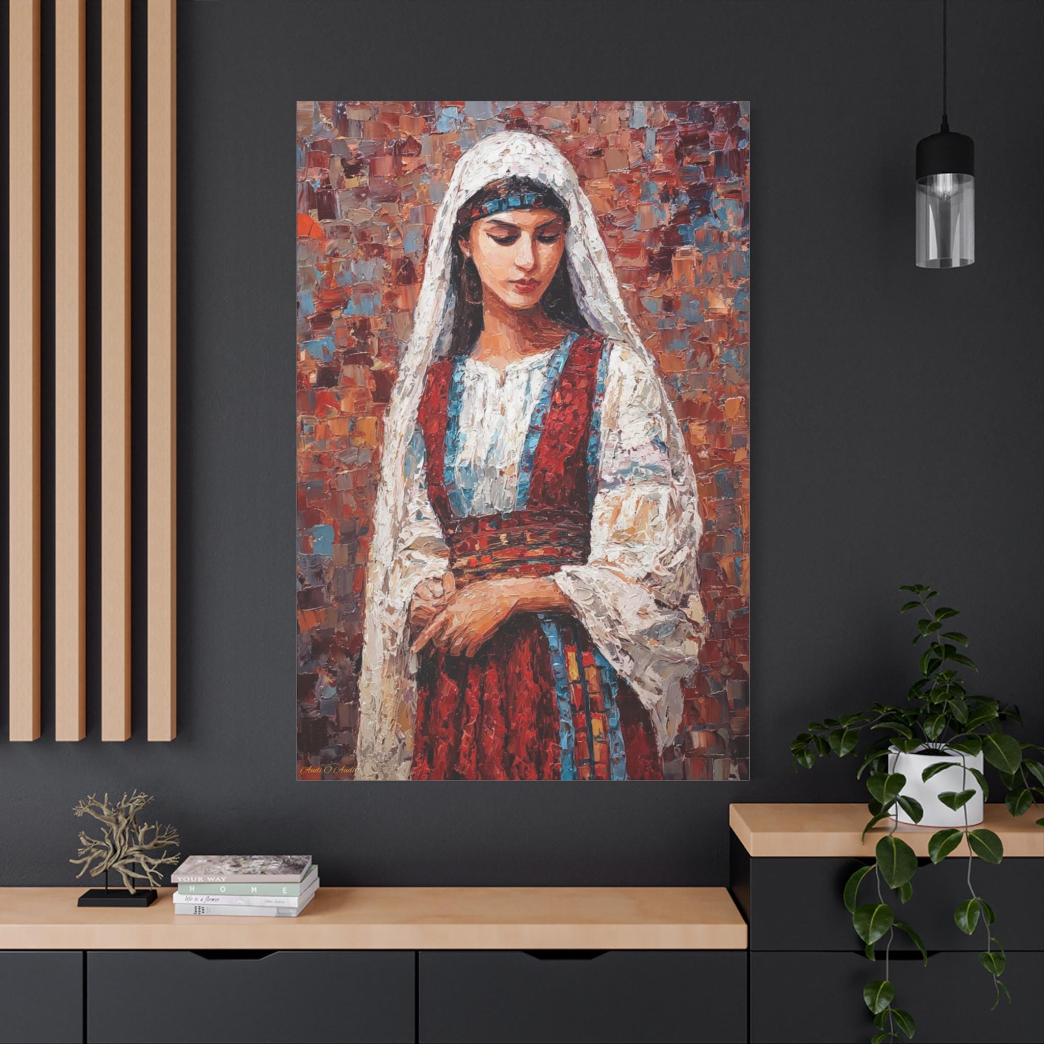 Whisper of Tradition, Artistic Stretched Canvas Wall Art, Cultural Home Decor, Mediterranean Woman Portrait, Unique Gift for Art Lovers.