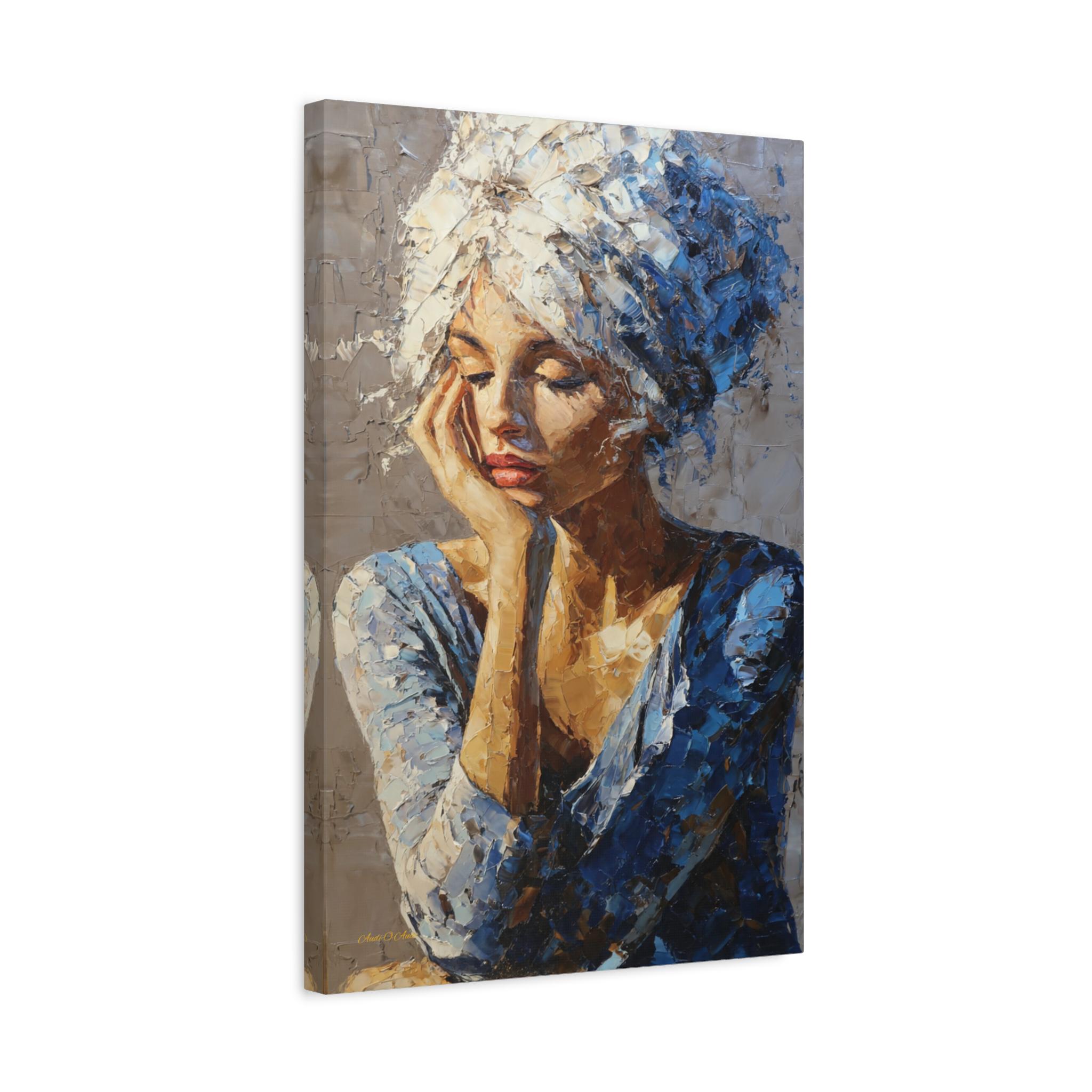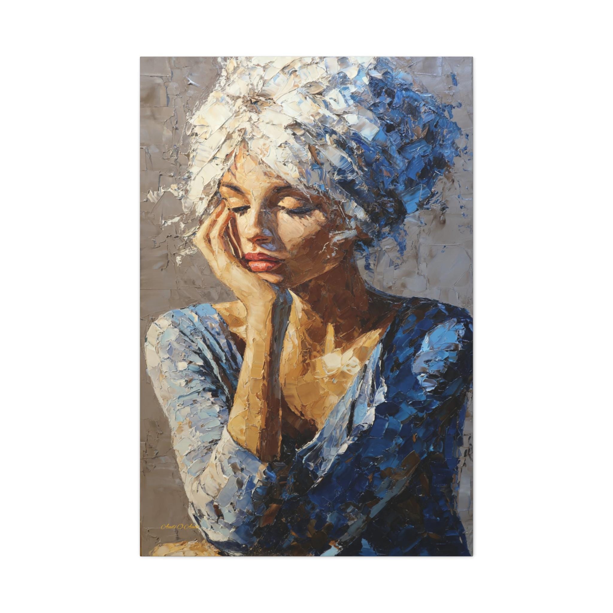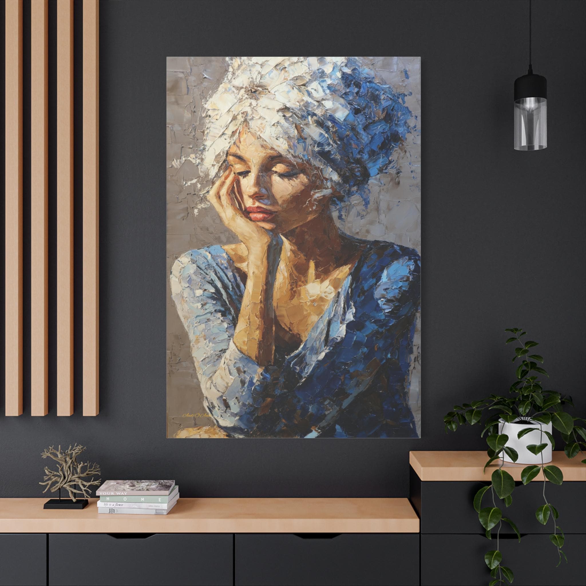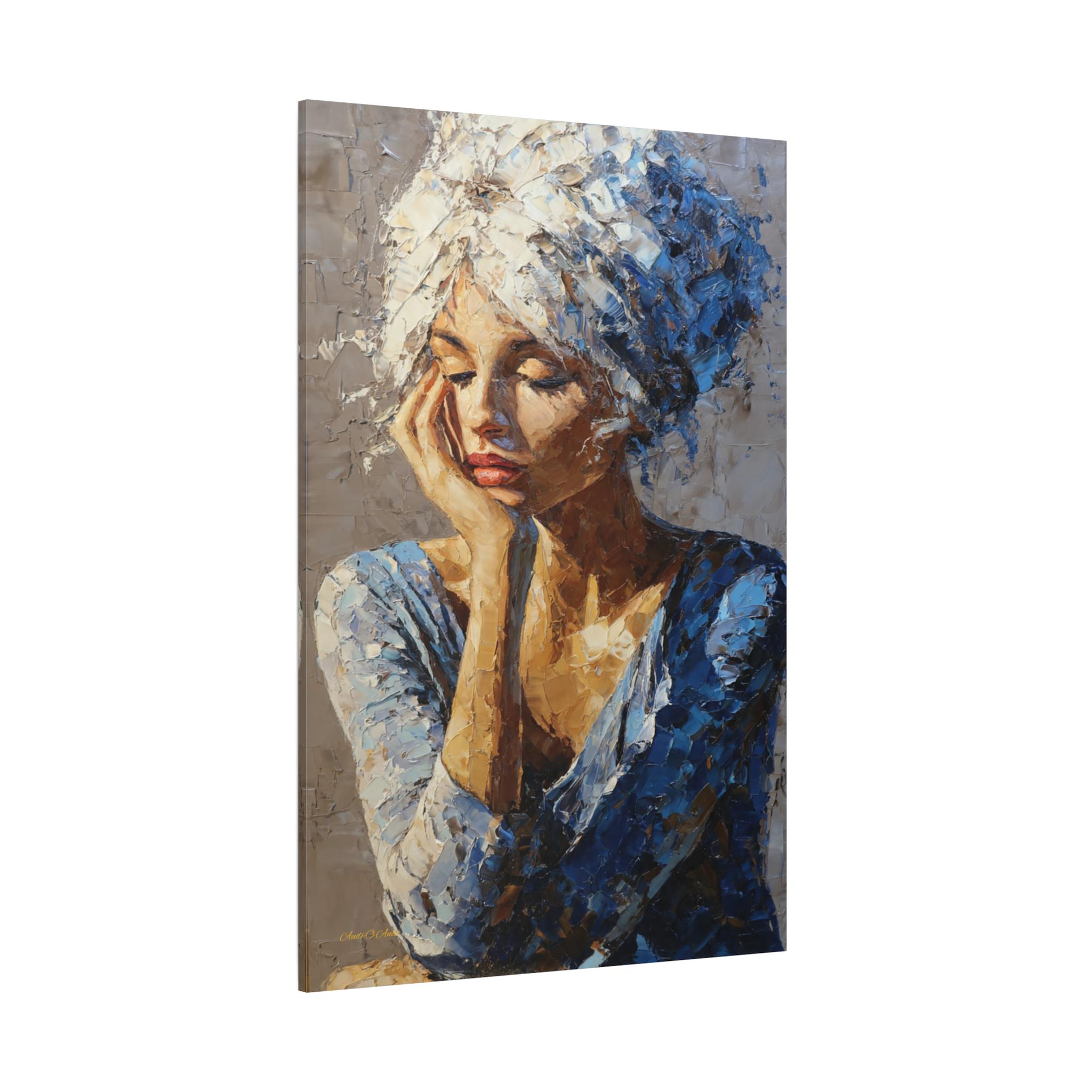 The composition is both raw and sophisticated. The design utilizes a heavy impasto oil painting style, where thick, expressive palette knife strokes in deep blues and bright whites beautifully frame the warm, golden tones of her face. It is the perfect statement piece to bring a soulful, feminine energy to your bedroom, living room, or private sanctuary.