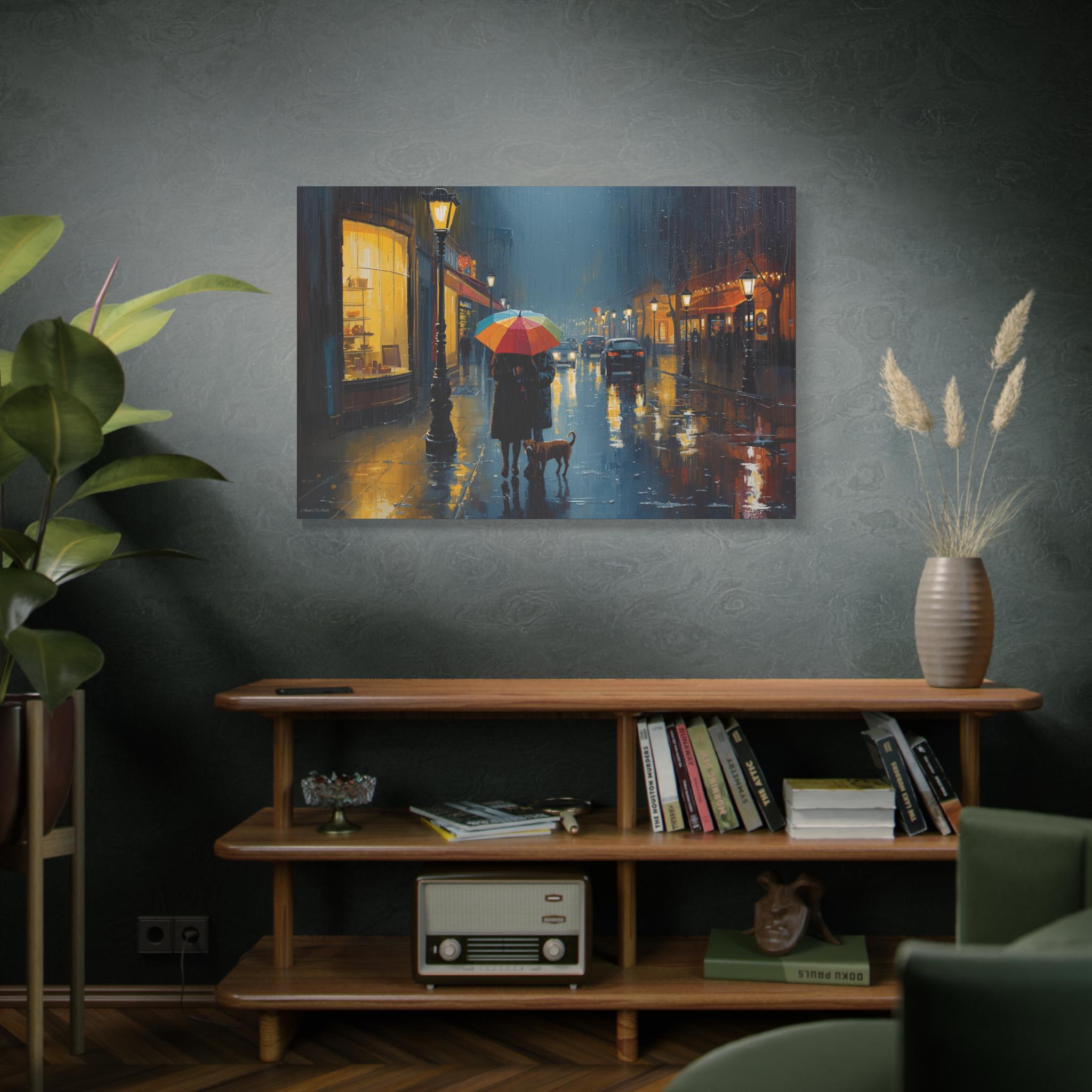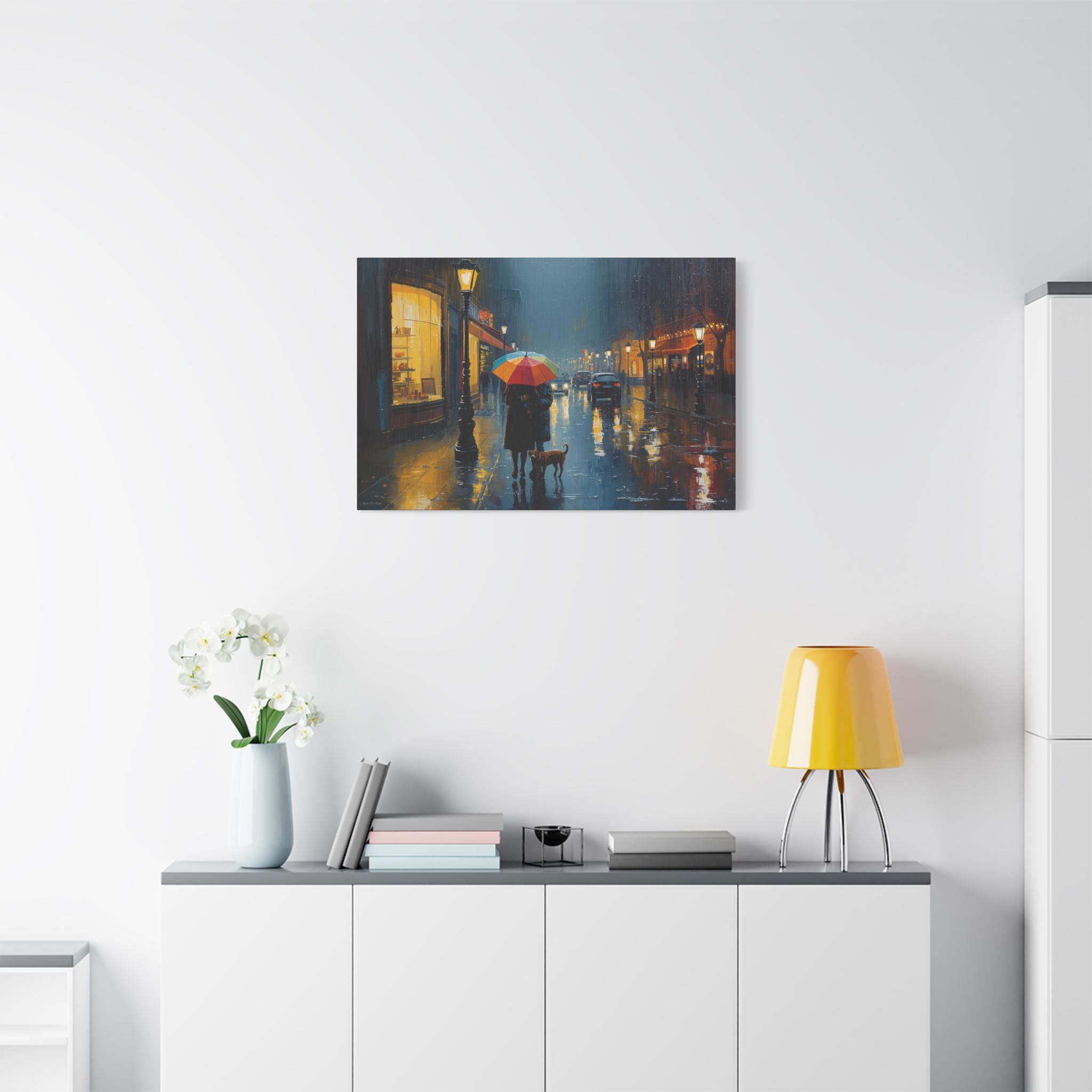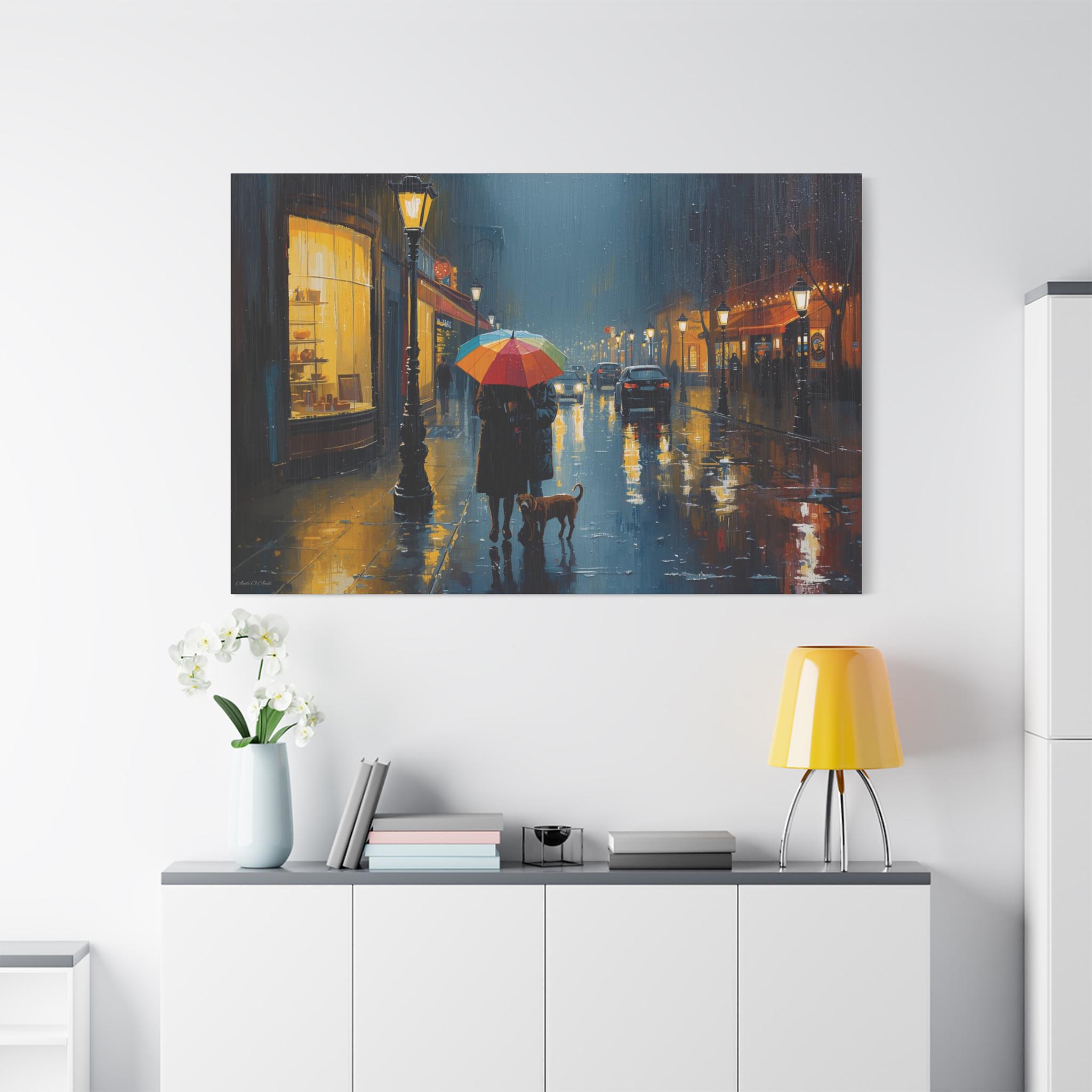 The Urban Solace canvas art print is a romantic cityscape design that serves as beautiful wall decor. Perfect for art lovers, this artwork features a colorful umbrella print that creates a cozy and comforting atmosphere. Ideal for rainy days, this gift is relevant to those who appreciate art and want to add a touch of warmth to their living space. Suitable for holidays, birthdays, housewarmings, and any occasion where a thoughtful and unique gift is desired.