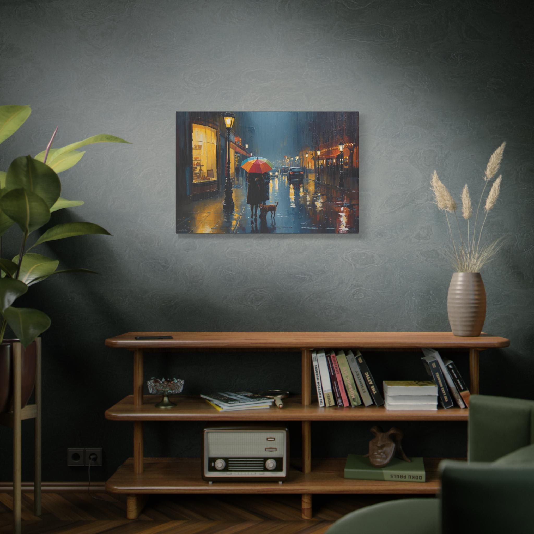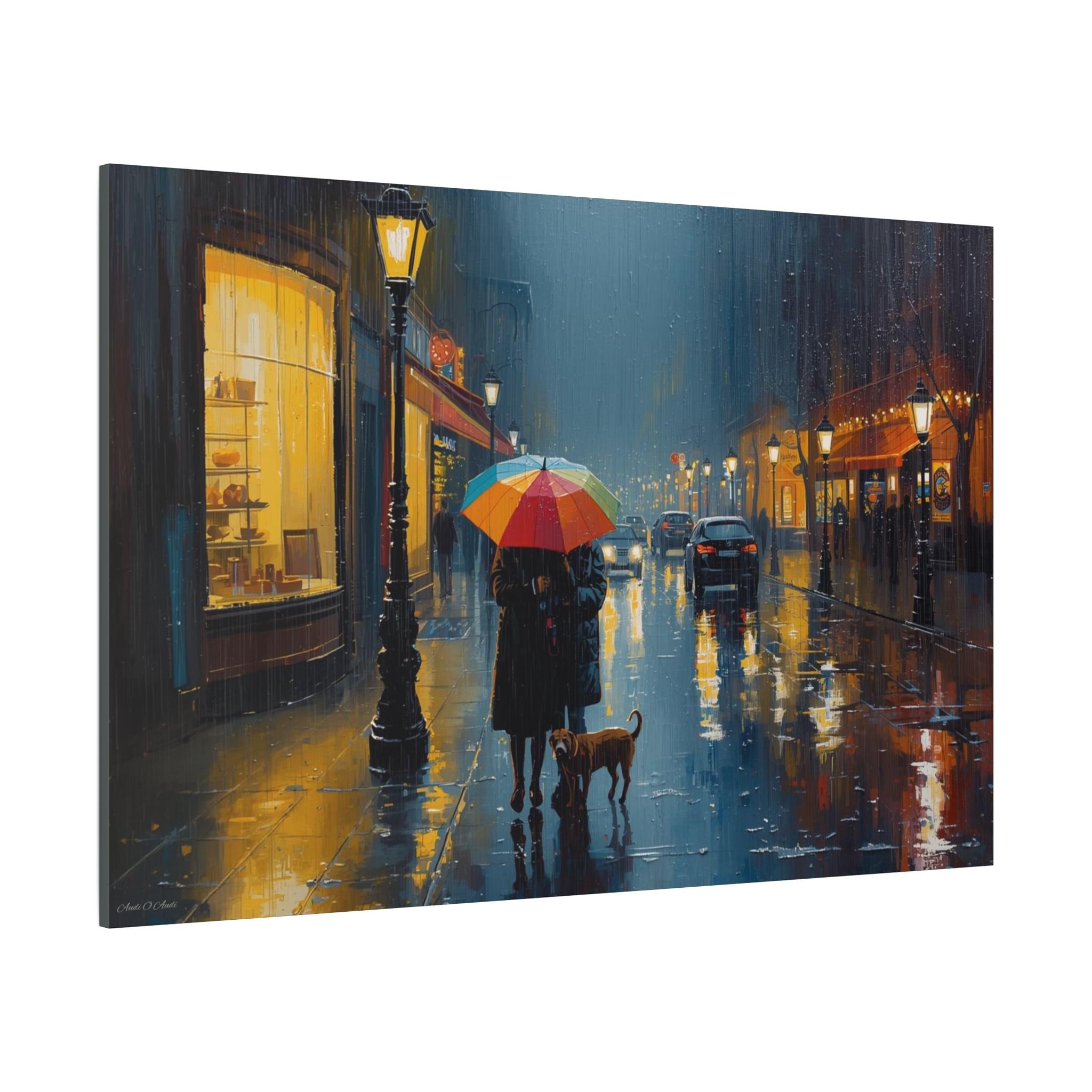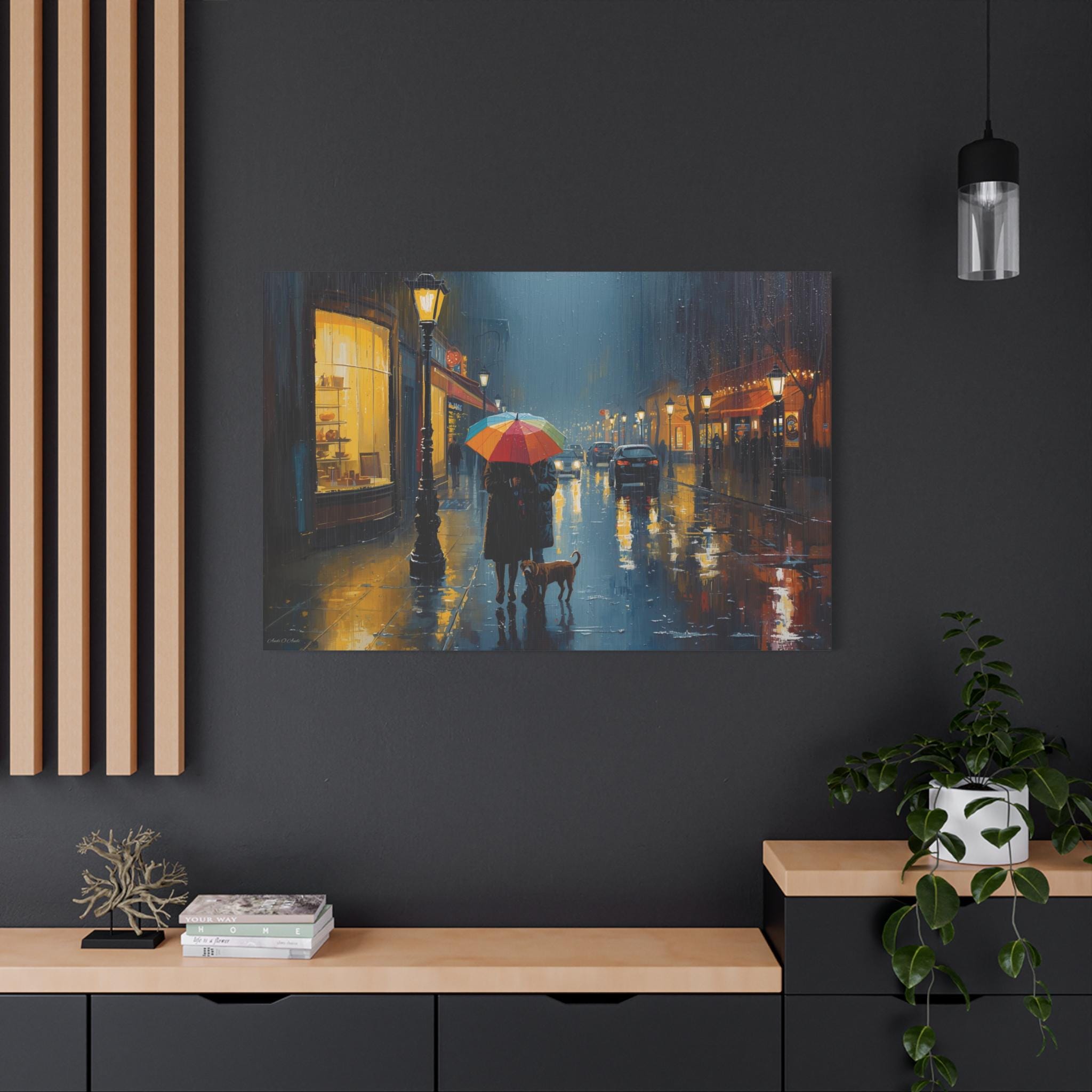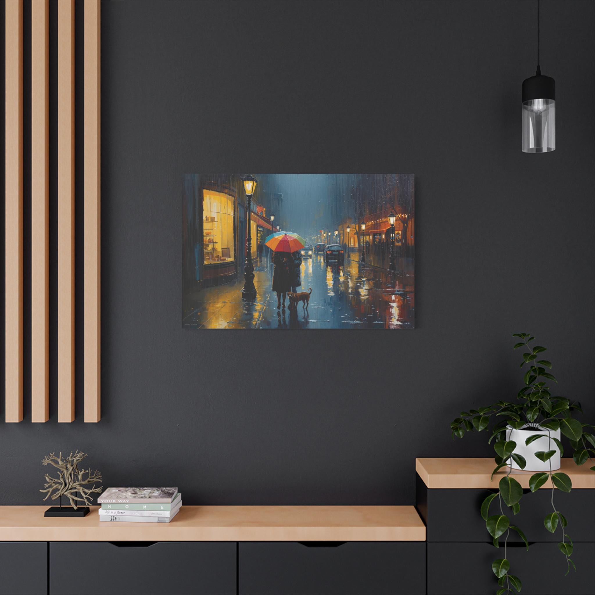The Urban Solace canvas art print is a romantic cityscape design that serves as beautiful wall decor. Perfect for art lovers, this artwork features a colorful umbrella print that creates a cozy and comforting atmosphere. Ideal for rainy days, this gift is relevant to those who appreciate art and want to add a touch of warmth to their living space. Suitable for holidays, birthdays, housewarmings, and any occasion where a thoughtful and unique gift is desired.
