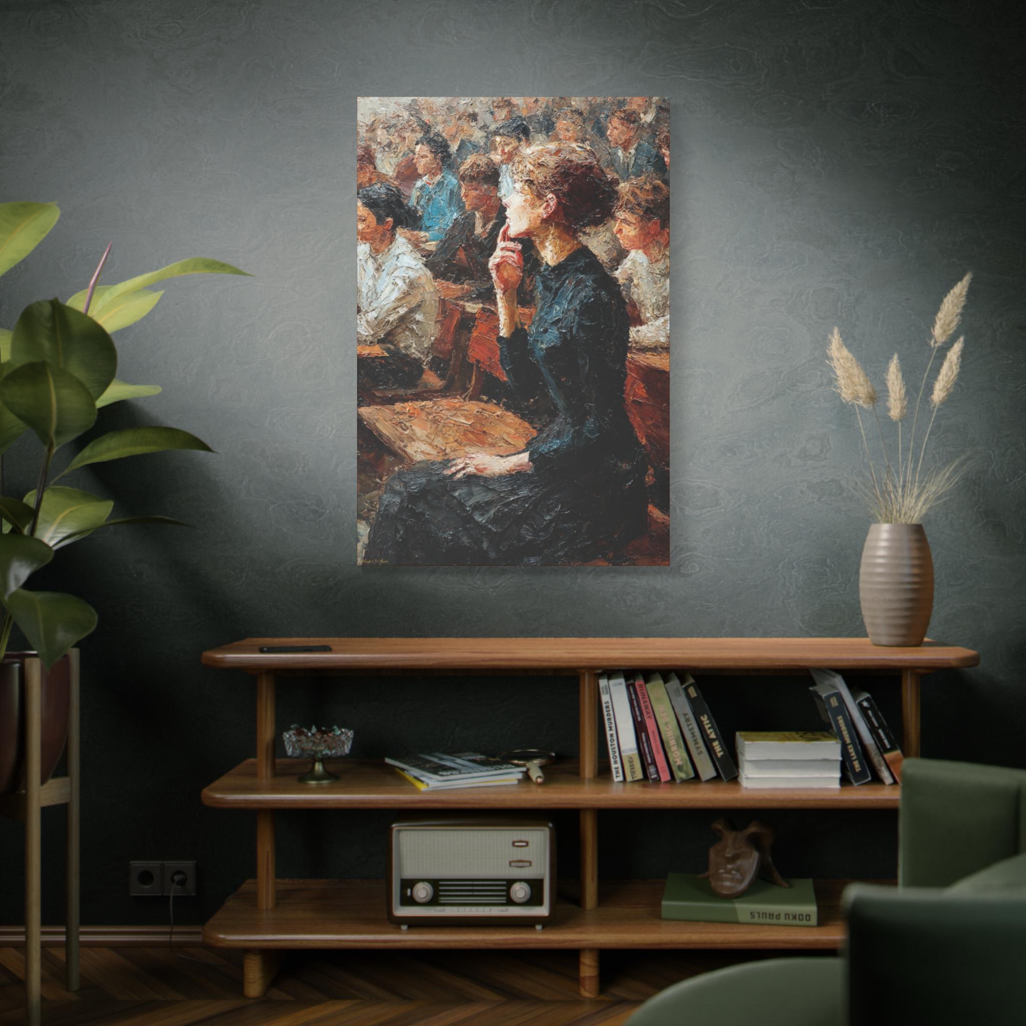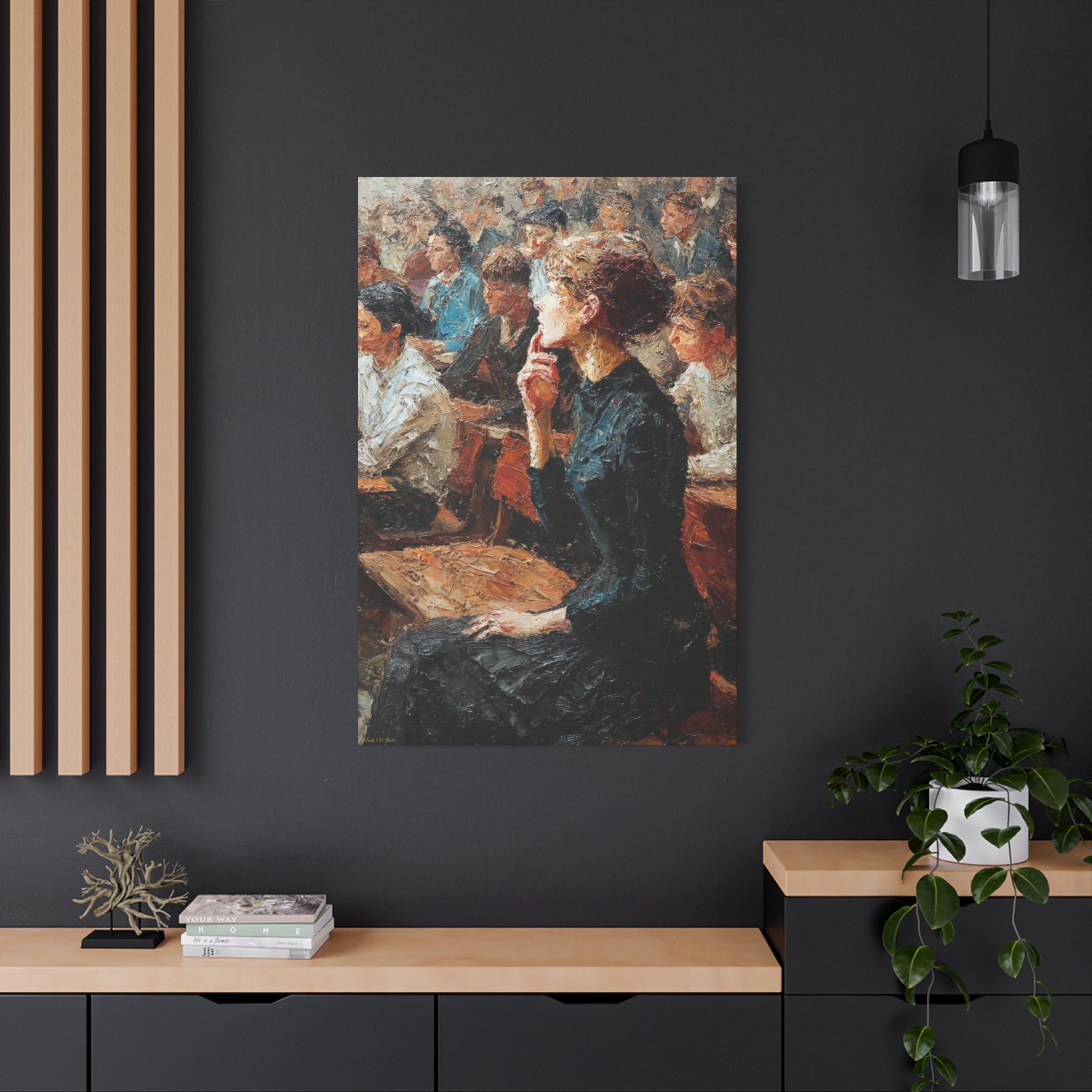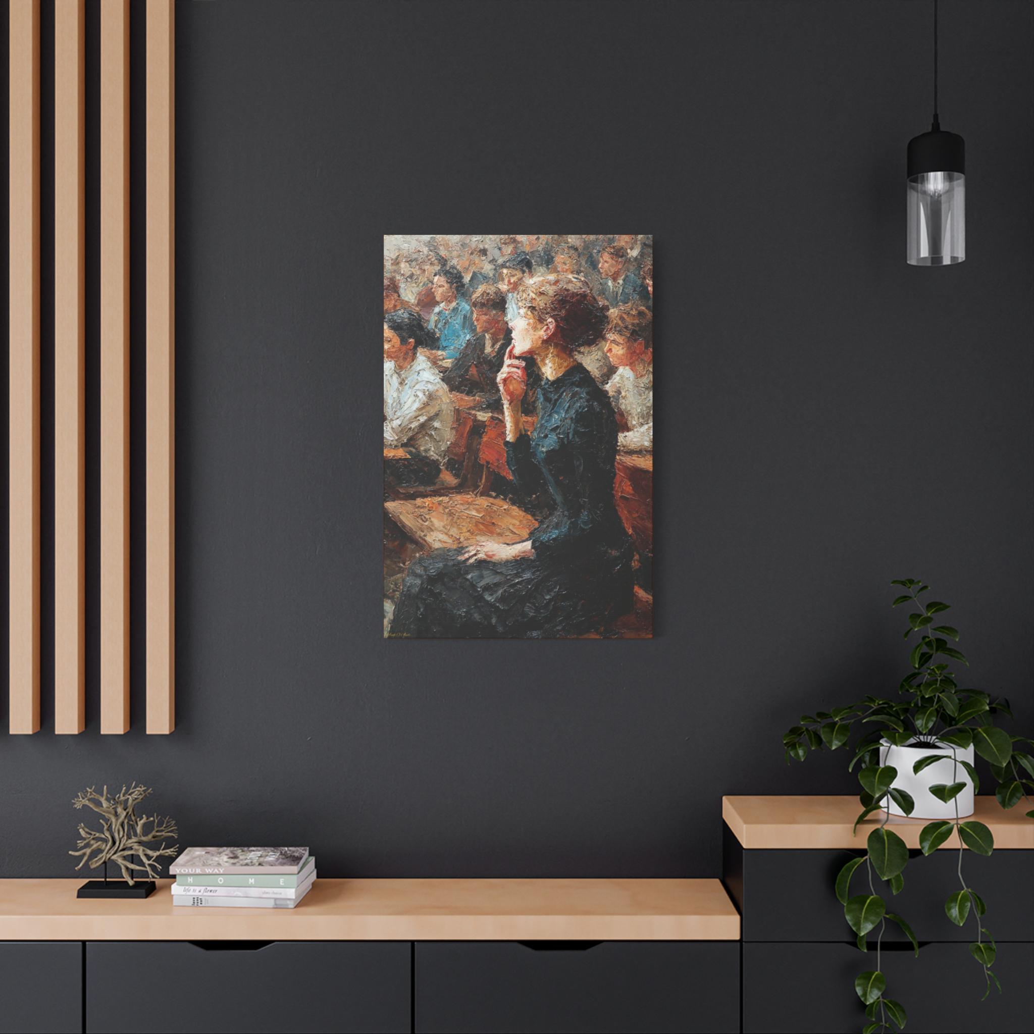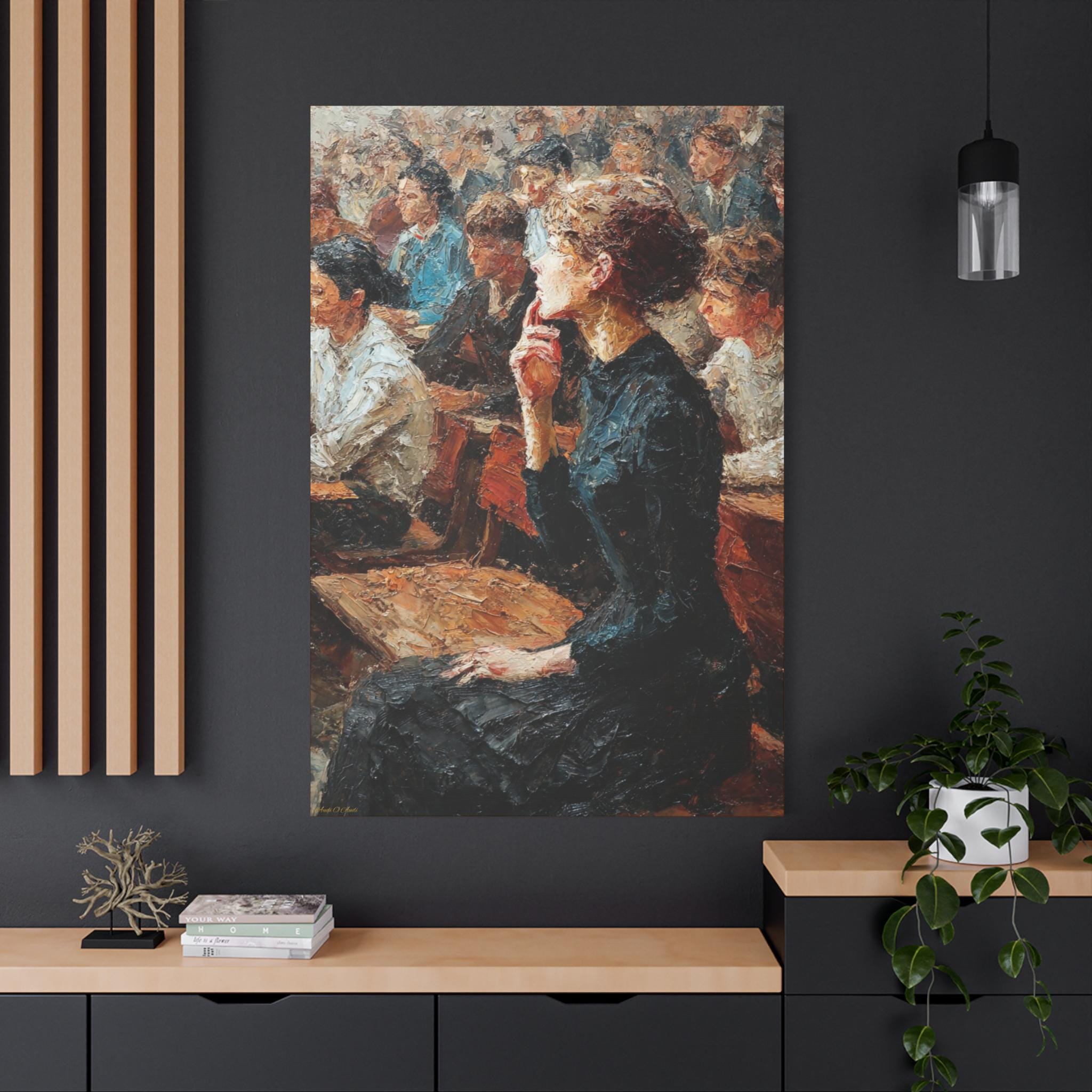 Lecture Light, Elegant Stretched Canvas Artwork - Thoughtful Woman in Class, Art Decor for Home, Office, or Gallery, Gift for Art Lovers.