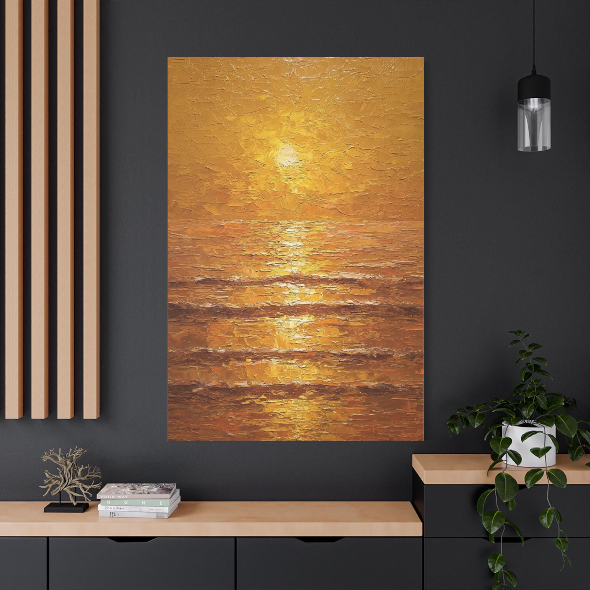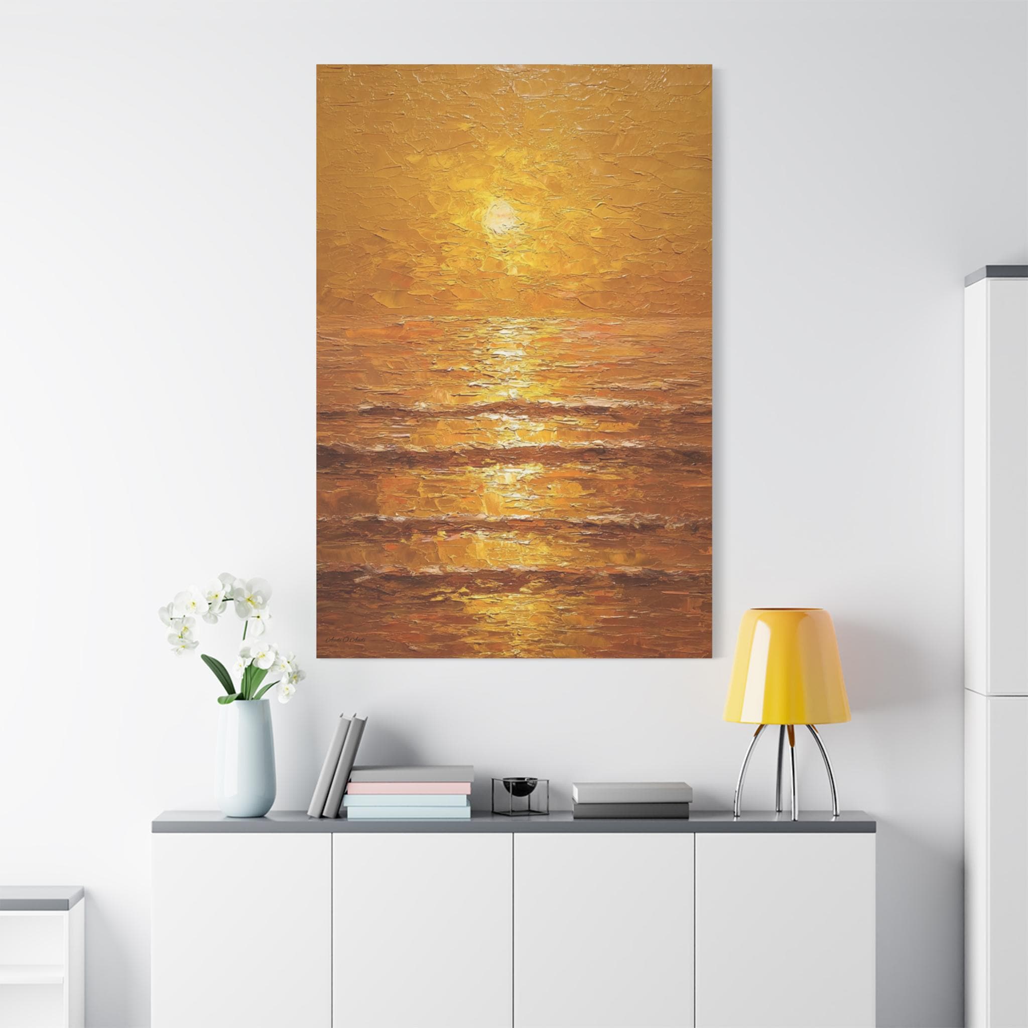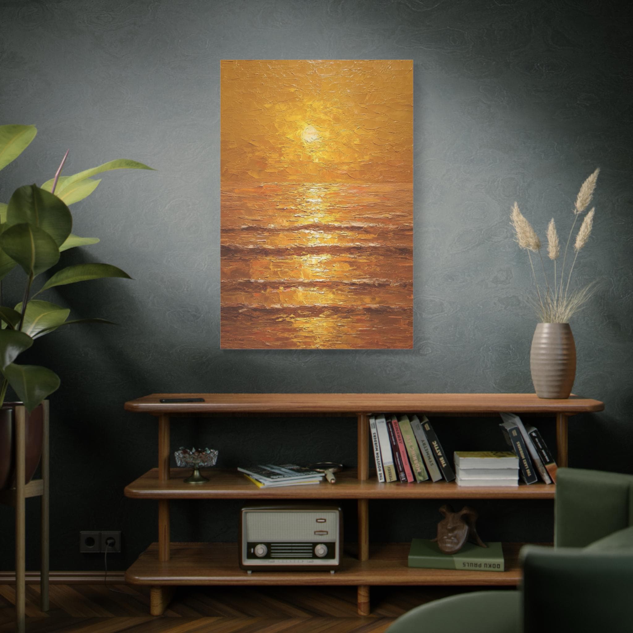Introduce a breathtaking statement piece with Amber Sea Rhapsody, a stunning, canvas print that captures the molten brilliance of a sea at sunset.