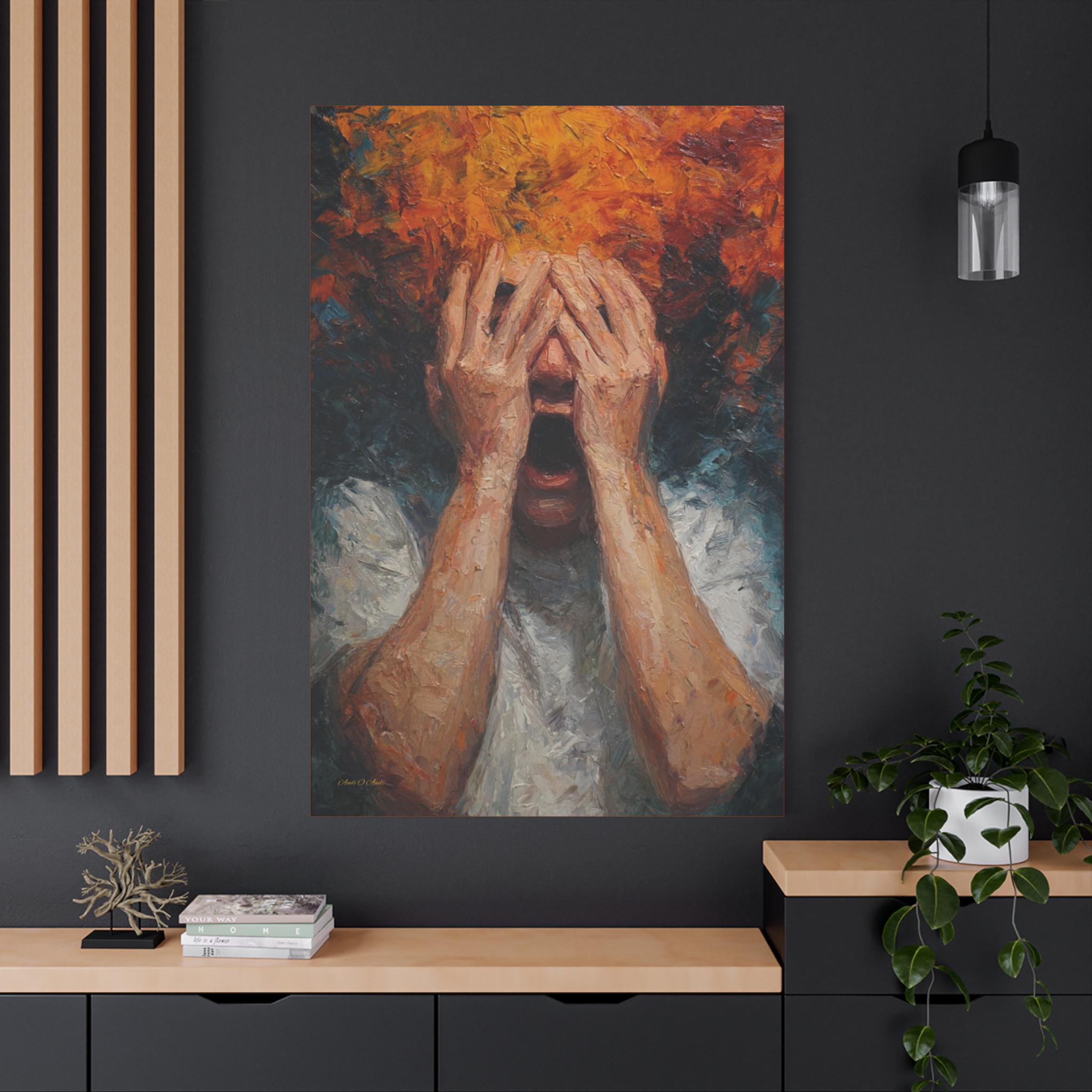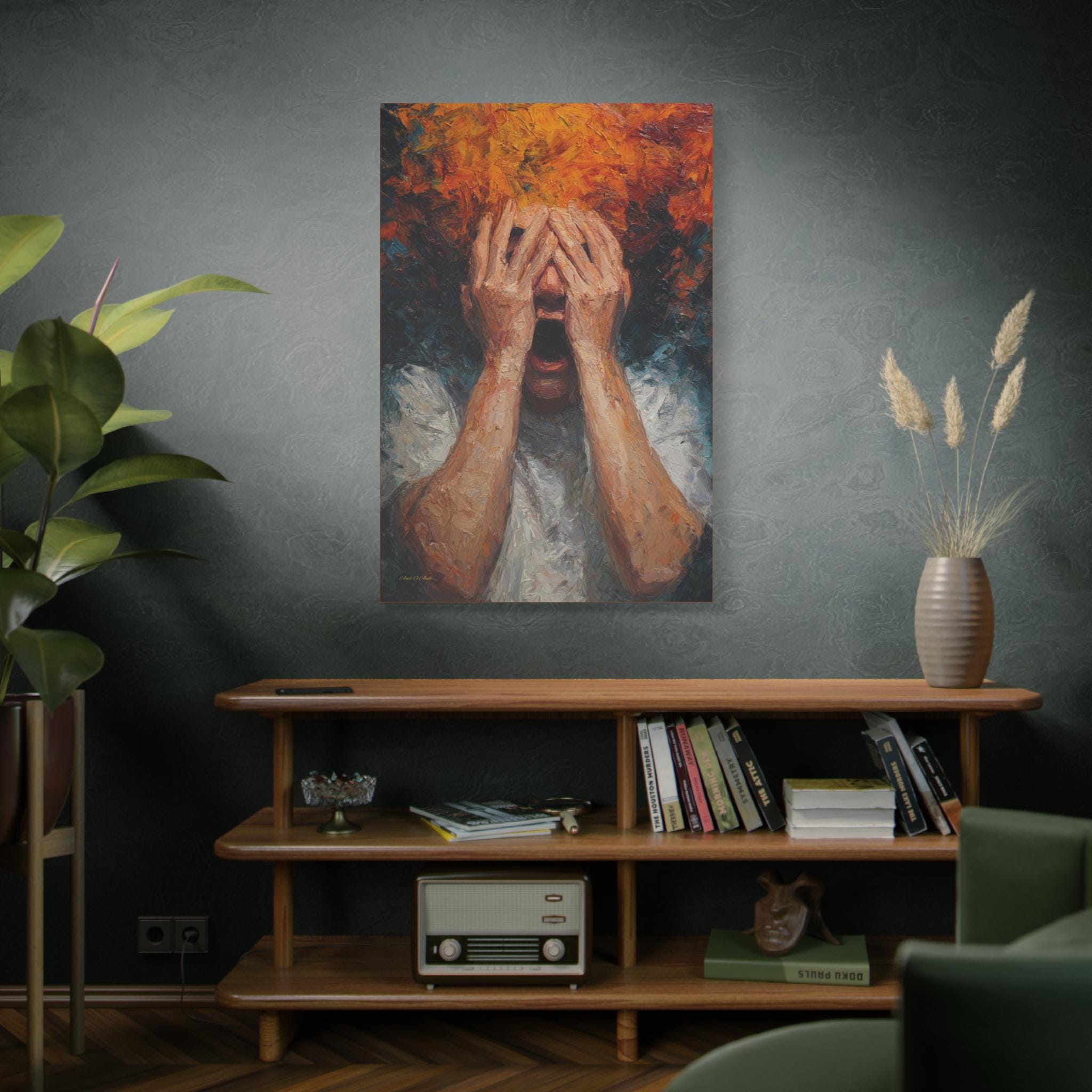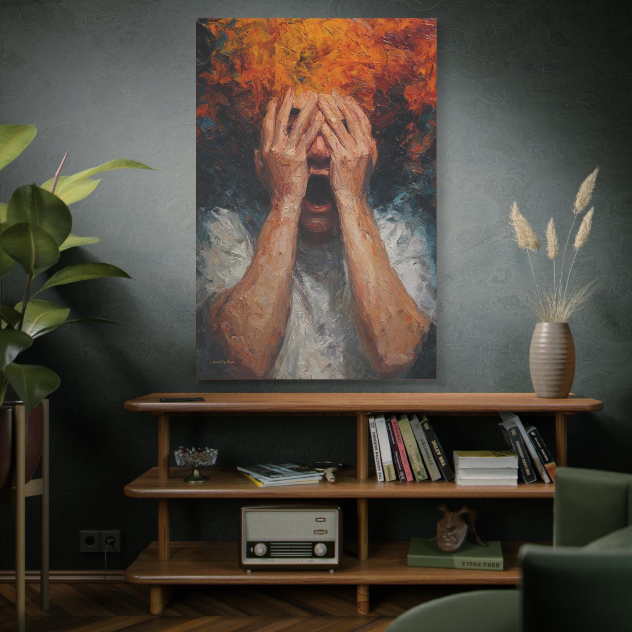 The composition centers on a figure consumed by an invisible force, their face partially obscured by outstretched, frenzied hands. The open mouth forms a silent scream, a universal symbol of anguish, fear, or profound release. Above the figure's head, the cool, desaturated blues of the body give way to an explosive crown of fiery oranges and reds, symbolizing a mind in turmoil, a flash of pain, or the volatile moment of a psychological breakdown.