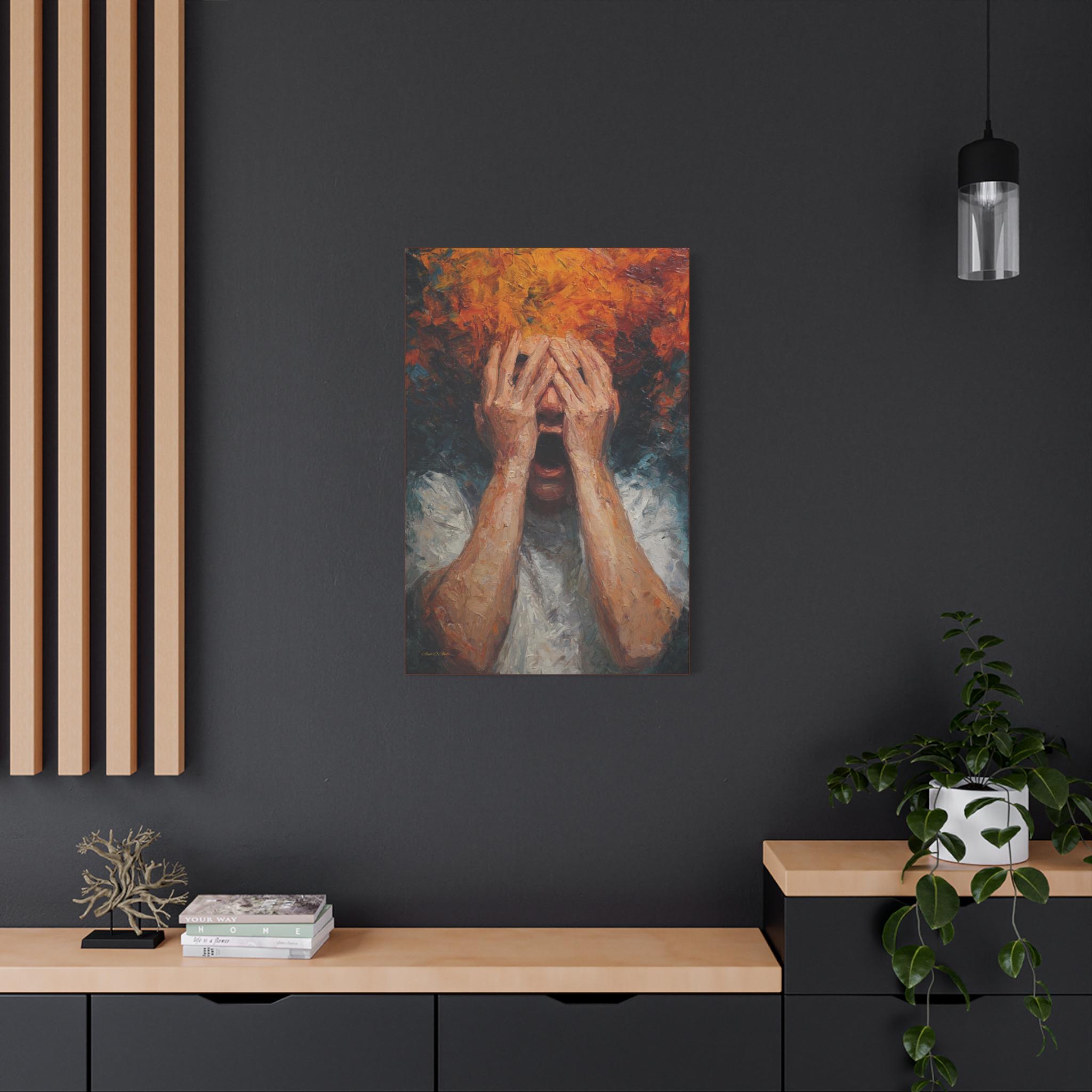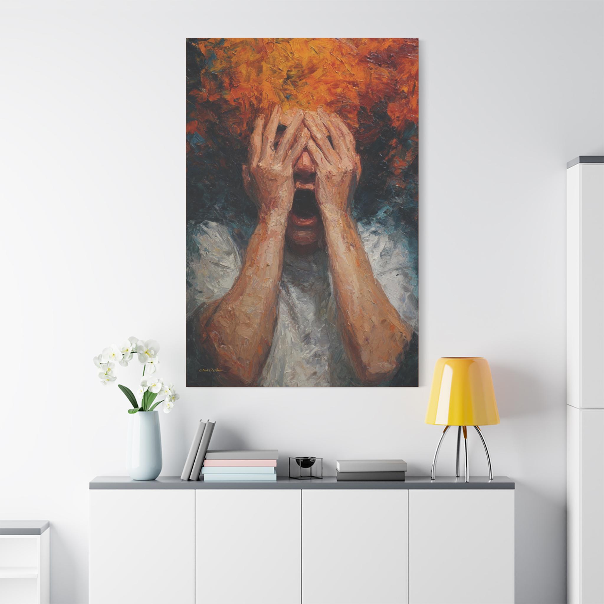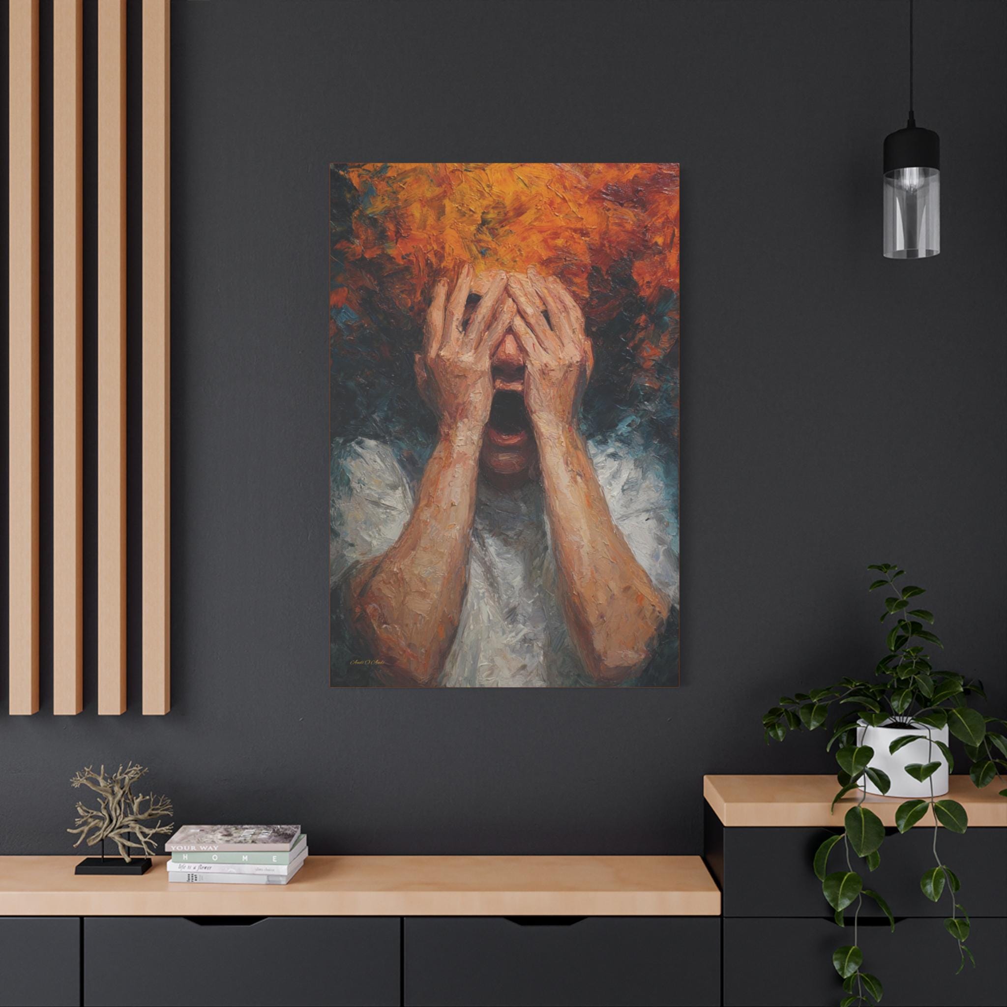 The composition centers on a figure consumed by an invisible force, their face partially obscured by outstretched, frenzied hands. The open mouth forms a silent scream, a universal symbol of anguish, fear, or profound release. Above the figure's head, the cool, desaturated blues of the body give way to an explosive crown of fiery oranges and reds, symbolizing a mind in turmoil, a flash of pain, or the volatile moment of a psychological breakdown.