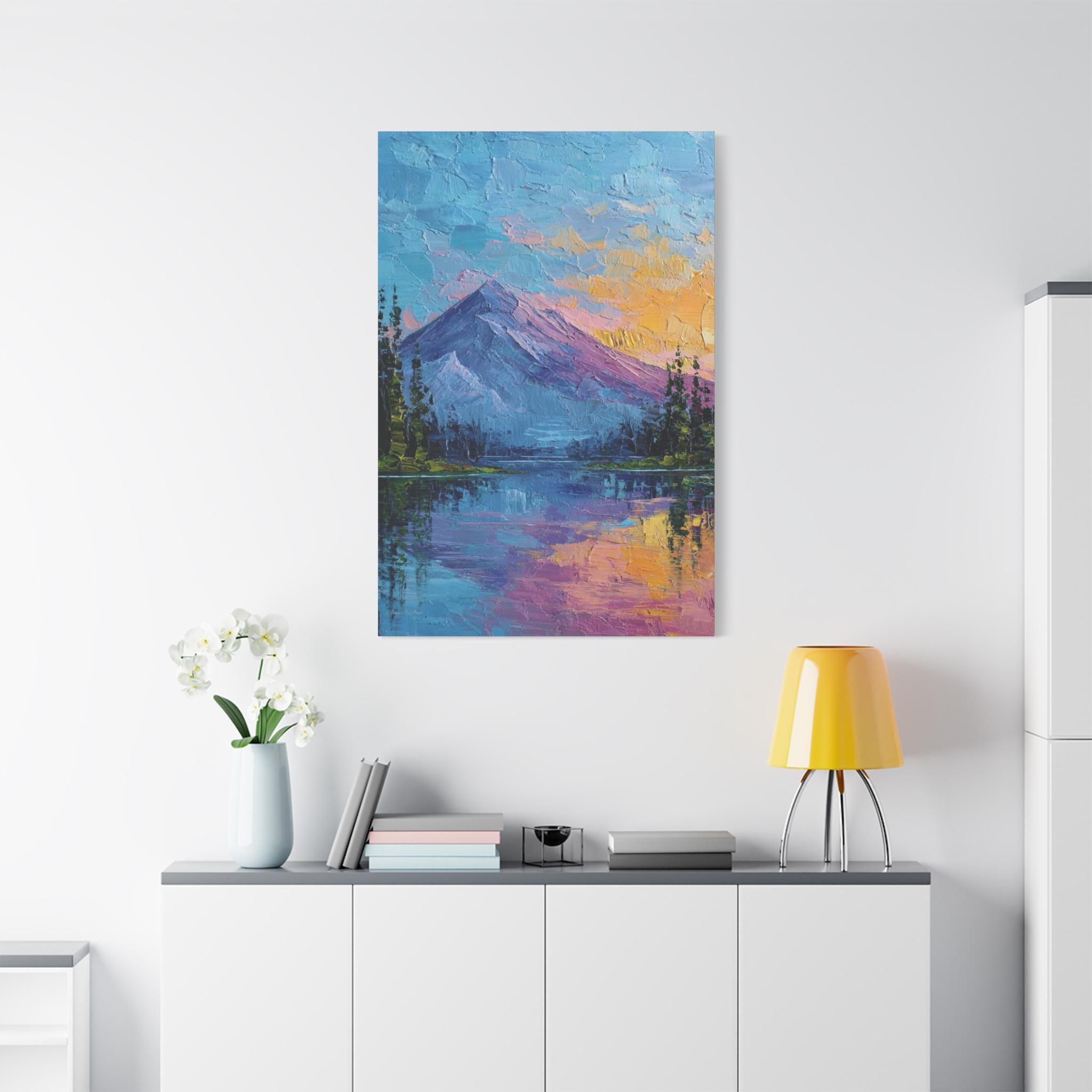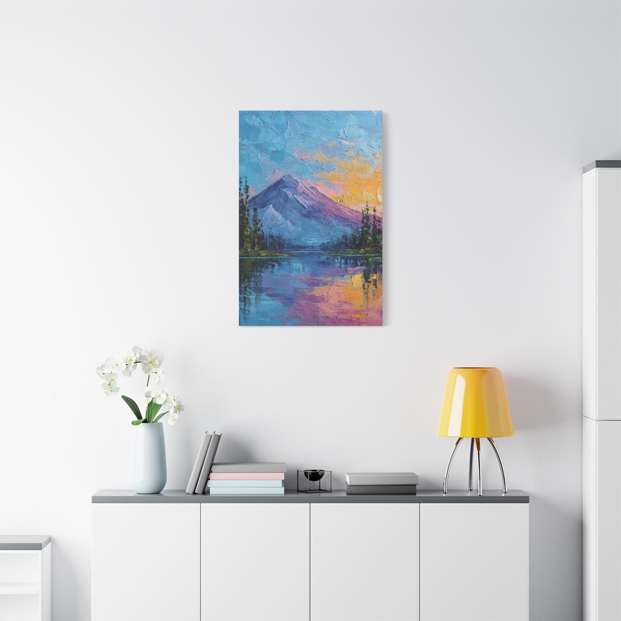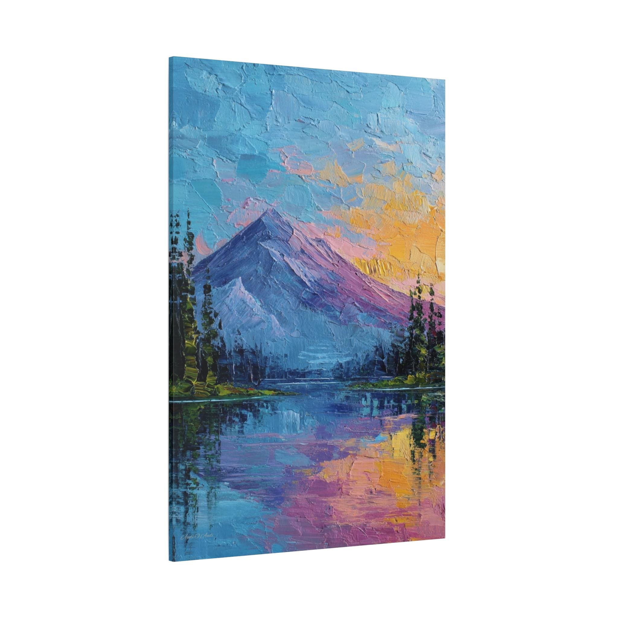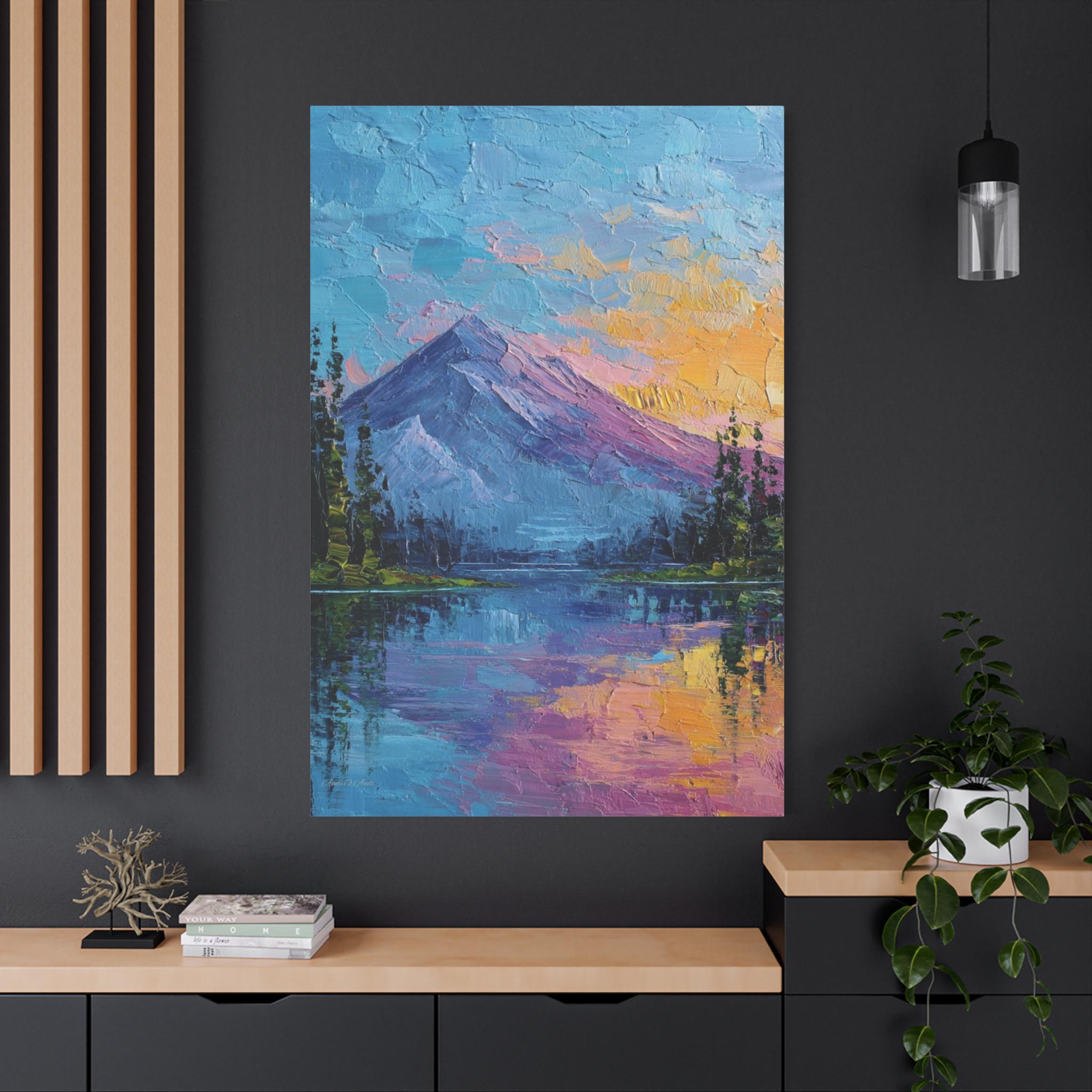 This is a canvas print of an Expressive or Contemporary Impasto Oil Painting, depicting a striking mountain and lake landscape during either dawn or dusk.
