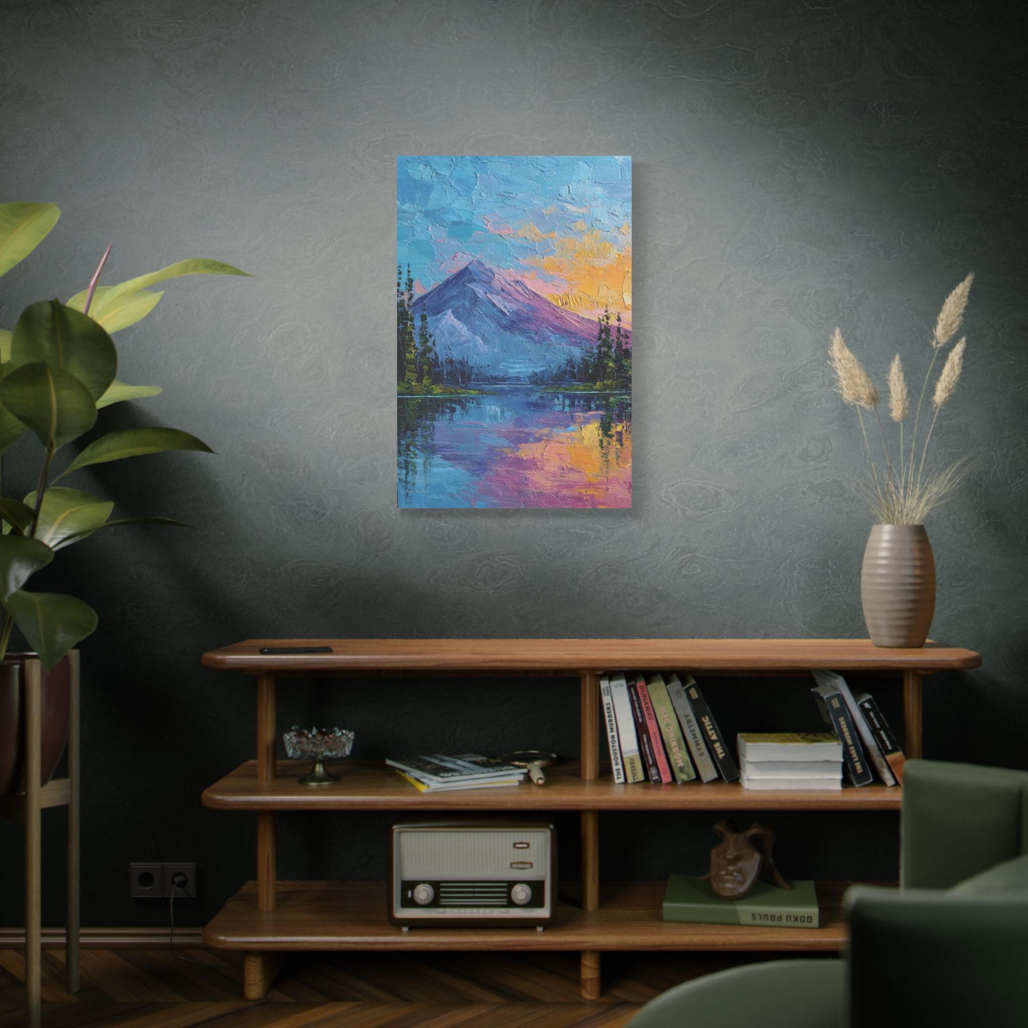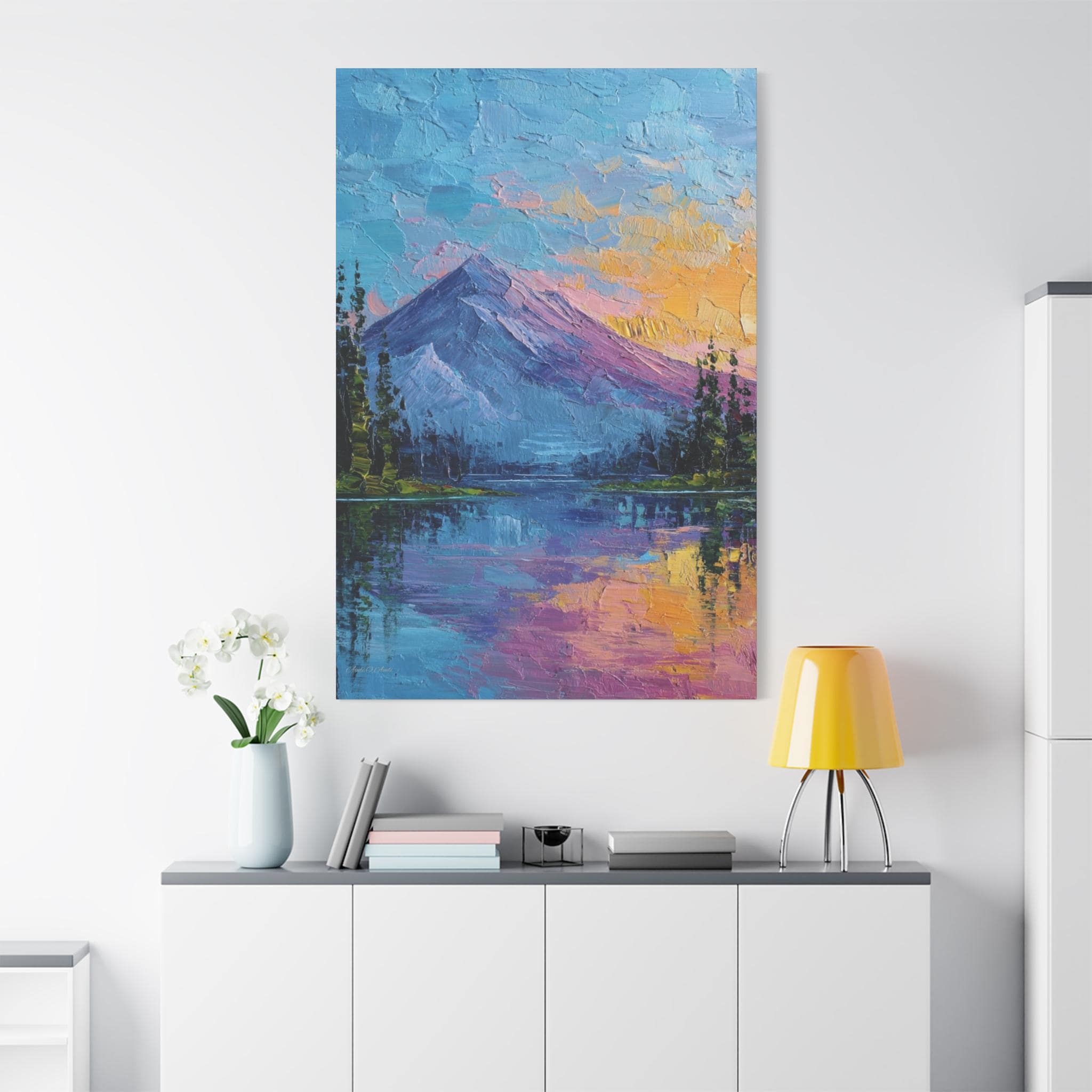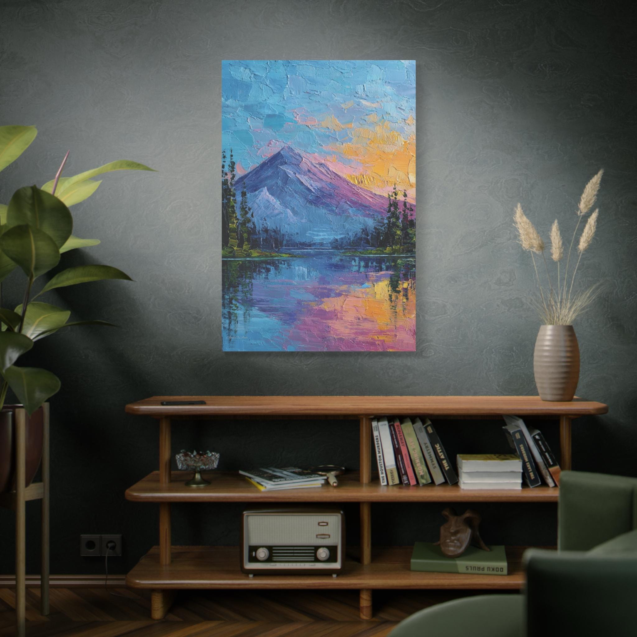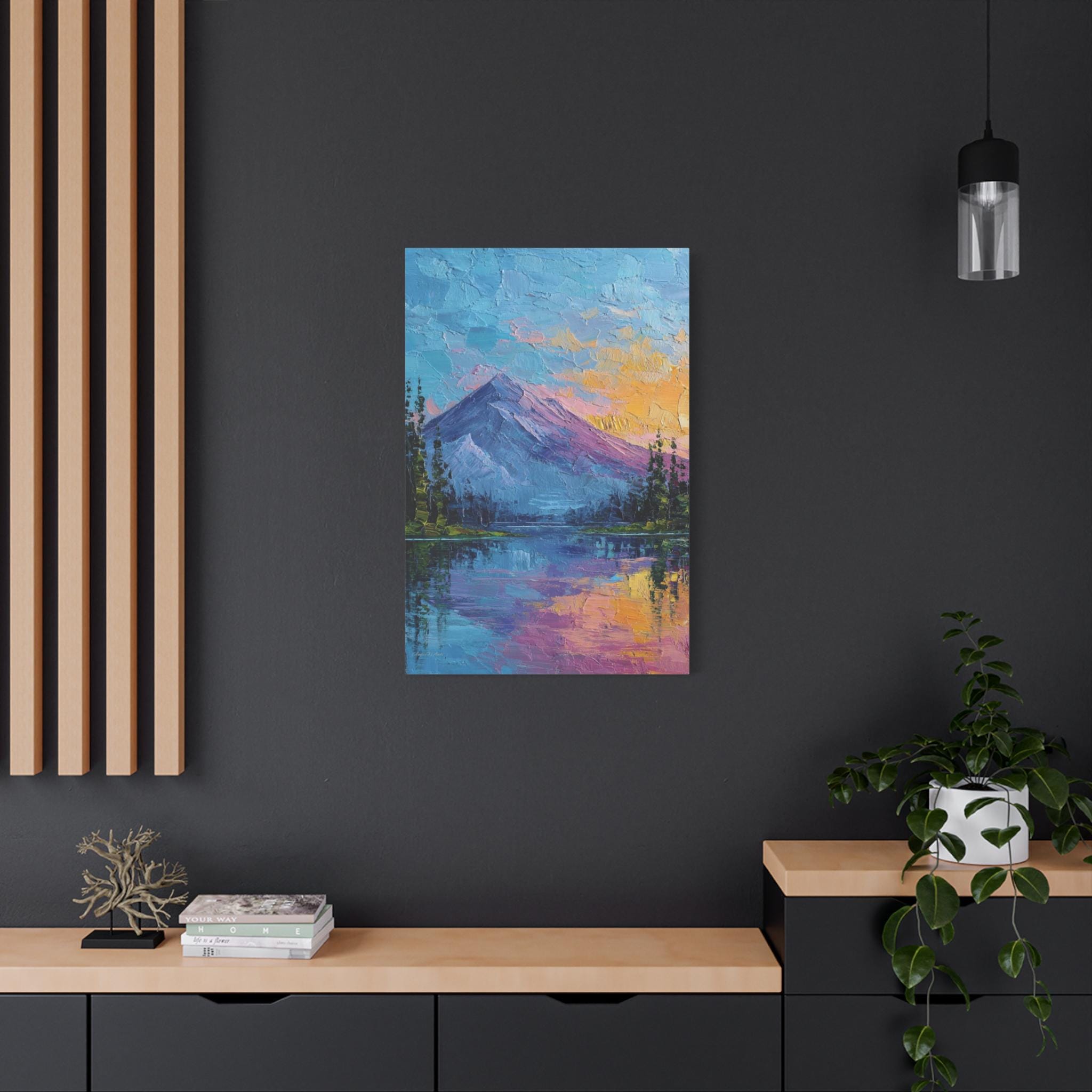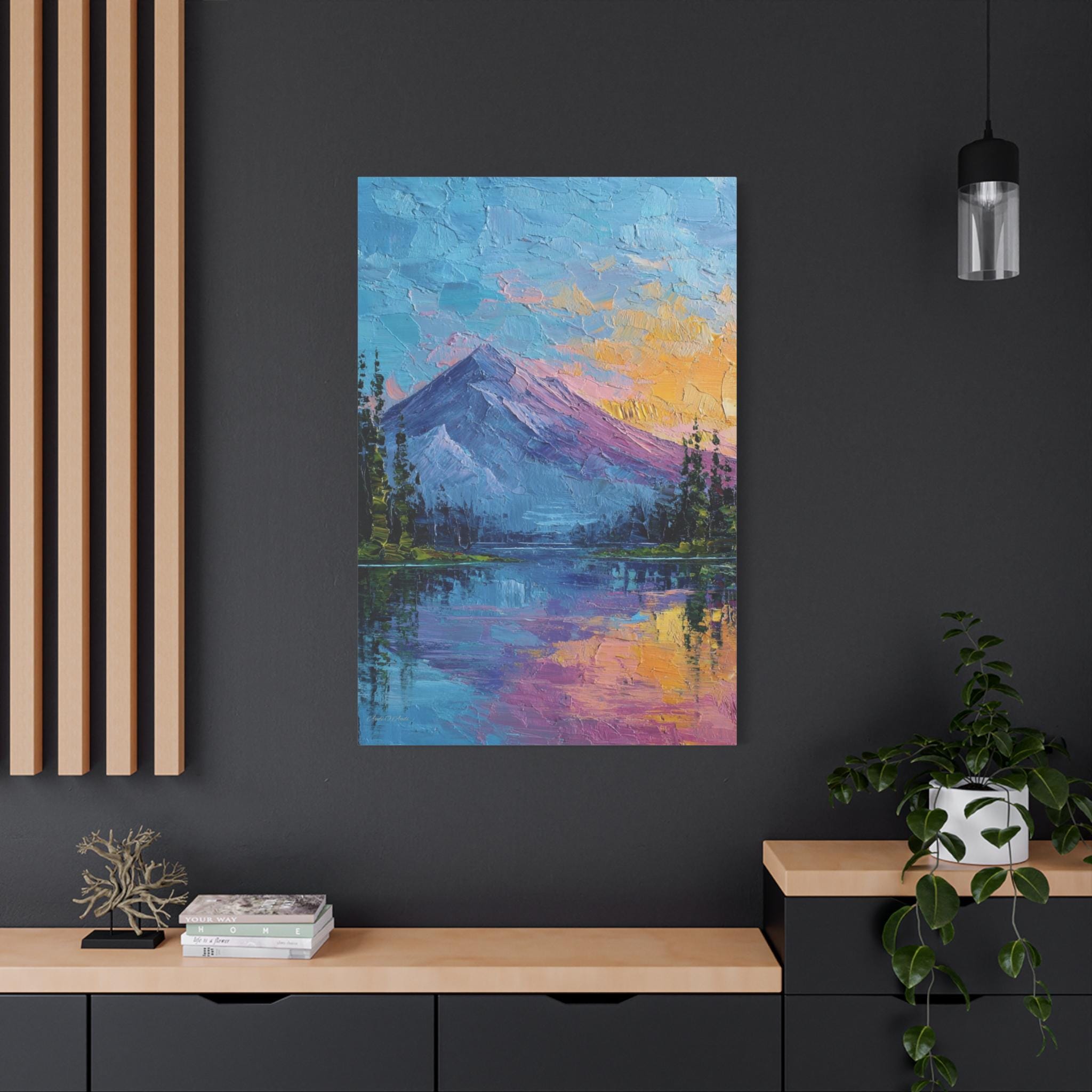 This is a canvas print of an Expressive or Contemporary Impasto Oil Painting, depicting a striking mountain and lake landscape during either dawn or dusk.