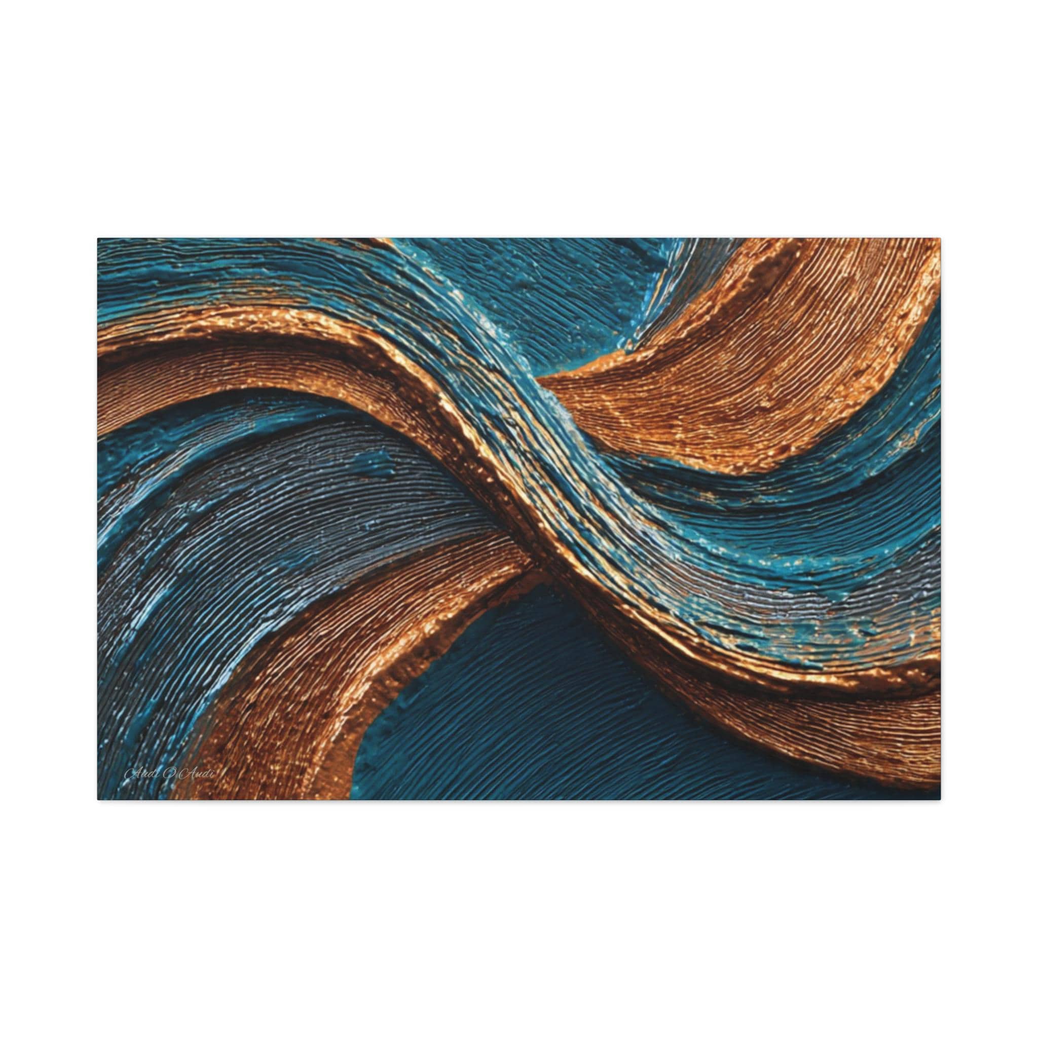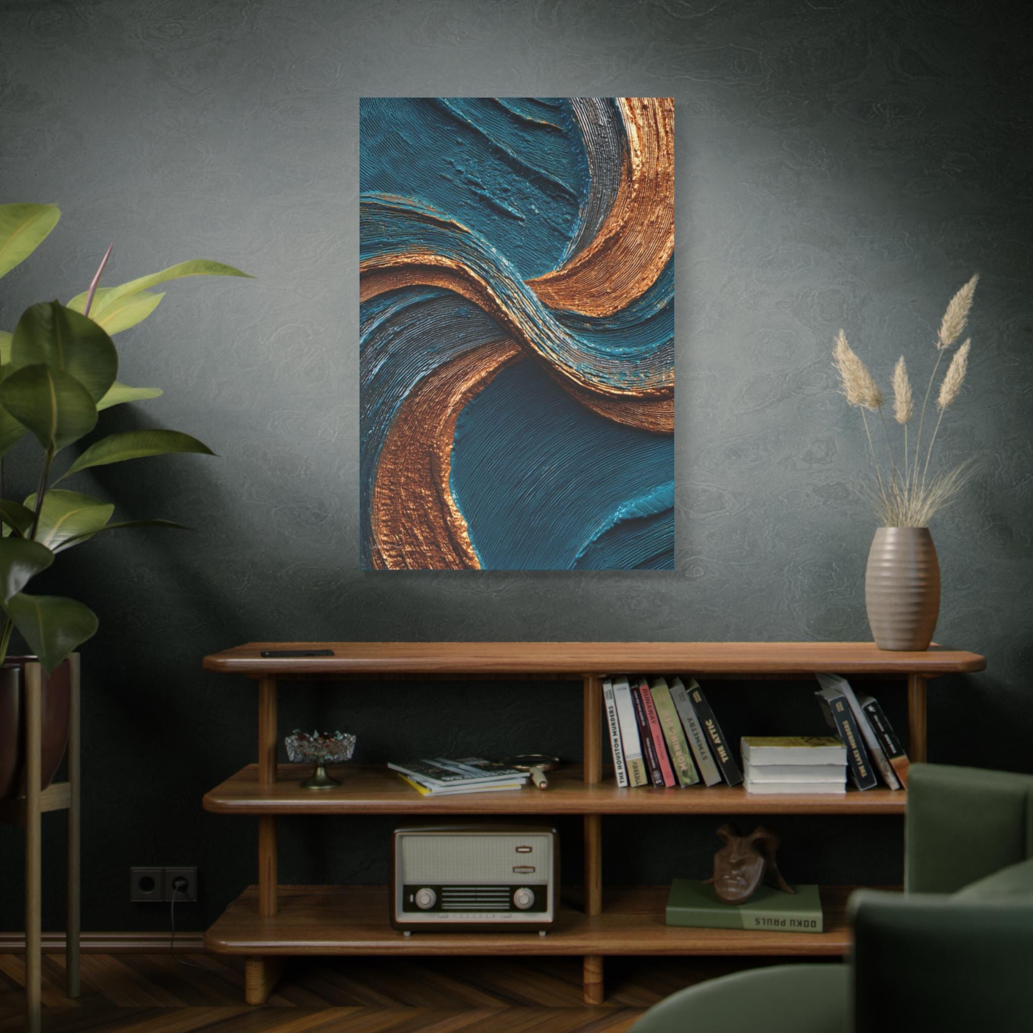 Contrast: The brilliance of the piece lies in the juxtaposition of textures and sheens: the rough, deeply grooved surface versus the smooth edge of a wave, and the matte quality of the teal against the high shine of the metallic copper.