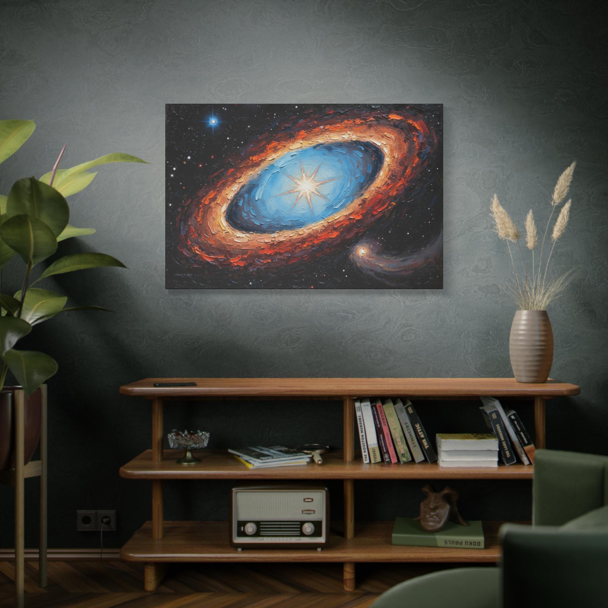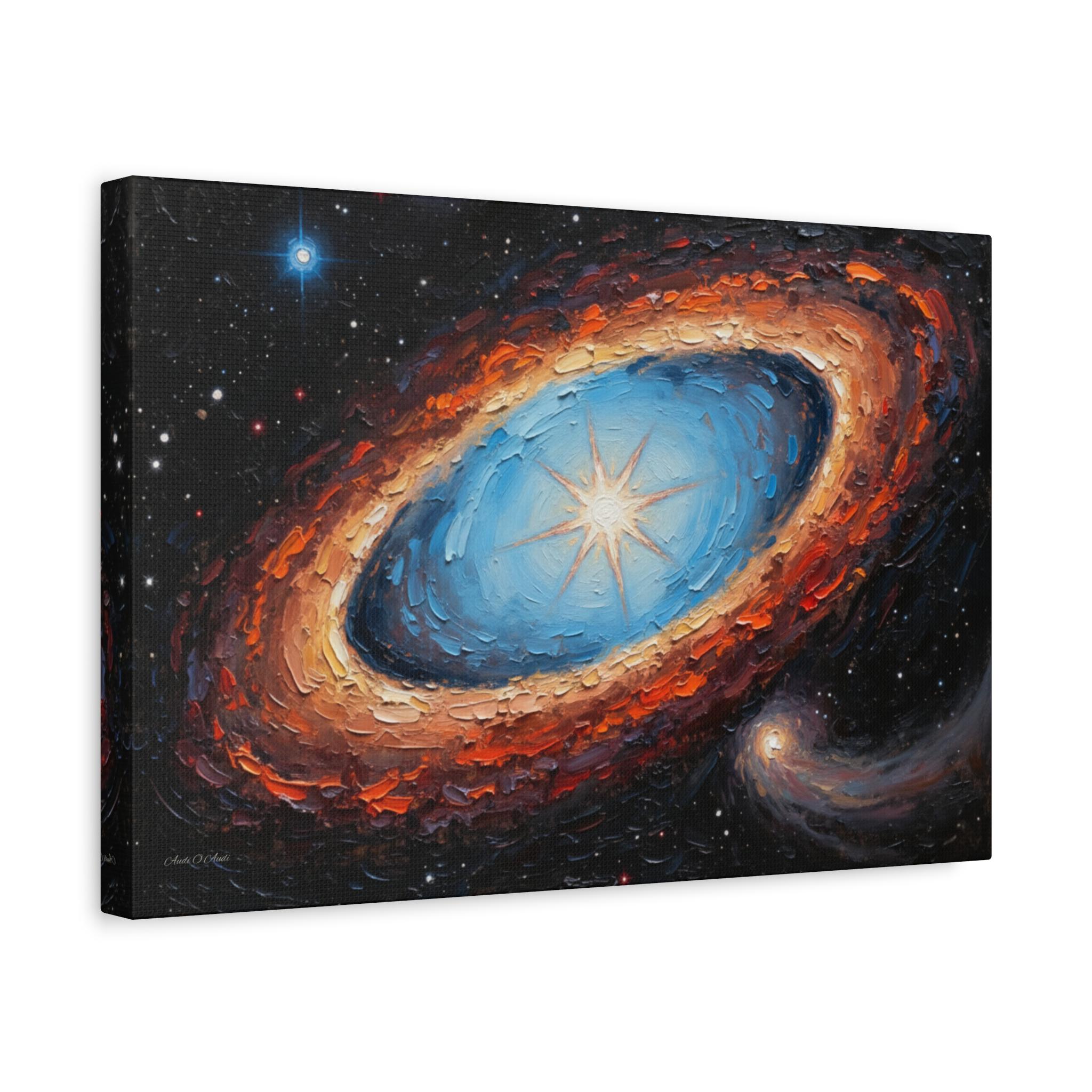 Cosmic Genesis" is an extraordinary Canvas print that captures the profound and dynamic beauty of the universe with a remarkable tactile quality. The artist employs a masterful impasto technique, where thick, sculpted layers of paint not only convey the raw energy of celestial phenomena but also invite the viewer into the textural landscape of creation.