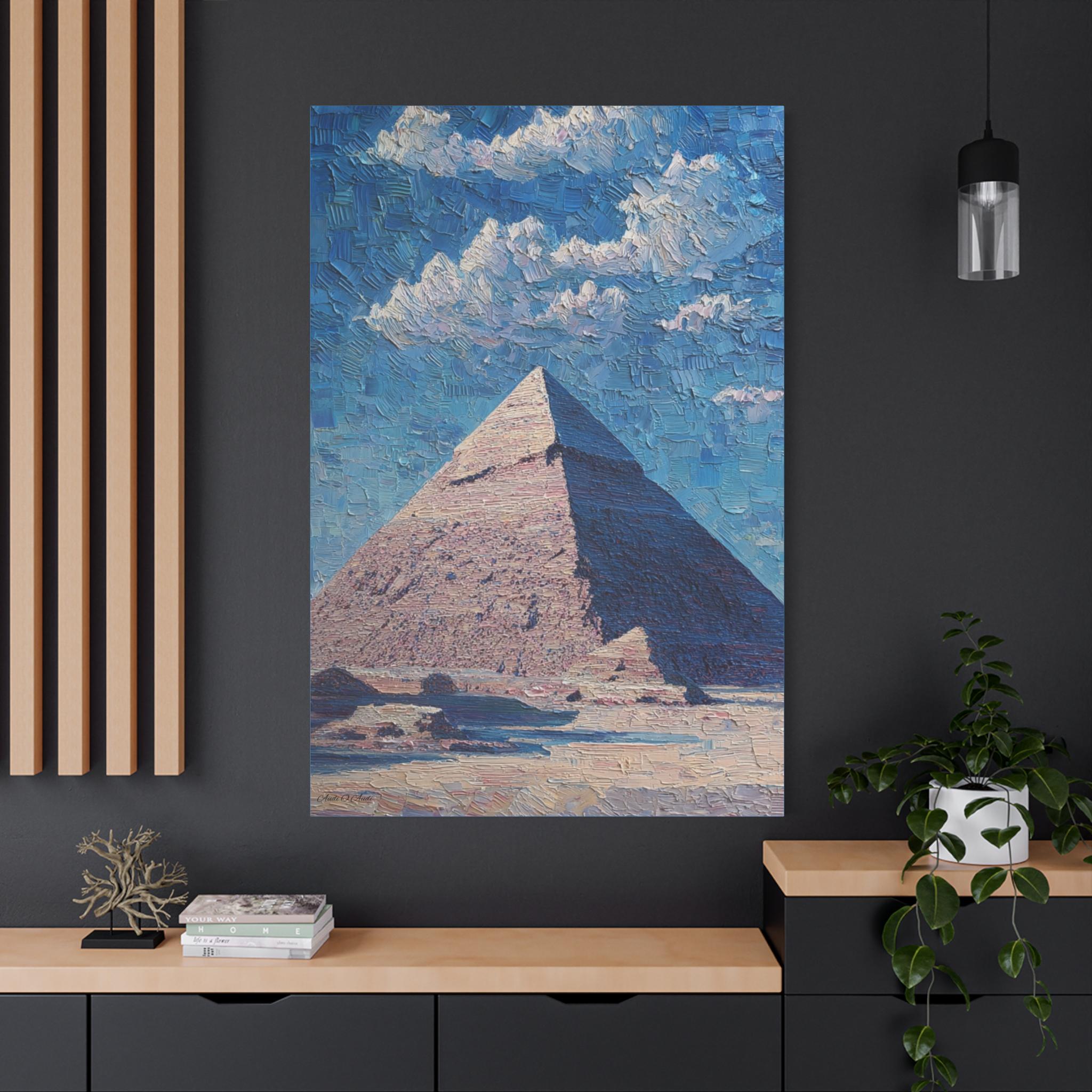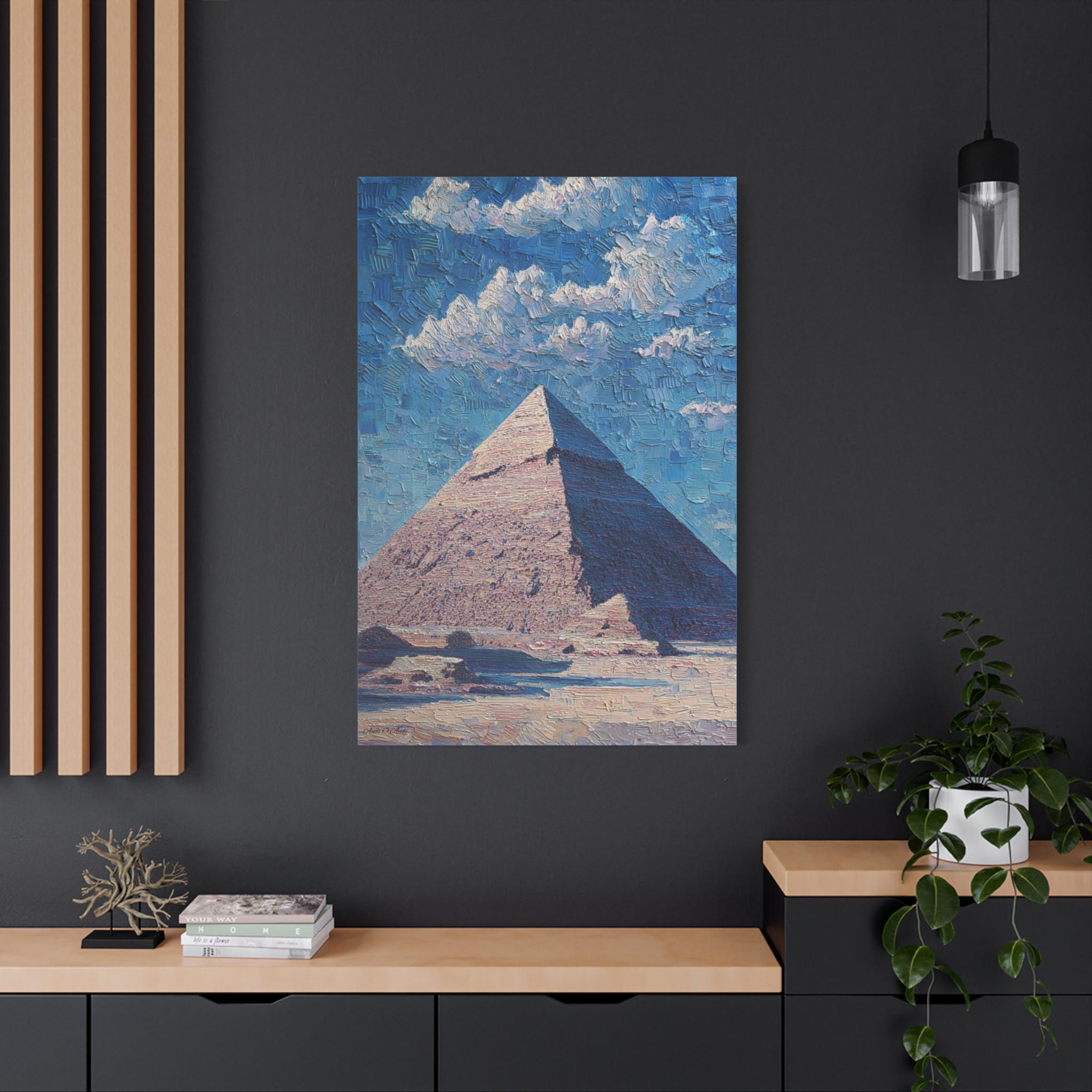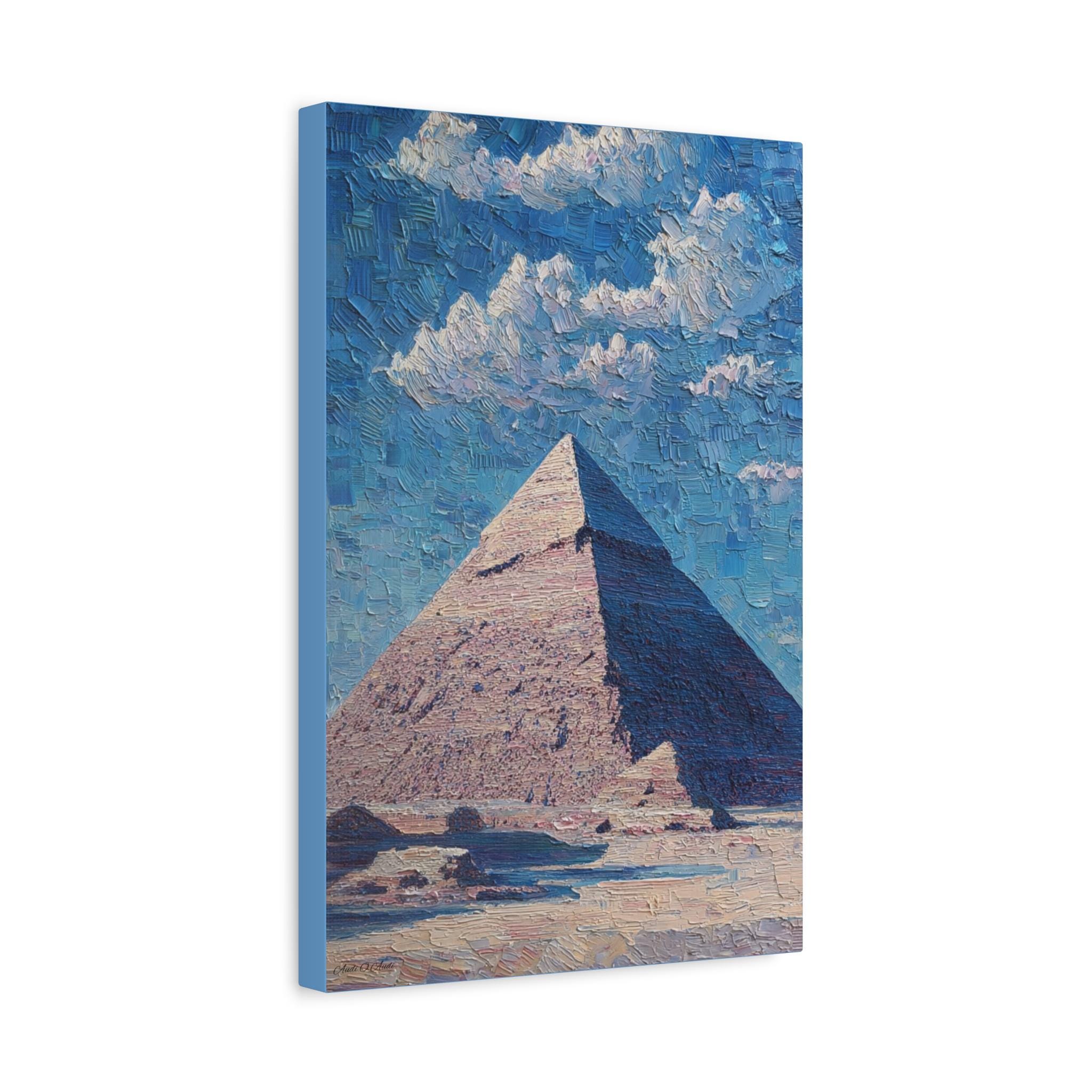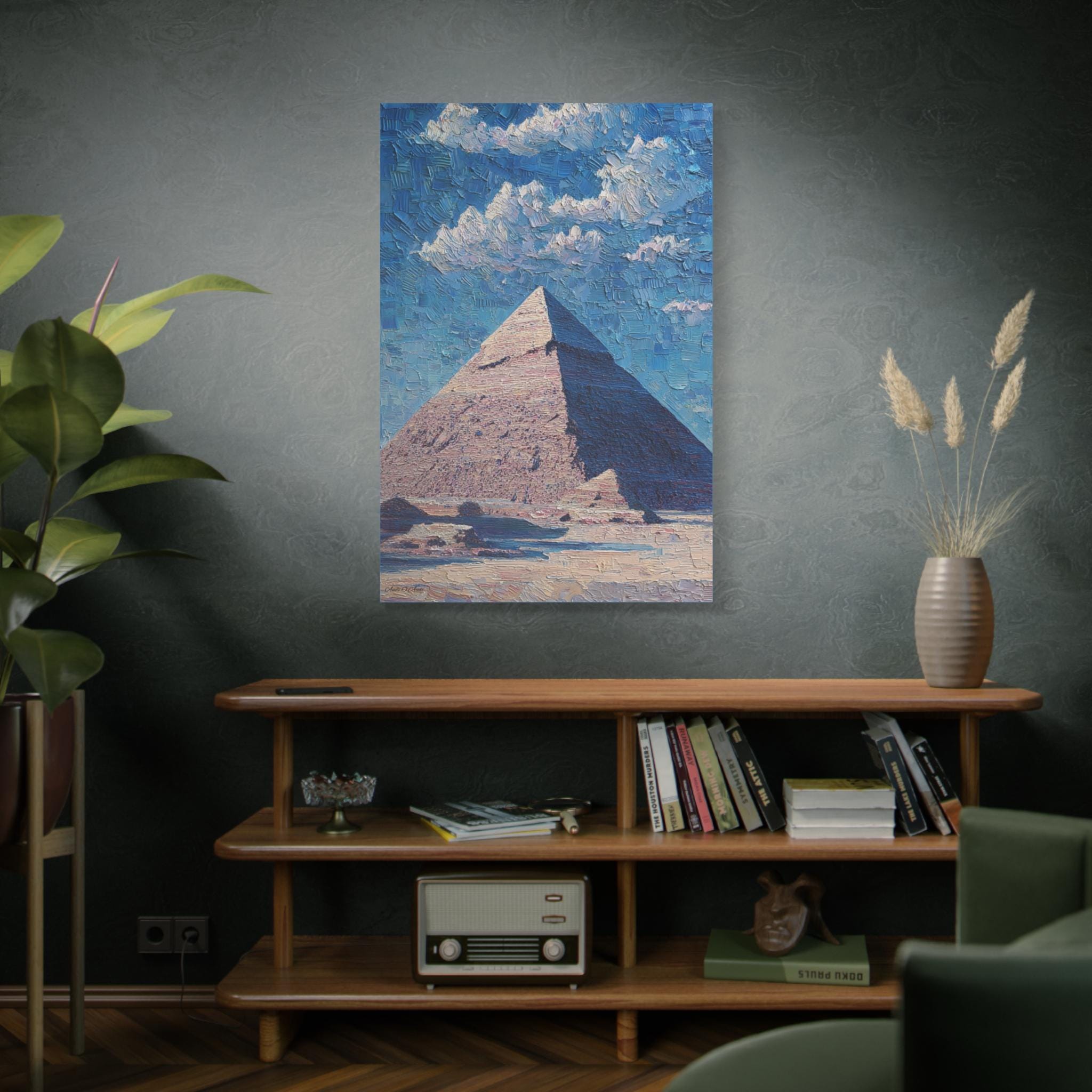 s a dramatically composed vertical Print canvas that uses a rigorous heavy impasto technique to give the ancient structure and its environment an arresting, textured presence. The subject, a monumental Egyptian pyramid, is presented with a unique vitality achieved through the sheer volume and direction of the paint.