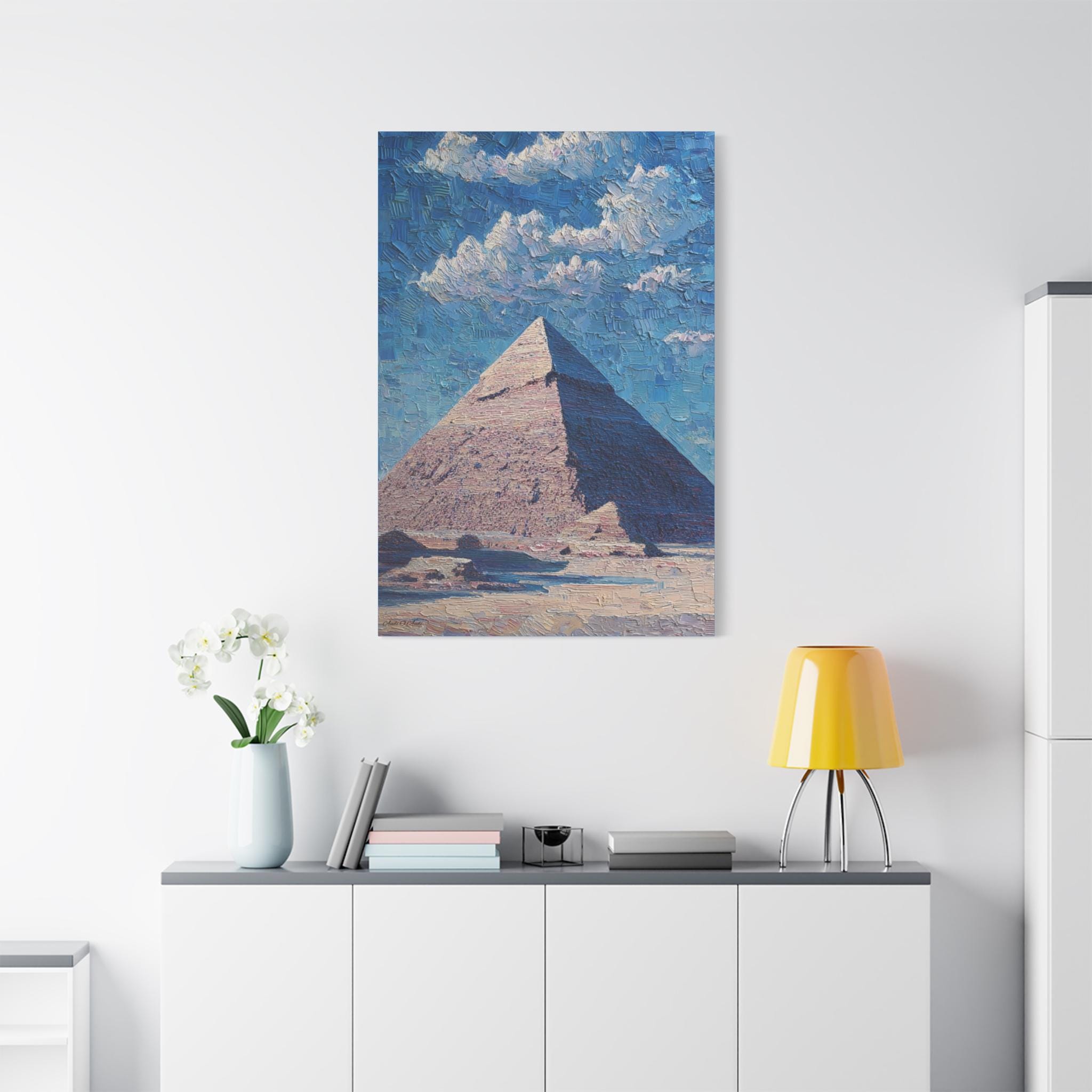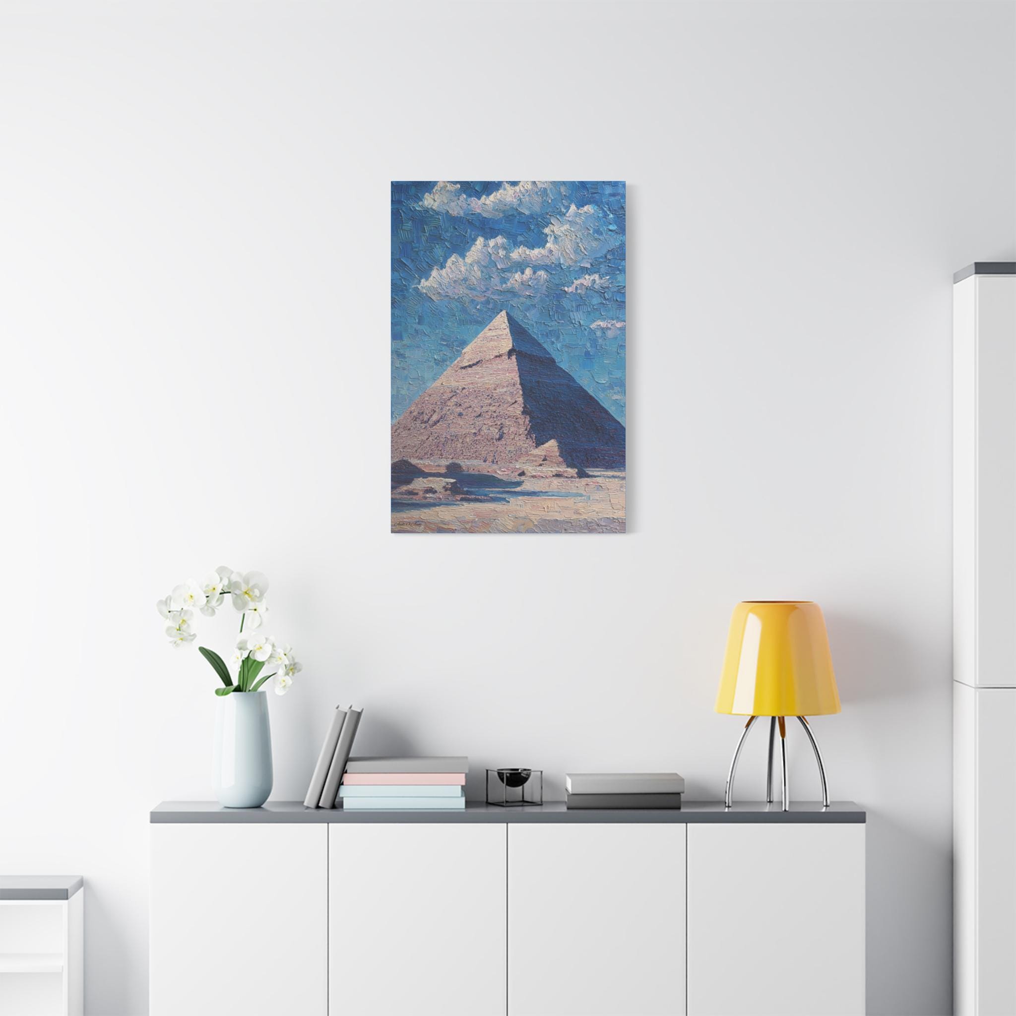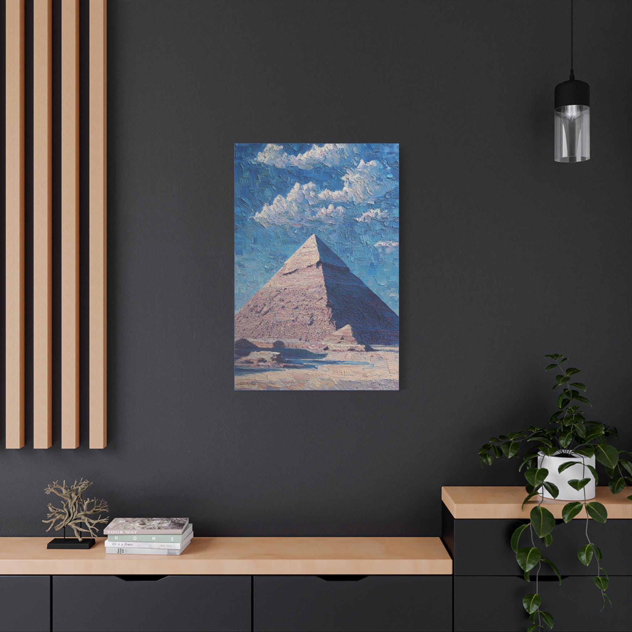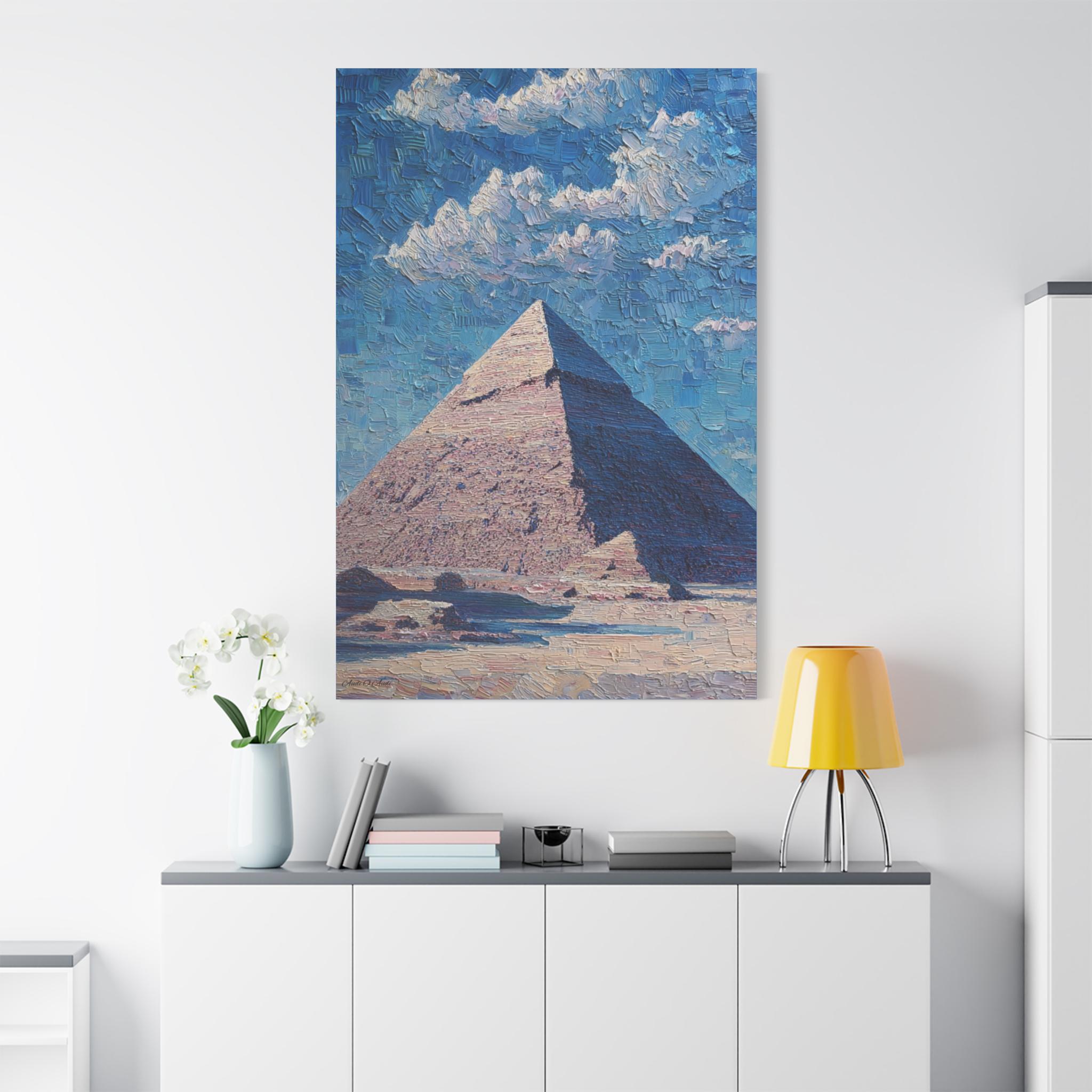 s a dramatically composed vertical Print canvas that uses a rigorous heavy impasto technique to give the ancient structure and its environment an arresting, textured presence. The subject, a monumental Egyptian pyramid, is presented with a unique vitality achieved through the sheer volume and direction of the paint.