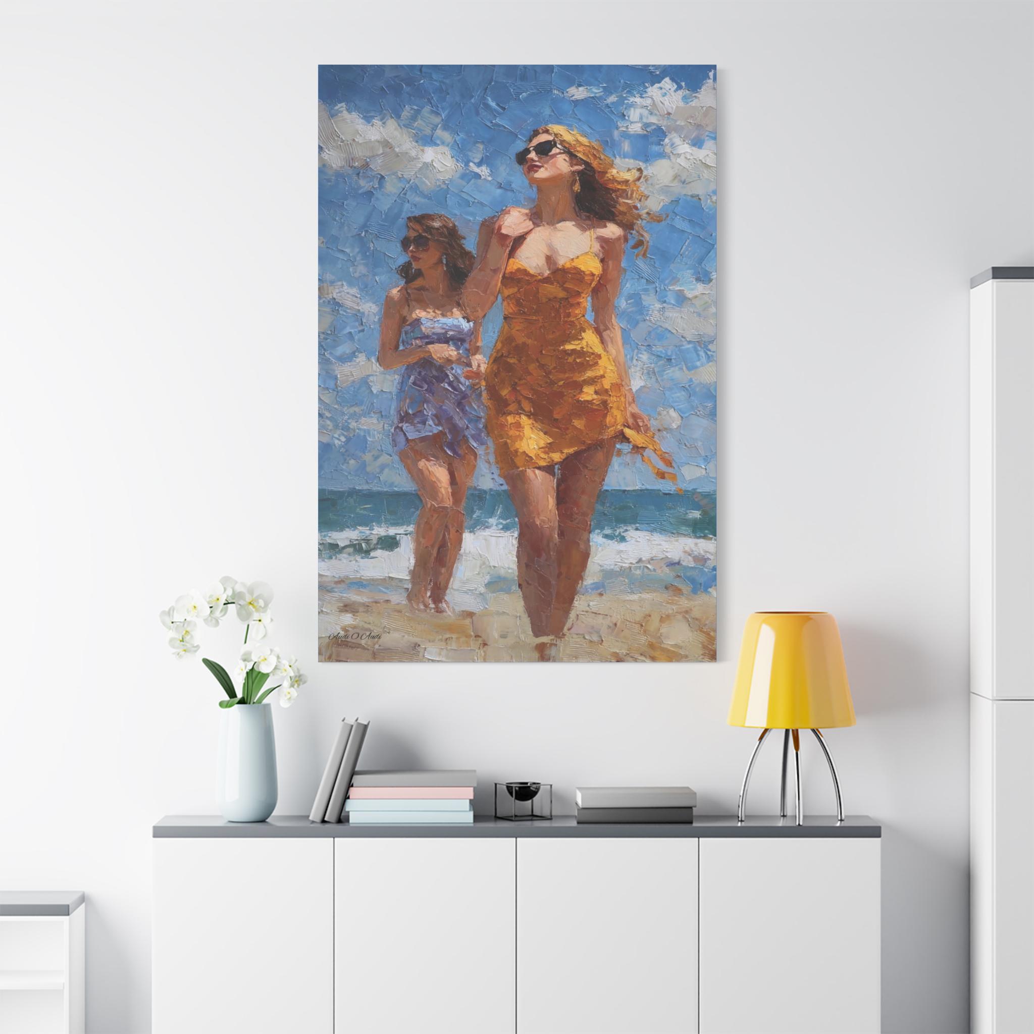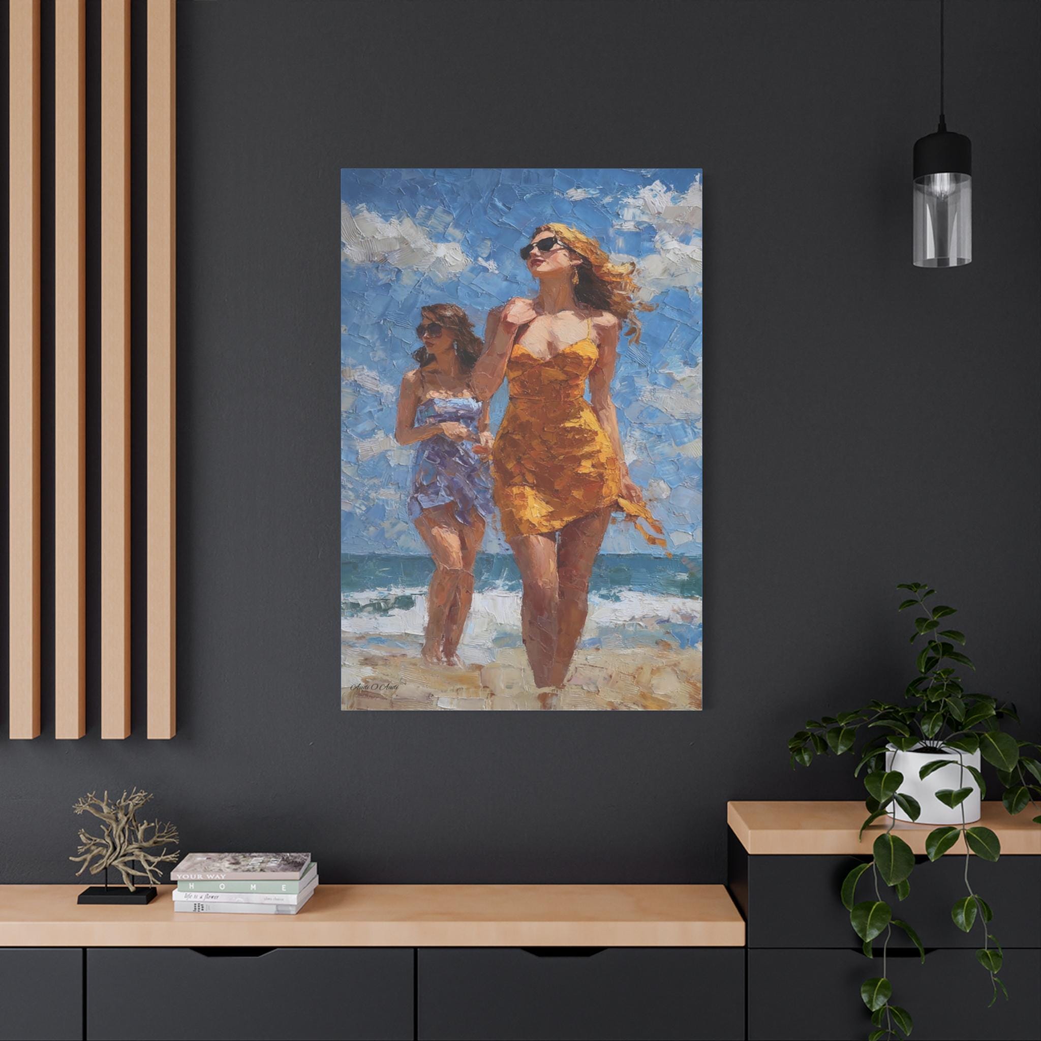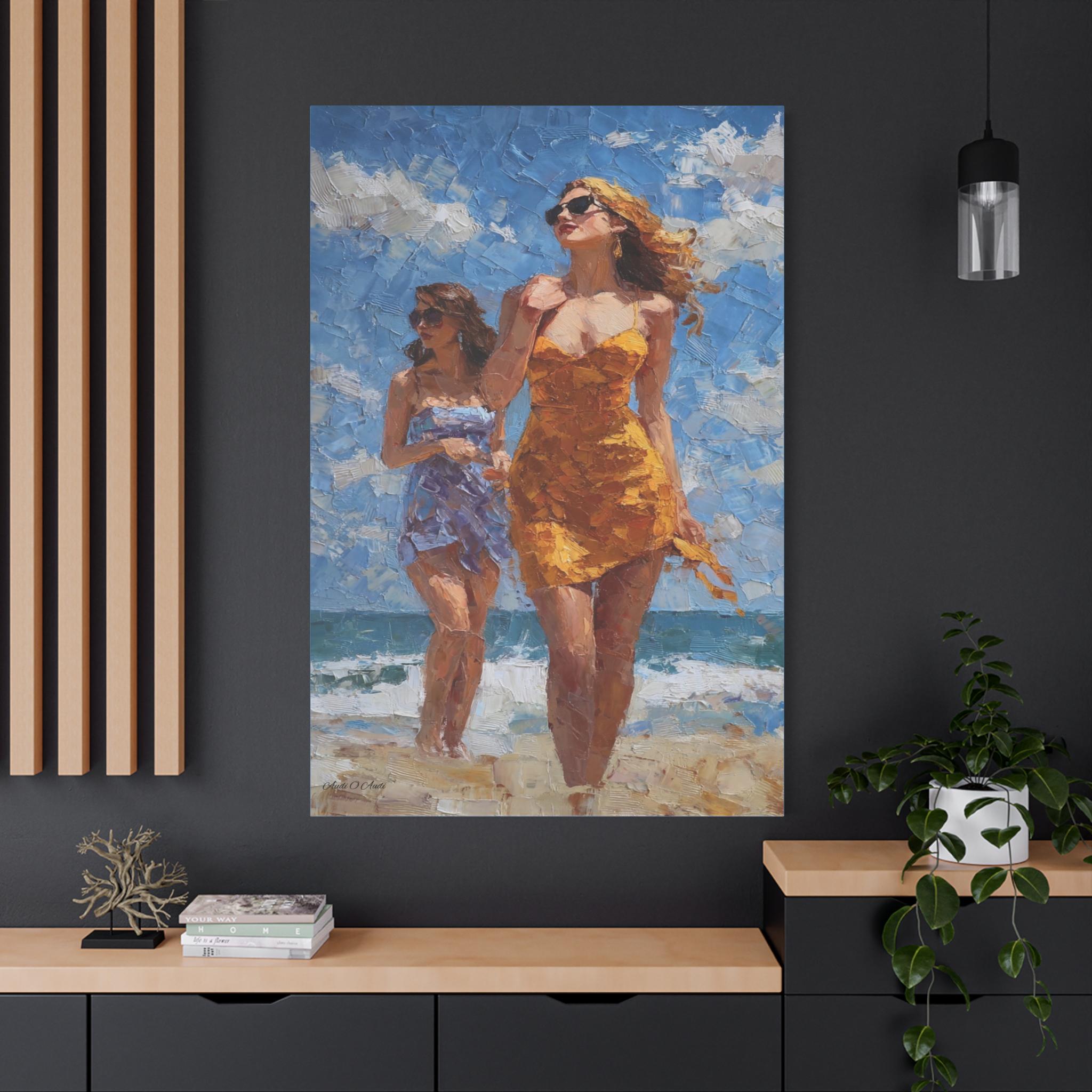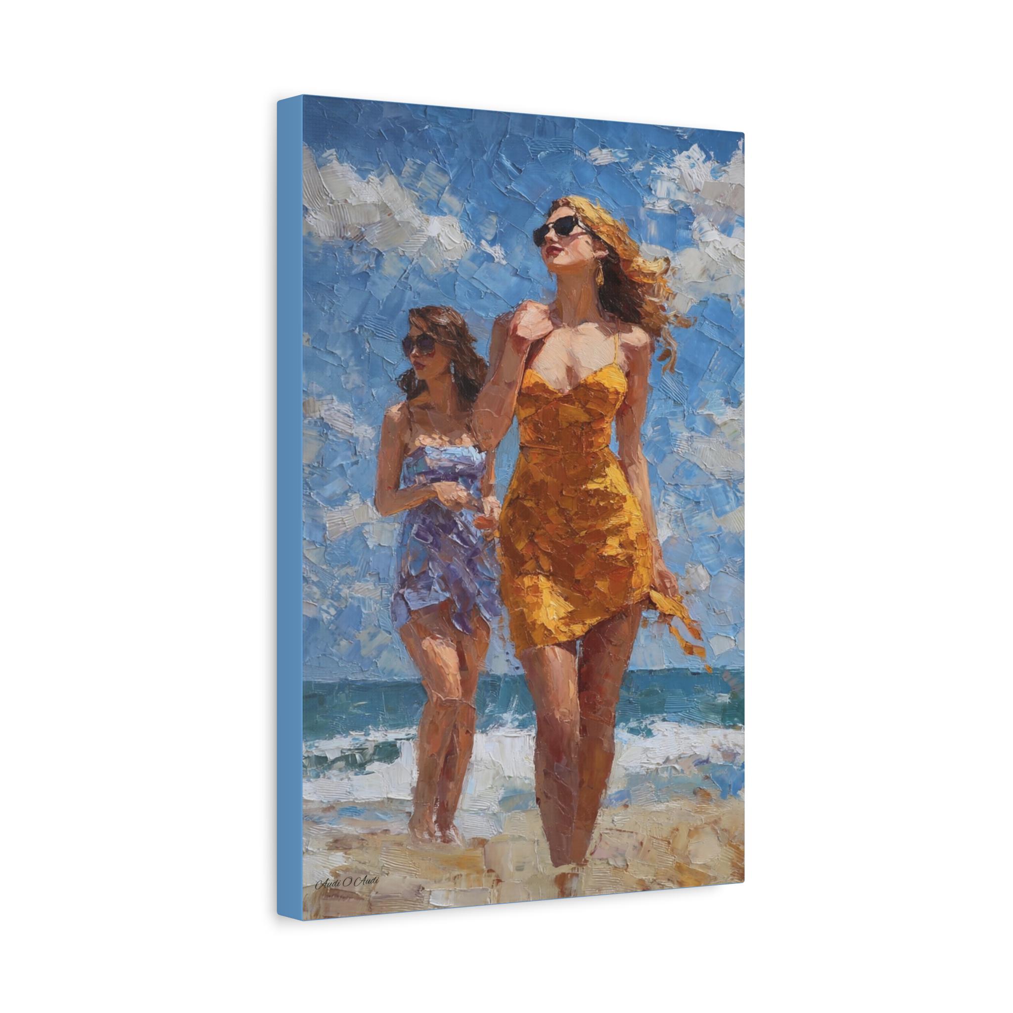 The composition features two female figures striding forward on a beach, their forms commanding the foreground. The lead figure, in a striking golden-yellow slip dress, is defined by thick, layered strokes that simultaneously capture the folds of the fabric and the brilliance of the sunlight hitting her exposed skin. Her pose—confident, sunglasses shielding her eyes, hair blowing back—makes her a powerful focal point.