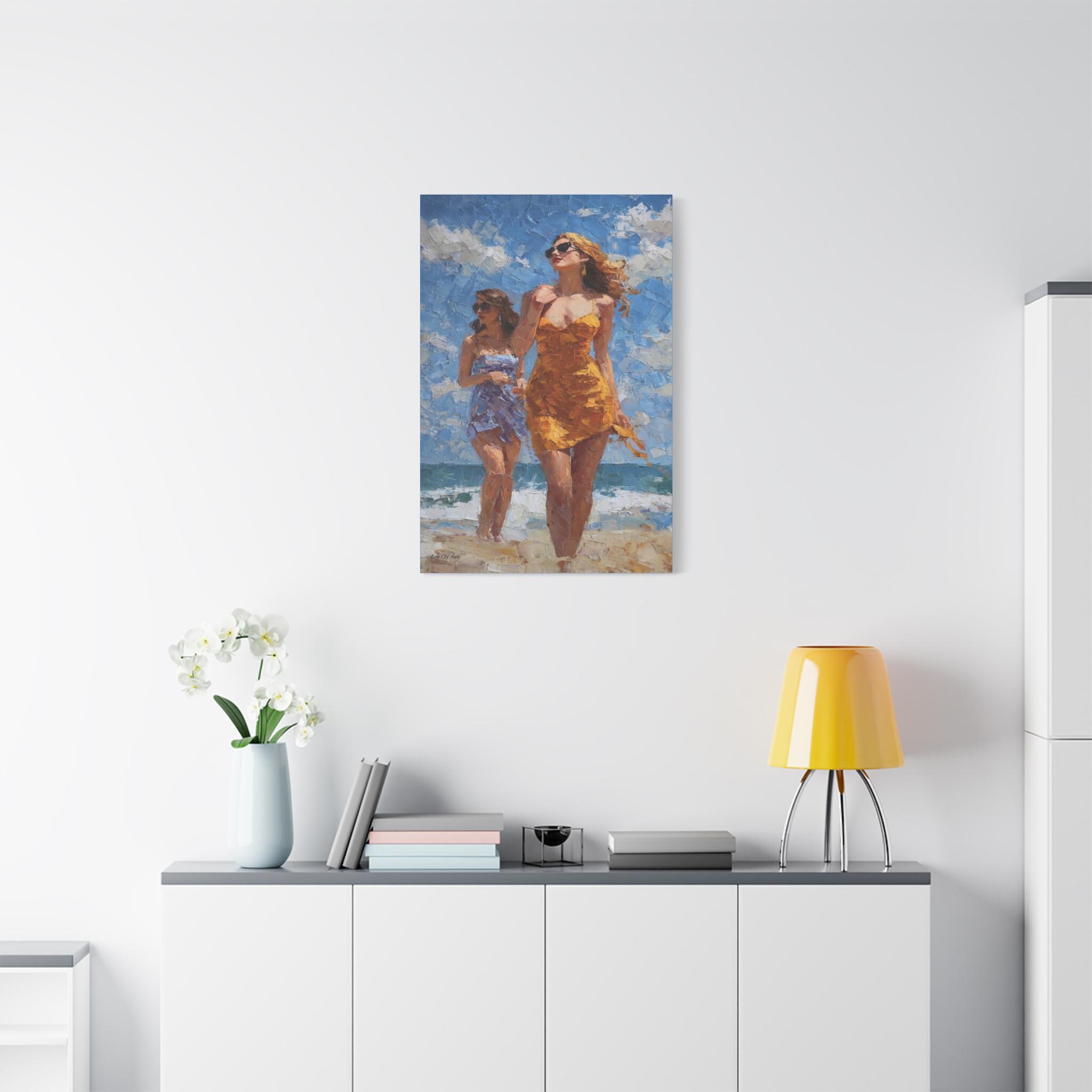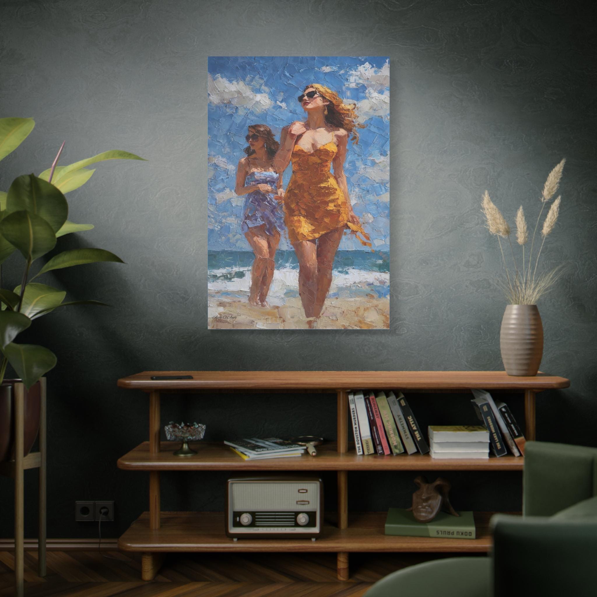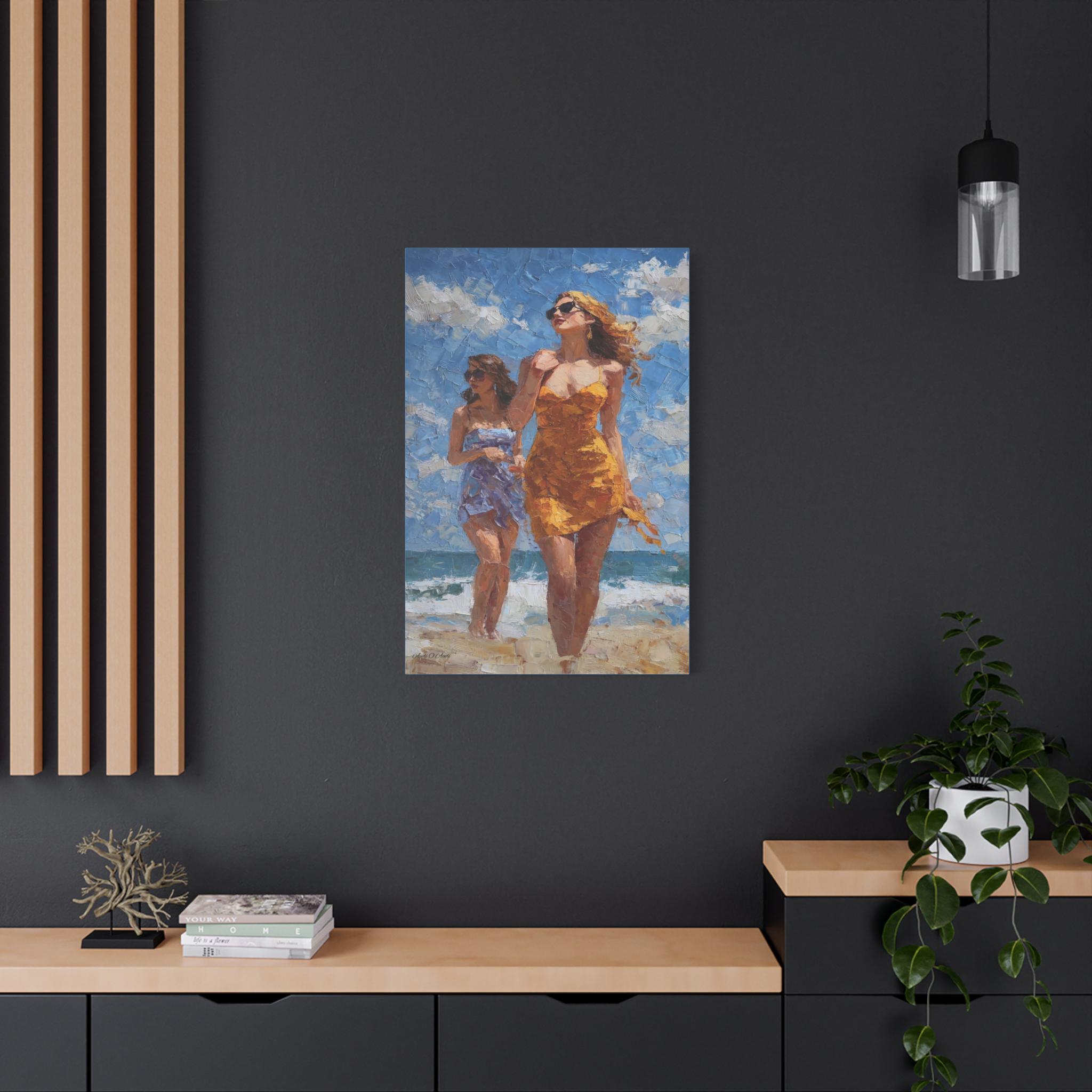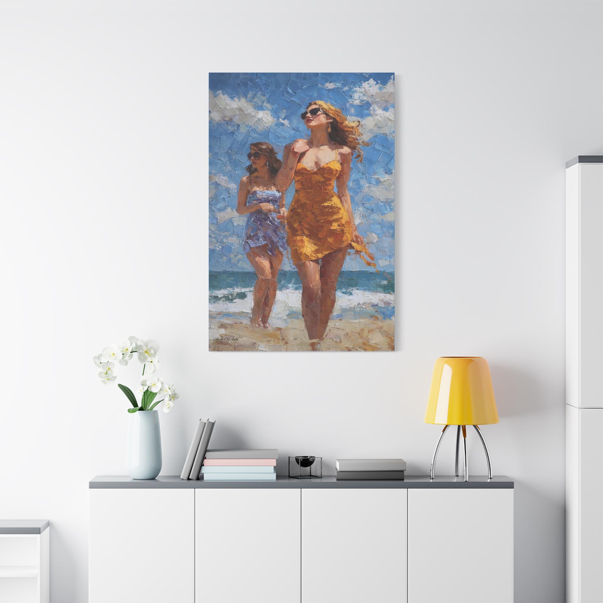 The composition features two female figures striding forward on a beach, their forms commanding the foreground. The lead figure, in a striking golden-yellow slip dress, is defined by thick, layered strokes that simultaneously capture the folds of the fabric and the brilliance of the sunlight hitting her exposed skin. Her pose—confident, sunglasses shielding her eyes, hair blowing back—makes her a powerful focal point.