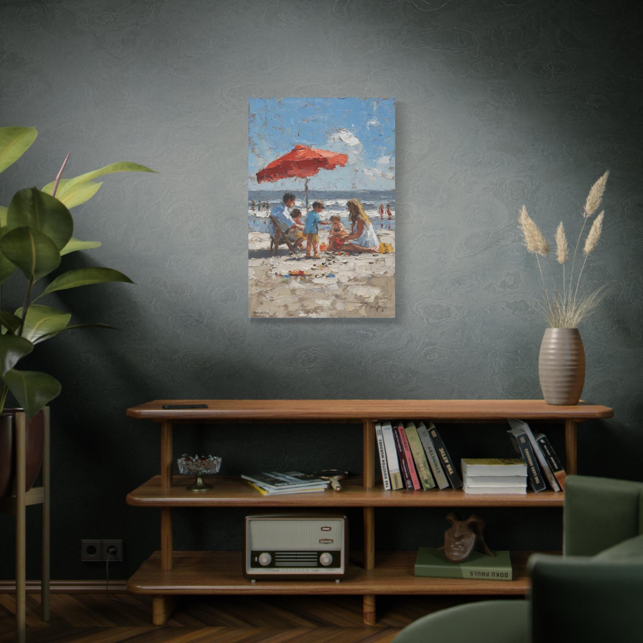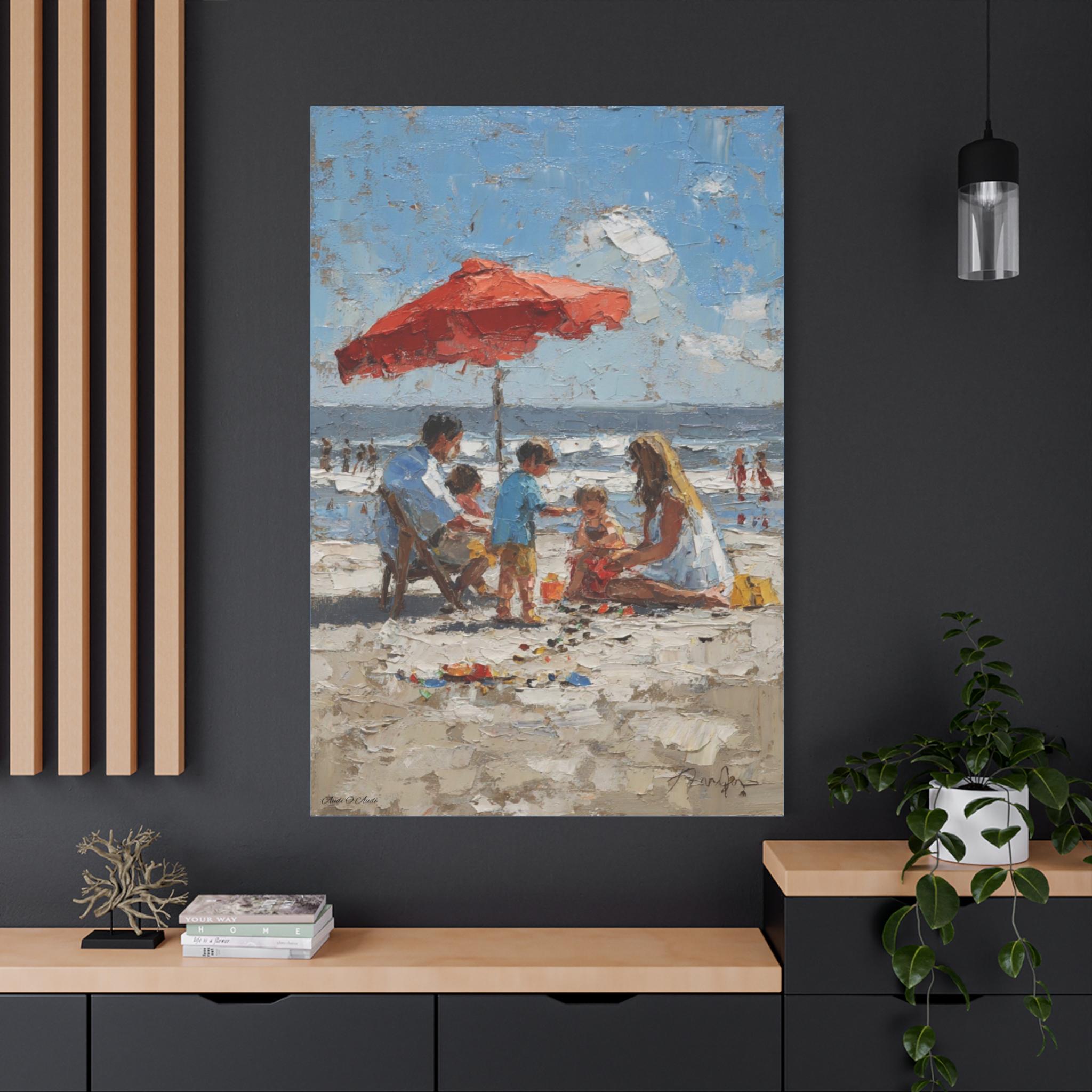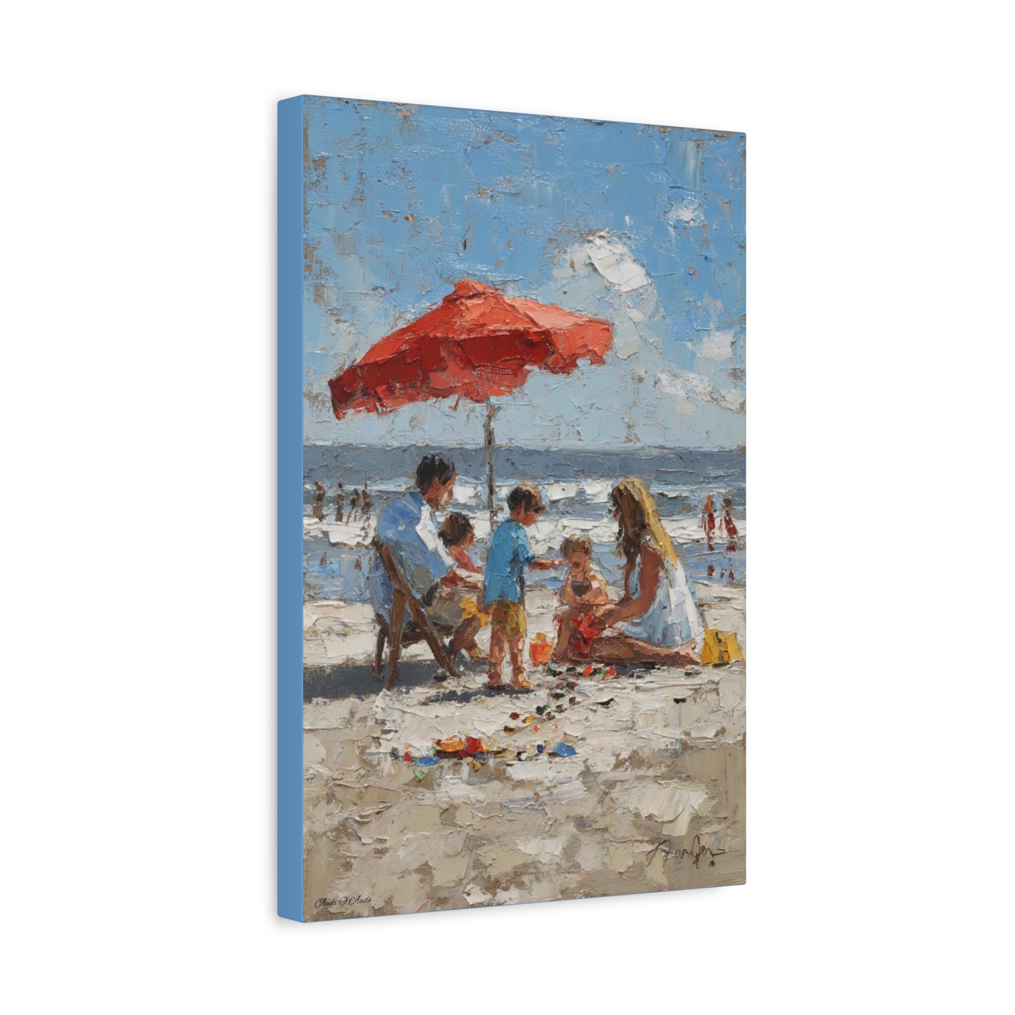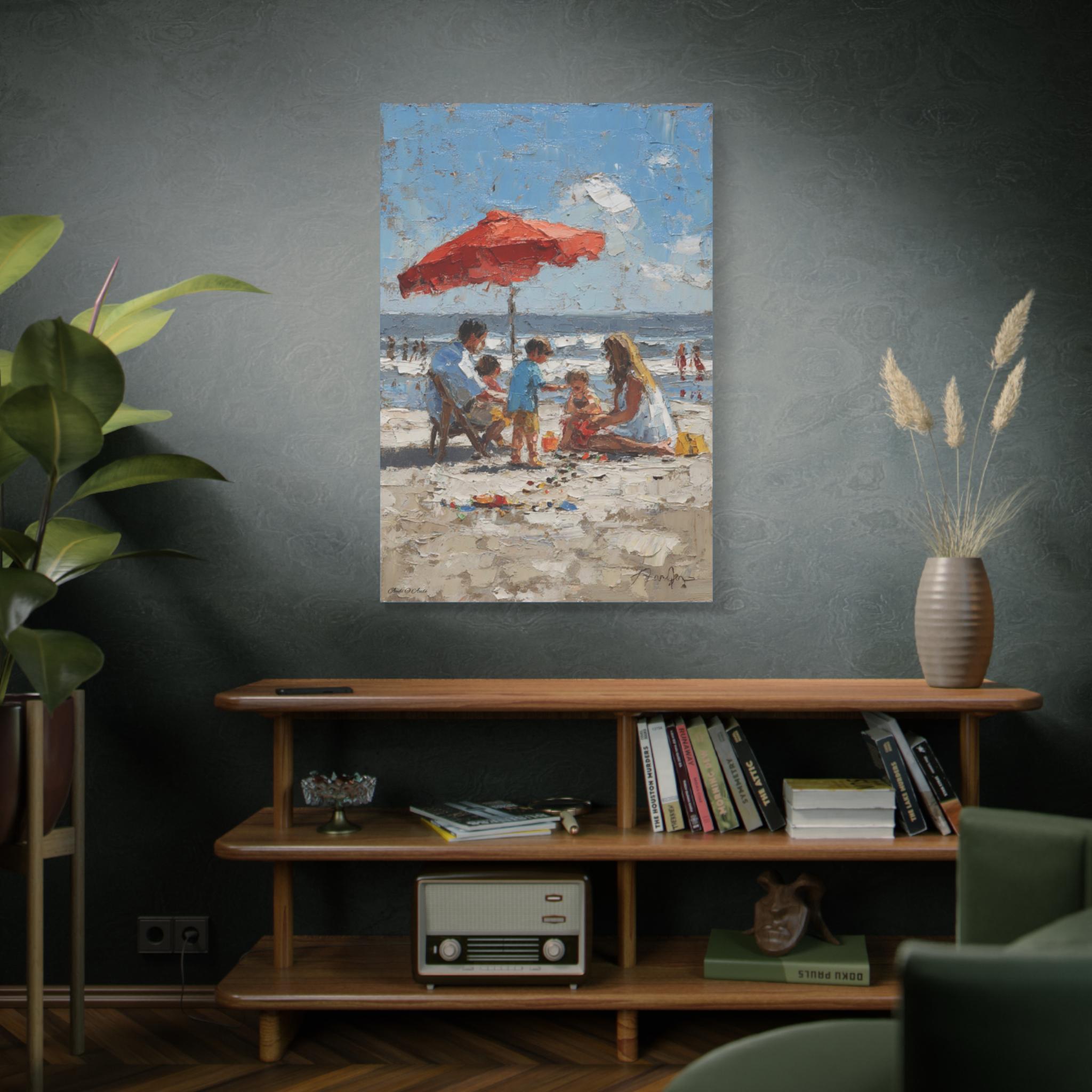 "Red Umbrella Leisure" is a charming figurative painting designed to emulate the bold texture of a heavy impasto oil painting. The artwork captures an idyllic family scene focused on recreation and togetherness by the ocean.